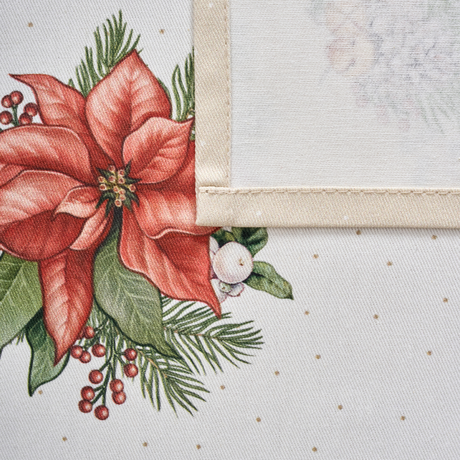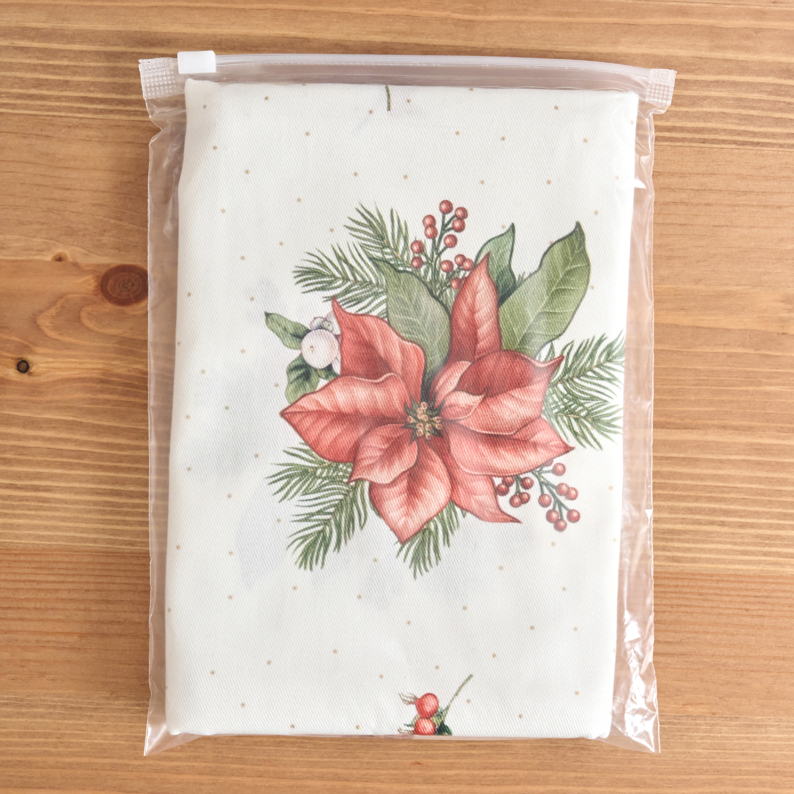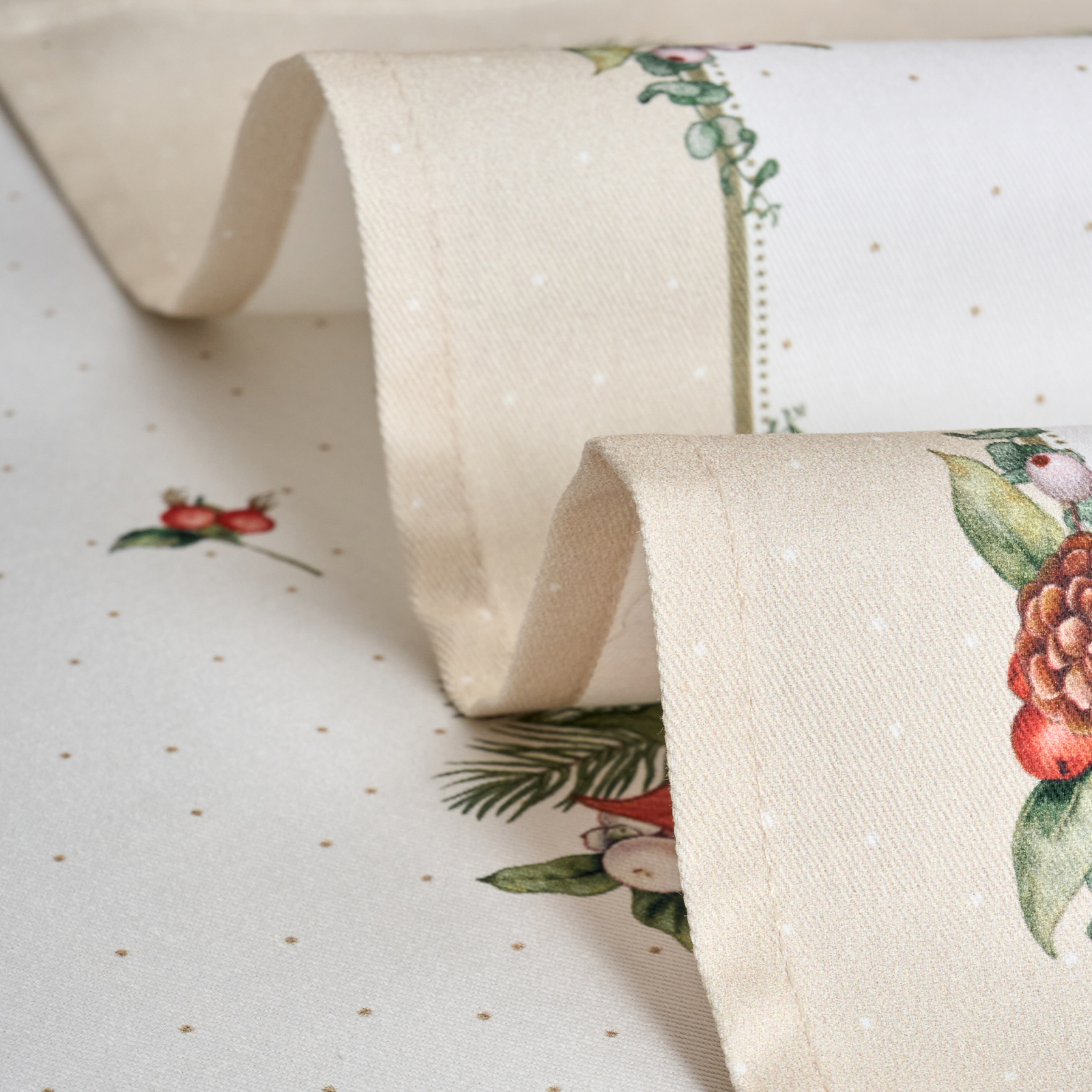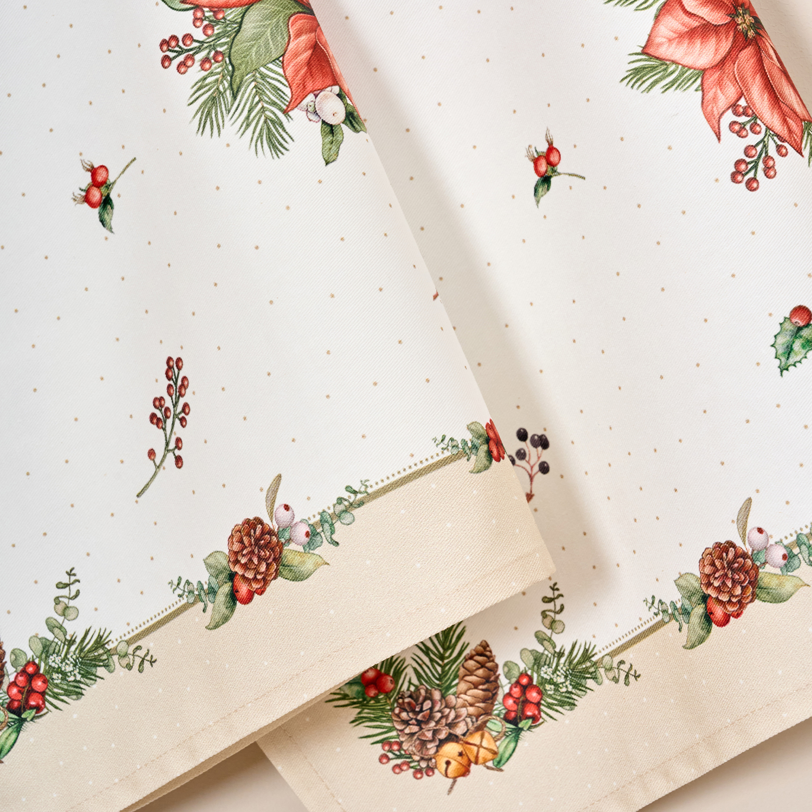 Новогодний принт с еловыми ветками, шишками, ягодами и рождественским цветком пуансеттией нанесён по технологии цифровой печати. Рисунок чёткий, яркий и стойкий — он создаёт праздничное настроение и гармонично сочетается с новогодним декором.