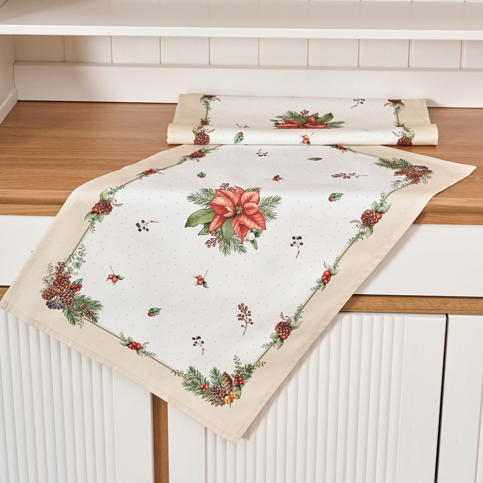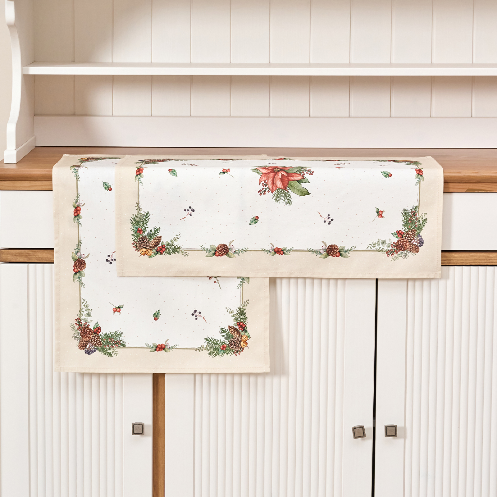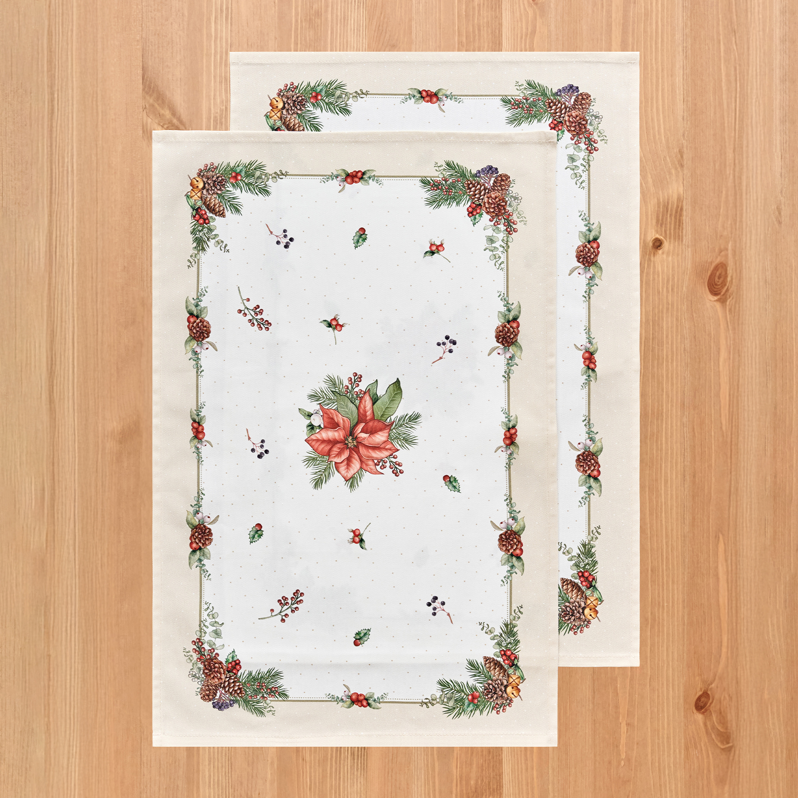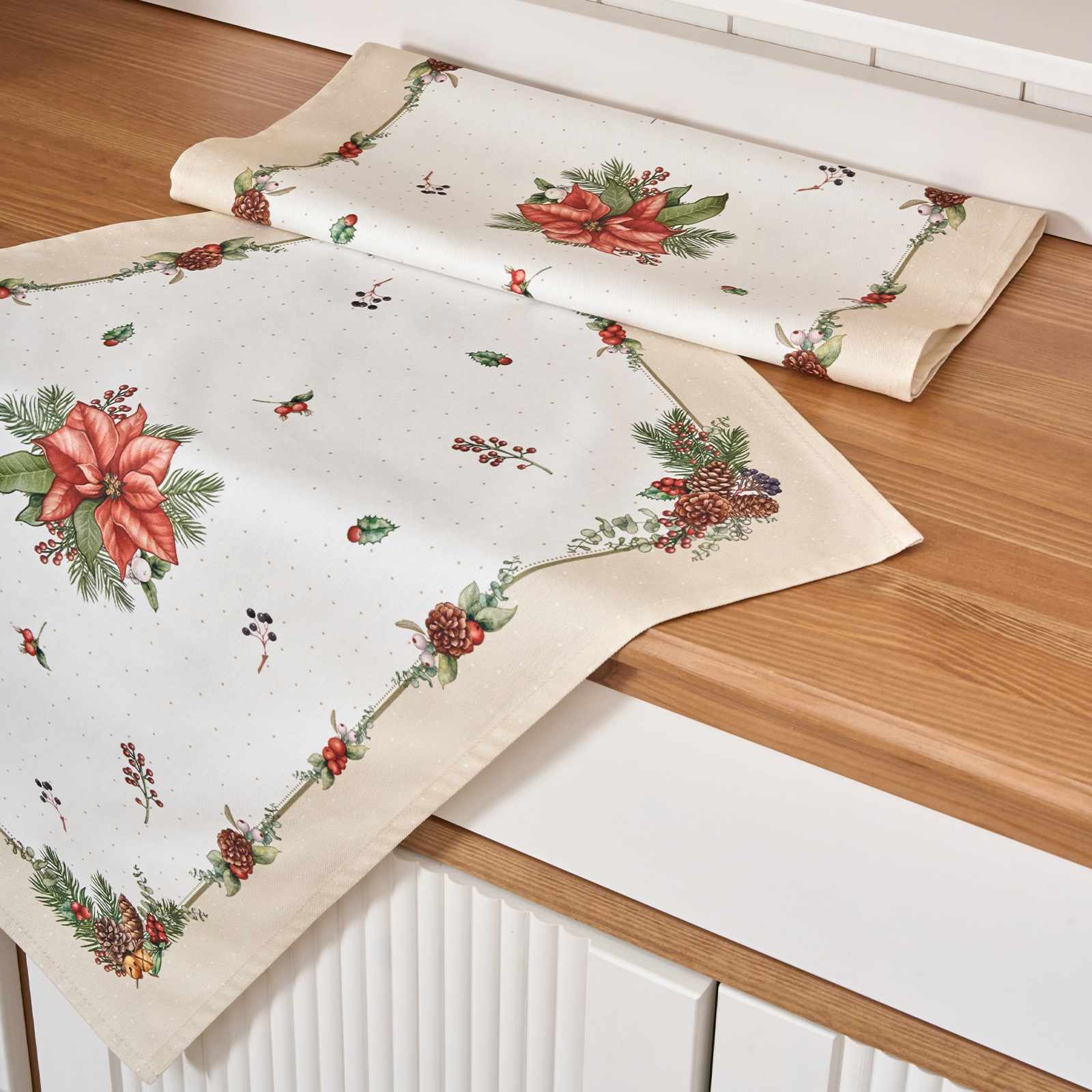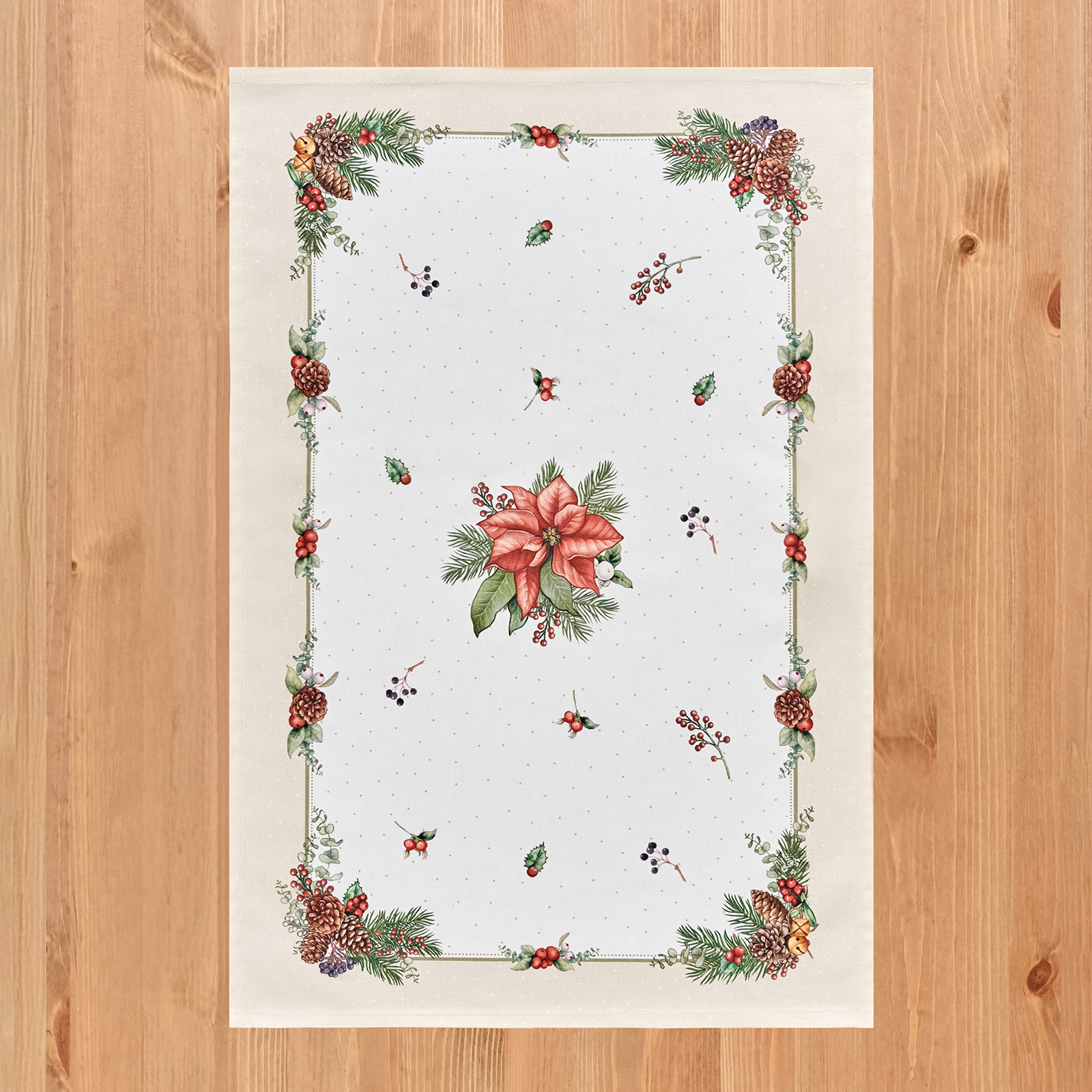 Новогодний принт с еловыми ветками, шишками, ягодами и рождественским цветком пуансеттией нанесён по технологии цифровой печати. Рисунок чёткий, яркий и стойкий — он создаёт праздничное настроение и гармонично сочетается с новогодним декором.