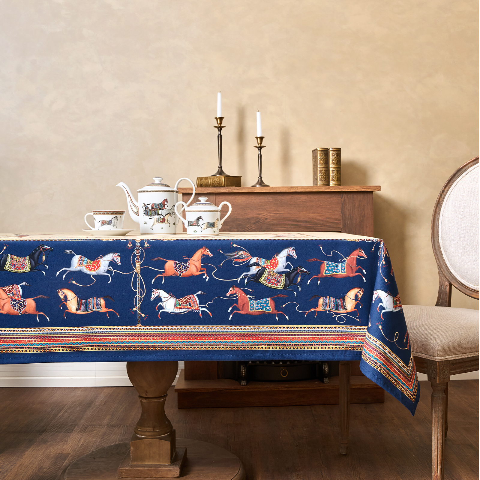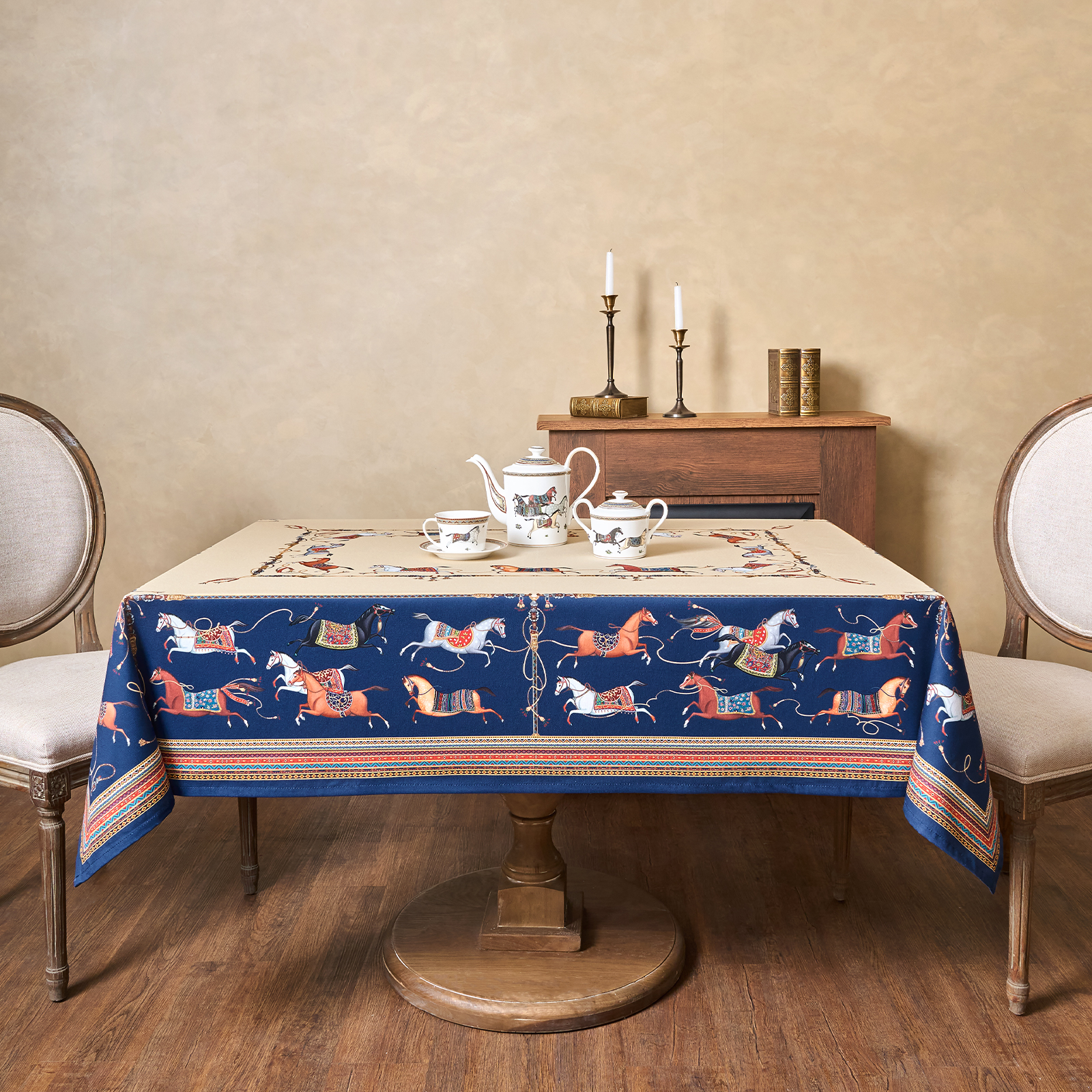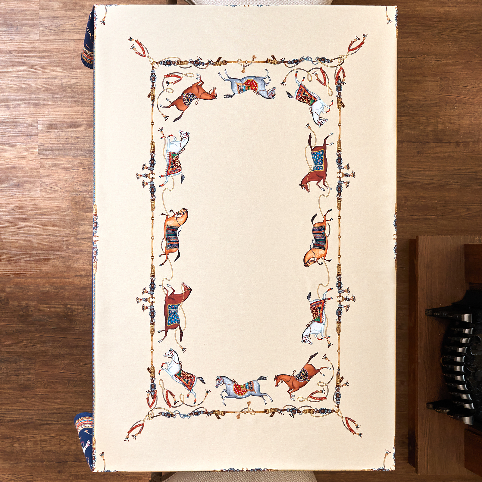 Темно-синий фон дополнен авторским орнаментом с изящными лошадьми — символом 2026 года. Такой акцент делает скатерть актуальной для праздничной сервировки и стильным украшением интерьера. Рисунок создан художниками Lefard и нанесён методом цифровой печати — краски сохраняют яркость даже после многократных стирок.