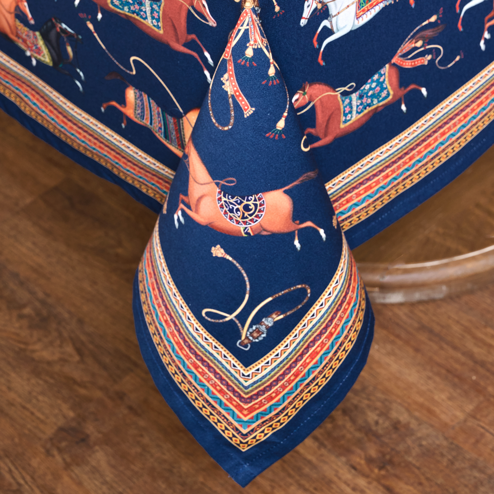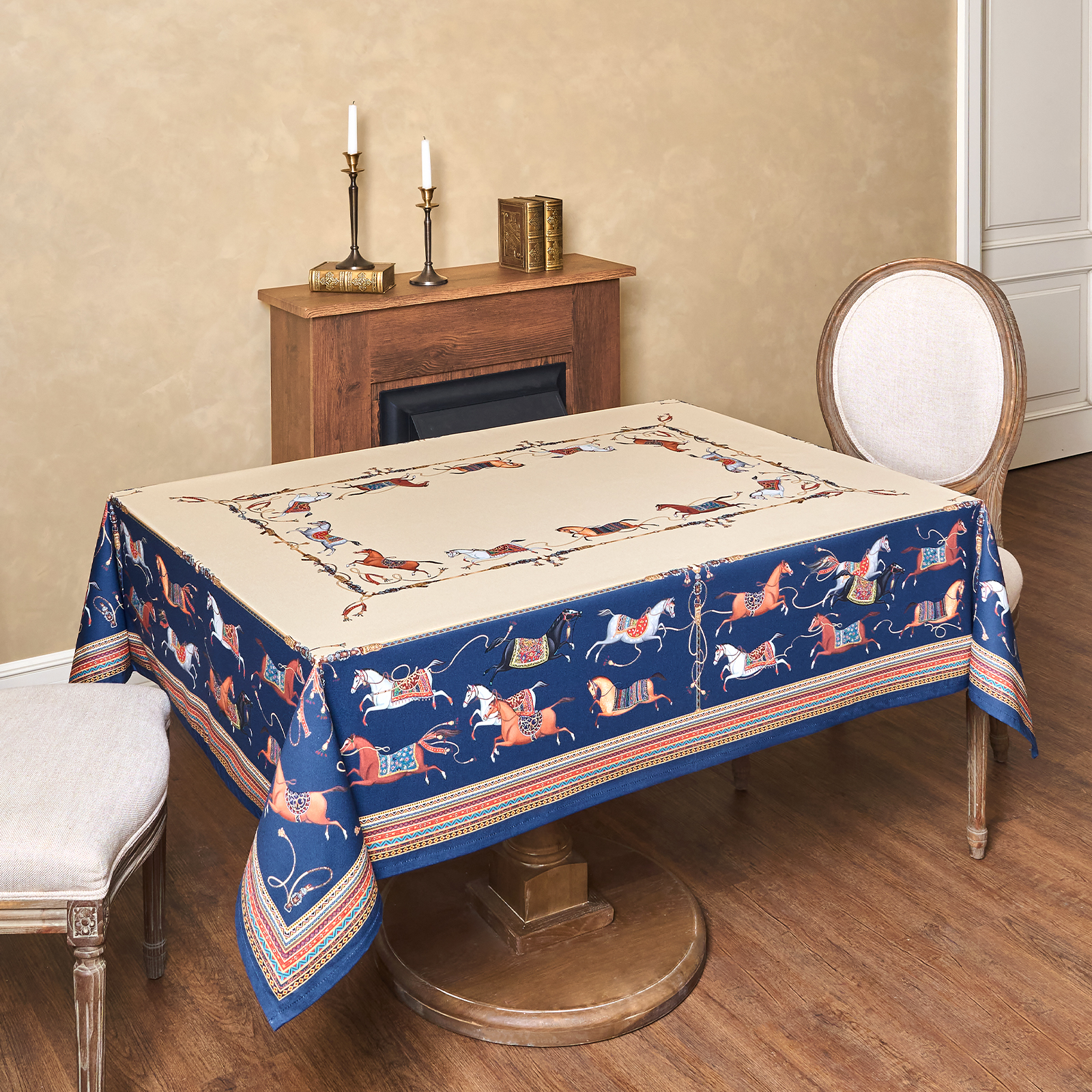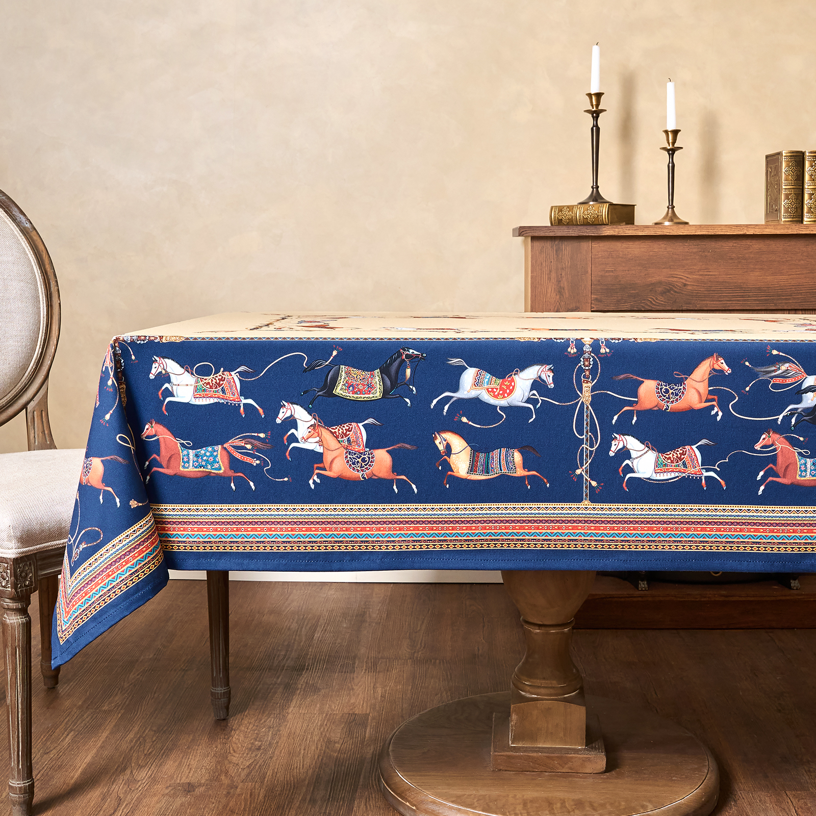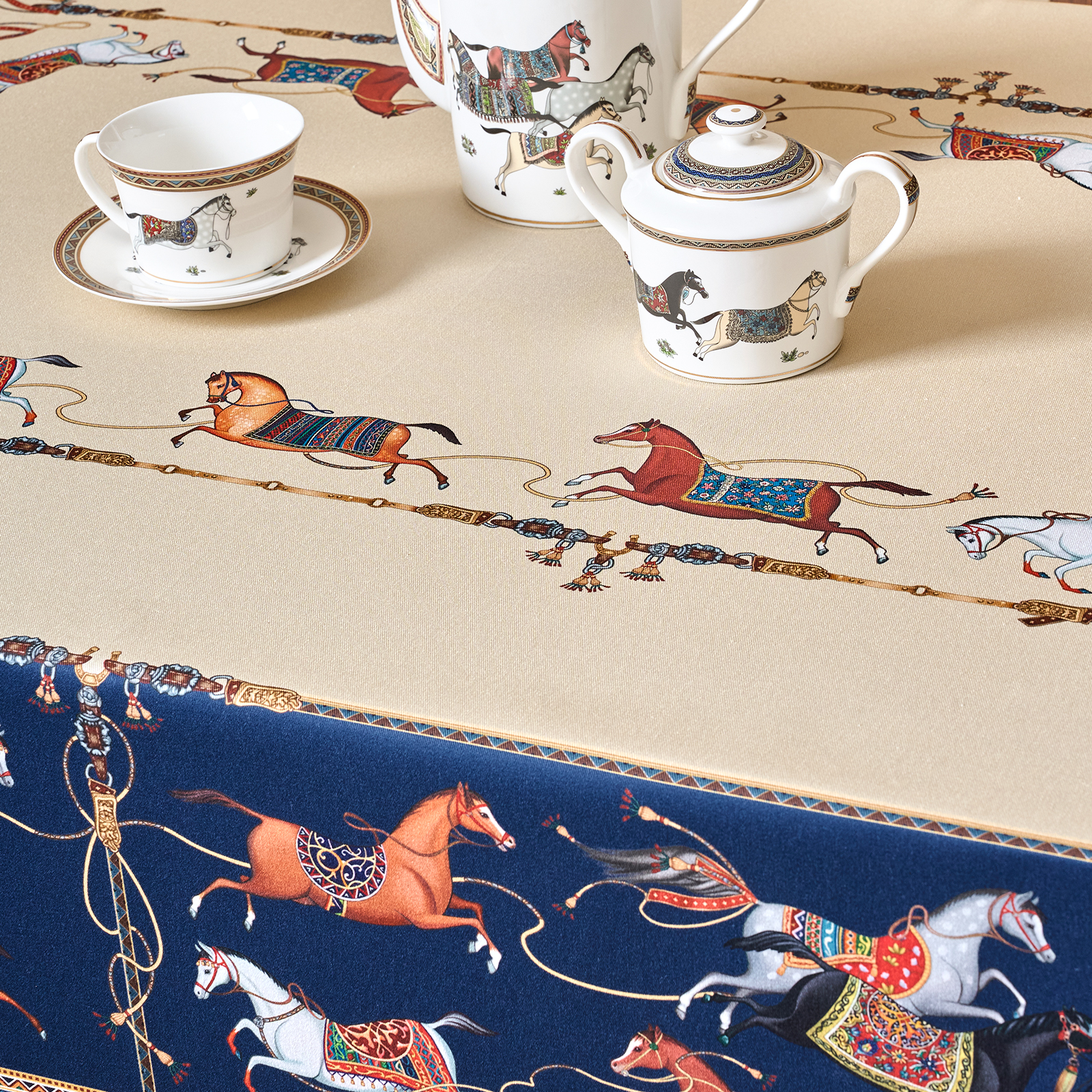 Темно-синий фон дополнен авторским орнаментом с изящными лошадьми — символом 2026 года. Такой акцент делает скатерть актуальной для праздничной сервировки и стильным украшением интерьера. Рисунок создан художниками Lefard и нанесён методом цифровой печати — краски сохраняют яркость даже после многократных стирок.