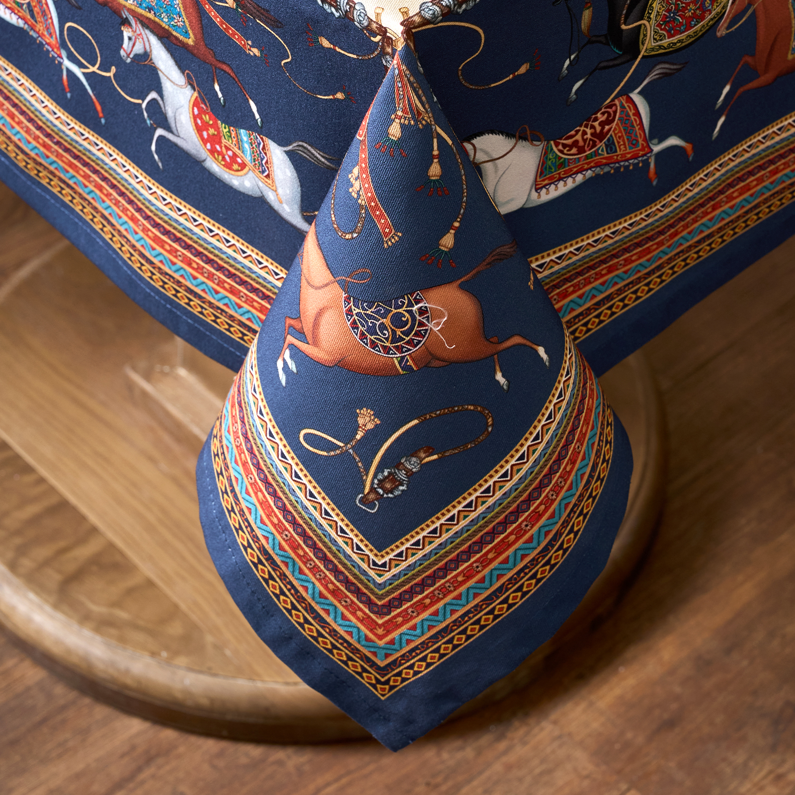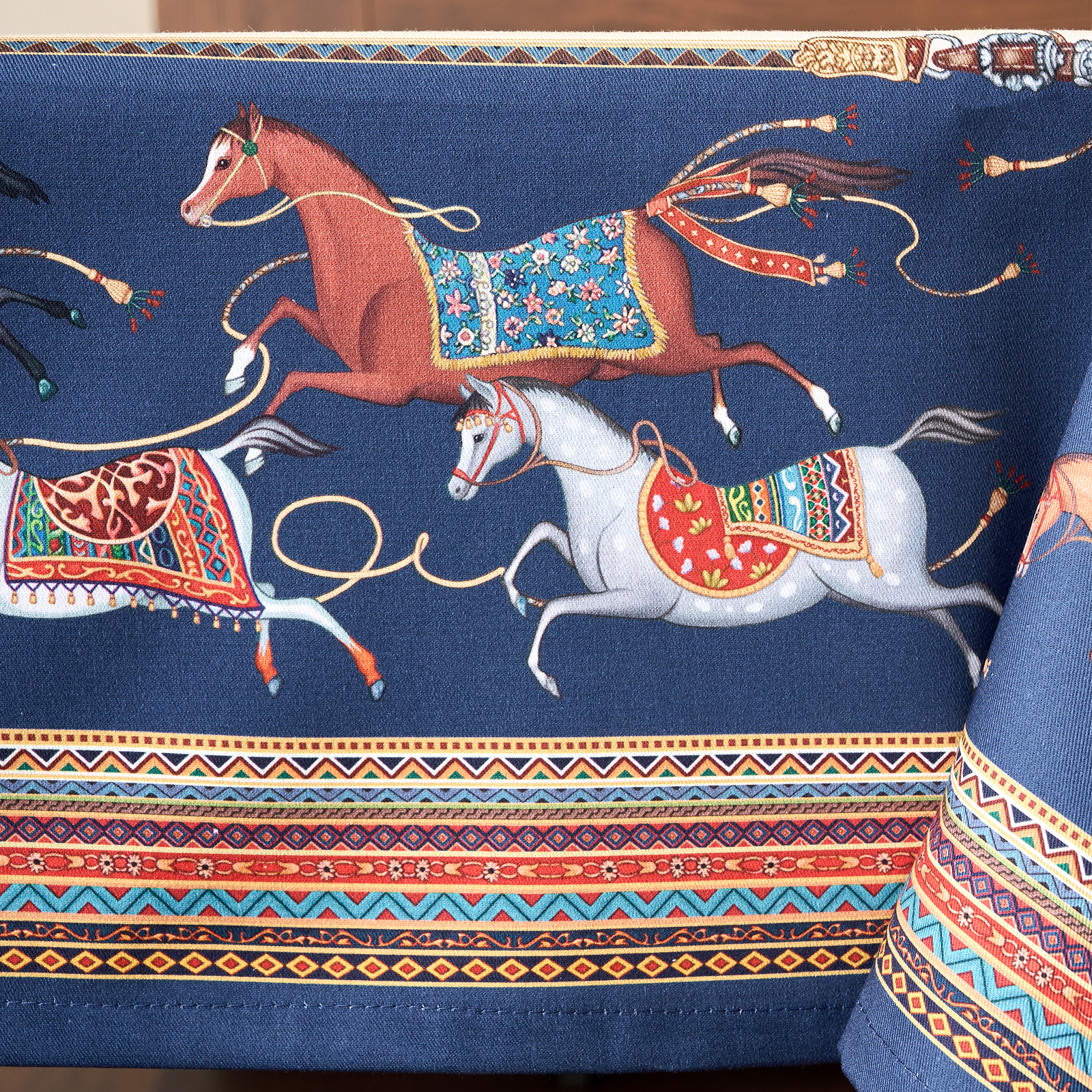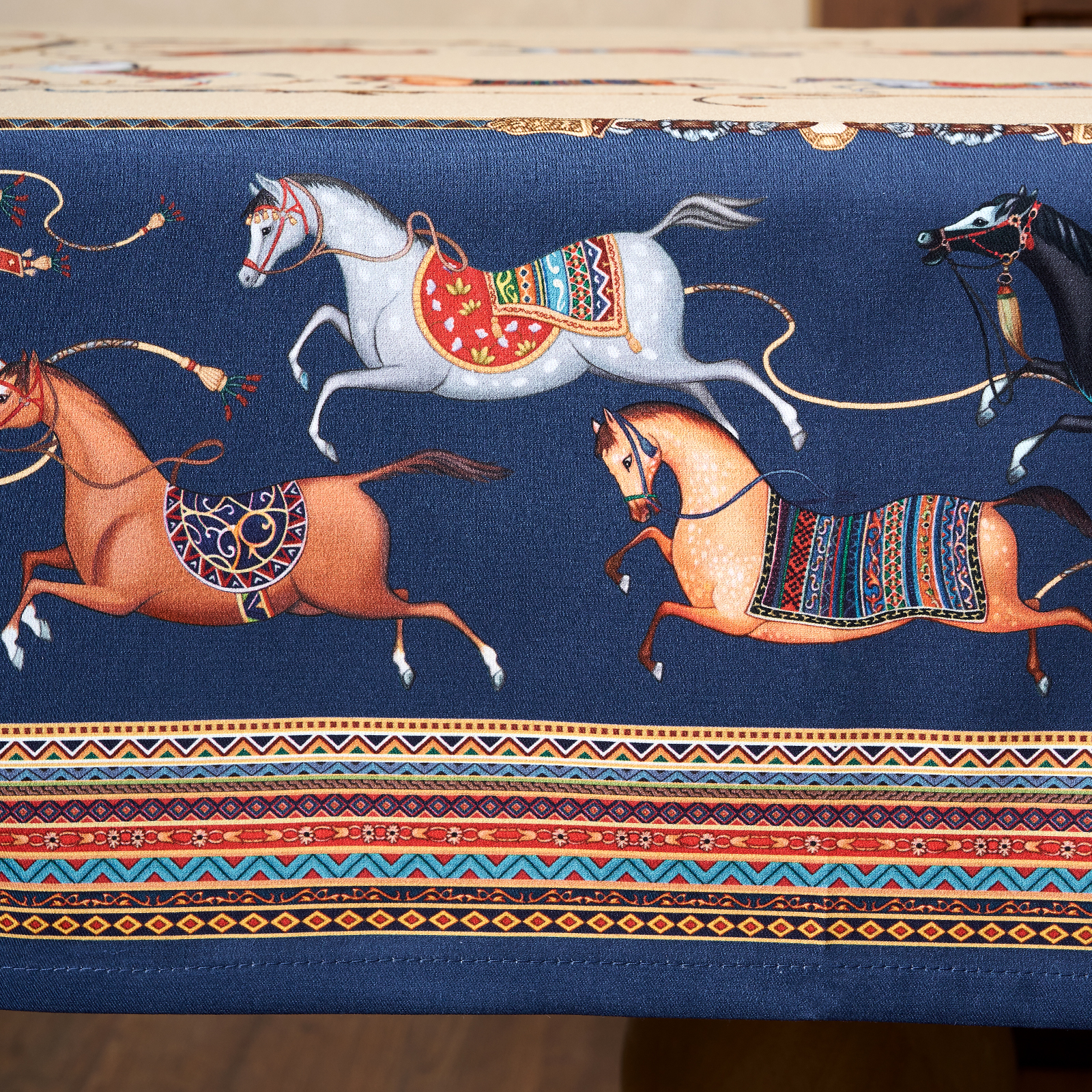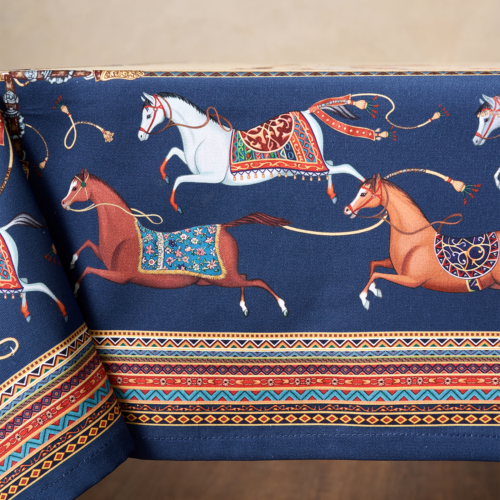 Благородный тёмно-синий фон украшен орнаментом с грациозными лошадьми, создавая атмосферу восточной роскоши. Лошадь — символ 2026 года, поэтому скатерть будет актуальна как для ежедневного использования в интерьере в стиле бохо, так и для праздничной сервировки. Авторский принт разработан художниками эксклюзивно для Lefard и нанесён методом цифровой печати, что гарантирует яркость и стойкость красок даже после множества стирок.