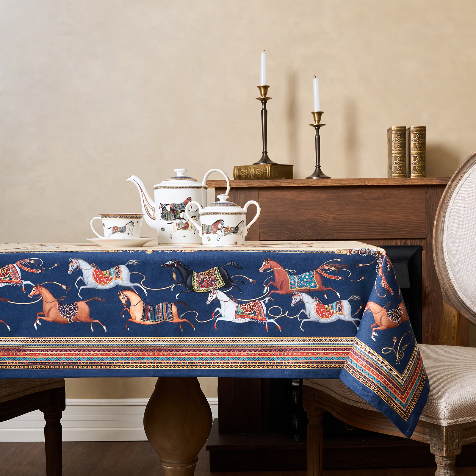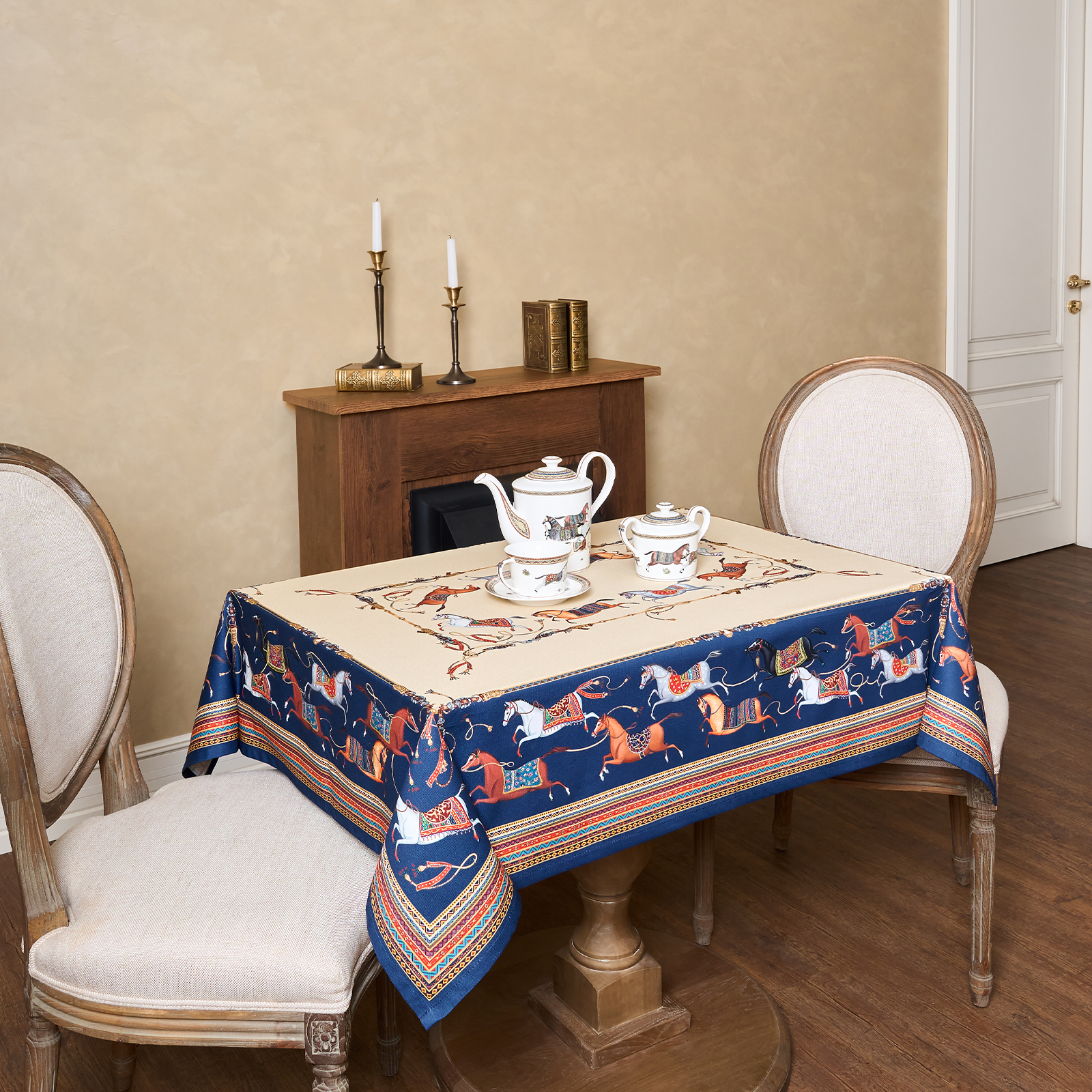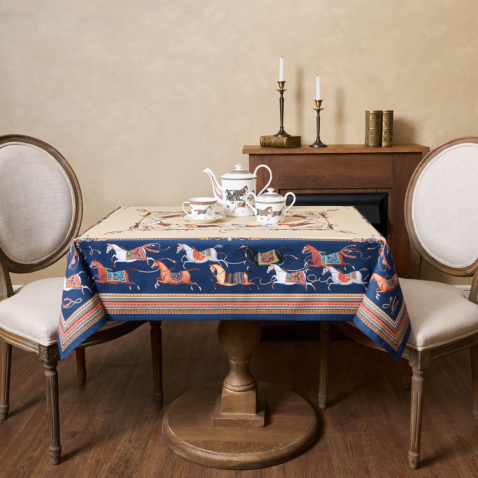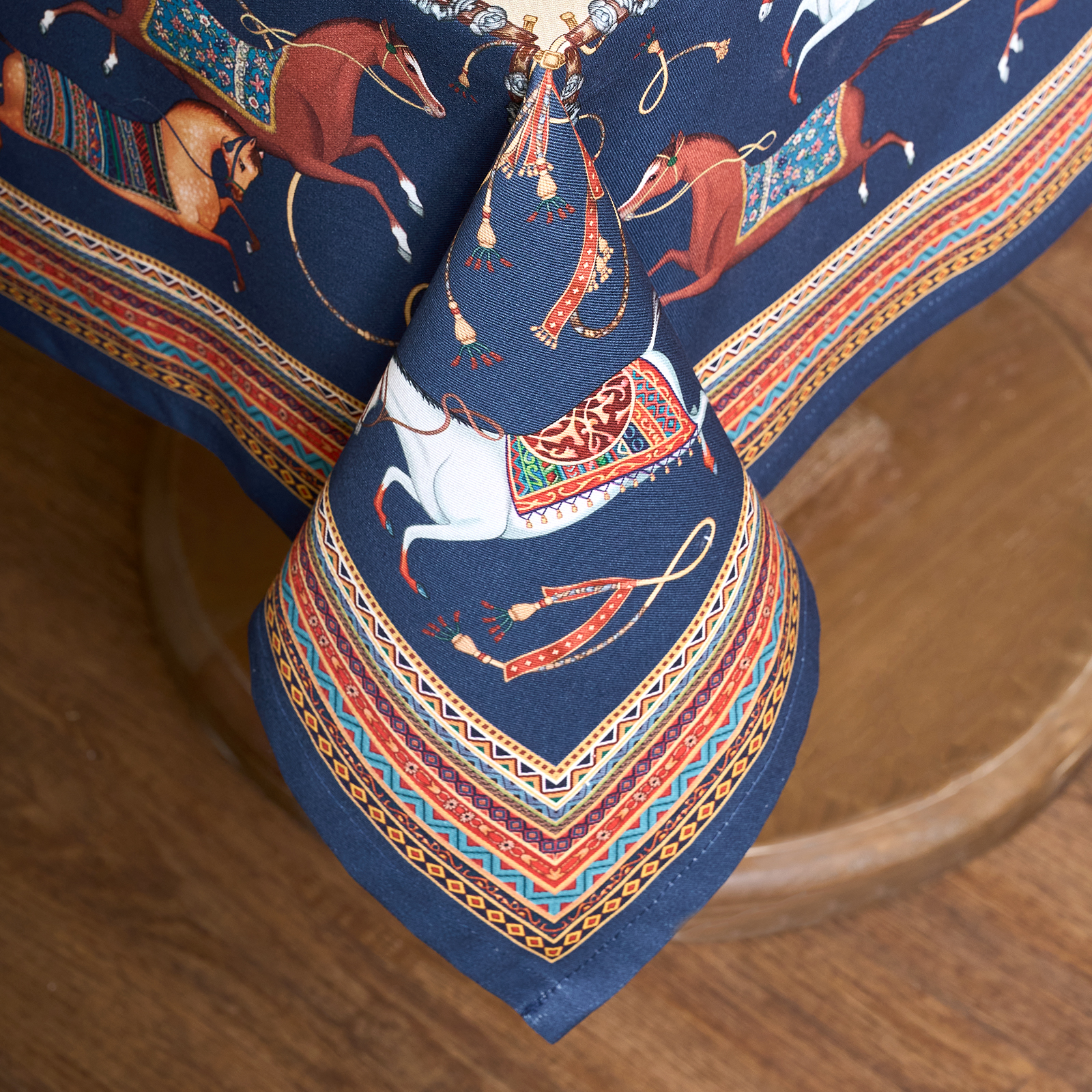 Благородный тёмно-синий фон украшен орнаментом с грациозными лошадьми, создавая атмосферу восточной роскоши. Лошадь — символ 2026 года, поэтому скатерть будет актуальна как для ежедневного использования в интерьере в стиле бохо, так и для праздничной сервировки. Авторский принт разработан художниками эксклюзивно для Lefard и нанесён методом цифровой печати, что гарантирует яркость и стойкость красок даже после множества стирок.