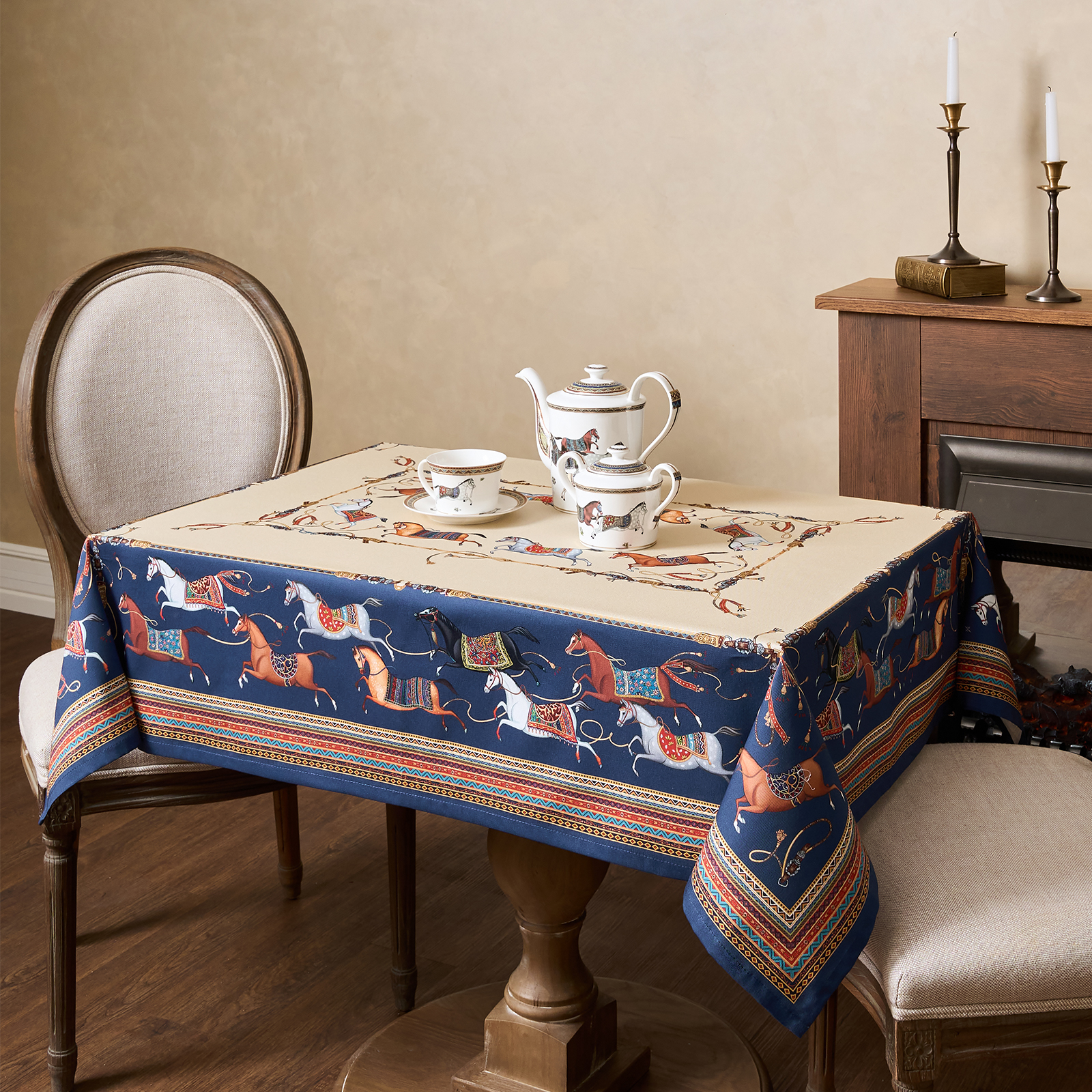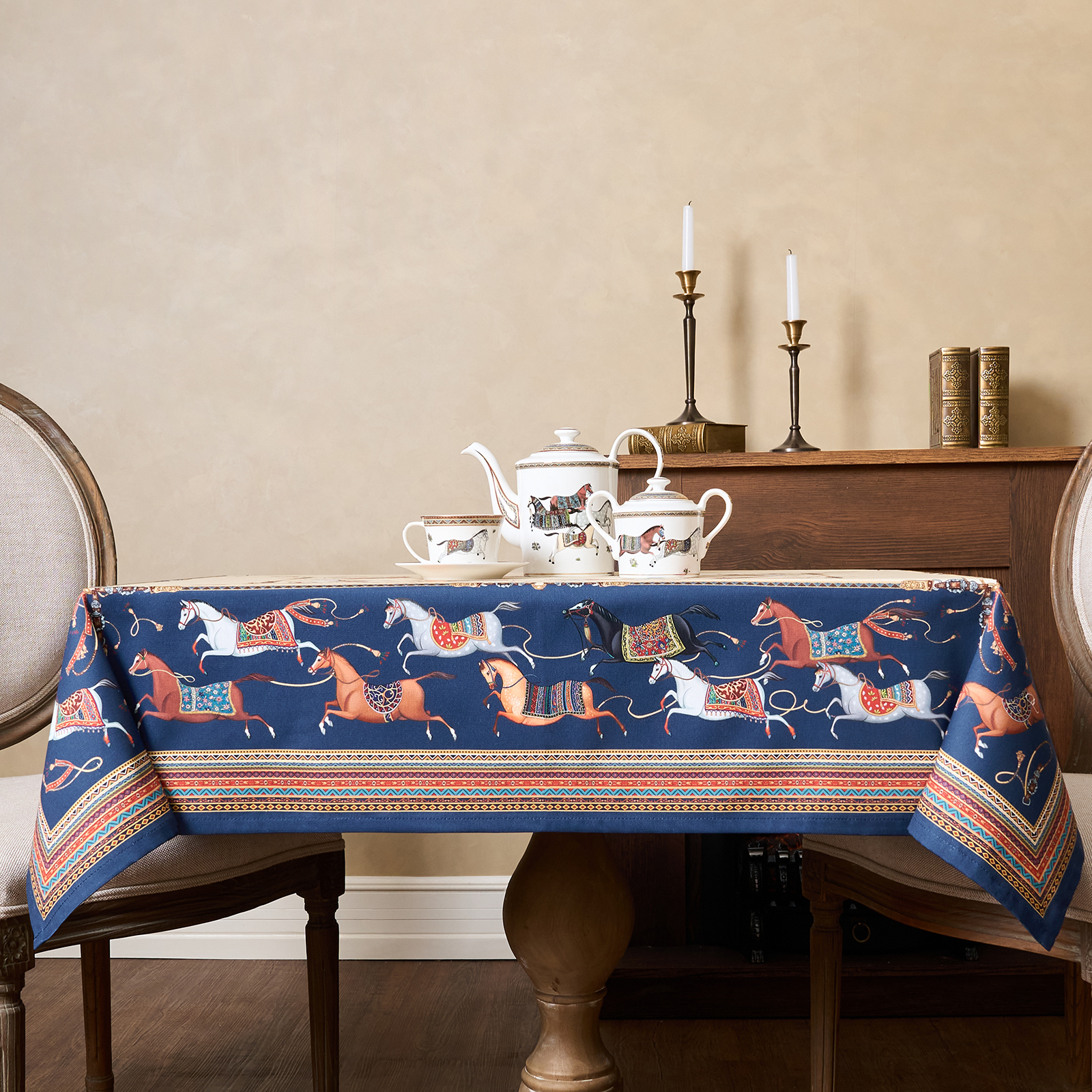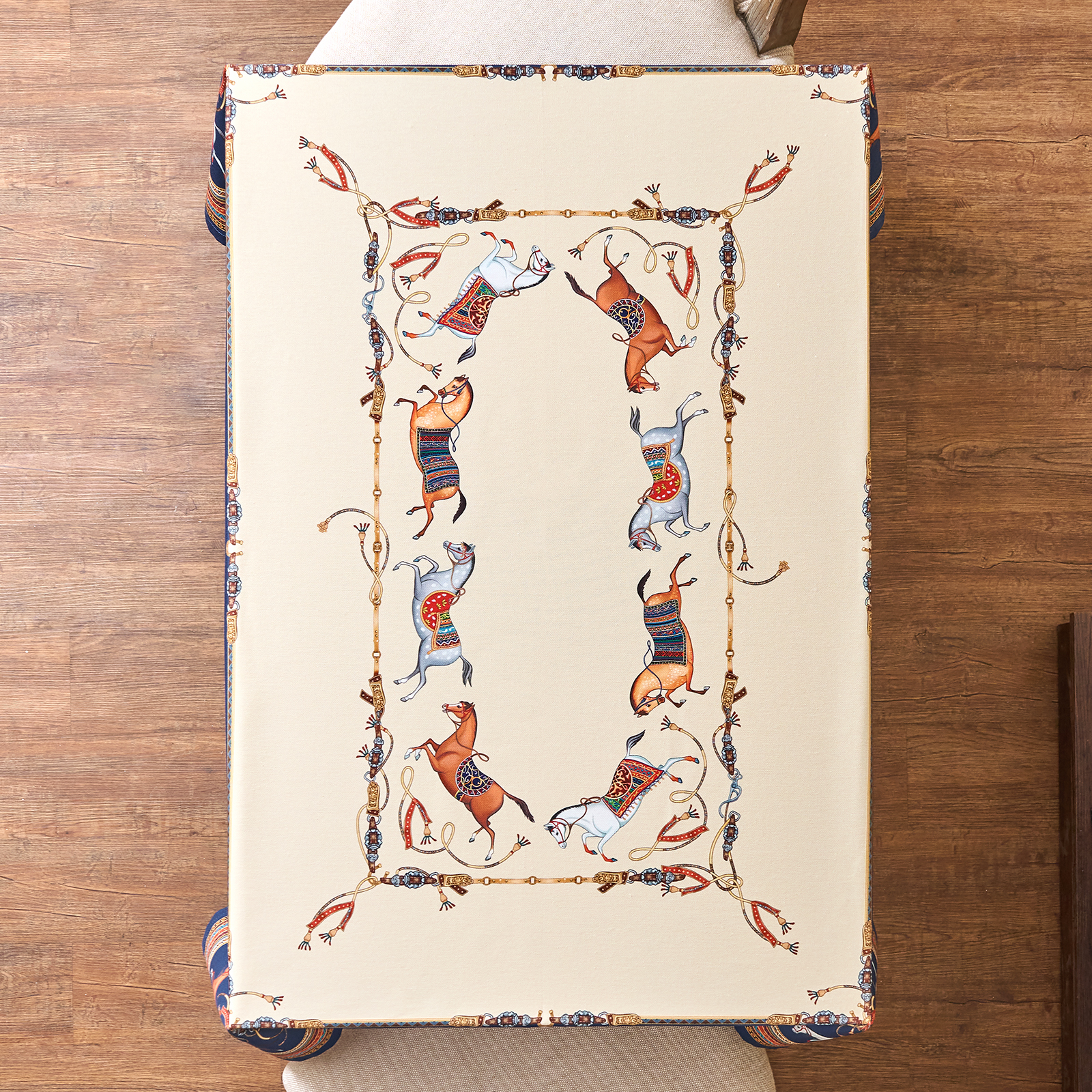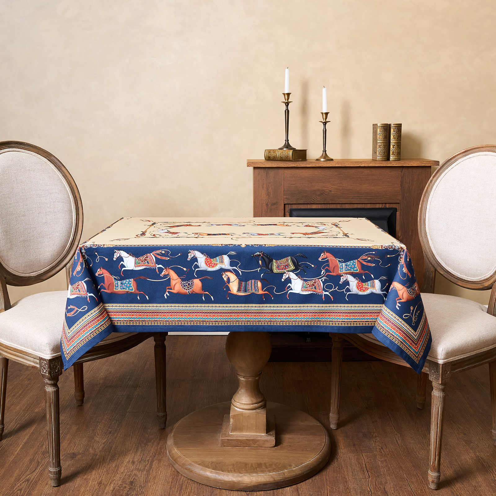 Благородный тёмно-синий фон украшен орнаментом с грациозными лошадьми, создавая атмосферу восточной роскоши. Лошадь — символ 2026 года, поэтому скатерть будет актуальна как для ежедневного использования в интерьере в стиле бохо, так и для праздничной сервировки. Авторский принт разработан художниками эксклюзивно для Lefard и нанесён методом цифровой печати, что гарантирует яркость и стойкость красок даже после множества стирок.