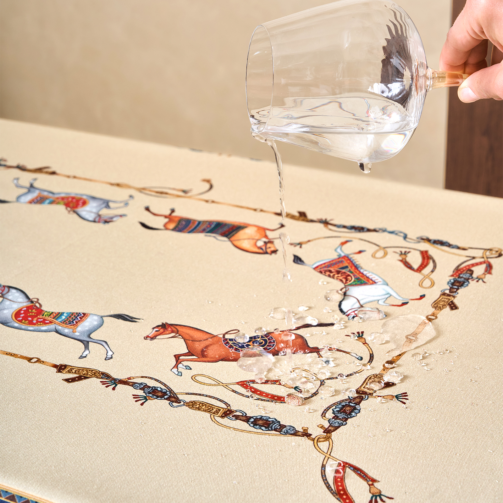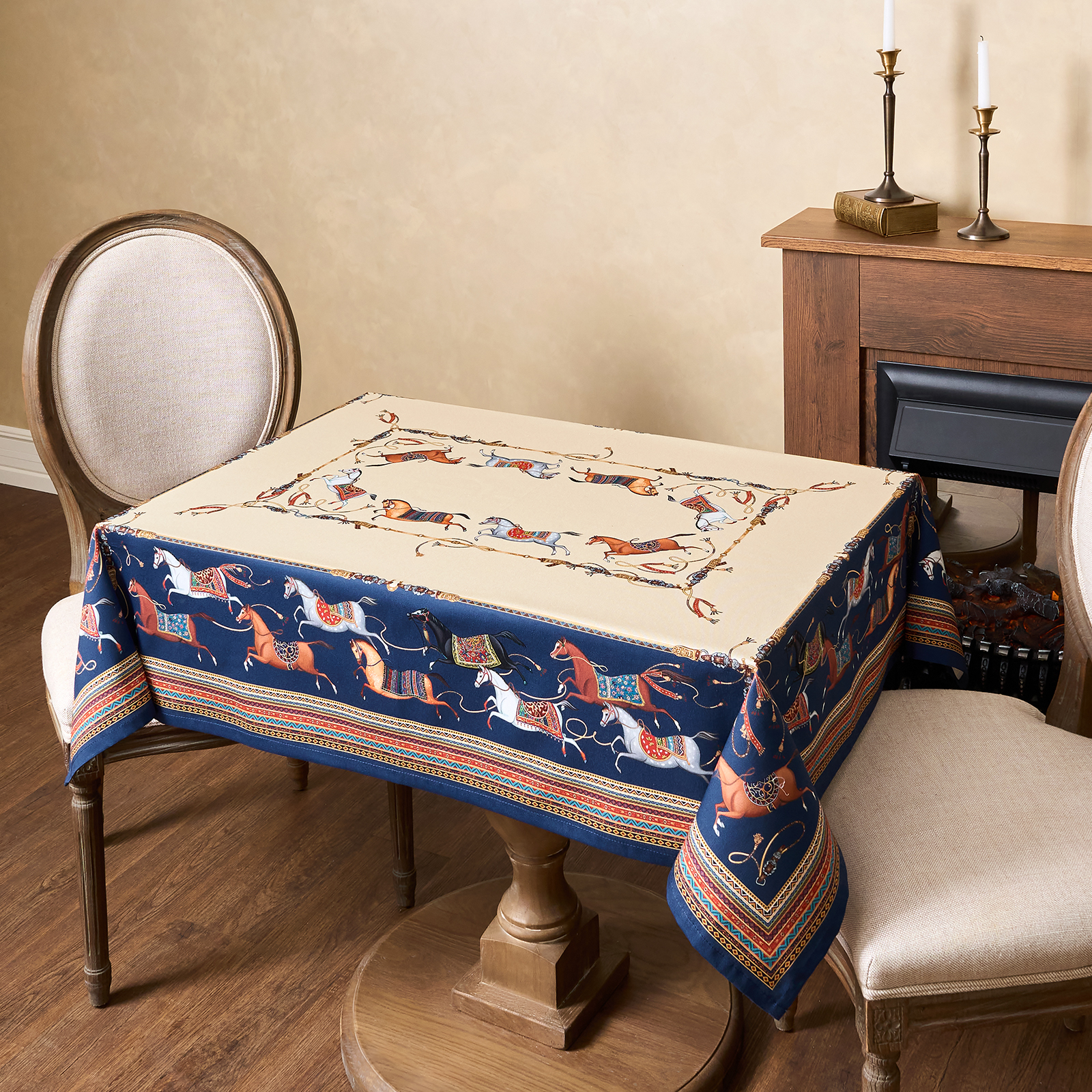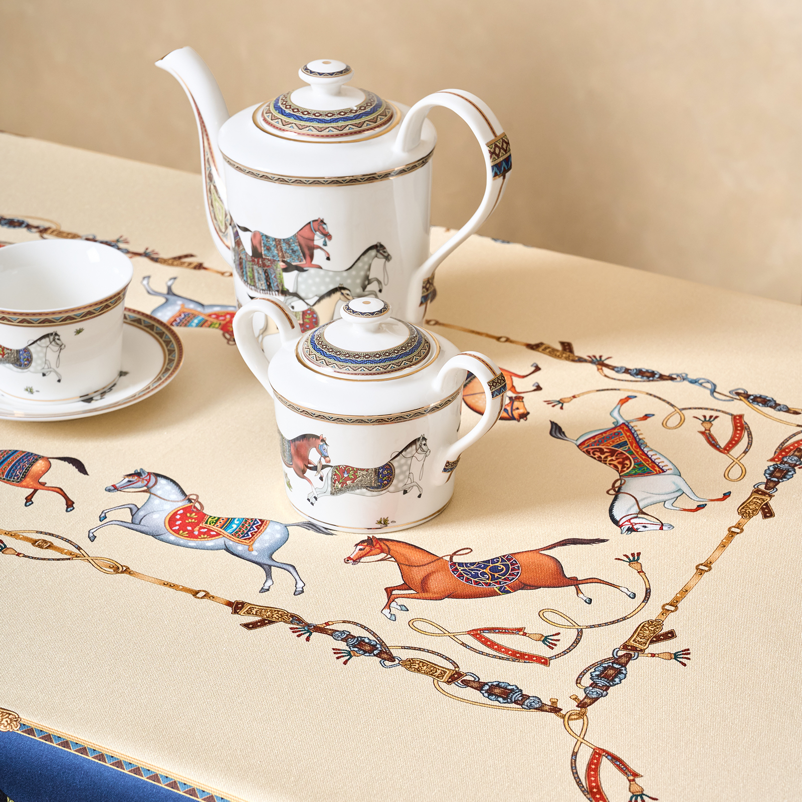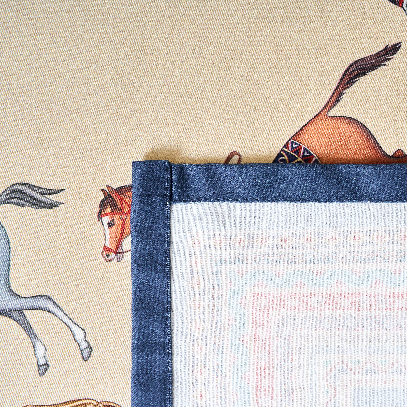 Благородный тёмно-синий фон украшен орнаментом с грациозными лошадьми, создавая атмосферу восточной роскоши. Лошадь — символ 2026 года, поэтому скатерть будет актуальна как для ежедневного использования в интерьере в стиле бохо, так и для праздничной сервировки. Авторский принт разработан художниками эксклюзивно для Lefard и нанесён методом цифровой печати, что гарантирует яркость и стойкость красок даже после множества стирок.