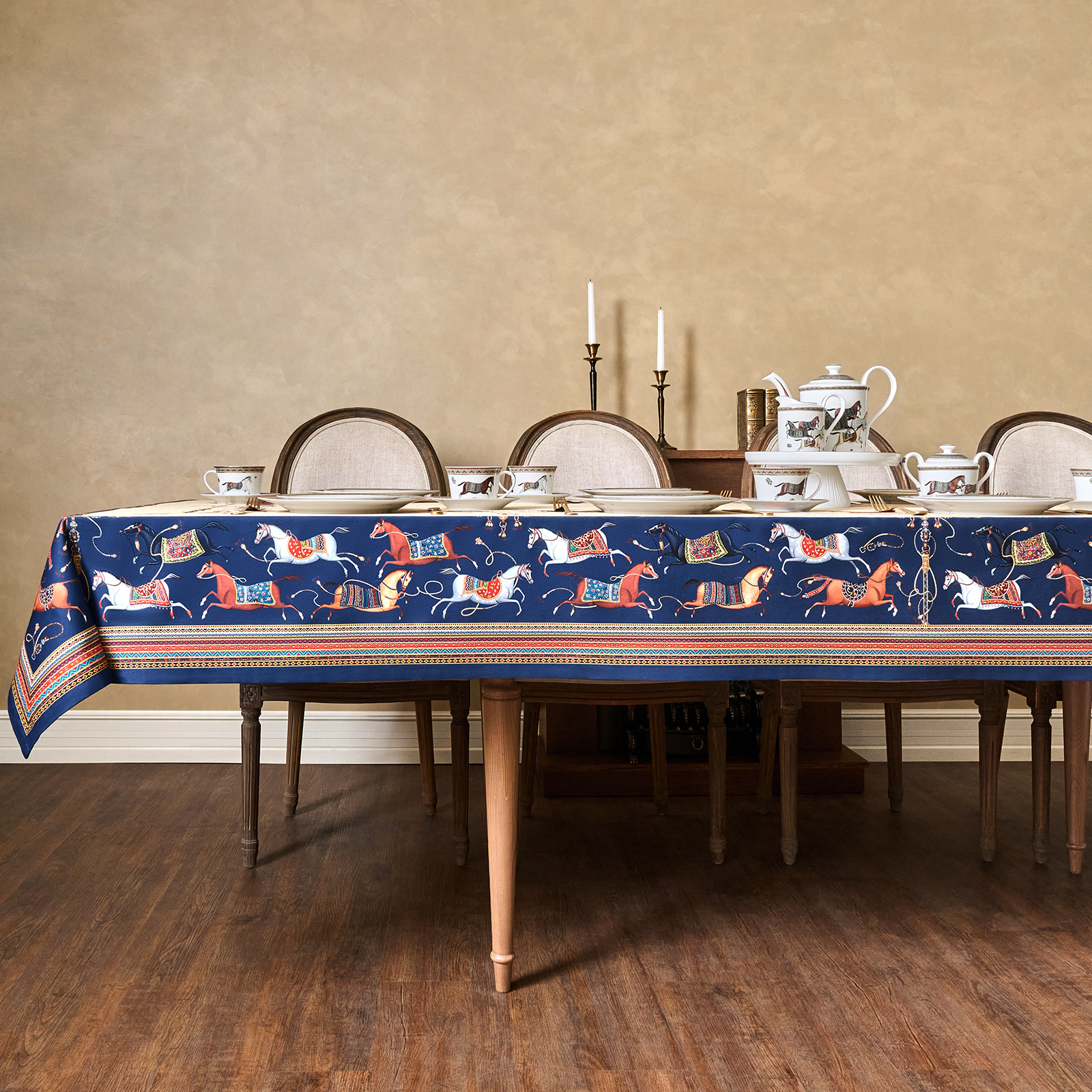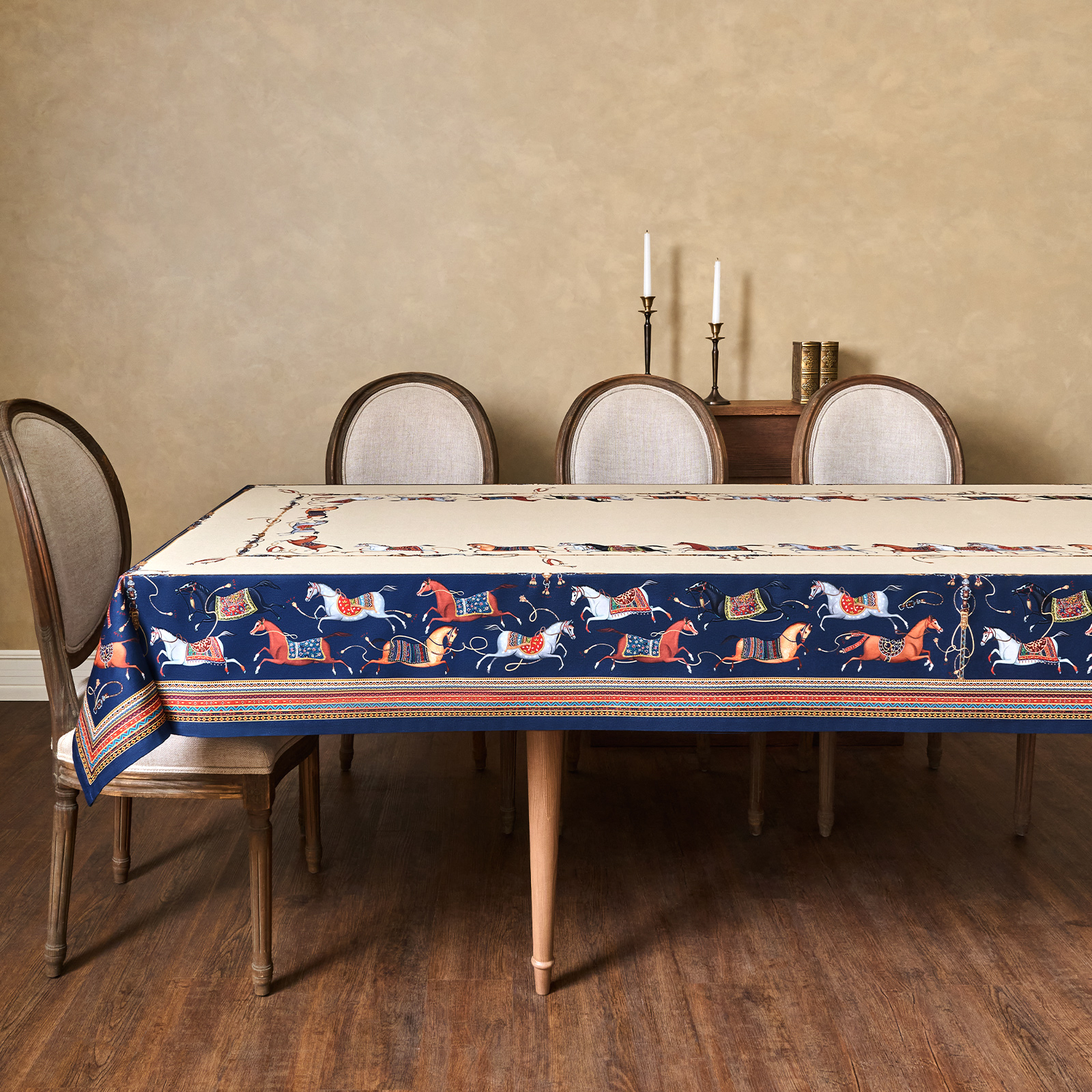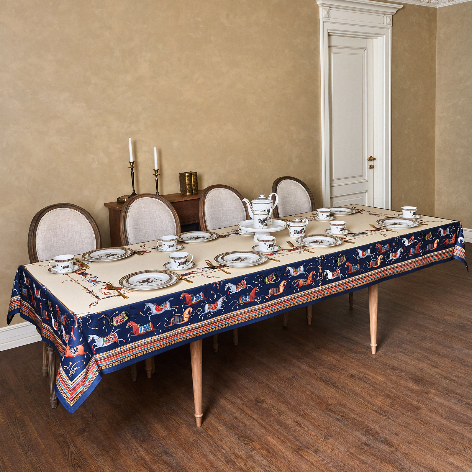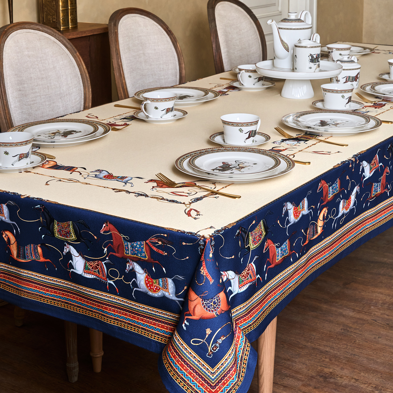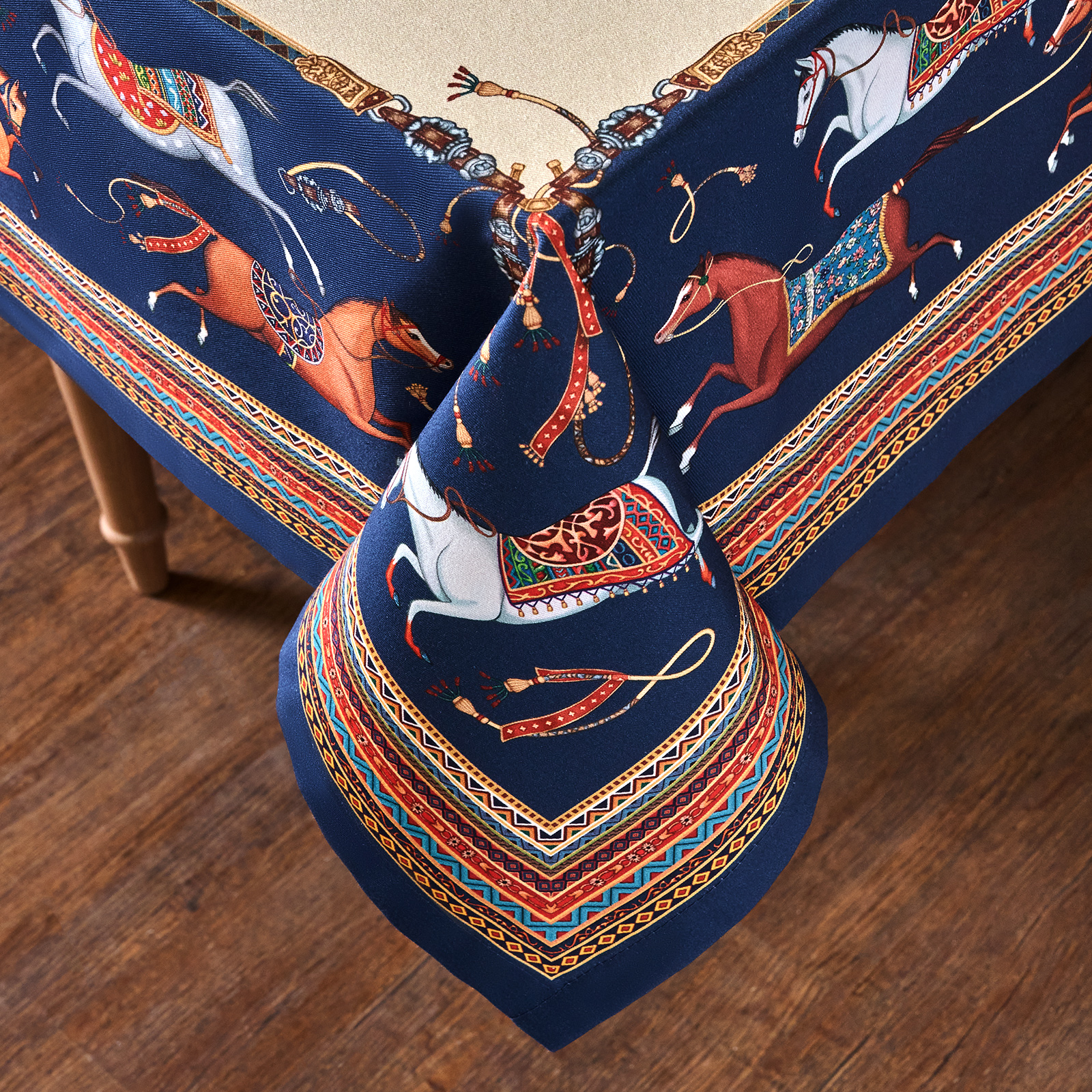 Благородный тёмно-синий фон украшен орнаментом с грациозными лошадьми, создавая атмосферу восточной роскоши. Лошадь — символ 2026 года, поэтому скатерть будет актуальна как для ежедневного использования в интерьере в стиле бохо, так и для праздничной сервировки. Авторский принт разработан художниками эксклюзивно для Lefard и нанесён методом цифровой печати, что гарантирует яркость и стойкость красок даже после множества стирок.