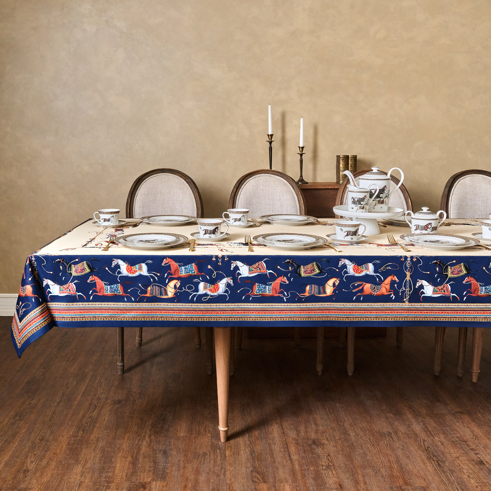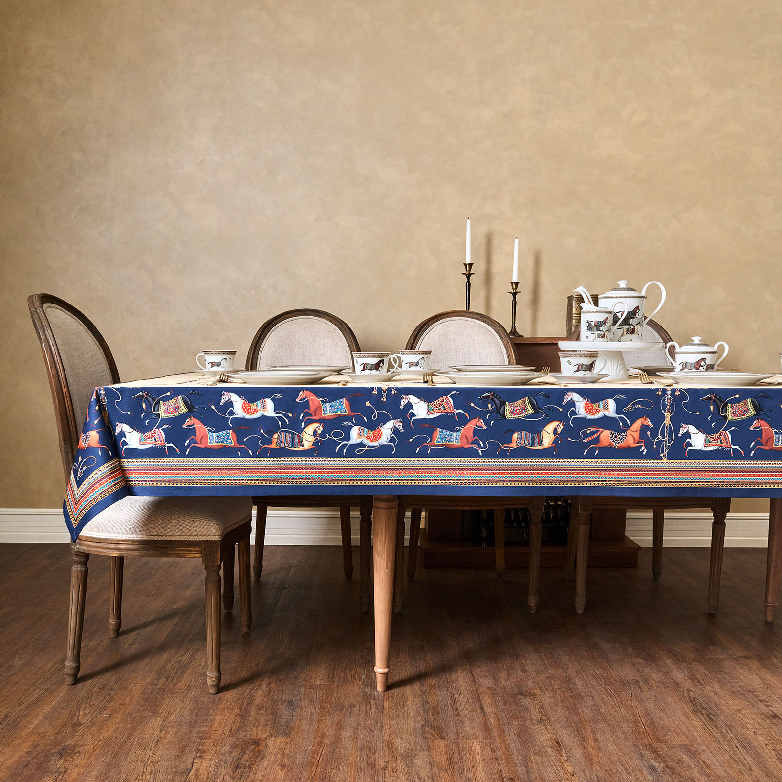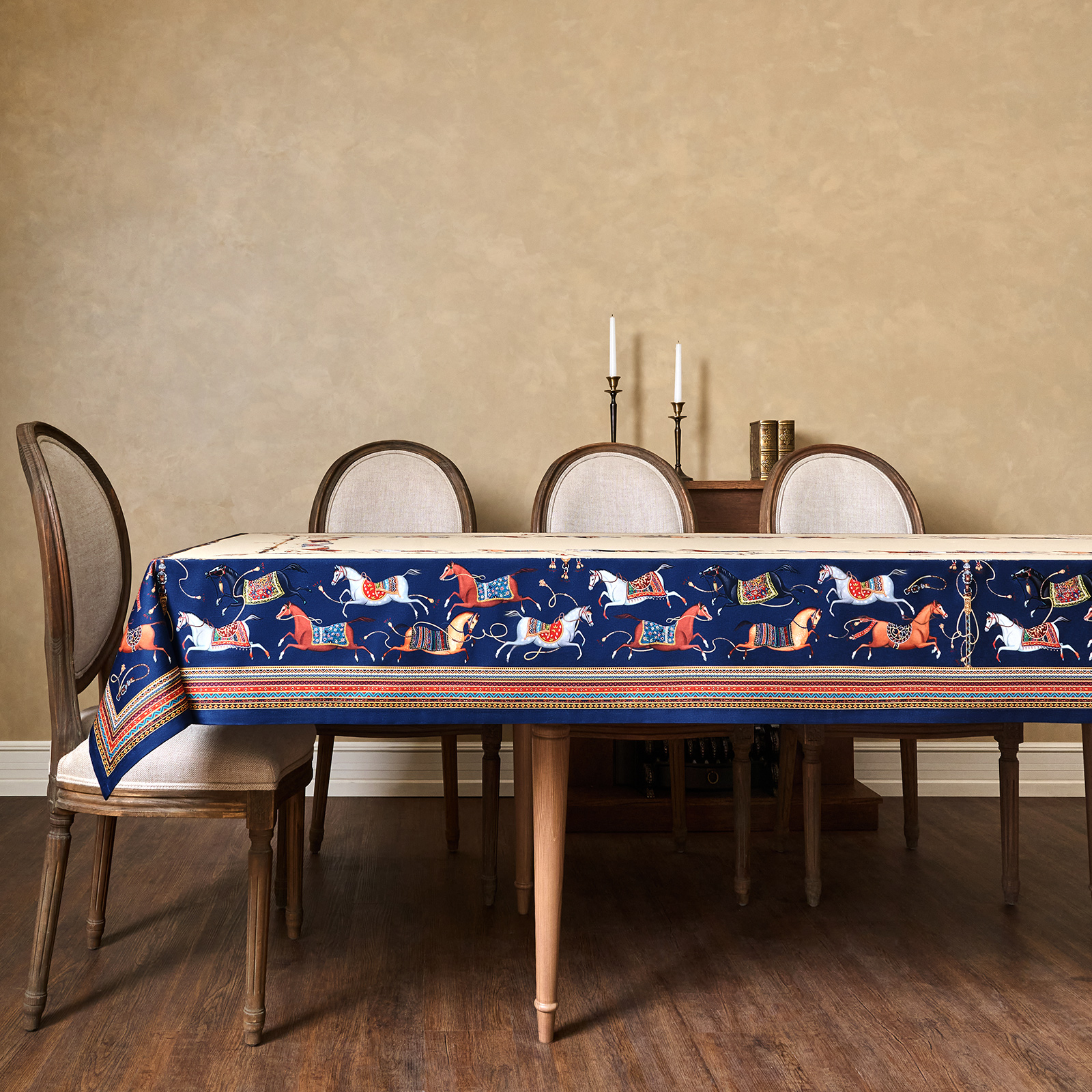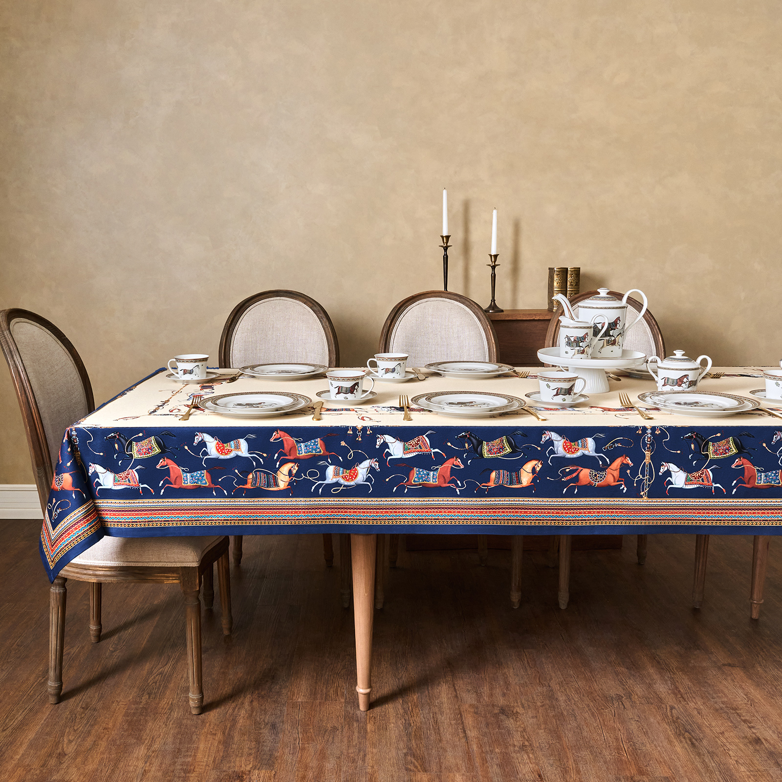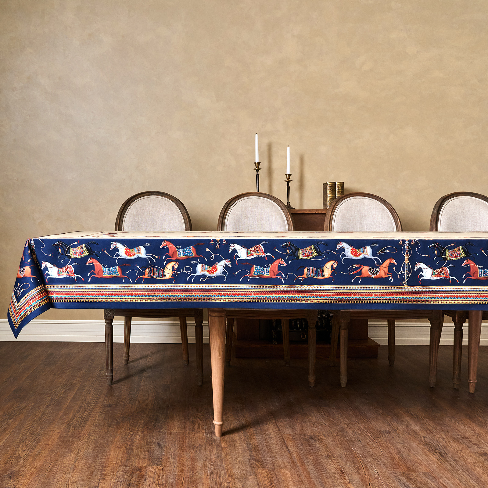 Благородный тёмно-синий фон украшен орнаментом с грациозными лошадьми, создавая атмосферу восточной роскоши. Лошадь — символ 2026 года, поэтому скатерть будет актуальна как для ежедневного использования в интерьере в стиле бохо, так и для праздничной сервировки. Авторский принт разработан художниками эксклюзивно для Lefard и нанесён методом цифровой печати, что гарантирует яркость и стойкость красок даже после множества стирок.
