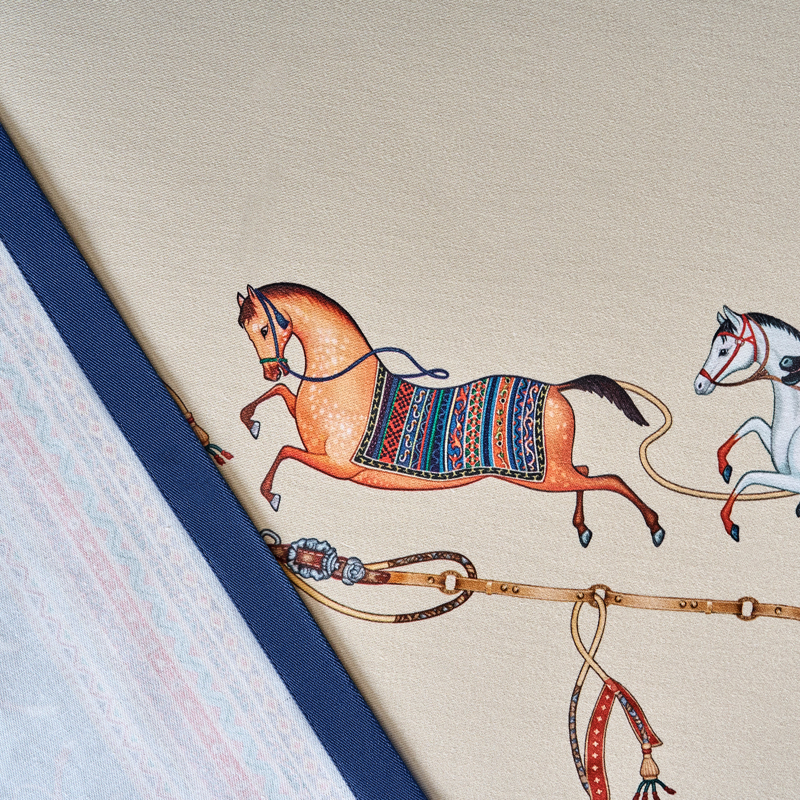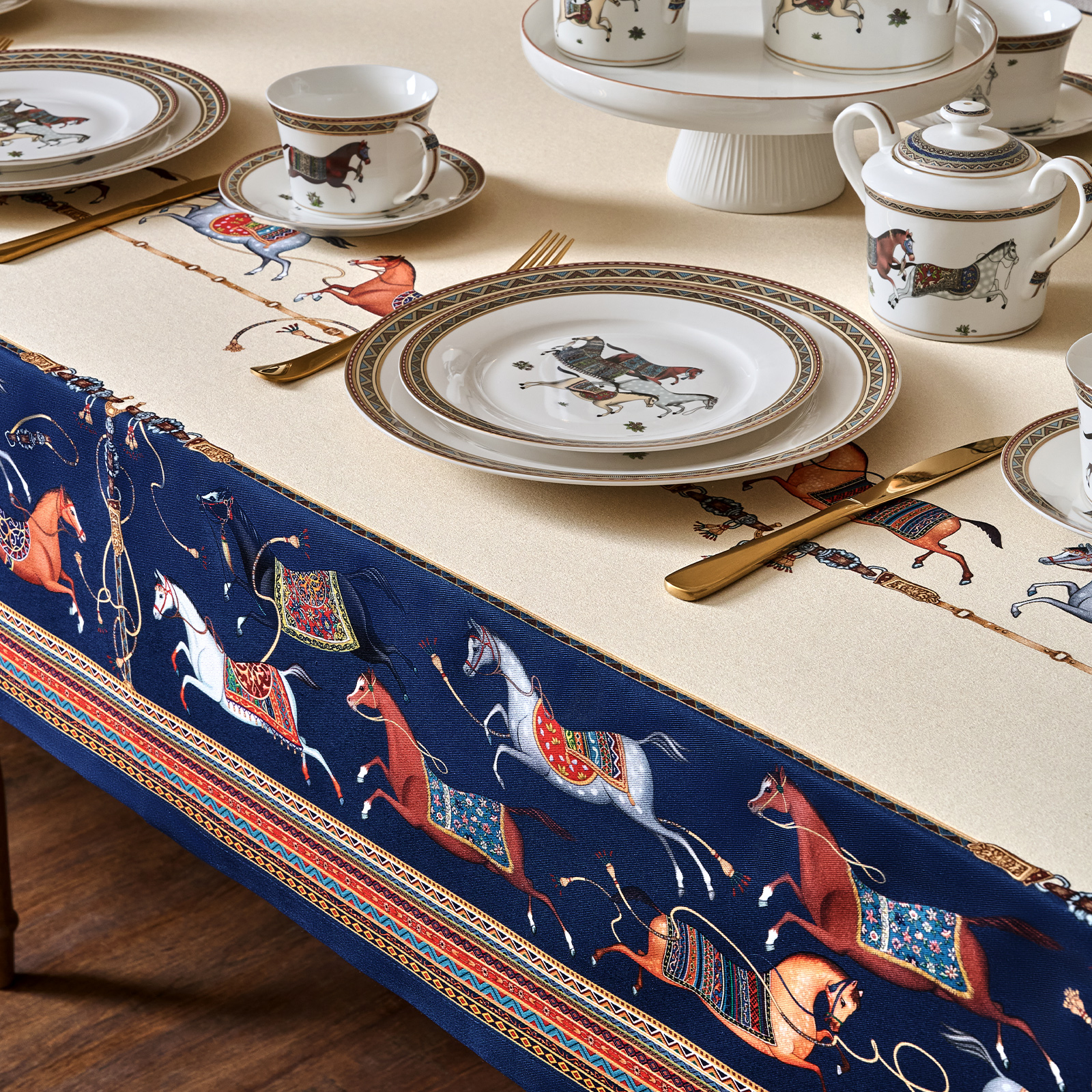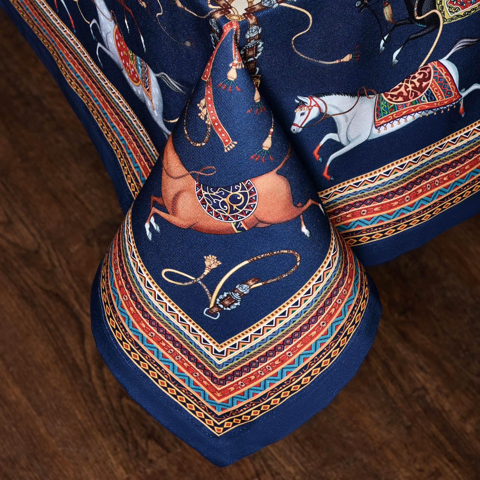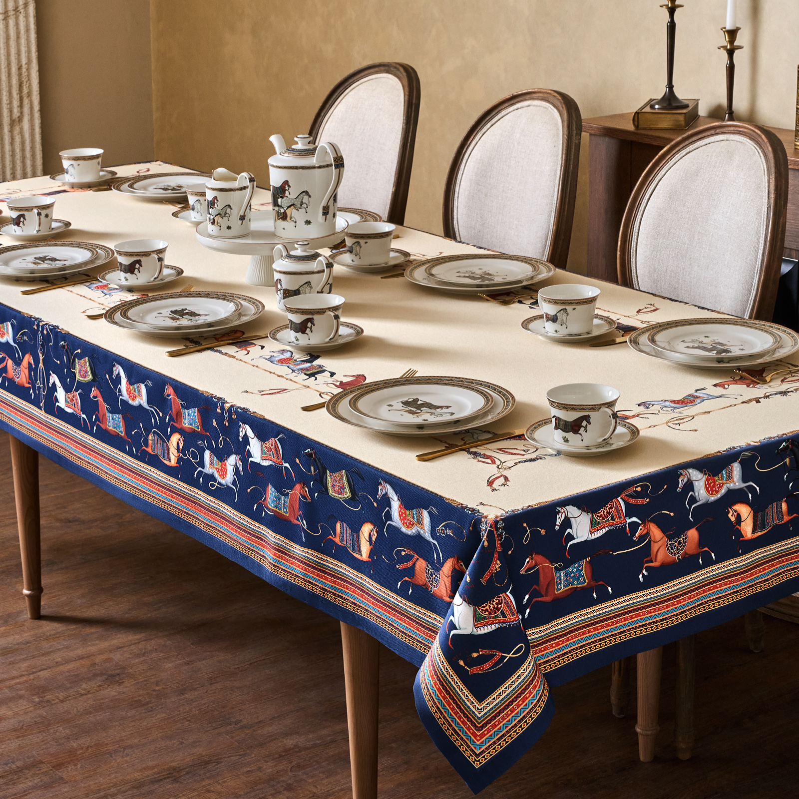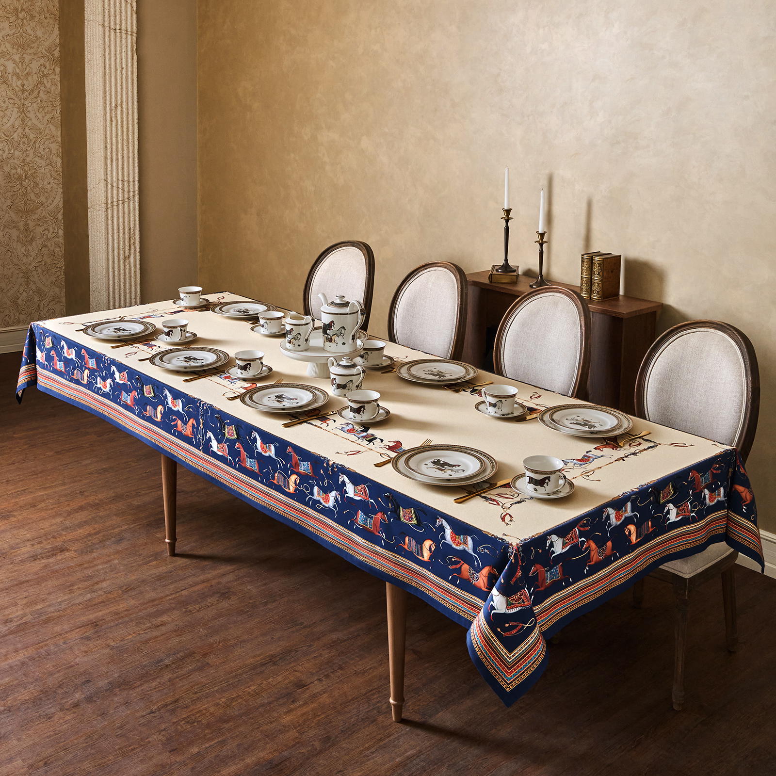 Благородный тёмно-синий фон украшен орнаментом с грациозными лошадьми, создавая атмосферу восточной роскоши. Лошадь — символ 2026 года, поэтому скатерть будет актуальна как для ежедневного использования в интерьере в стиле бохо, так и для праздничной сервировки. Авторский принт разработан художниками эксклюзивно для Lefard и нанесён методом цифровой печати, что гарантирует яркость и стойкость красок даже после множества стирок.