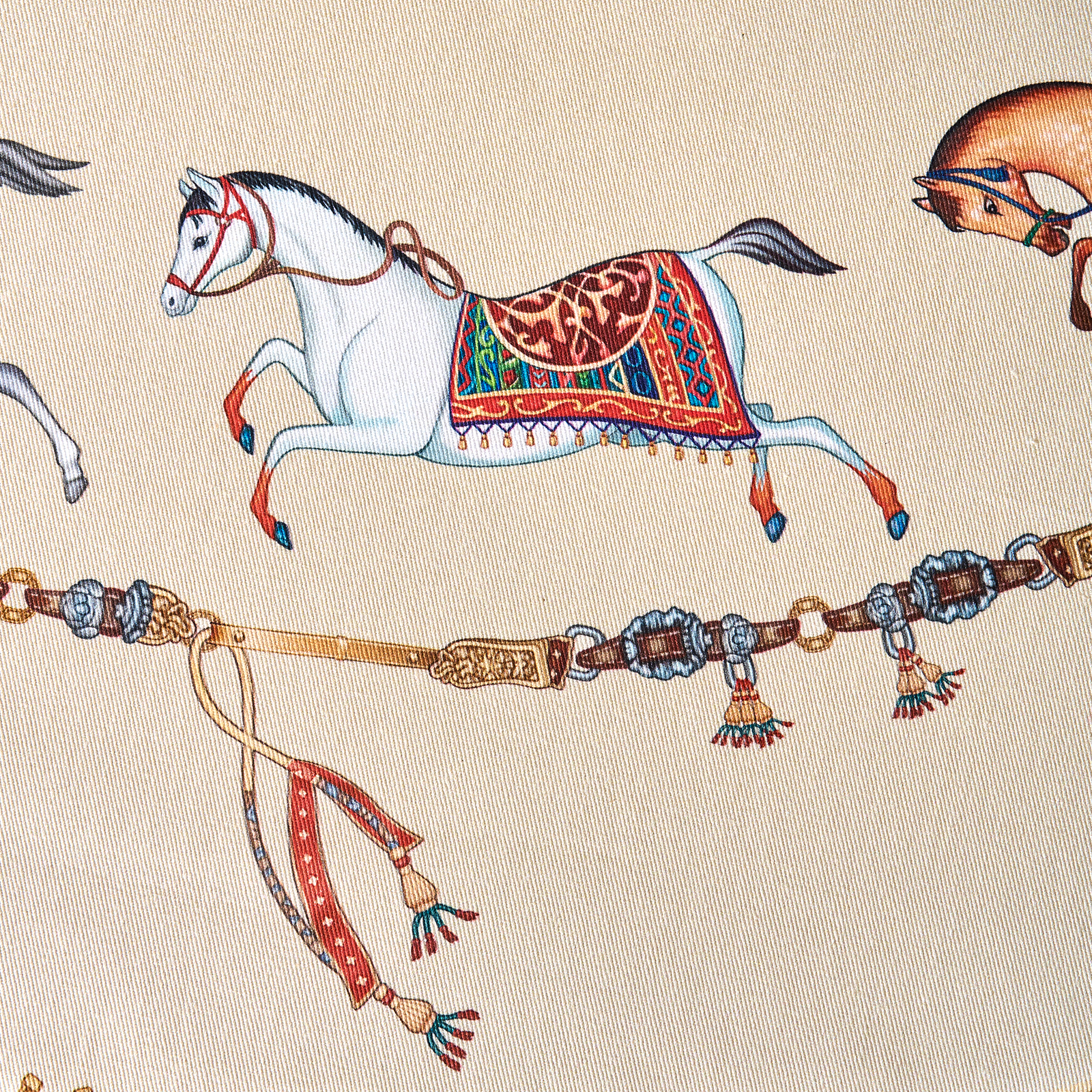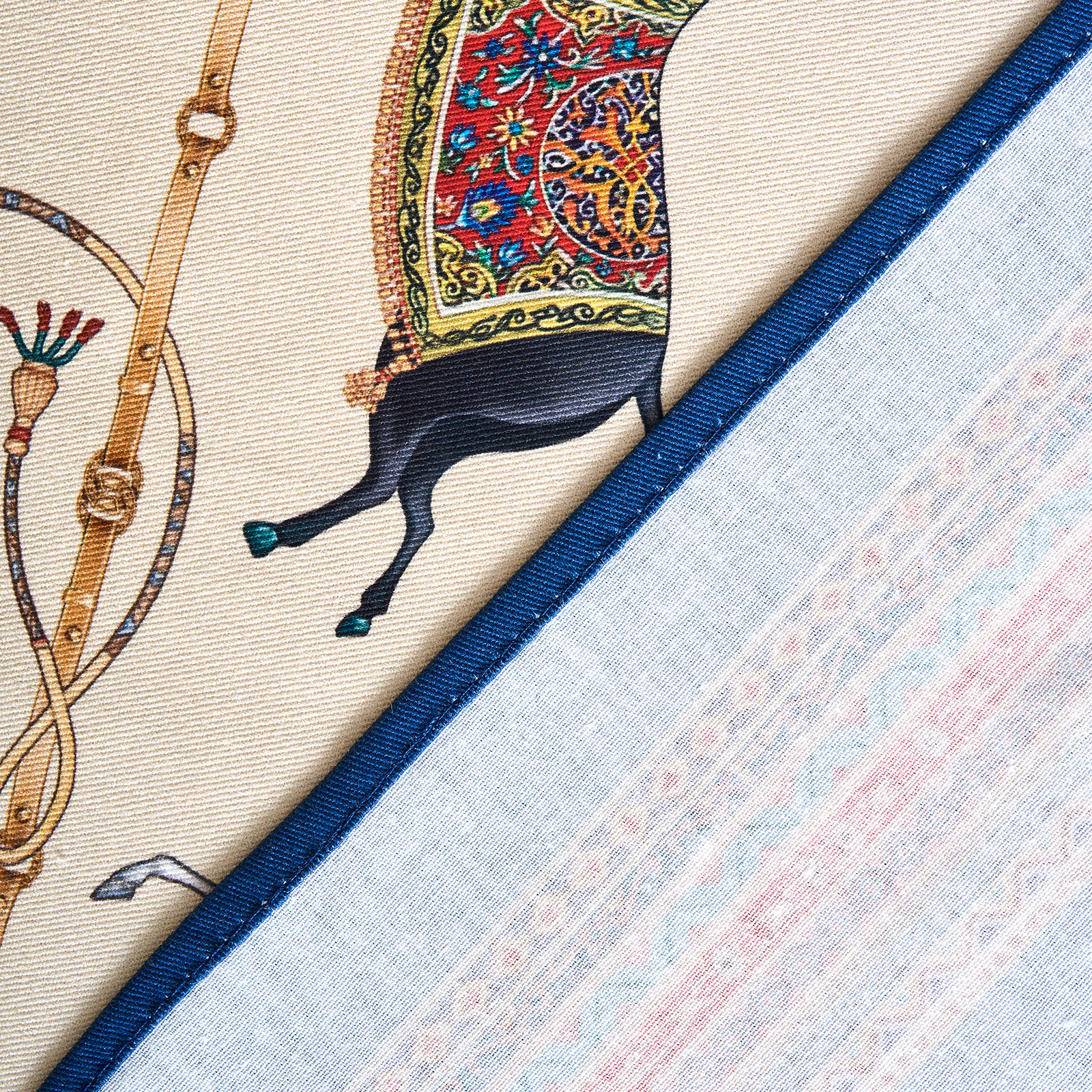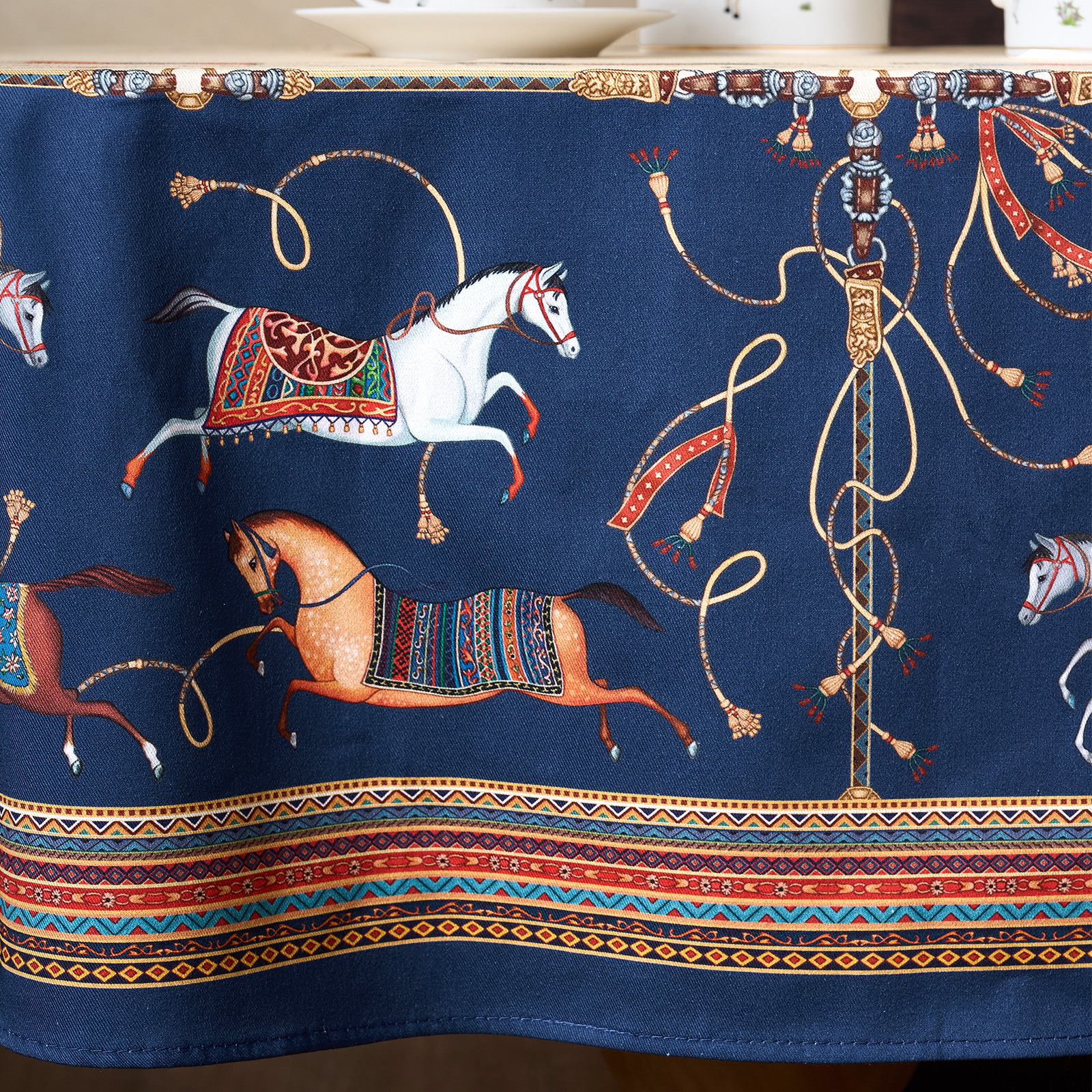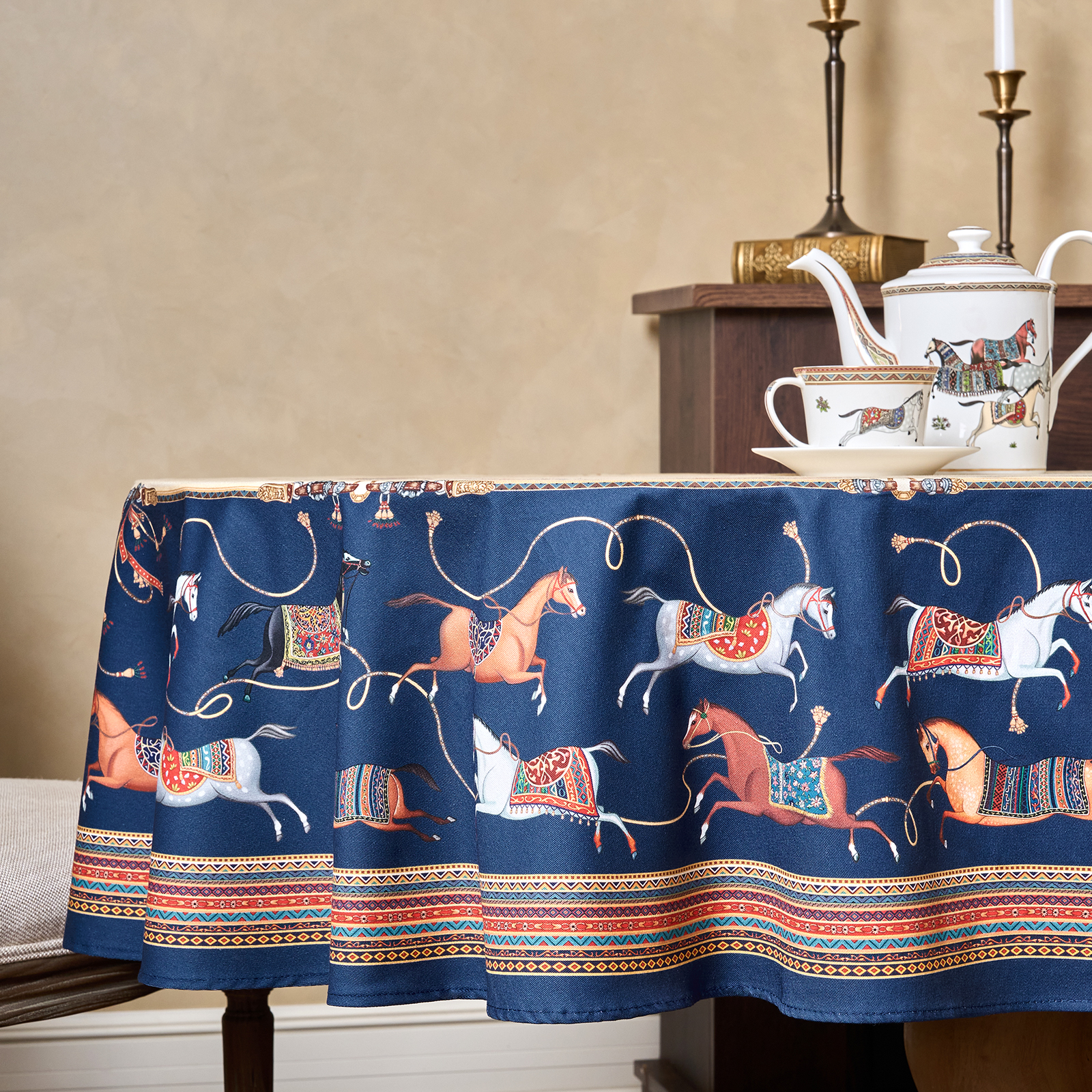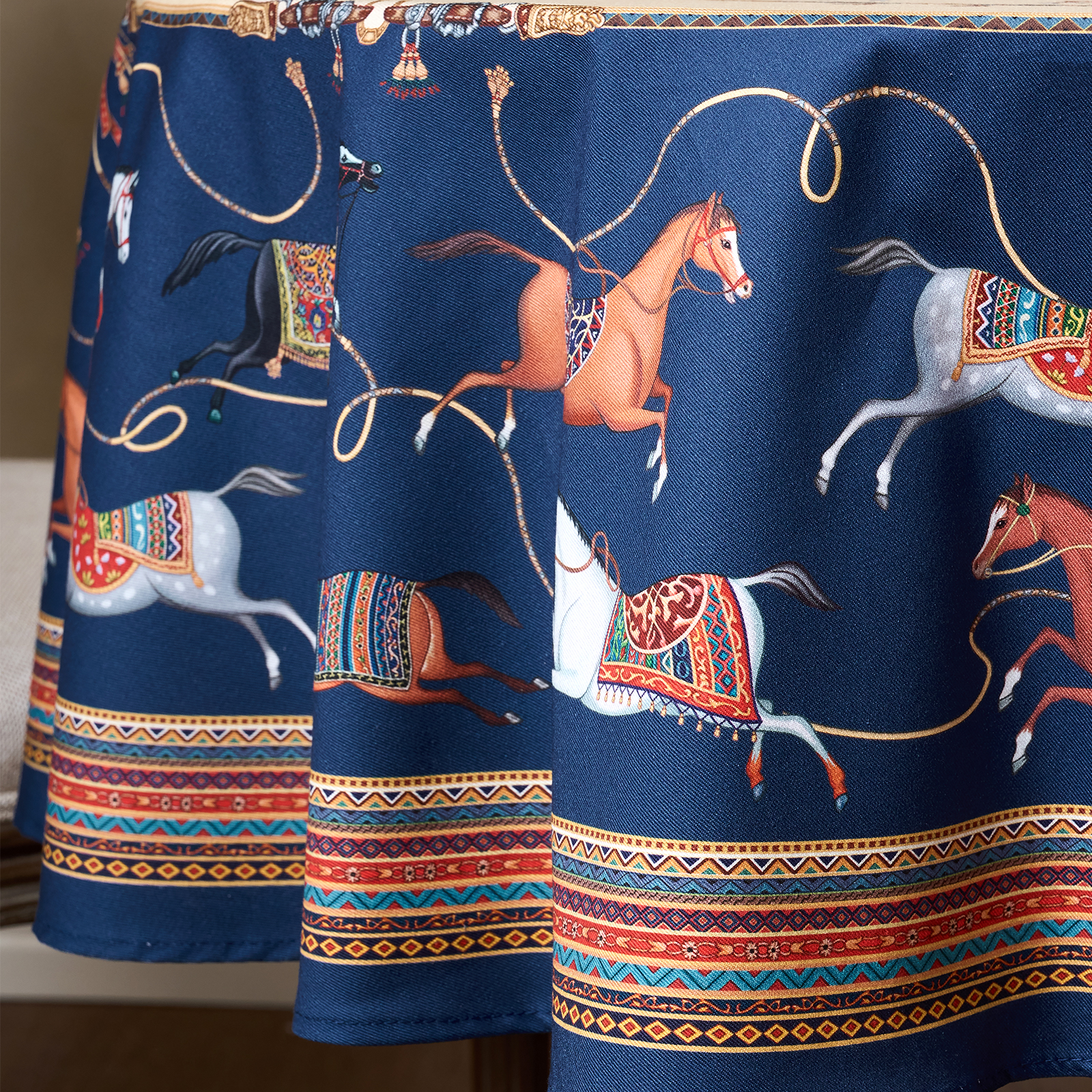 Благородный тёмно-синий фон украшен орнаментом с грациозными лошадьми, создавая атмосферу восточной роскоши. Лошадь — символ 2026 года, поэтому скатерть будет актуальна как для ежедневного использования в интерьере в стиле бохо, так и для праздничной сервировки. Авторский принт разработан художниками эксклюзивно для Lefard и нанесён методом цифровой печати, что гарантирует яркость и стойкость красок даже после множества стирок.