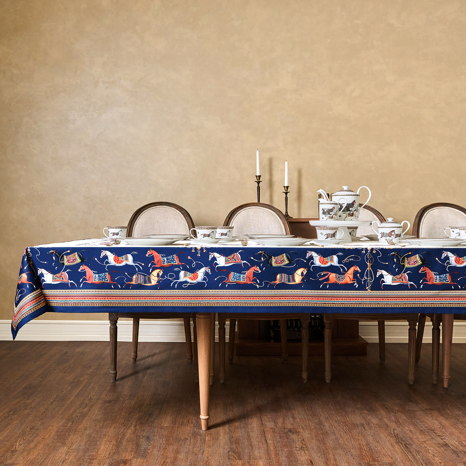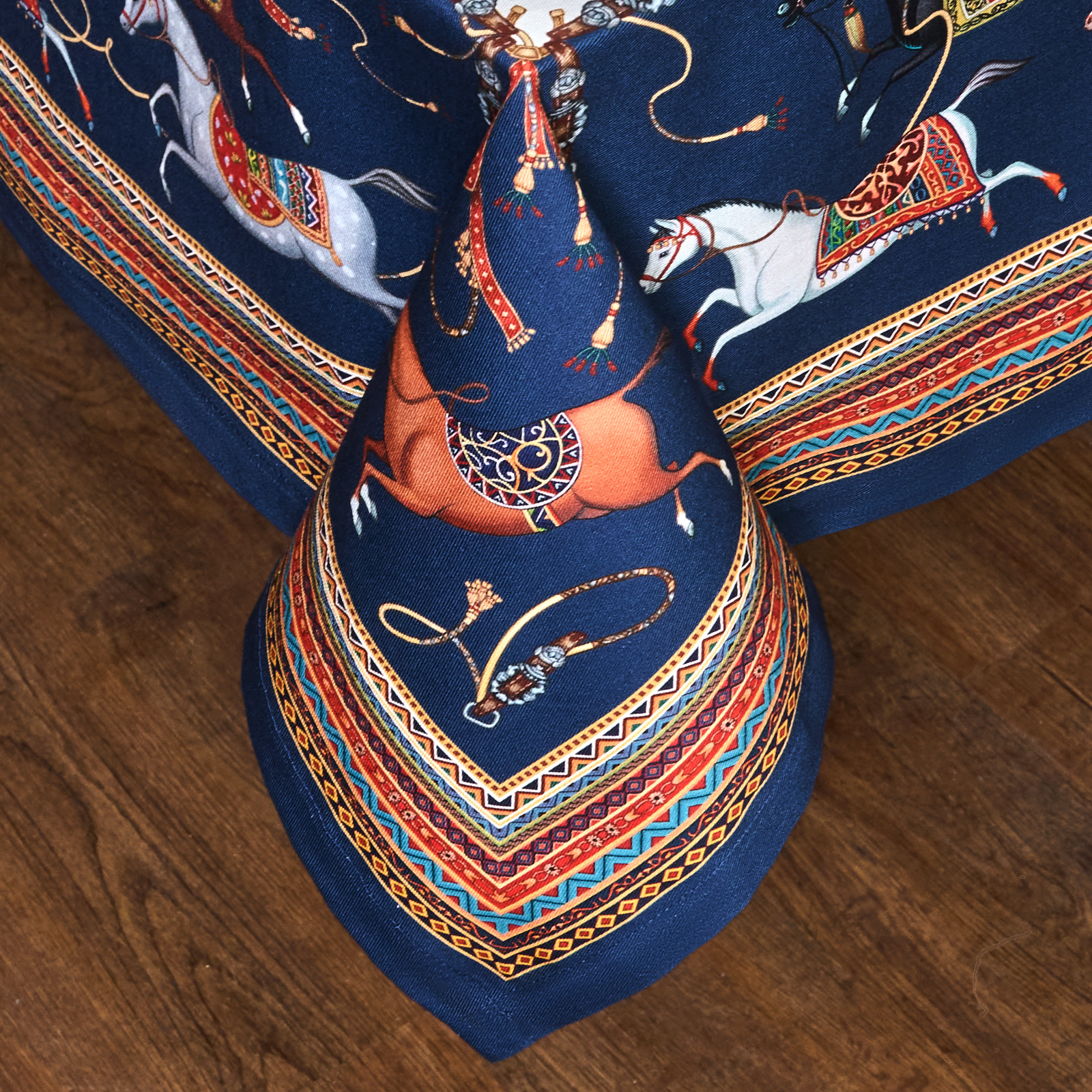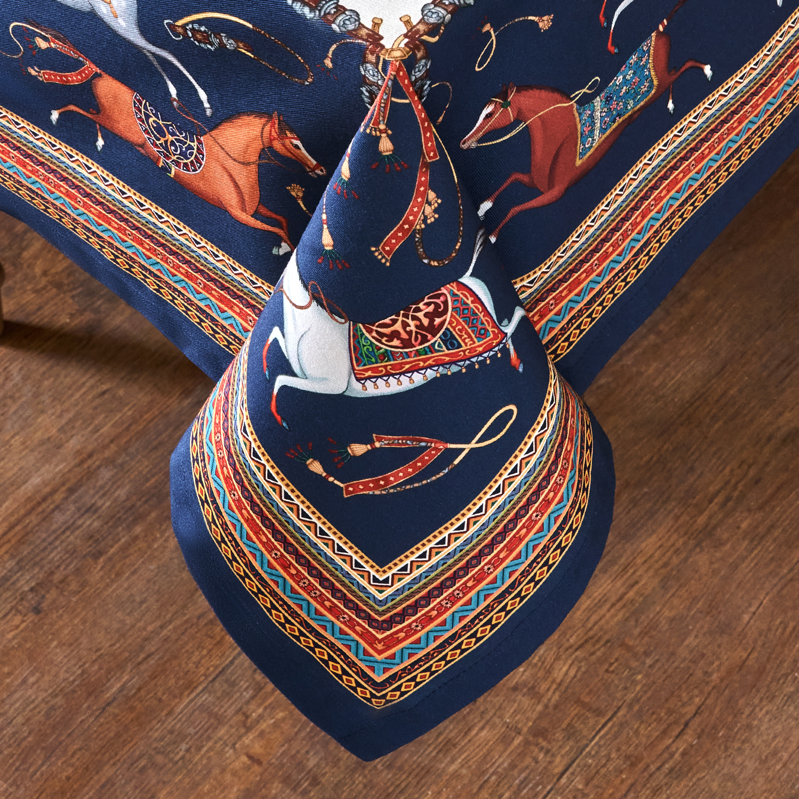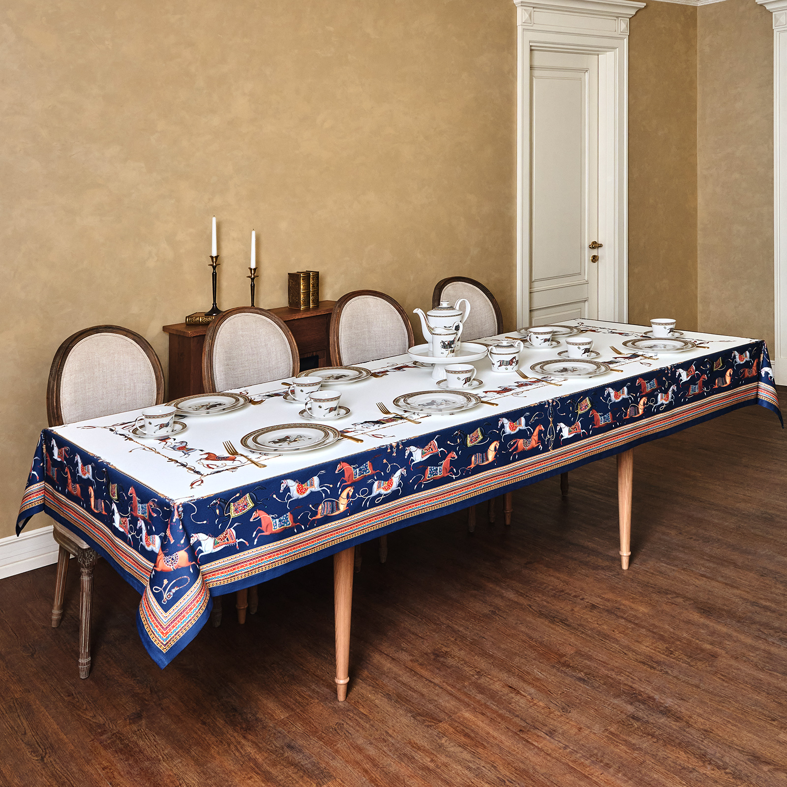 Благородный тёмно-синий фон украшен орнаментом с грациозными лошадьми, создавая атмосферу восточной роскоши. Лошадь — символ 2026 года, поэтому скатерть будет актуальна как для ежедневного использования в интерьере в стиле бохо, так и для праздничной сервировки. Авторский принт разработан художниками эксклюзивно для Lefard и нанесён методом цифровой печати, что гарантирует яркость и стойкость красок даже после множества стирок.