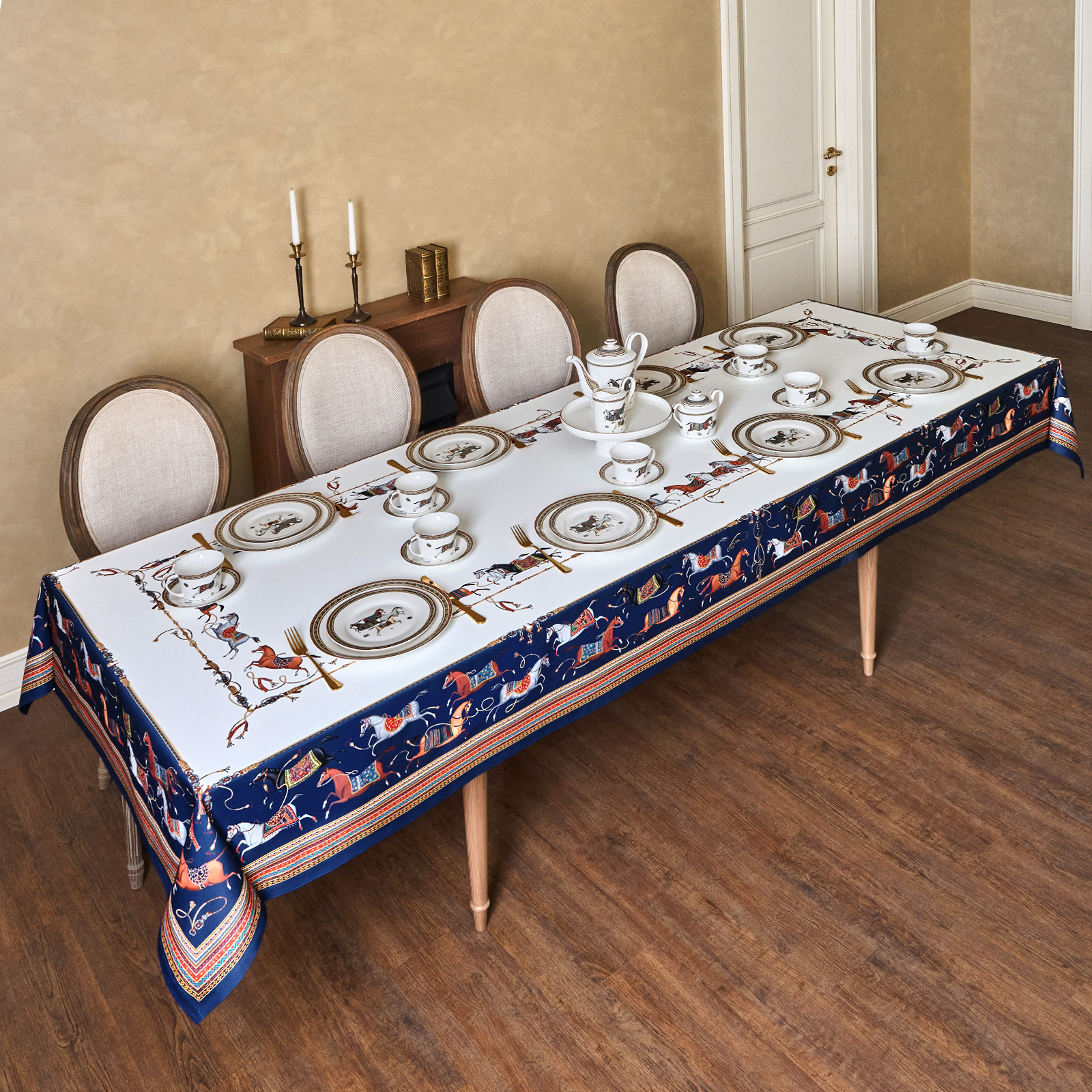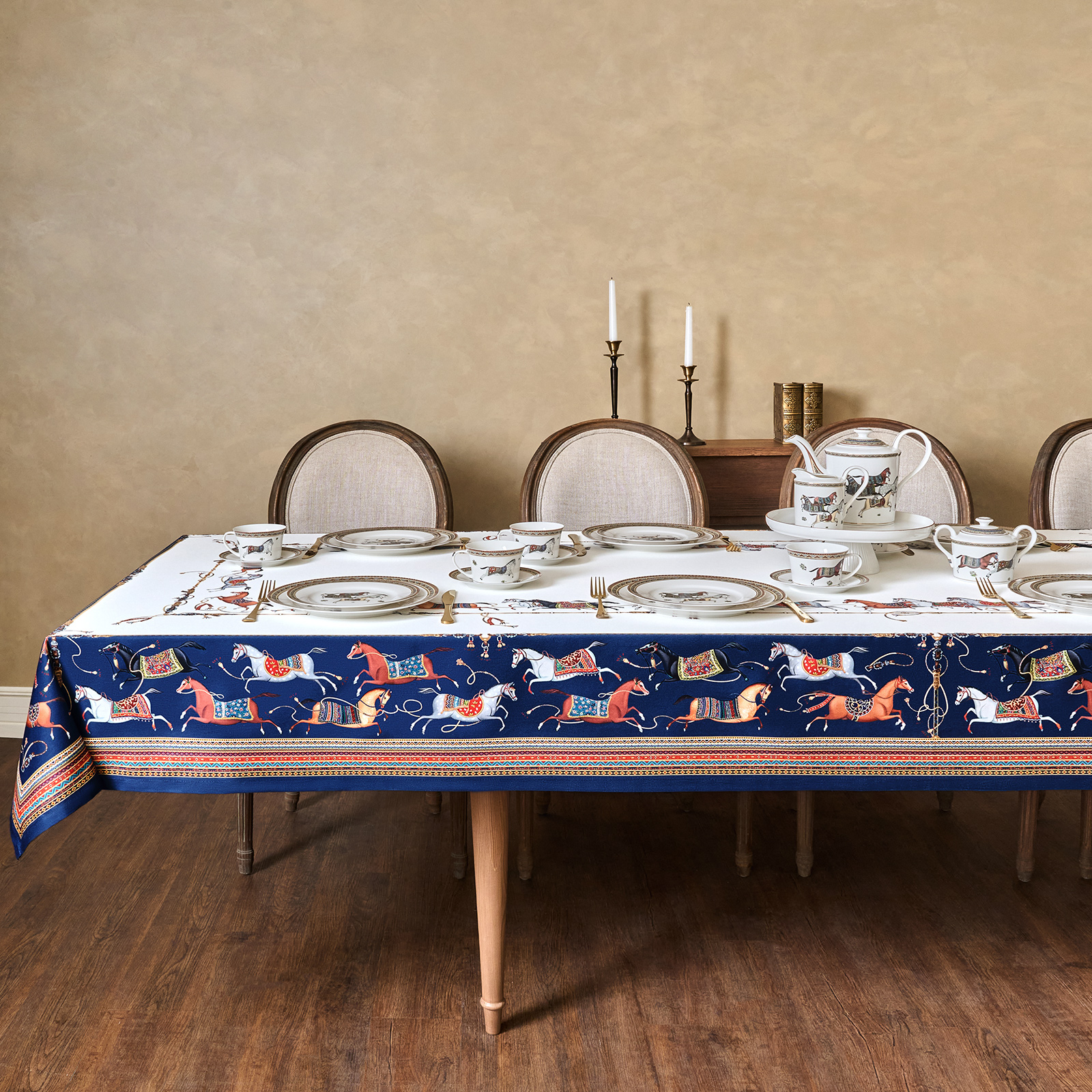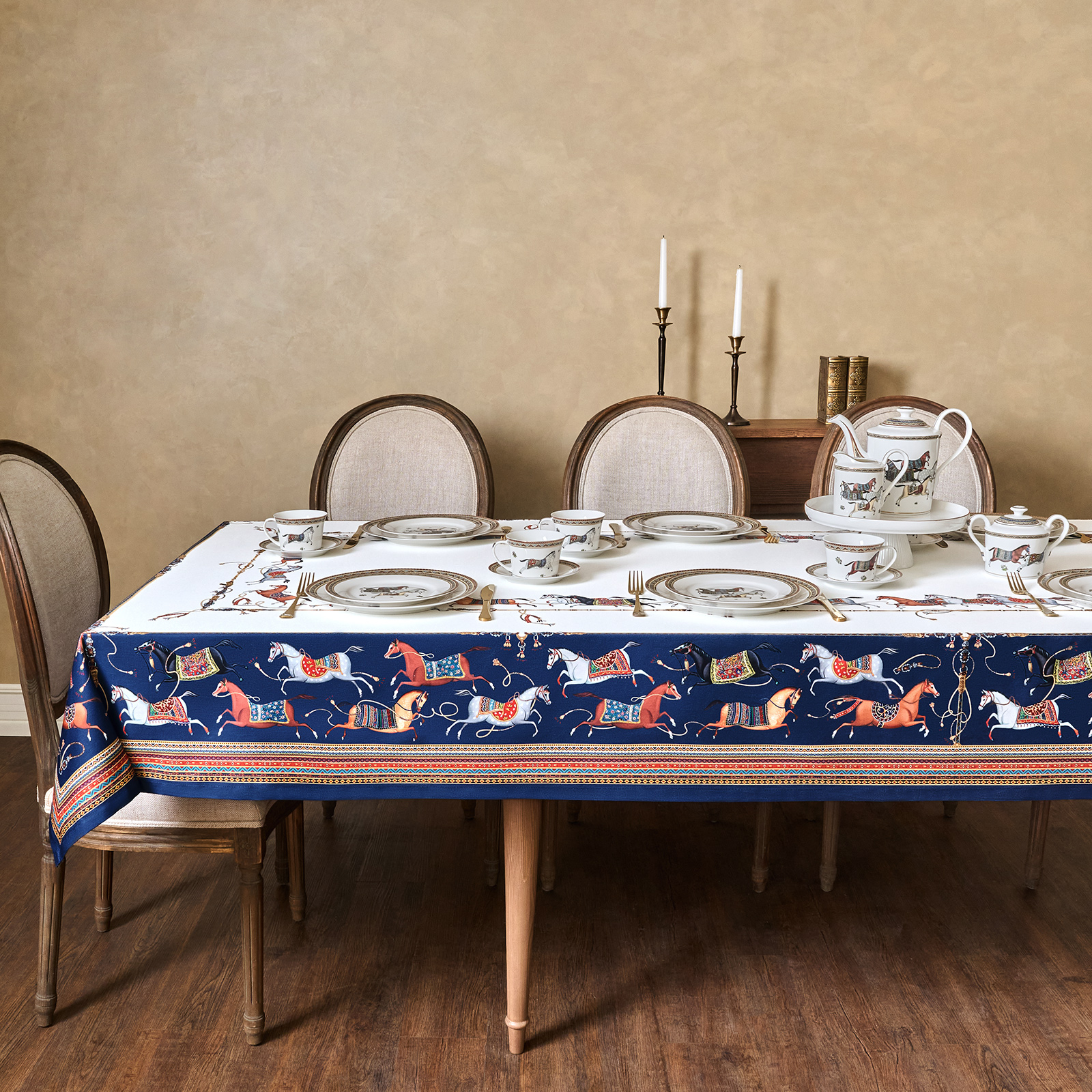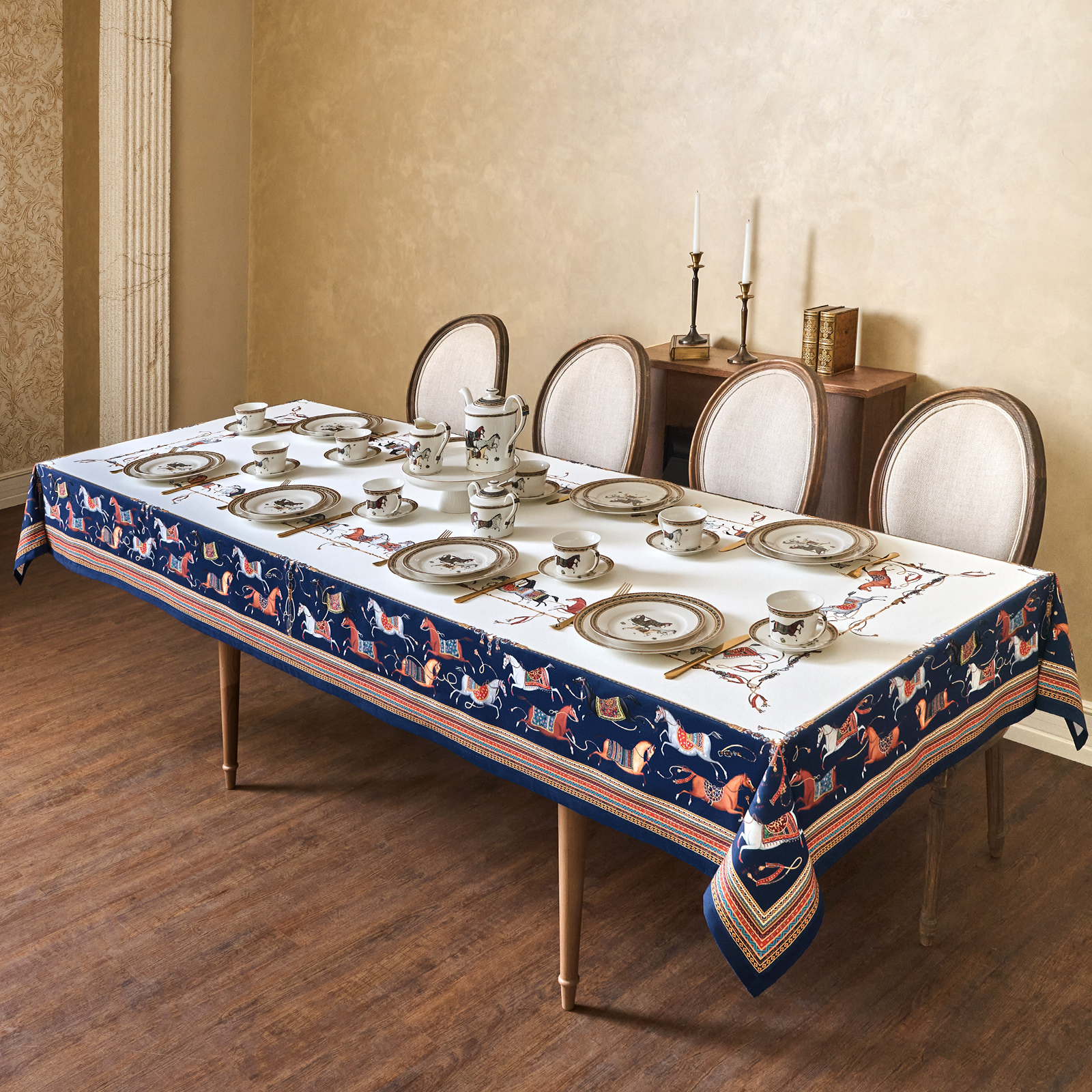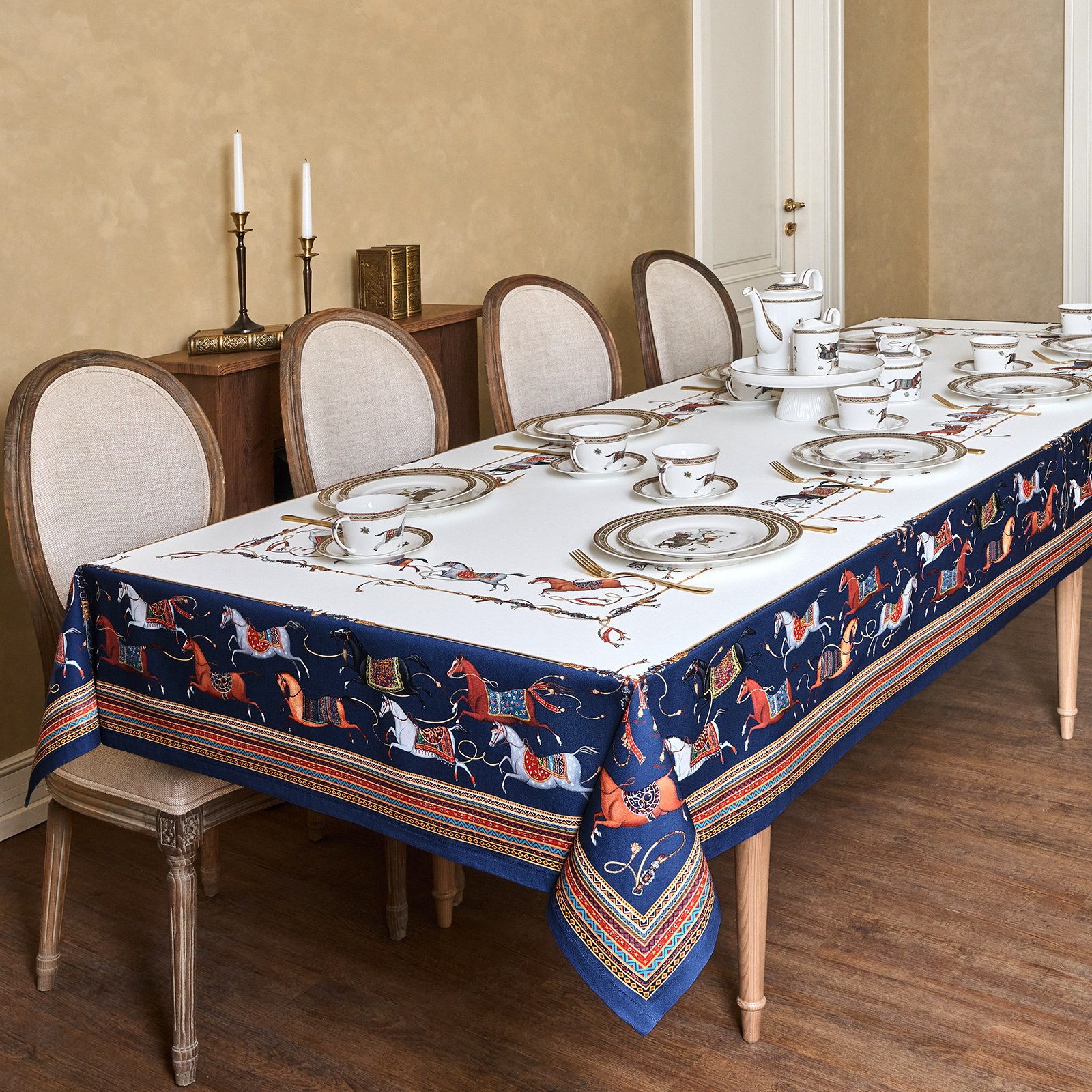 Благородный тёмно-синий фон украшен орнаментом с грациозными лошадьми, создавая атмосферу восточной роскоши. Лошадь — символ 2026 года, поэтому скатерть будет актуальна как для ежедневного использования в интерьере в стиле бохо, так и для праздничной сервировки. Авторский принт разработан художниками эксклюзивно для Lefard и нанесён методом цифровой печати, что гарантирует яркость и стойкость красок даже после множества стирок.