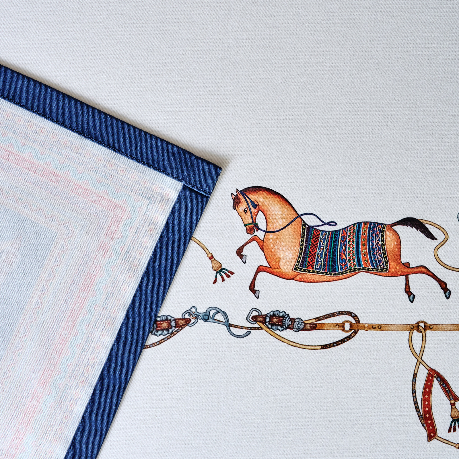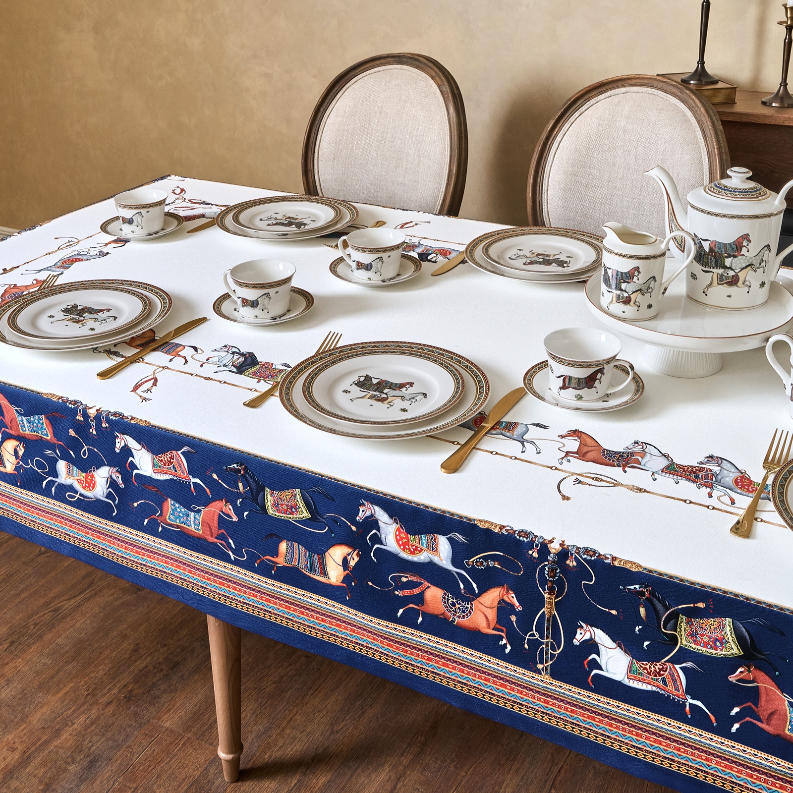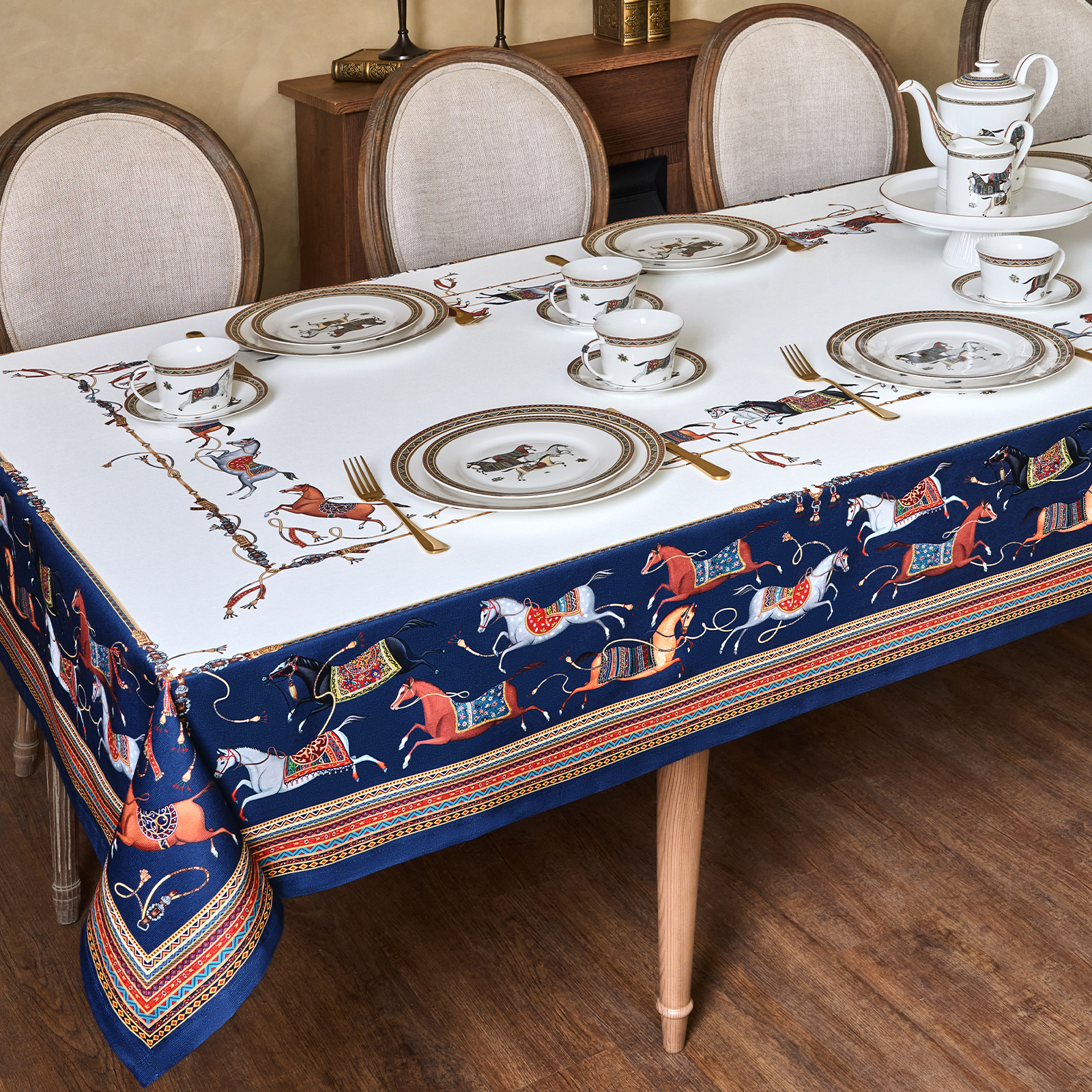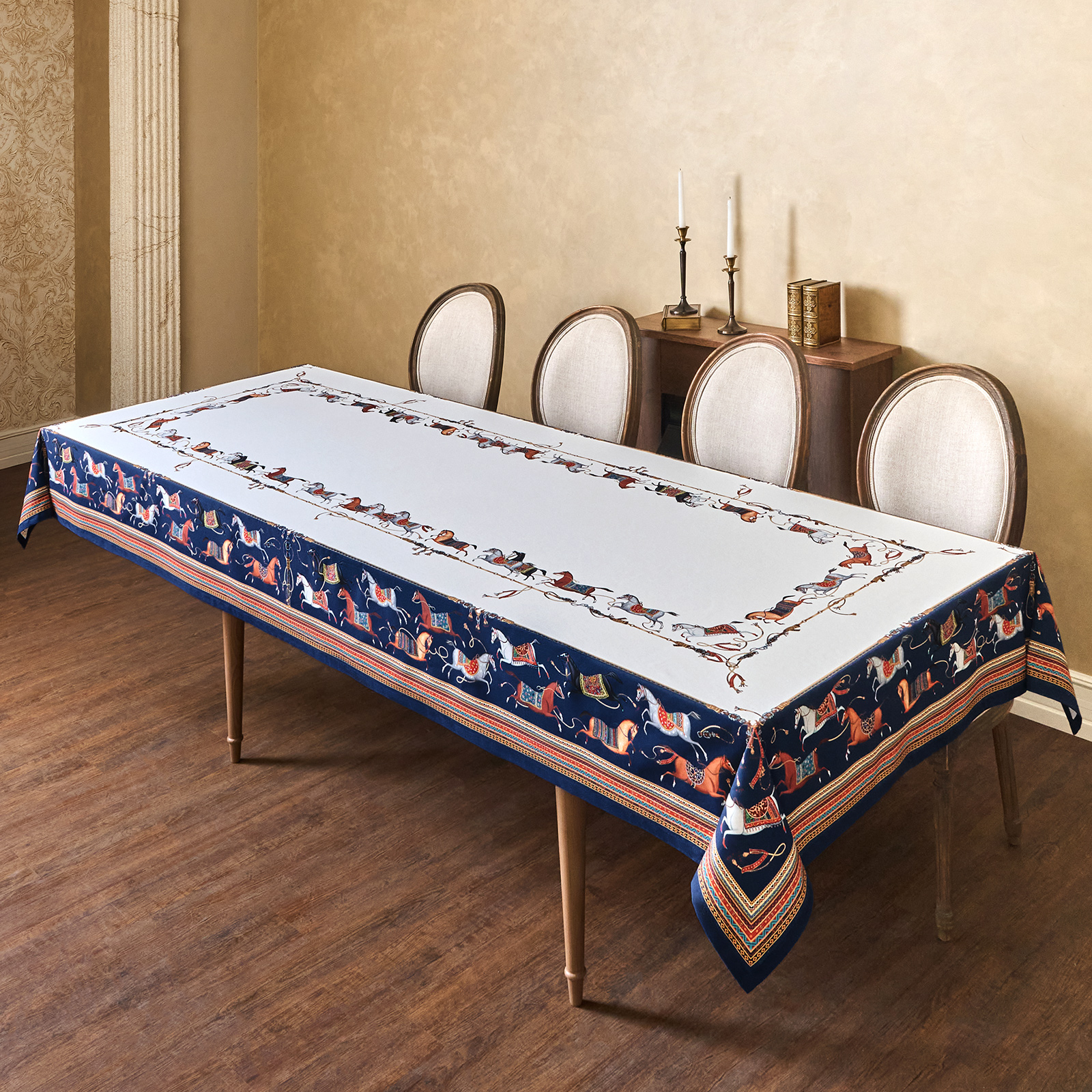Благородный тёмно-синий фон украшен орнаментом с грациозными лошадьми, создавая атмосферу восточной роскоши. Лошадь — символ 2026 года, поэтому скатерть будет актуальна как для ежедневного использования в интерьере в стиле бохо, так и для праздничной сервировки. Авторский принт разработан художниками эксклюзивно для Lefard и нанесён методом цифровой печати, что гарантирует яркость и стойкость красок даже после множества стирок.