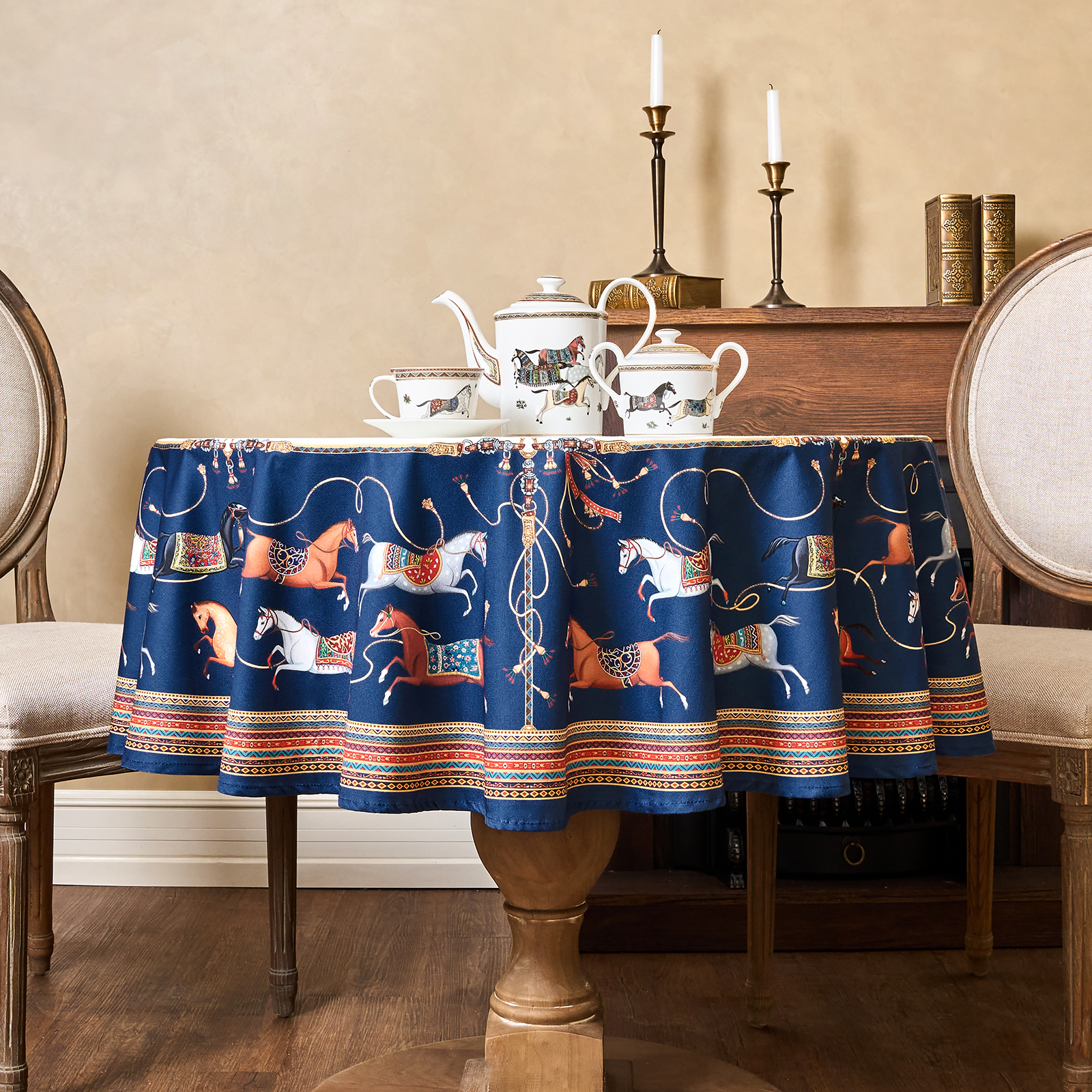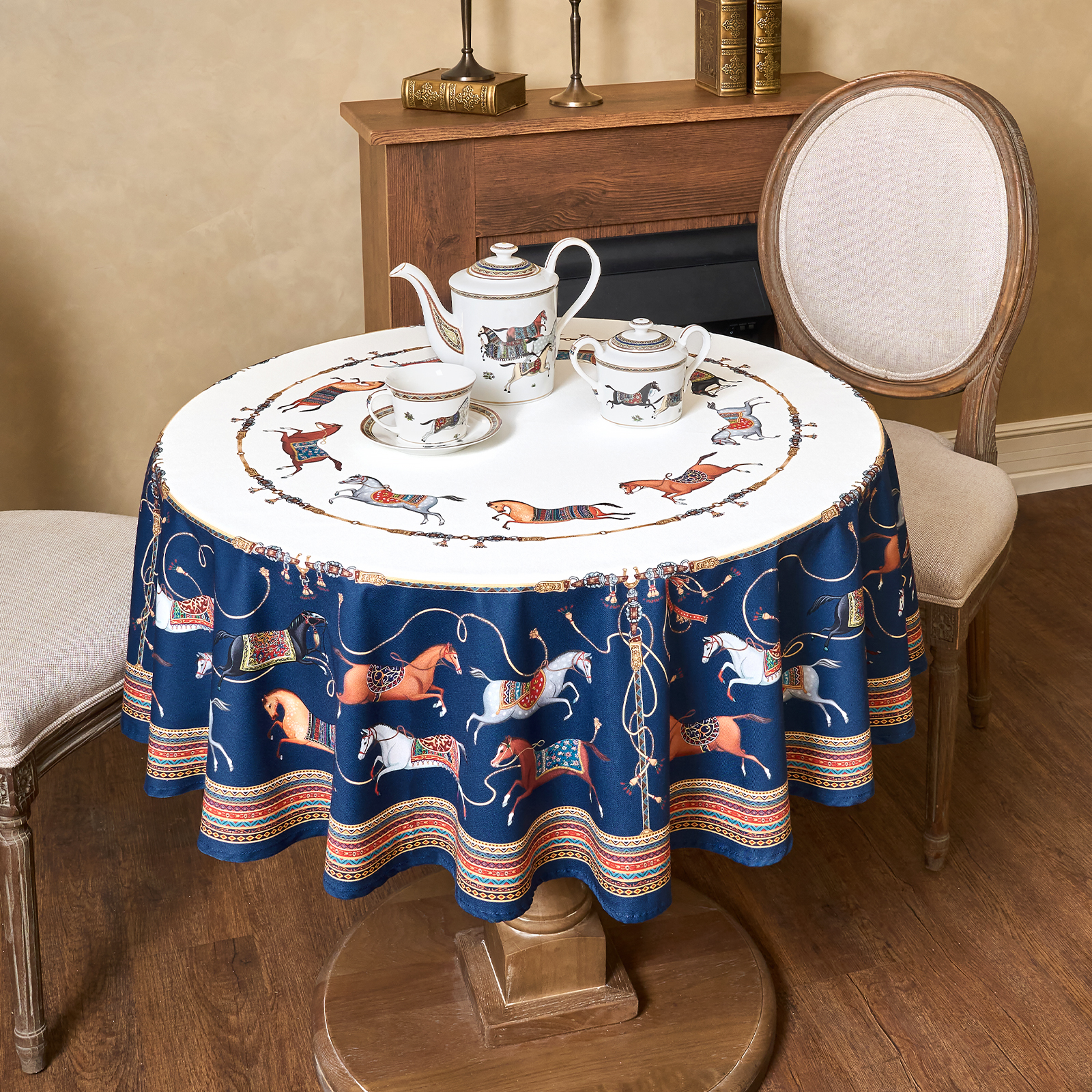 Темно-синий фон украшен авторским орнаментом с изящными лошадьми — символом 2026 года. Такой принт делает скатерть особенно уместной для праздничной сервировки и стильным украшением интерьера. Рисунок разработан художниками Lefard и нанесён методом цифровой печати, что обеспечивает стойкость красок даже после множества стирок.