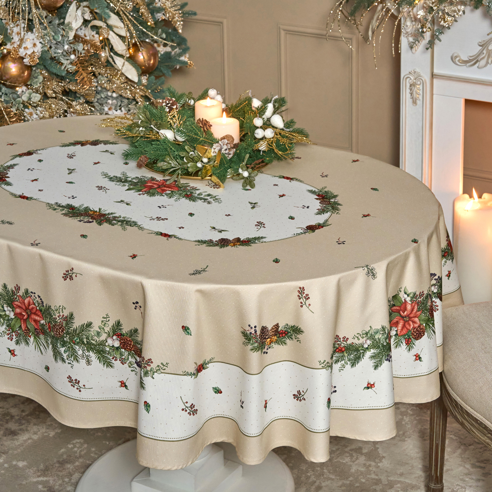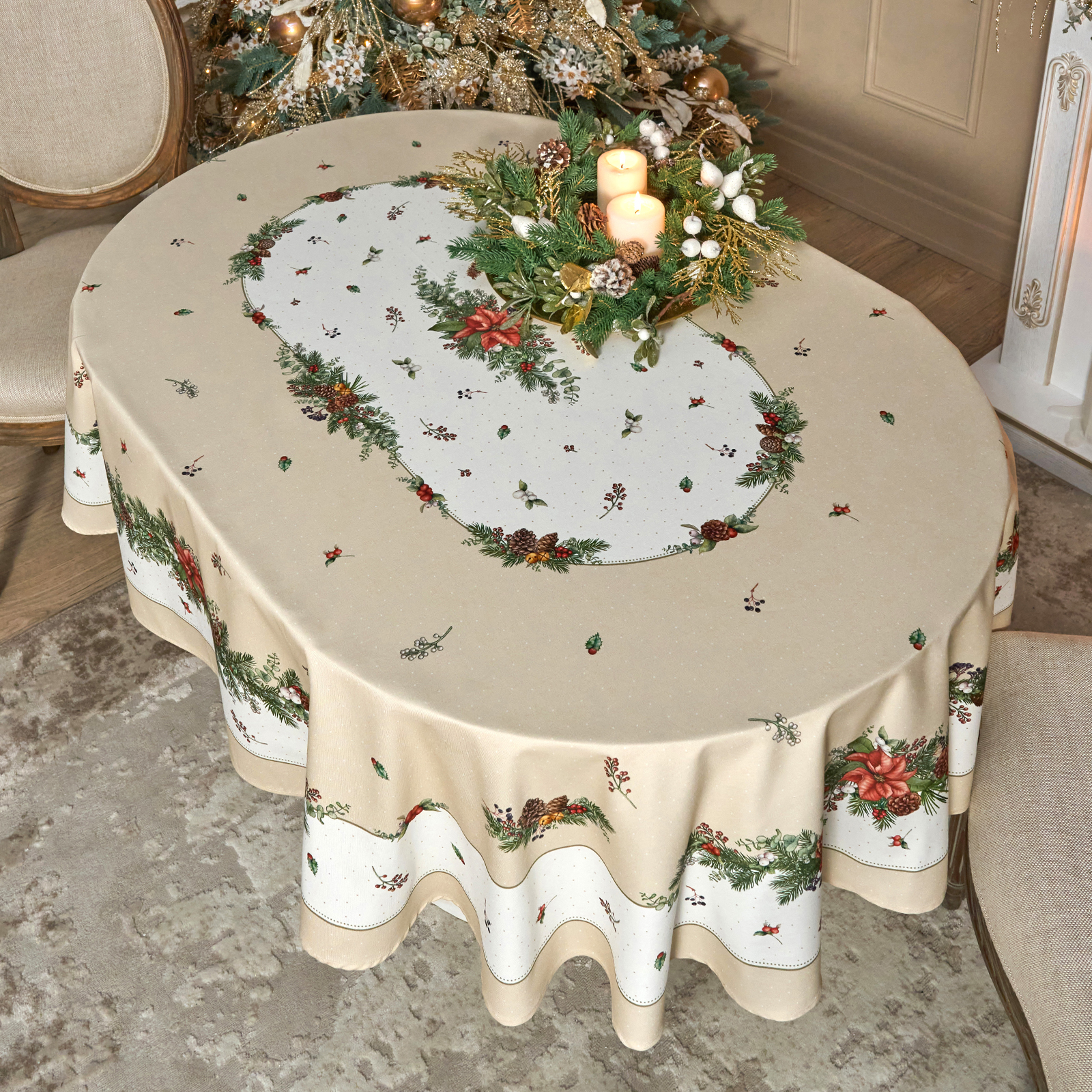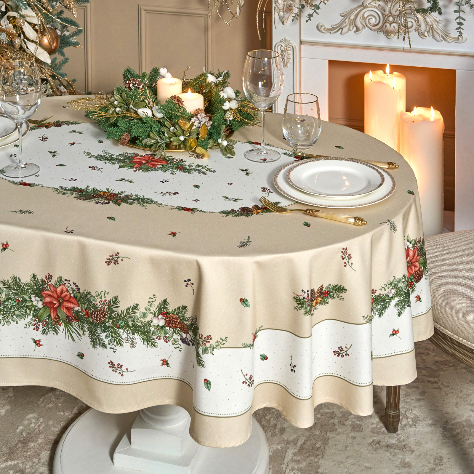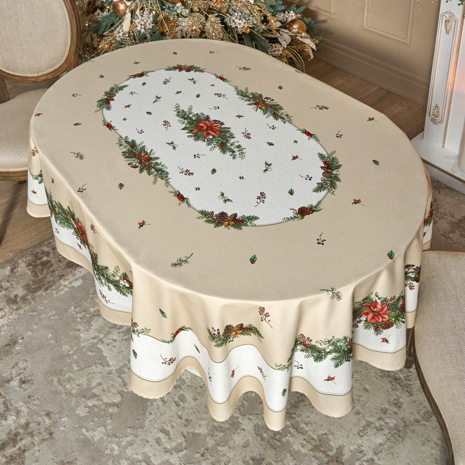 СКАТЕРТЬ ОВАЛЬНАЯ "CELEBRATION"140Х180СМ ,БЕЖЕВЫЙ, 100% ХЛОПОК,ТВИЛ, ПРОПИТКА