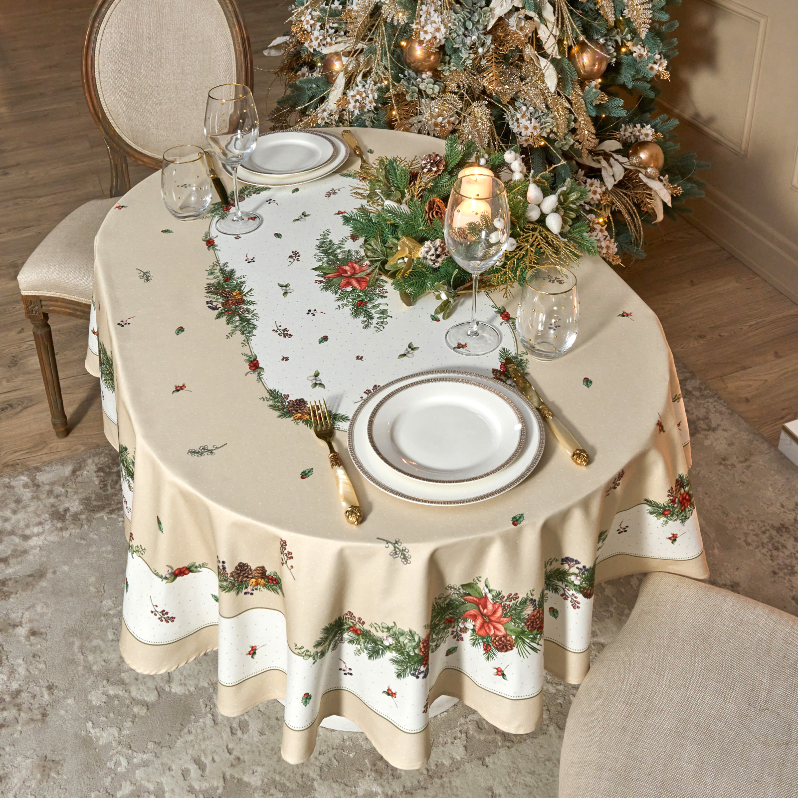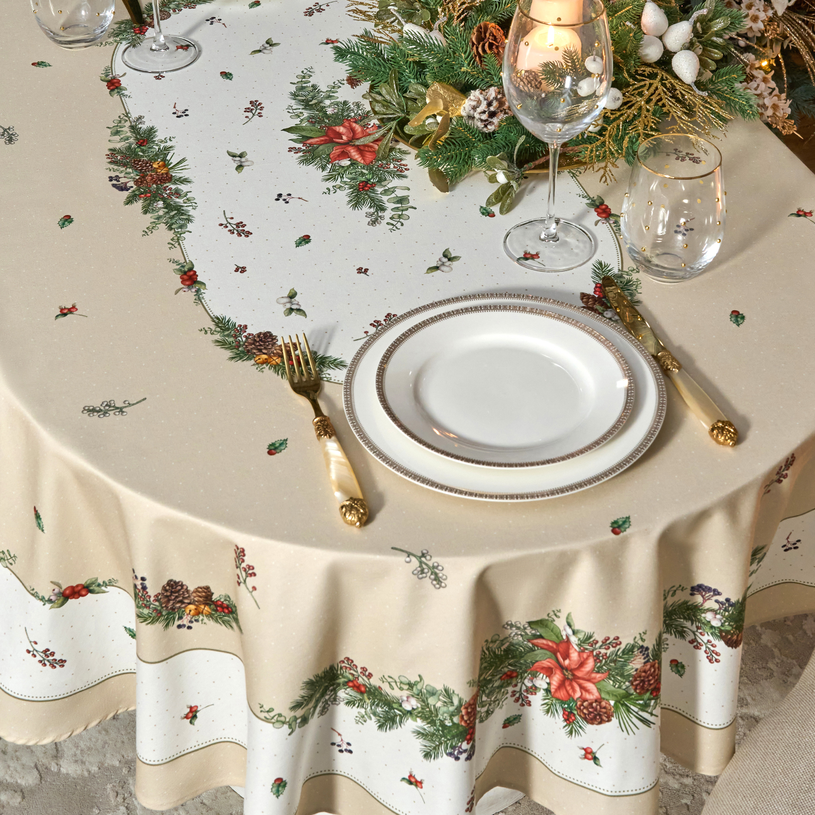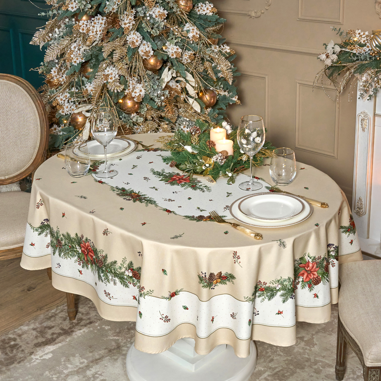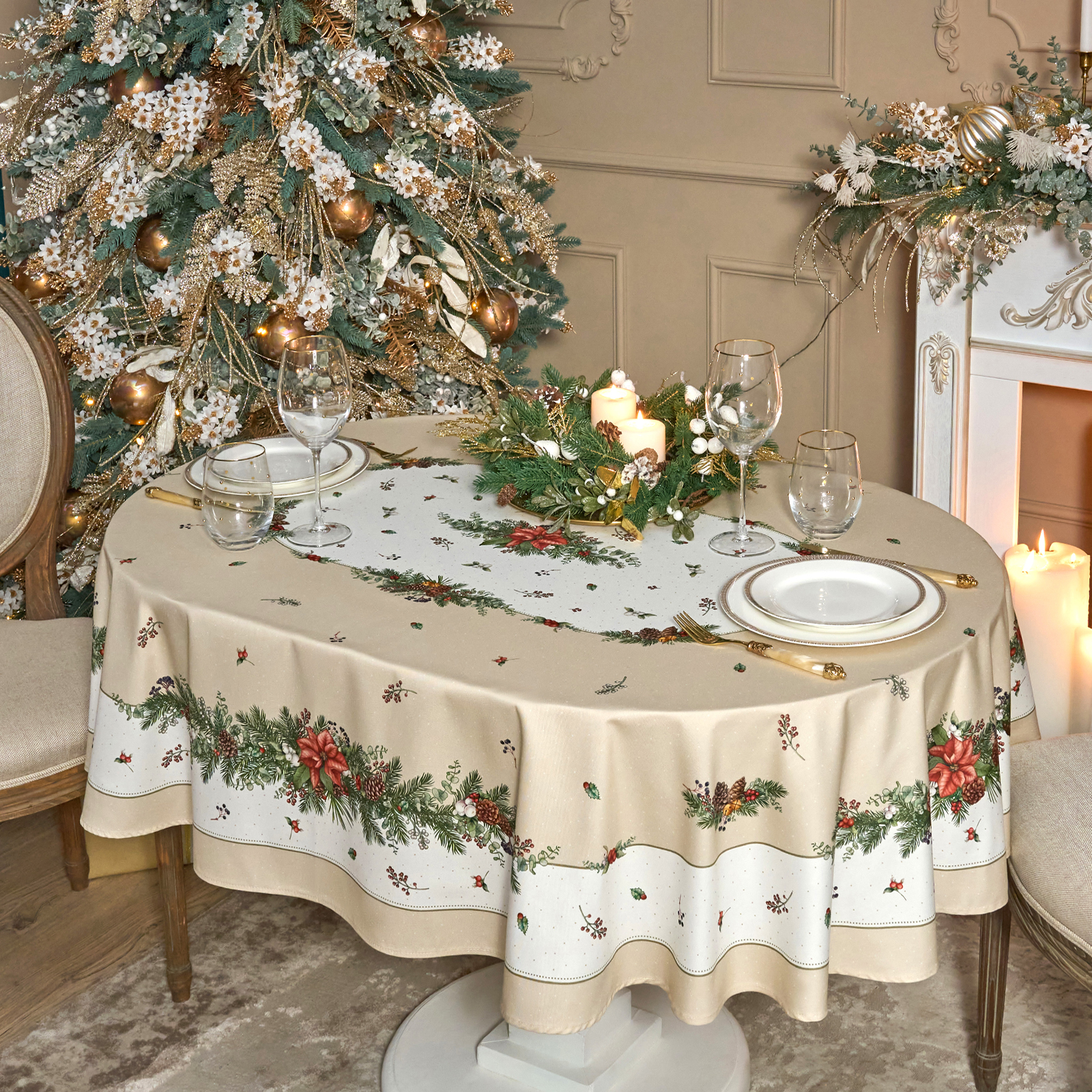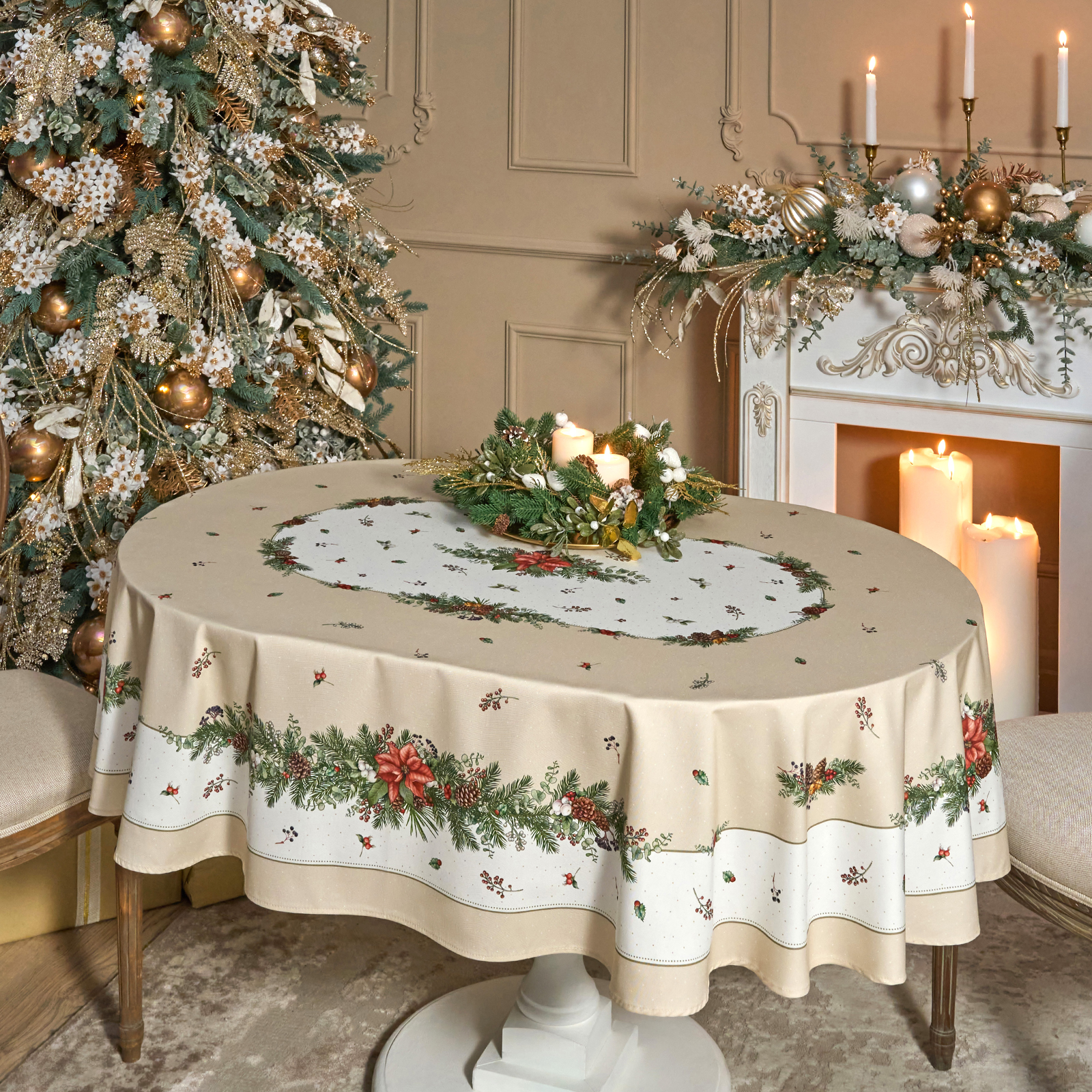 СКАТЕРТЬ ОВАЛЬНАЯ "CELEBRATION"140Х180СМ ,БЕЖЕВЫЙ, 100% ХЛОПОК,ТВИЛ, ПРОПИТКА