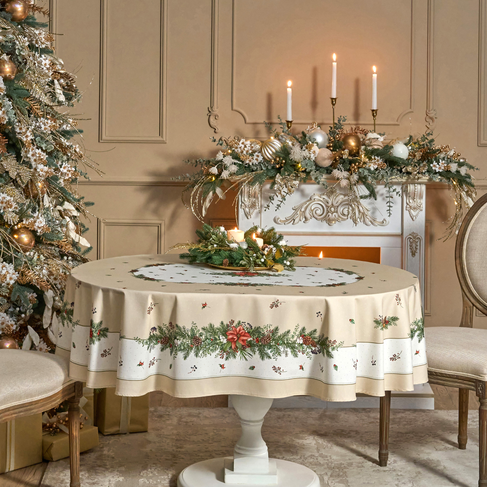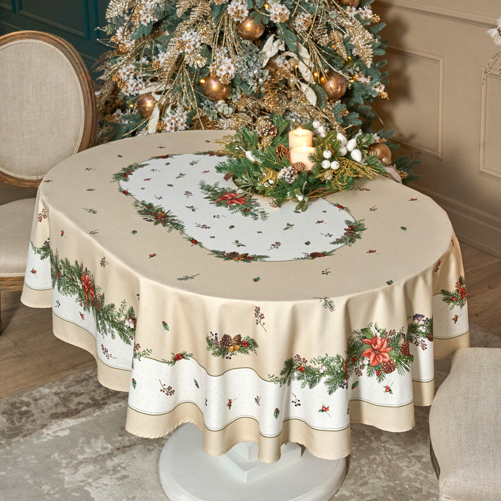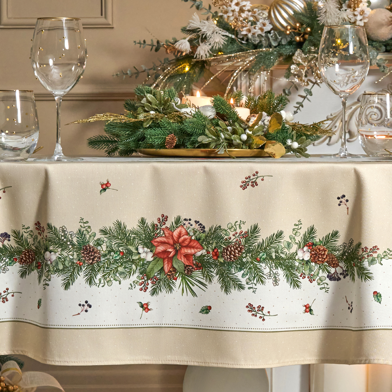 Скатерть выполнена из высококачественного 100% хлопка с саржевым переплетением Твил. Эта ткань не заламывается и не мнется. Скатерть из твила выглядит аккуратно и элегантно и имеет плотность 190 г\м2. Такая плотность ткани позволяет стирать скатерть, гладить и сушить более 100 раз без потери качества. Скатерть имеет дополнительную водоотталкивающую пропитку, которая защитит её от разлитой жидкости. Цифровая печать принта выполнена по всем сторонам скатерти и с любой стороны будет выглядеть красиво и четко, каждый штрих детально прорисован во всём многообразии оттенков. Коллекция Celebration имеет универсальный красивый зимний дизайн с шишками, веточками ели и пуансеттией. Он подойдет как для празднования Нового года, Рождества, так и для повседневного использования и декора, а специальная пропитка избавит вас от хлопот с отстированием пятен после застолья. Размер скатерти 140*180 см отлично подойдет для столов размером 100*120 см.