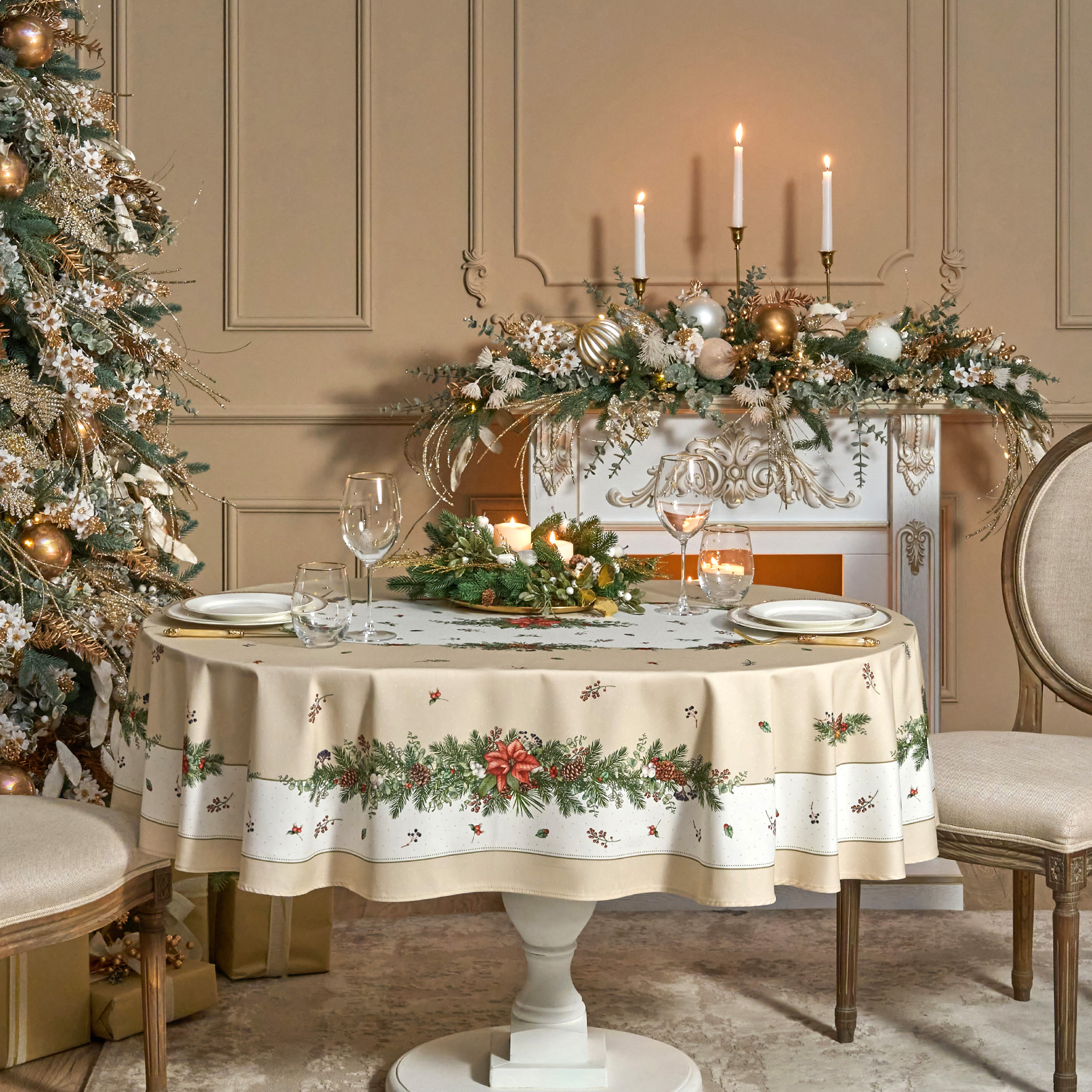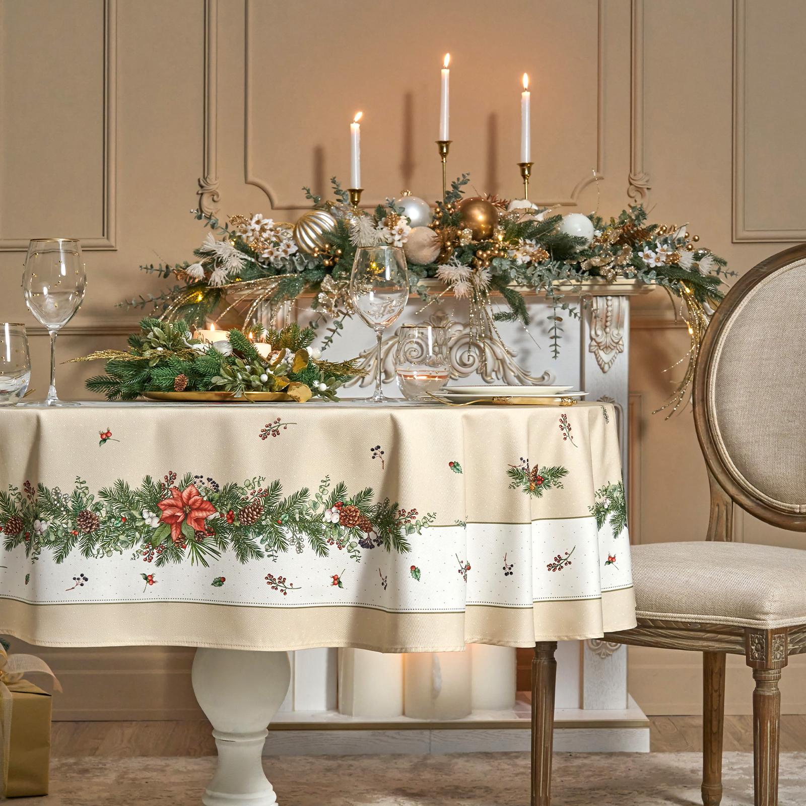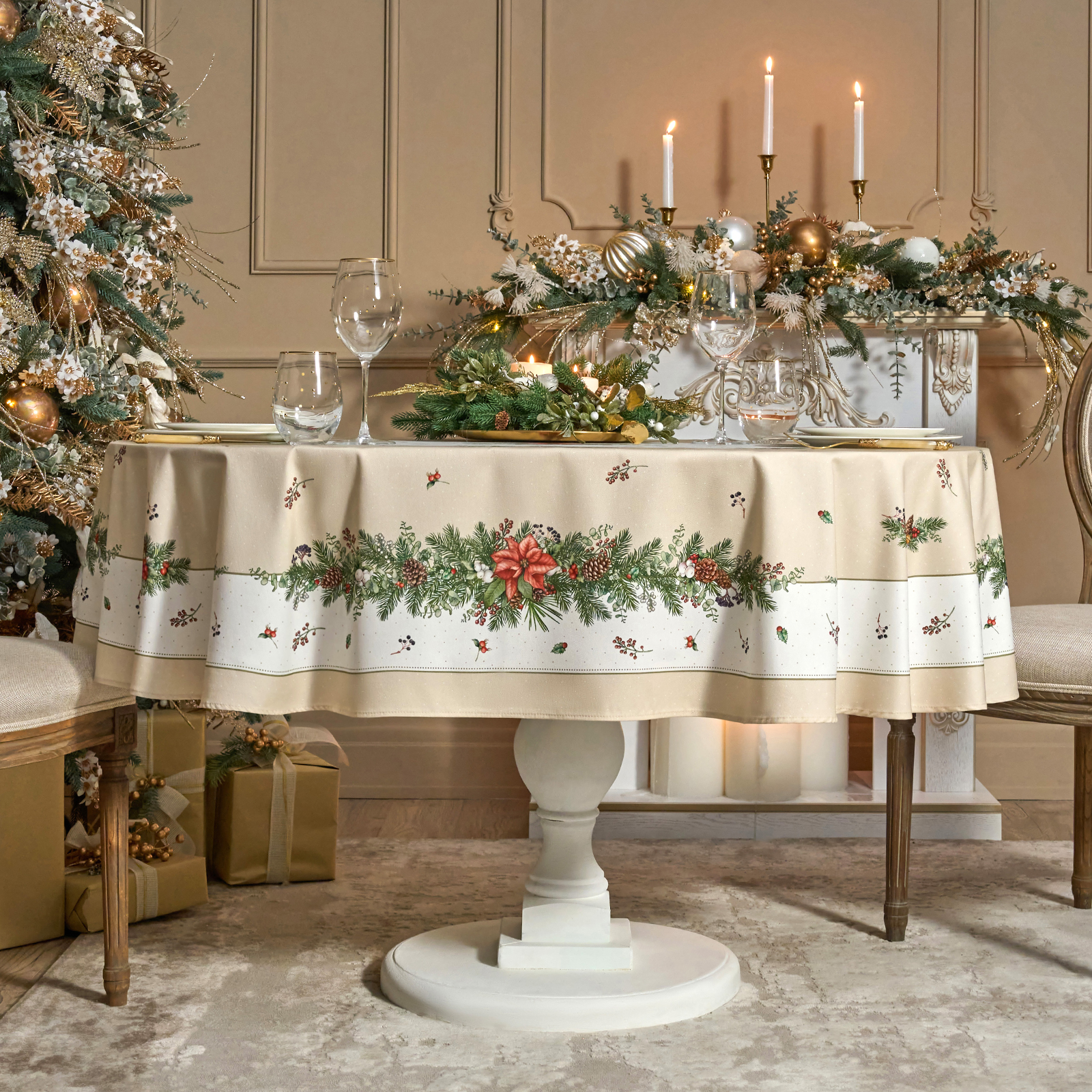 Скатерть выполнена из высококачественного 100% хлопка с саржевым переплетением Твил. Эта ткань не заламывается и не мнется. Скатерть из твила выглядит аккуратно и элегантно и имеет плотность 190 г\м2. Такая плотность ткани позволяет стирать скатерть, гладить и сушить более 100 раз без потери качества. Скатерть имеет дополнительную водоотталкивающую пропитку, которая защитит её от разлитой жидкости. Цифровая печать принта выполнена по всем сторонам скатерти и с любой стороны будет выглядеть красиво и четко, каждый штрих детально прорисован во всём многообразии оттенков. Коллекция Celebration имеет универсальный красивый зимний дизайн с шишками, веточками ели и пуансеттией. Он подойдет как для празднования Нового года, Рождества, так и для повседневного использования и декора, а специальная пропитка избавит вас от хлопот с отстированием пятен после застолья. Размер скатерти 140*180 см отлично подойдет для столов размером 100*120 см.
