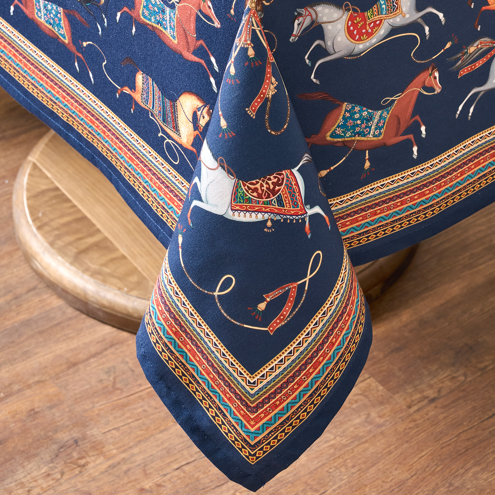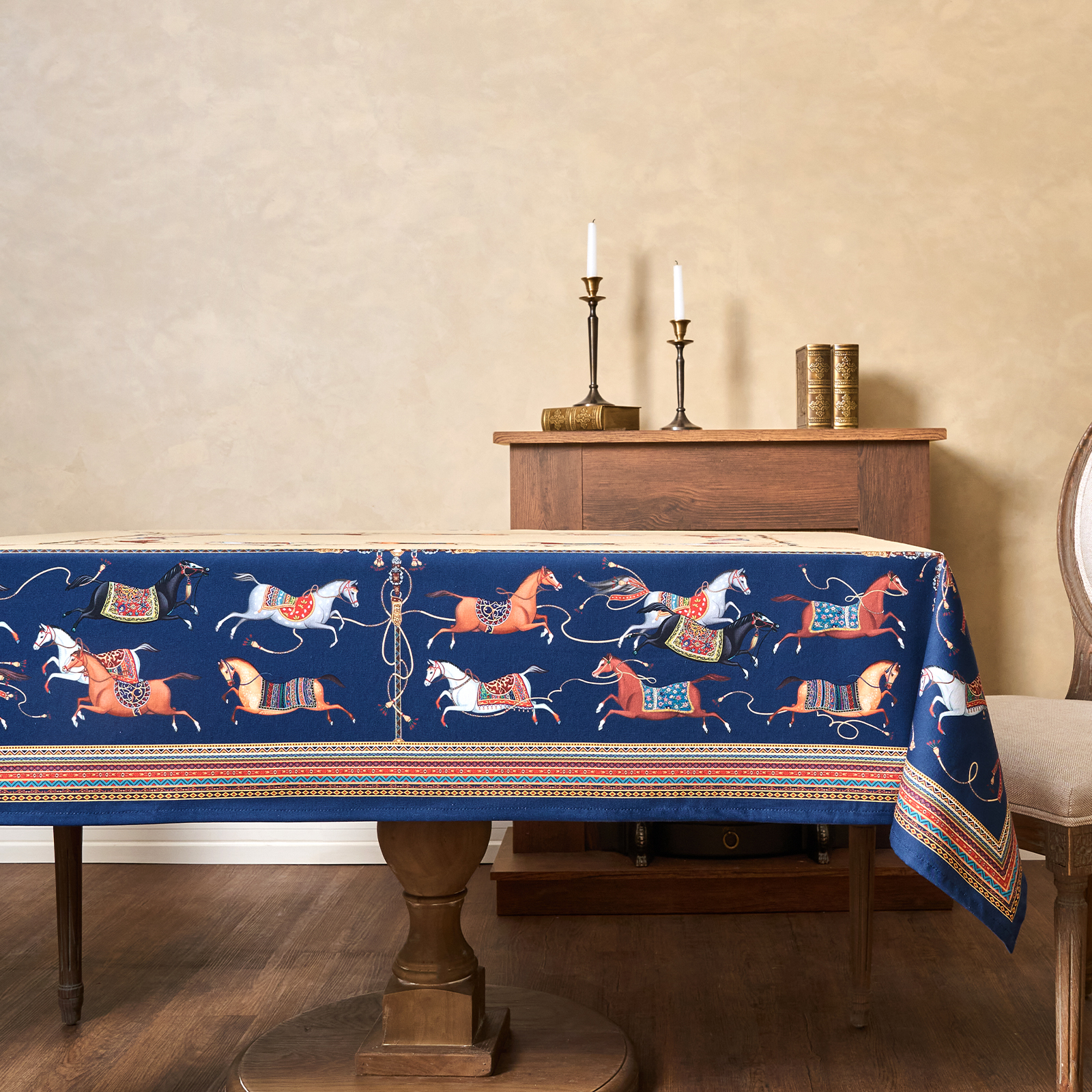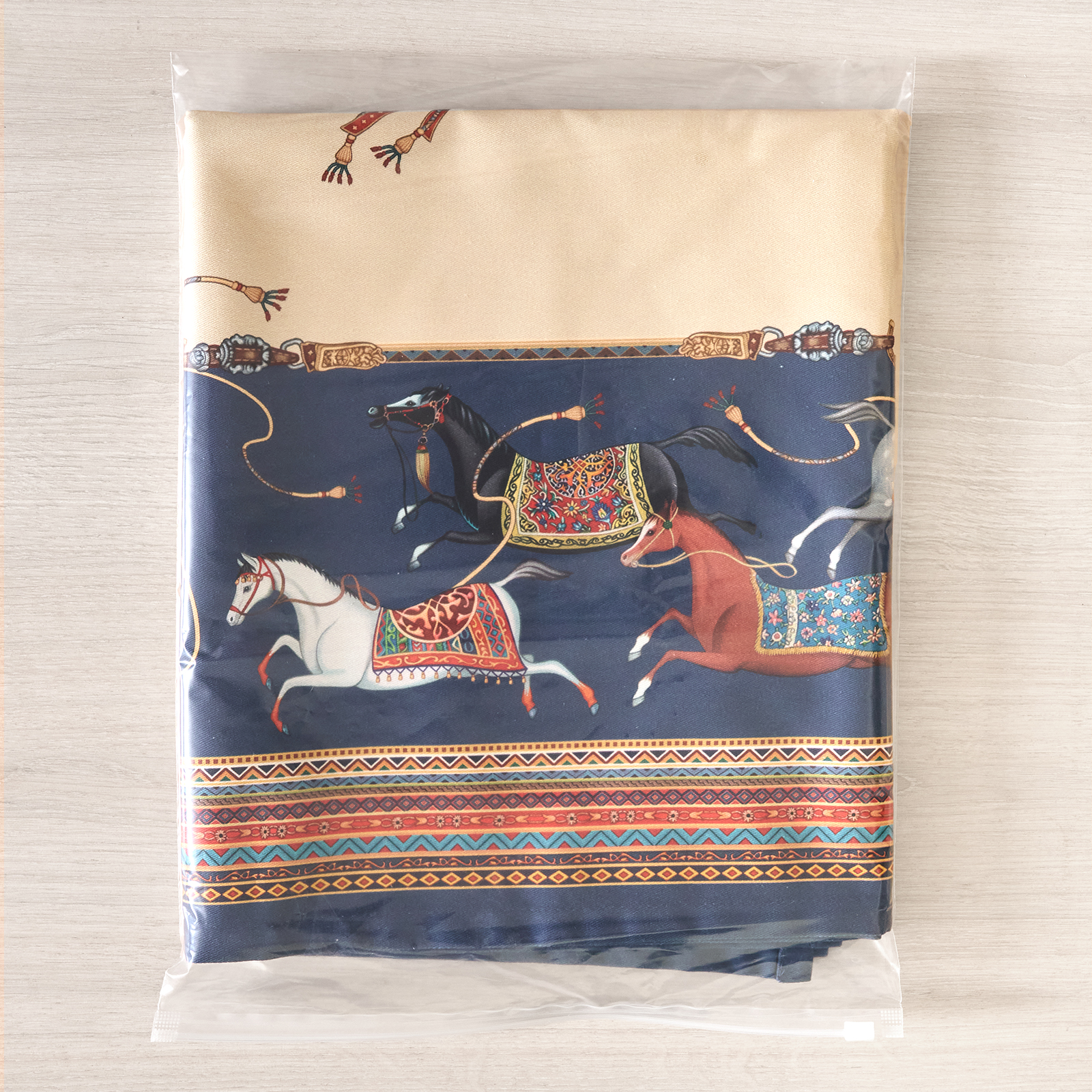 Благородный тёмно-синий фон украшен орнаментом с грациозными лошадьми, создавая атмосферу восточной роскоши. Лошадь — символ 2026 года, поэтому скатерть будет актуальна как для ежедневного использования в интерьере в стиле бохо, так и для праздничной сервировки. Авторский принт разработан художниками эксклюзивно для Lefard и нанесён методом цифровой печати, что гарантирует яркость и стойкость красок даже после множества стирок.