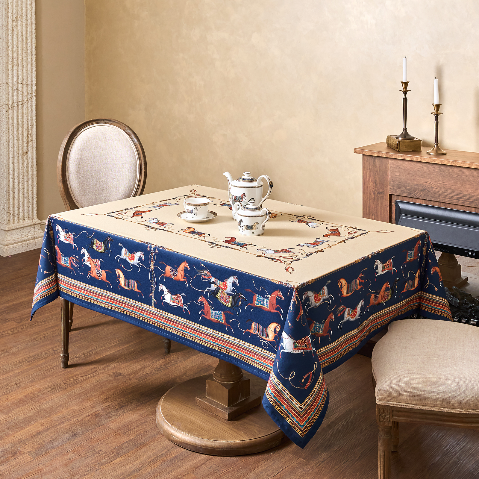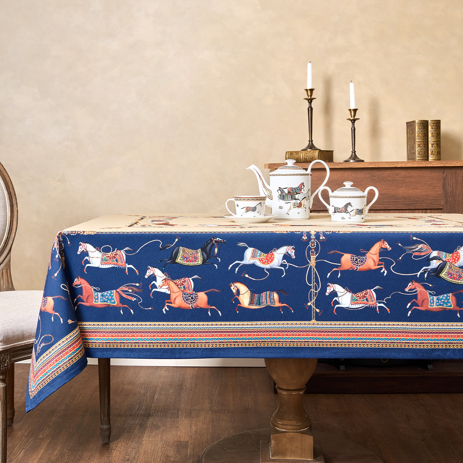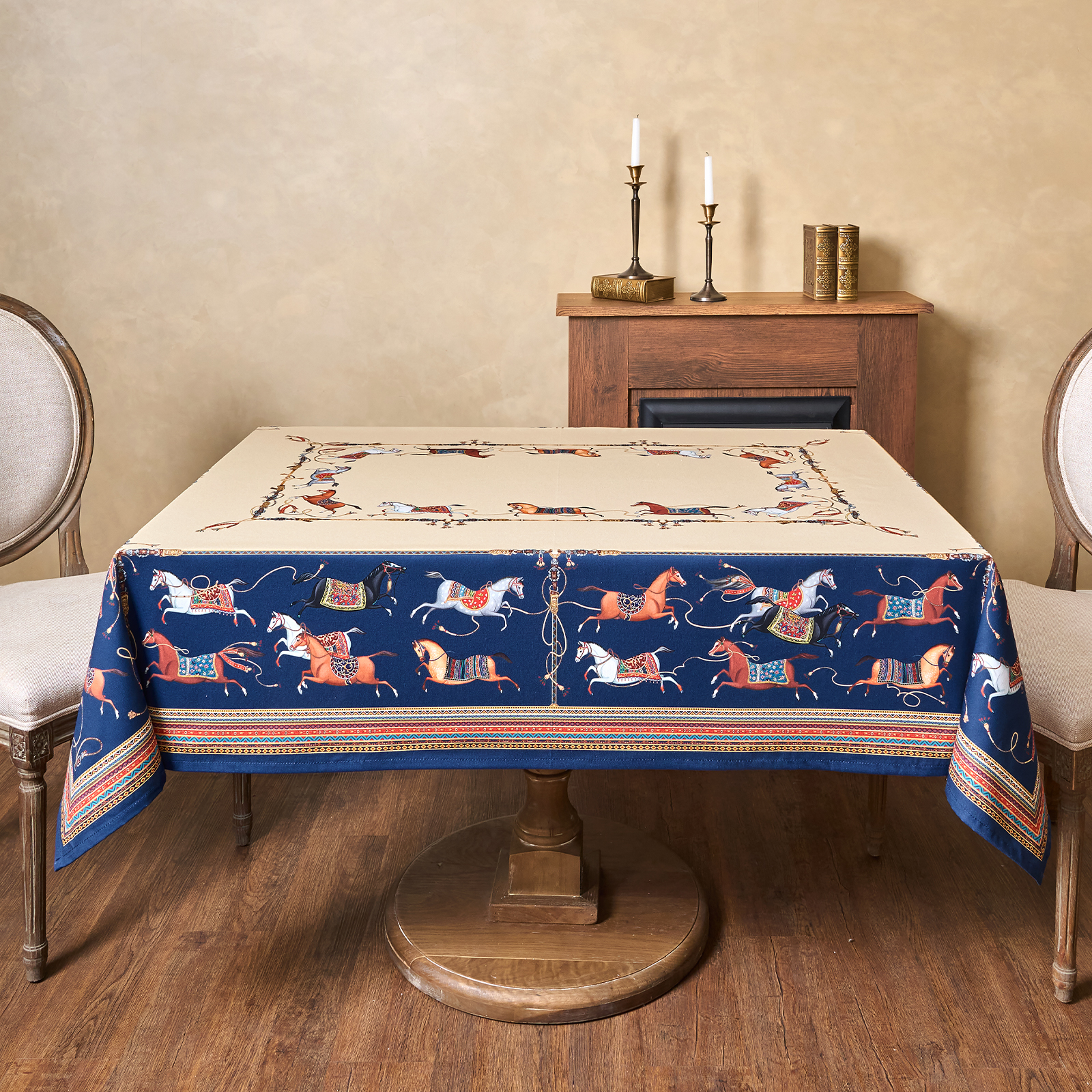 Благородный тёмно-синий фон украшен орнаментом с грациозными лошадьми, создавая атмосферу восточной роскоши. Лошадь — символ 2026 года, поэтому скатерть будет актуальна как для ежедневного использования в интерьере в стиле бохо, так и для праздничной сервировки. Авторский принт разработан художниками эксклюзивно для Lefard и нанесён методом цифровой печати, что гарантирует яркость и стойкость красок даже после множества стирок.