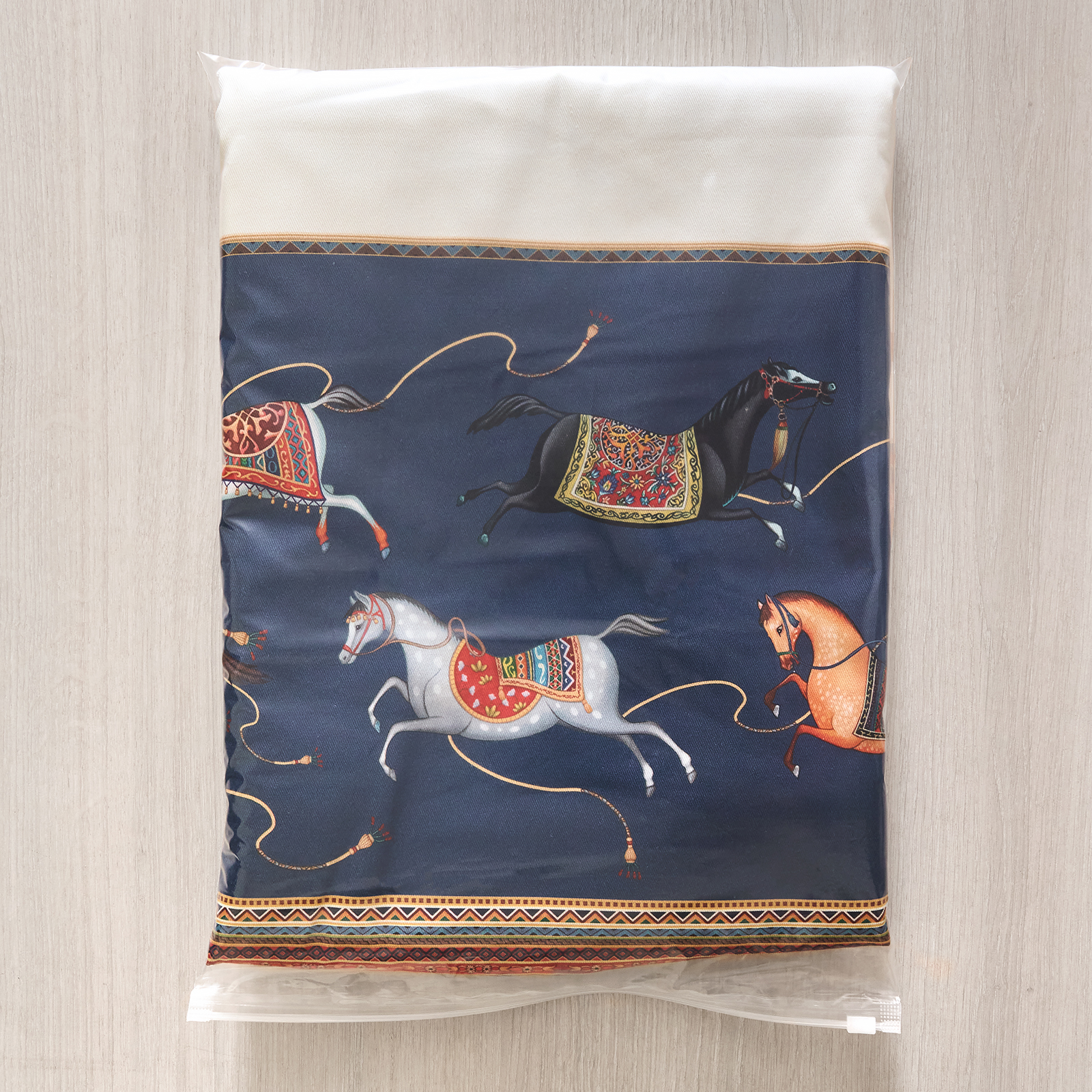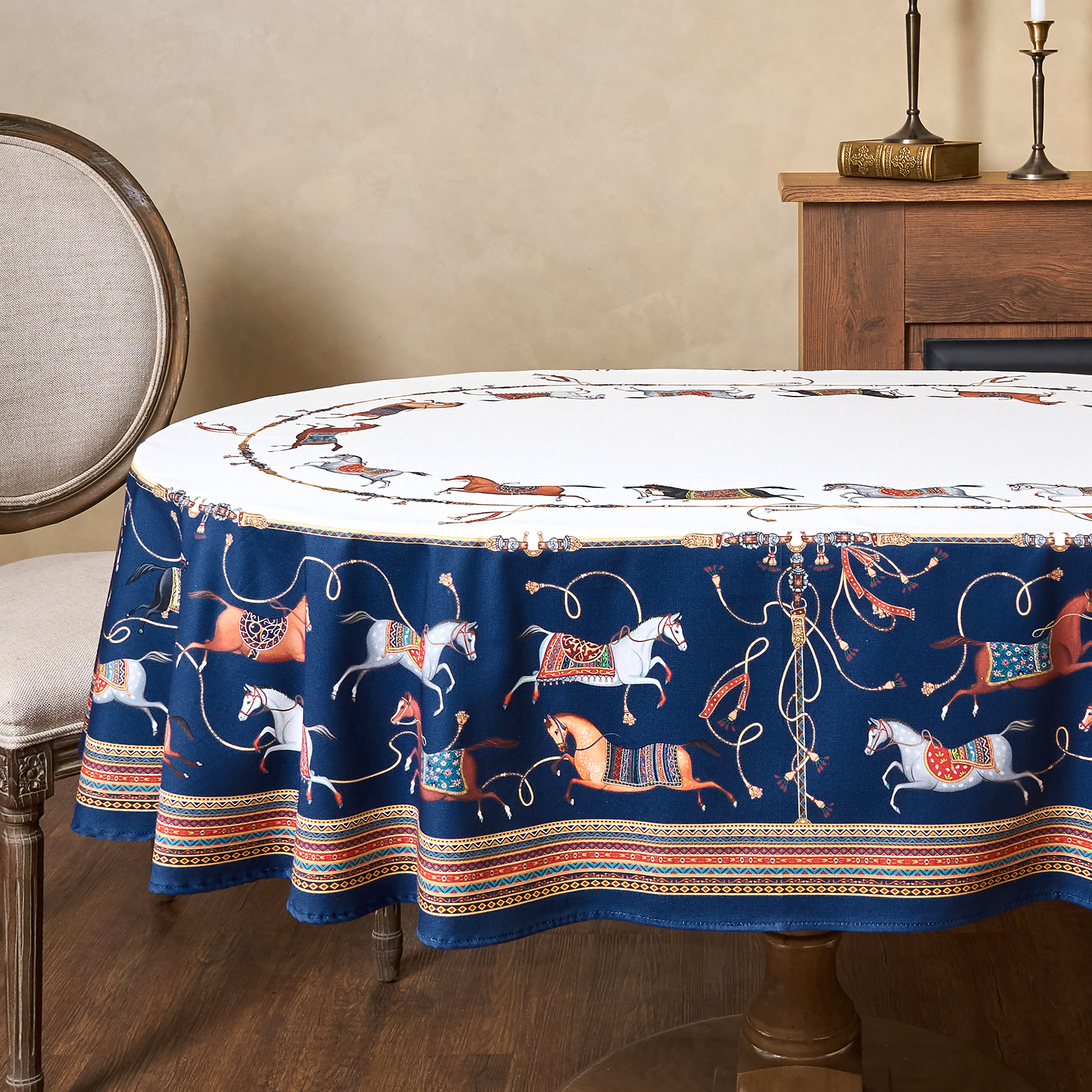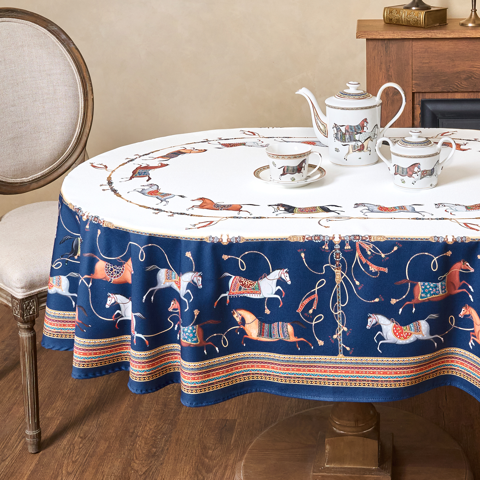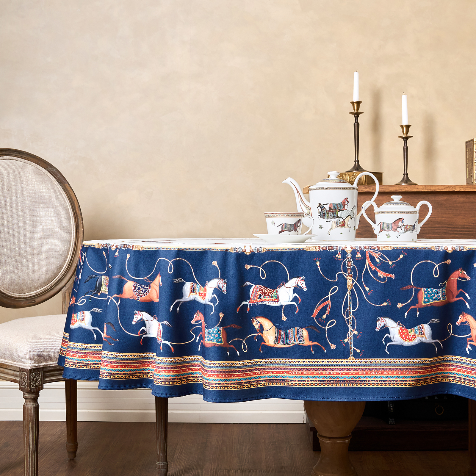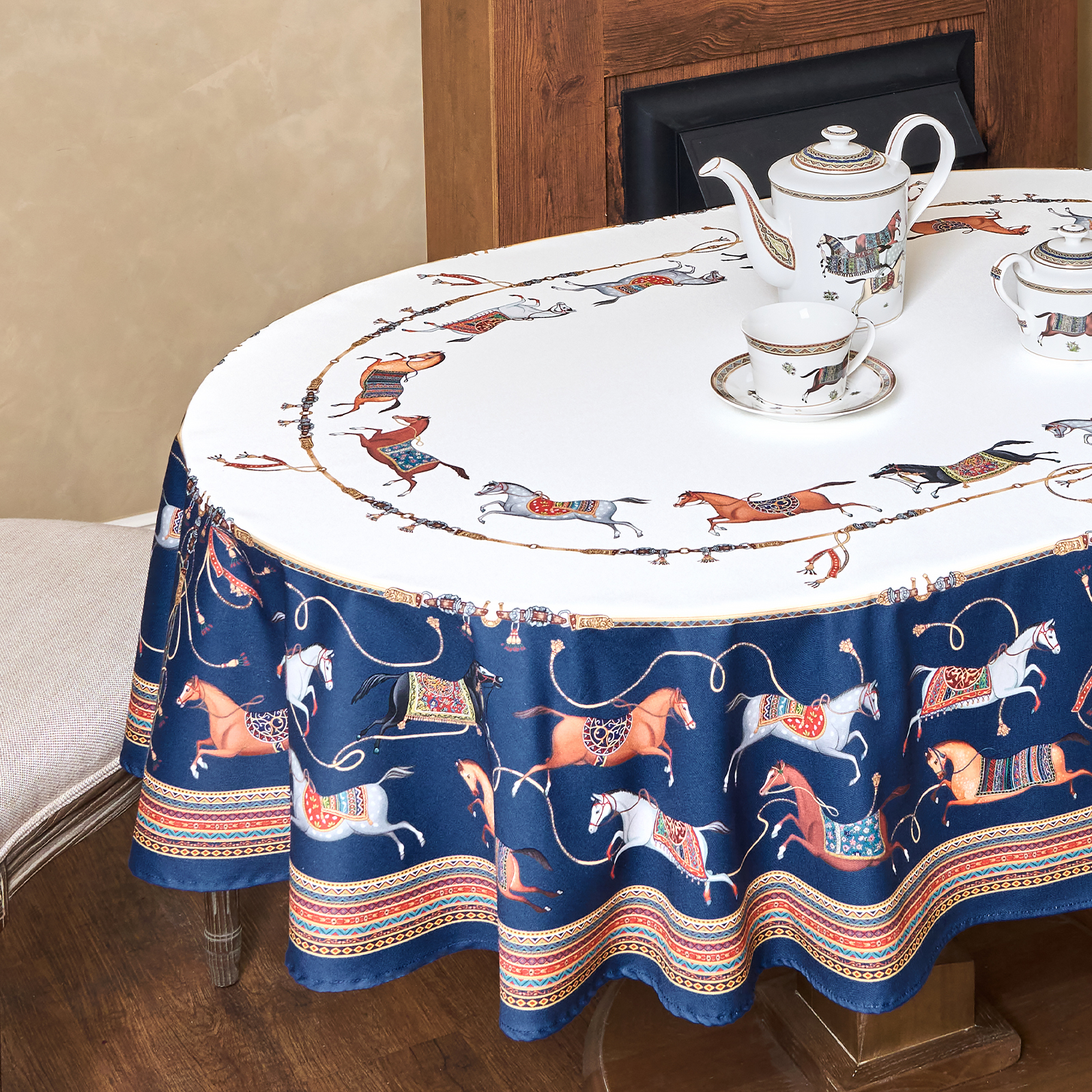 Благородный тёмно-синий фон украшен орнаментом с грациозными лошадьми, создавая атмосферу восточной роскоши. Лошадь — символ 2026 года, поэтому скатерть будет актуальна как для ежедневного использования в интерьере в стиле бохо, так и для праздничной сервировки. Авторский принт разработан художниками эксклюзивно для Lefard и нанесён методом цифровой печати, что гарантирует яркость и стойкость красок даже после множества стирок.