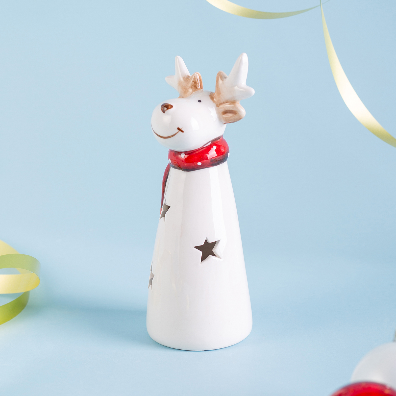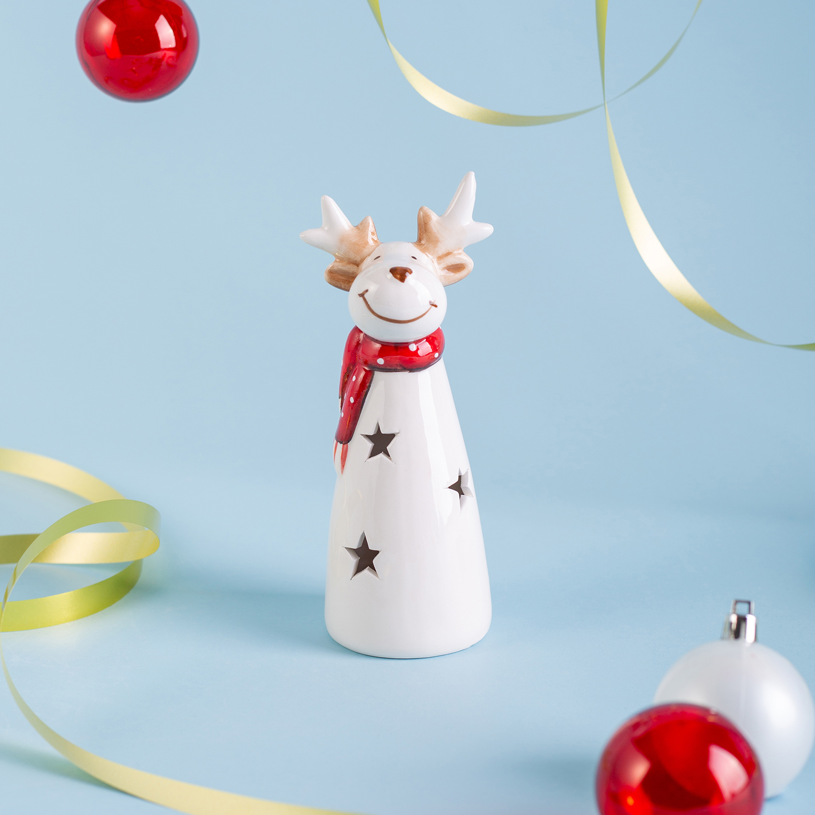 Пусть ваш дом наполнится теплом и волшебством — благодаря этим очаровательным оленям из белоснежного фарфора! Каждая статуэтка — это маленькое произведение искусства: доброе лицо, красный шарф и звёзды, сквозь которые мерцает нежный LED-свет. Безопасный, экономичный и невероятно атмосферный — этот свет создаёт ощущение, будто олень сам излучает тепло и радость.