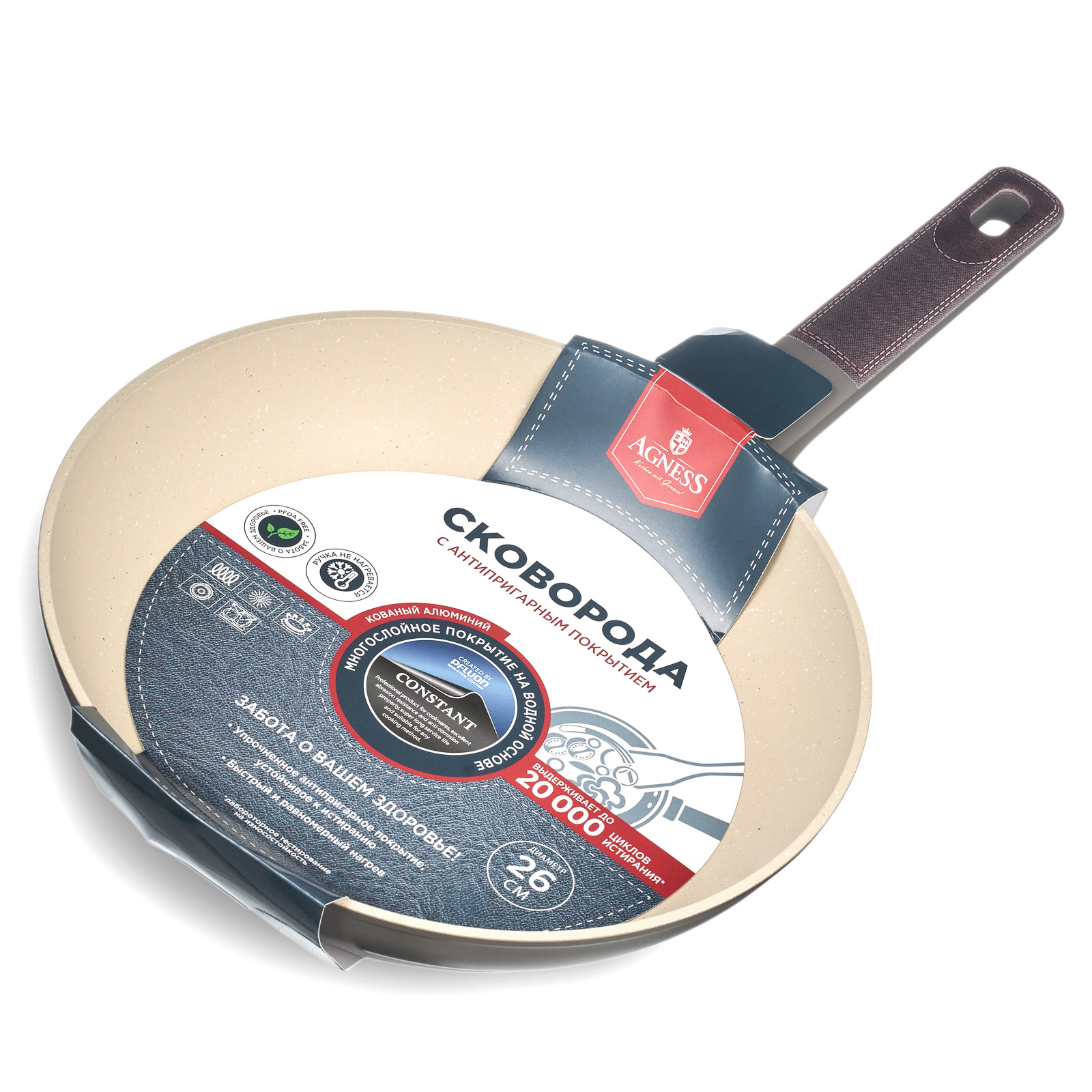 СКОВОРОДА AGNESS С АНТИПРИГАРНЫМ ПОКРЫТИЕМ "CONSTANT" - это идеальный выбор для тех, кто ценит удобство и функциональность в посуде. Одним из главных достоинств этой сковороды является УСИЛЕННОЕ АНТИПРИГАРНОЕ ПОКРЫТИЕ "CONSTANT", которое позволяет готовить без использования большого количества масла и выдерживает до 20 000 циклов истирания. Благодаря этому, продукты готовятся быстрее и сохраняют свои полезные свойства. Равномерное нагревание сокращает время приготовления и сохраняет вкус и аромат продуктов. Многослойная структура покрытия обеспечивает превосходные эксплуатационные качества и увеличивает срок службы, не содержит PFOA. Эргономичная ручка из бакелита со стильными вставками не нагревается и не плавится, обеспечивает безопасное использование сковородки в процессе приготовления пищи. Посуда AGNESS - это современный дизайн и новейшие технологии производства.