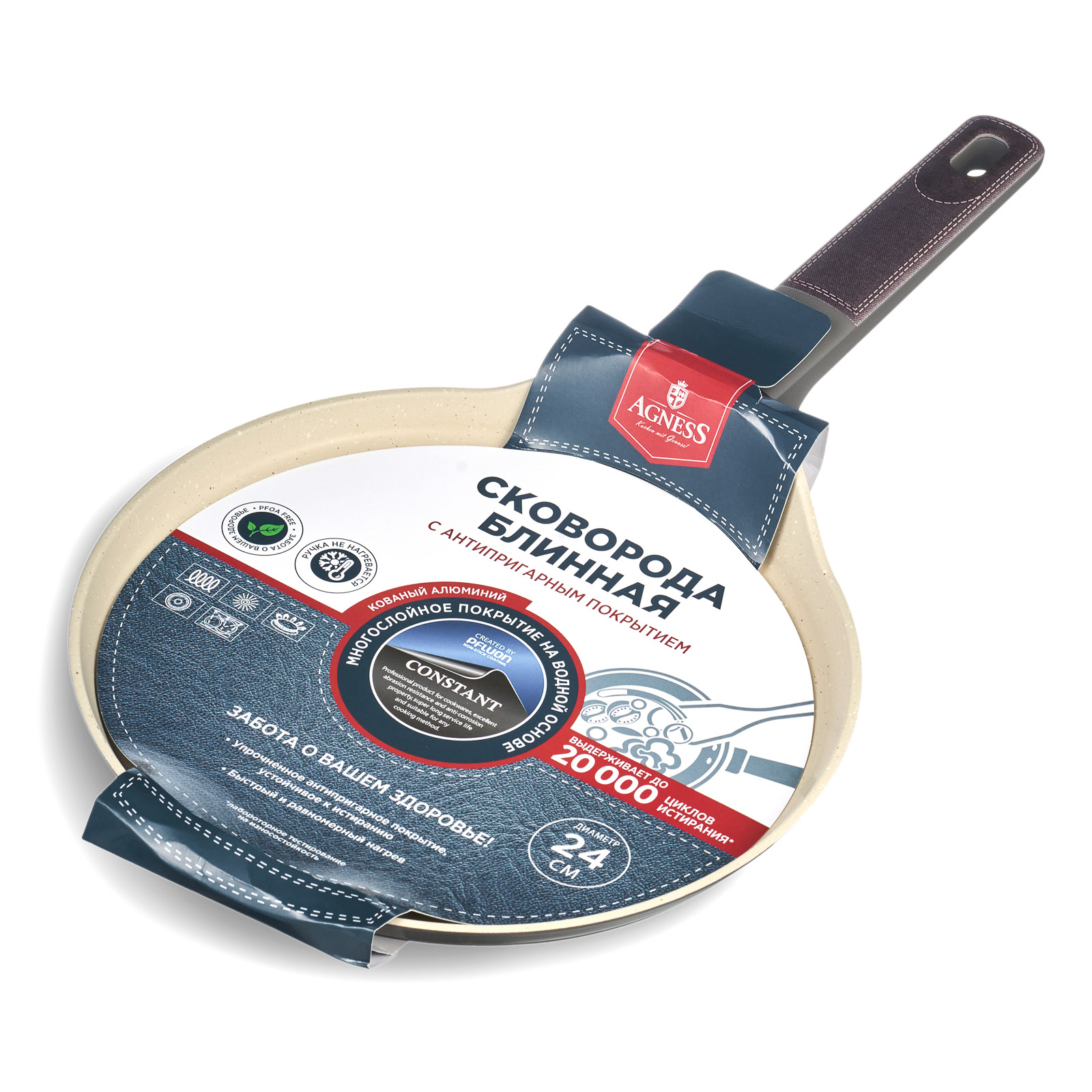 СКОВОРОДА БЛИННАЯ AGNESS С АНТИПРИГАРНЫМ ПОКРЫТИЕМ "CONSTANT" - это идеальный выбор для тех, кто ценит удобство и функциональность в посуде. Одним из главных достоинств этой сковороды является УСИЛЕННОЕ АНТИПРИГАРНОЕ ПОКРЫТИЕ "CONSTANT", которое позволяет готовить без использования большого количества масла и выдерживает до 20 000 циклов истирания. Равномерное нагревание сокращает время приготовления и сохраняет вкус и аромат продуктов. Многослойная структура покрытия обеспечивает превосходные эксплуатационные качества и увеличивает срок службы, не содержит PFOA. Эргономичная ручка из бакелита со стильными вставками не нагревается и не плавится, обеспечивает безопасное использование сковородки в процессе приготовления пищи. Посуда AGNESS - это современный дизайн и новейшие технологии производства.