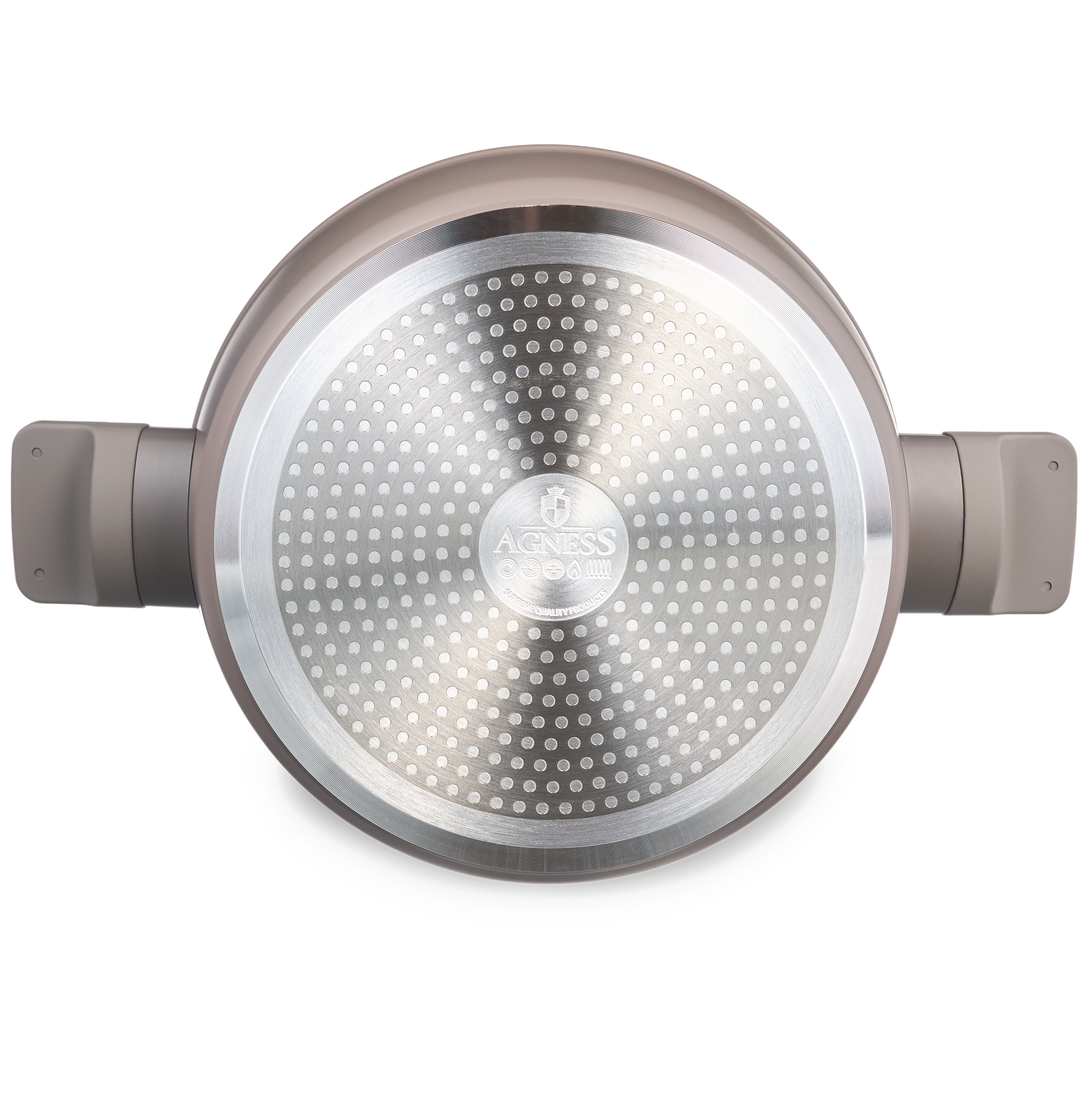 СОТЕЙНИК СО СТЕКЛЯННОЙ КРЫШКОЙ AGNESS С АНТИПРИГАРНЫМ ПОКРЫТИЕМ "CONSTANT" - это идеальный выбор для тех, кто ценит удобство и функциональность в посуде. Одним из главных достоинств этого сотейника является УСИЛЕННОЕ АНТИПРИГАРНОЕ ПОКРЫТИЕ "CONSTANT", которое позволяет готовить без использования большого количества масла и выдерживает до 20 000 циклов истирания. Благодаря этому, продукты готовятся быстрее и сохраняют свои полезные свойства. Равномерное нагревание сокращает время приготовления и сохраняет вкус и аромат продуктов. Многослойная структура покрытия обеспечивает превосходные эксплуатационные качества и увеличивает срок службы, не содержит PFOA. Эргономичные ручки из бакелита со стильными вставками не нагреваются и не плавятся, обеспечивают безопасное использование сотейника в процессе приготовления пищи. Посуда AGNESS - это современный дизайн и новейшие технологии производства.
