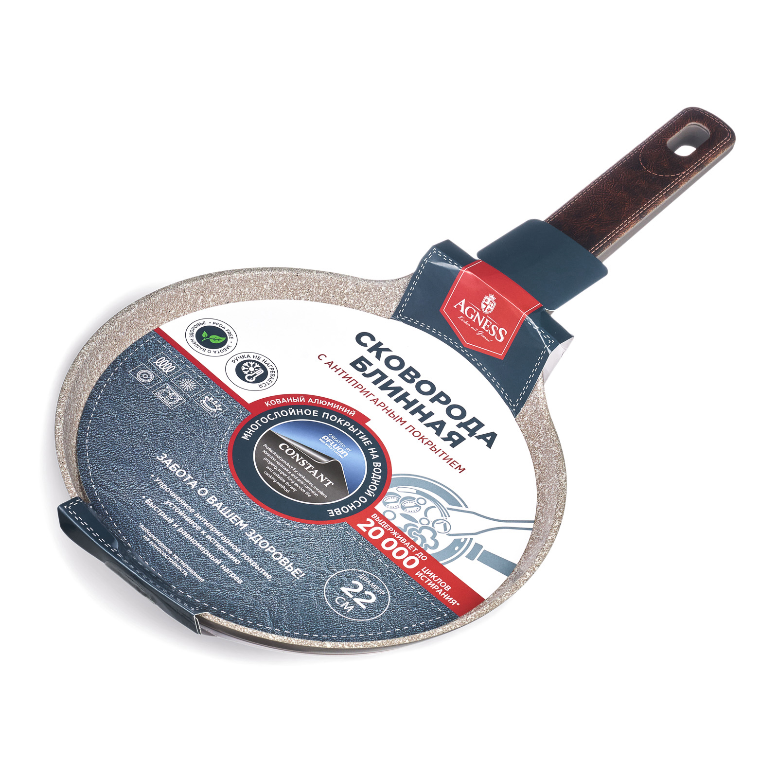СКОВОРОДА БЛИННАЯ AGNESS С АНТИПРИГАРНЫМ ПОКРЫТИЕМ "CONSTANT" - это идеальный выбор для тех, кто ценит удобство и функциональность в посуде. Одним из главных достоинств этой сковороды является УСИЛЕННОЕ АНТИПРИГАРНОЕ ПОКРЫТИЕ "CONSTANT", которое позволяет готовить без использования большого количества масла и выдерживает до 20 000 циклов истирания. Равномерное нагревание сокращает время приготовления и сохраняет вкус и аромат продуктов. Многослойная структура покрытия обеспечивает превосходные эксплуатационные качества и увеличивает срок службы, не содержит PFOA. Эргономичная ручка из бакелита со стильными вставками не нагревается и не плавится, обеспечивает безопасное использование сковородки в процессе приготовления пищи. Посуда AGNESS - это современный дизайн и новейшие технологии производства.