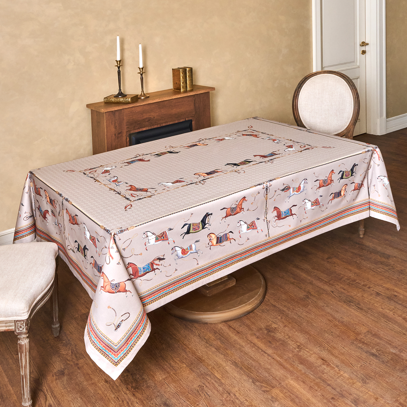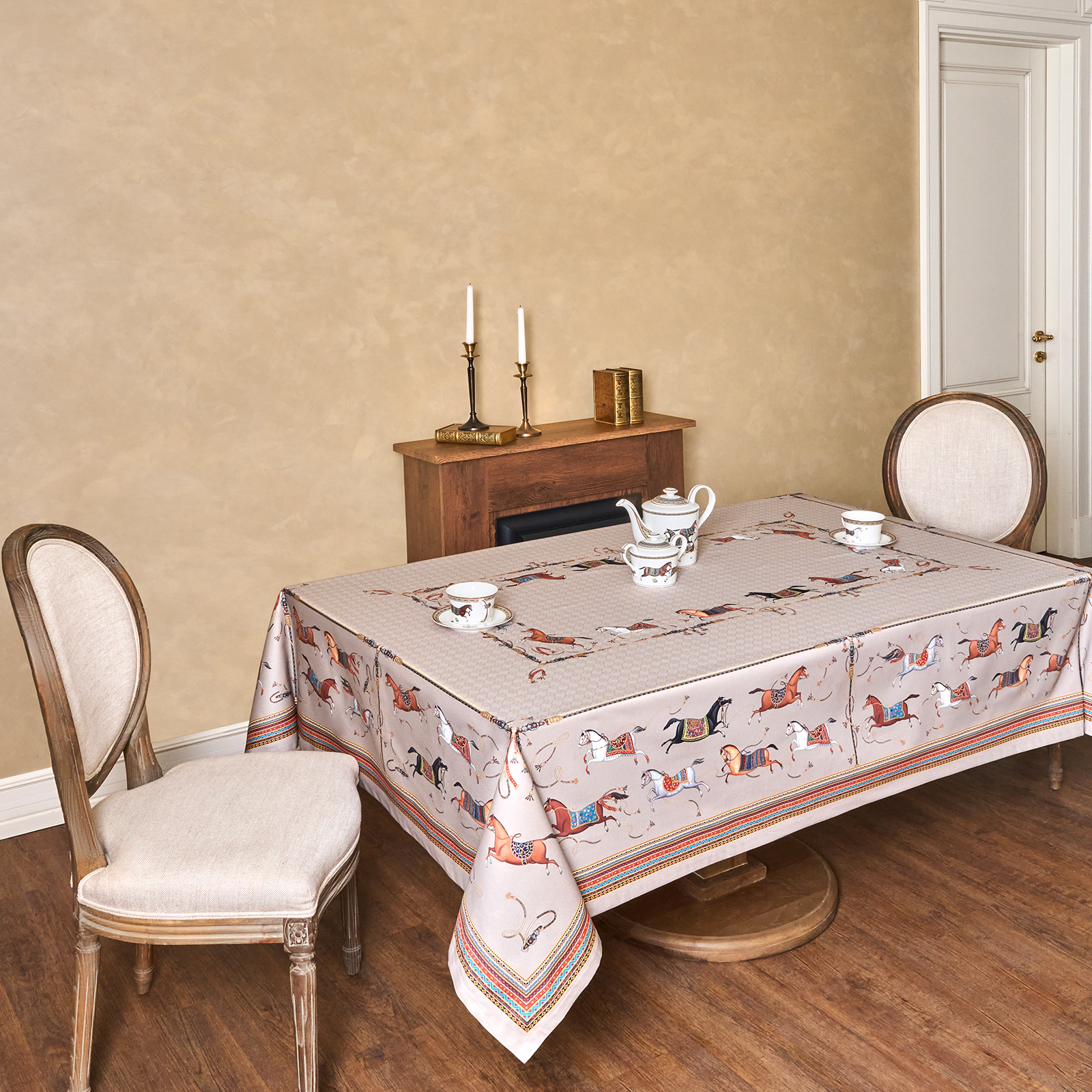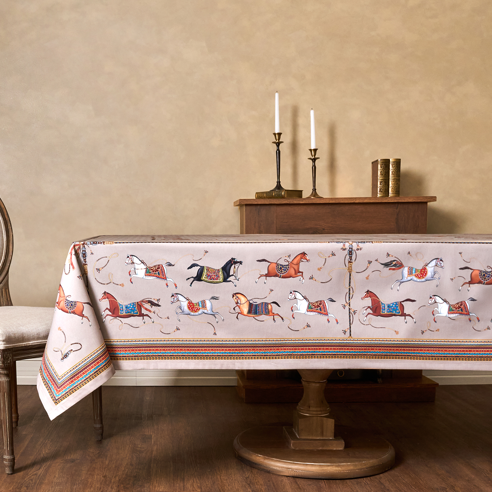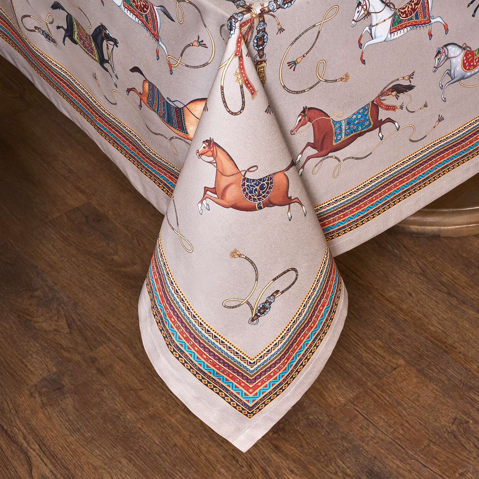 Элегантный бежевый фон украшен орнаментом с грациозными лошадьми, создавая атмосферу восточной роскоши. Лошадь — символ 2026 года, поэтому скатерть будет актуальна как для ежедневного использования в интерьере в стиле бохо, так и для праздничной сервировки. Авторский принт разработан художниками эксклюзивно для Lefard и нанесён методом цифровой печати, что гарантирует яркость и стойкость красок даже после множества стирок.