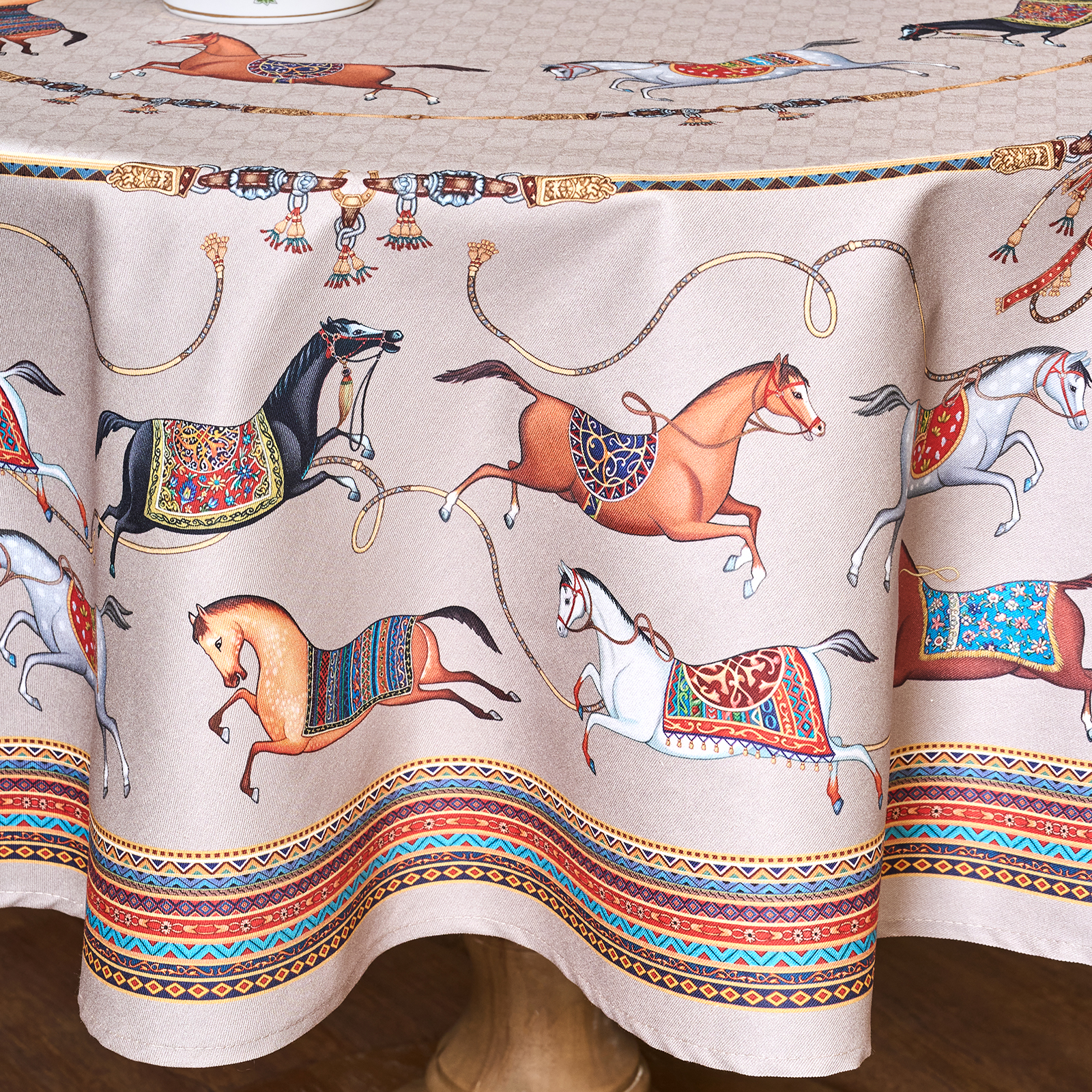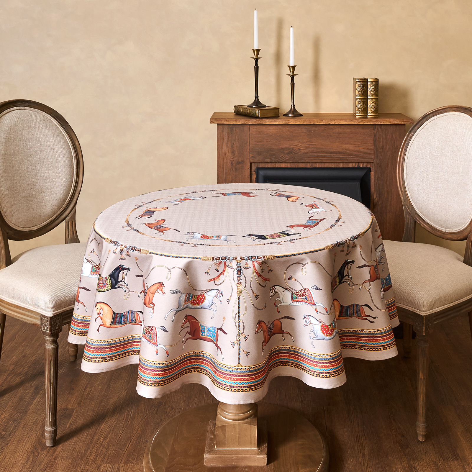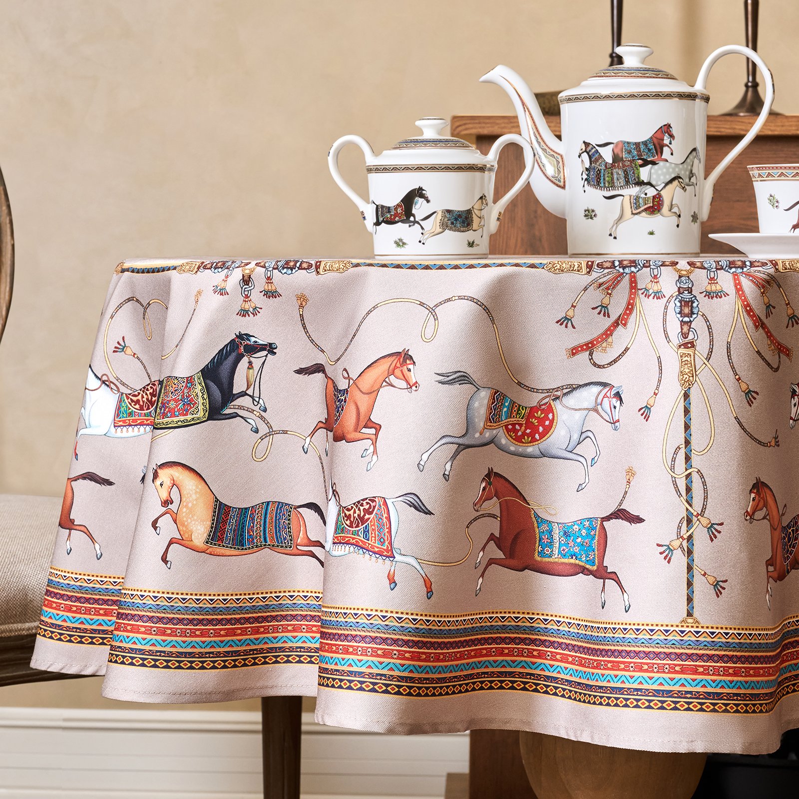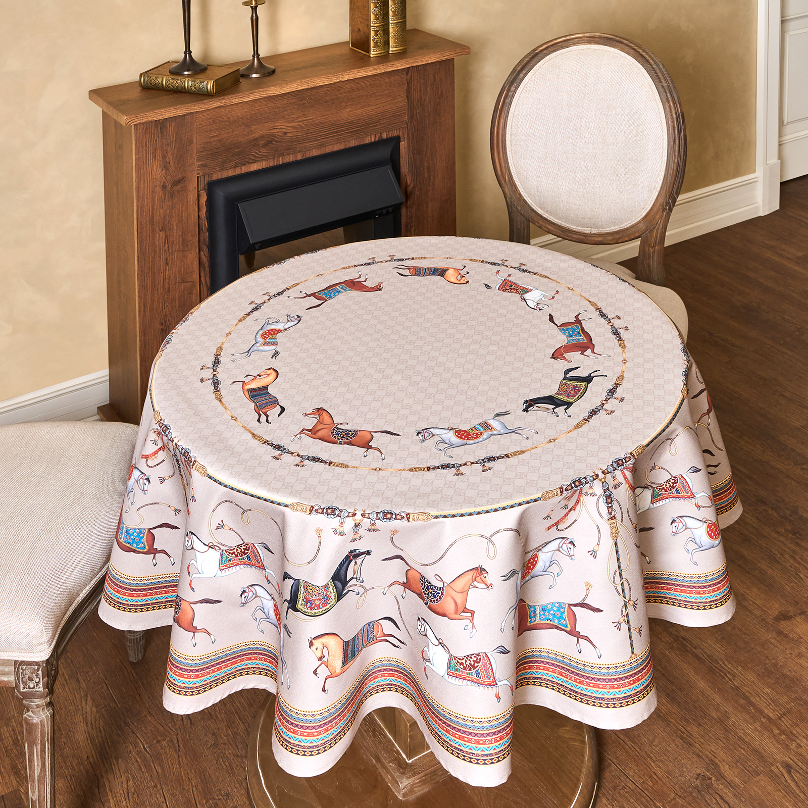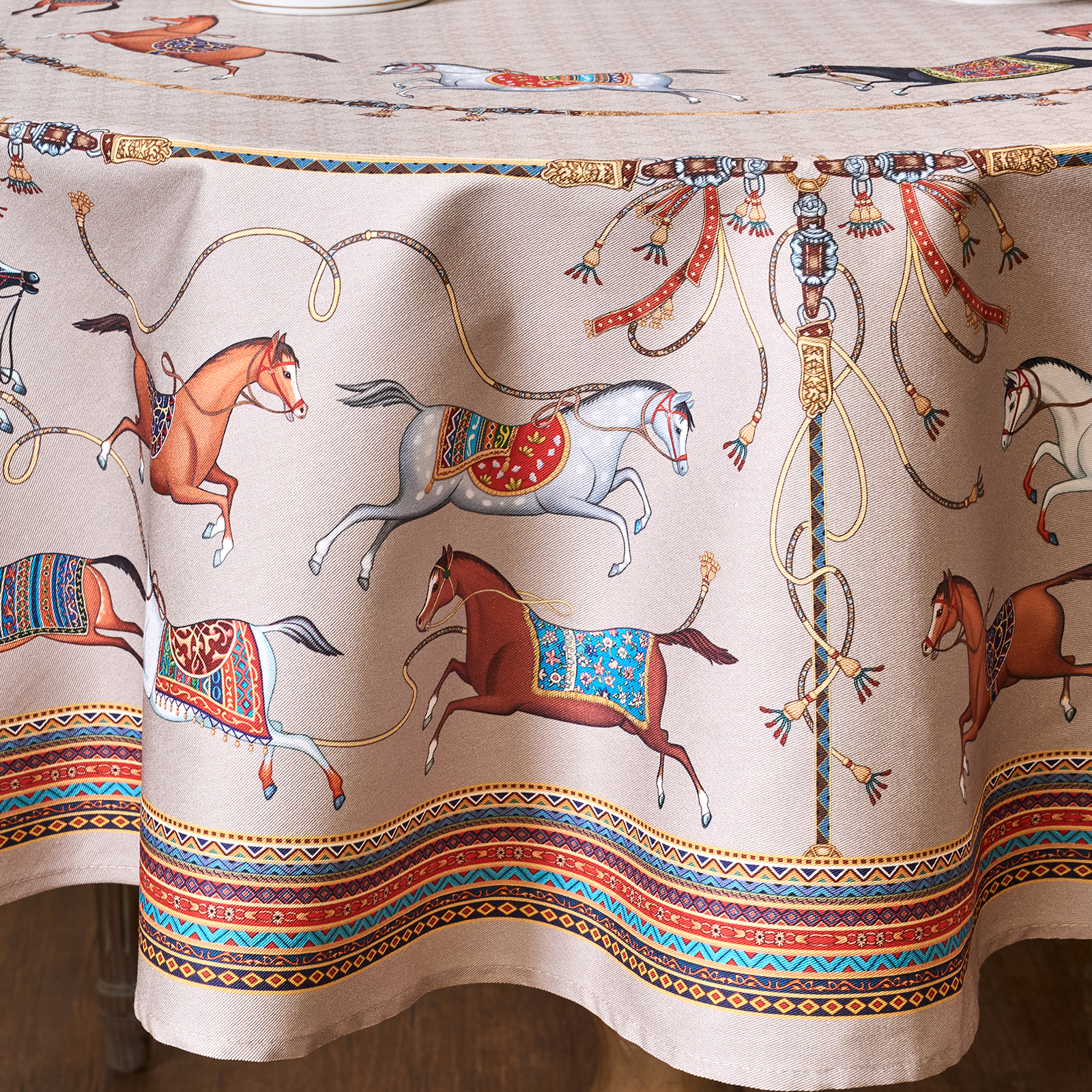 Темно-синий фон украшен авторским орнаментом с изящными лошадьми — символом 2026 года. Такой принт делает скатерть особенно уместной для праздничной сервировки и стильным украшением интерьера. Рисунок разработан художниками Lefard и нанесён методом цифровой печати, что обеспечивает стойкость красок даже после множества стирок.