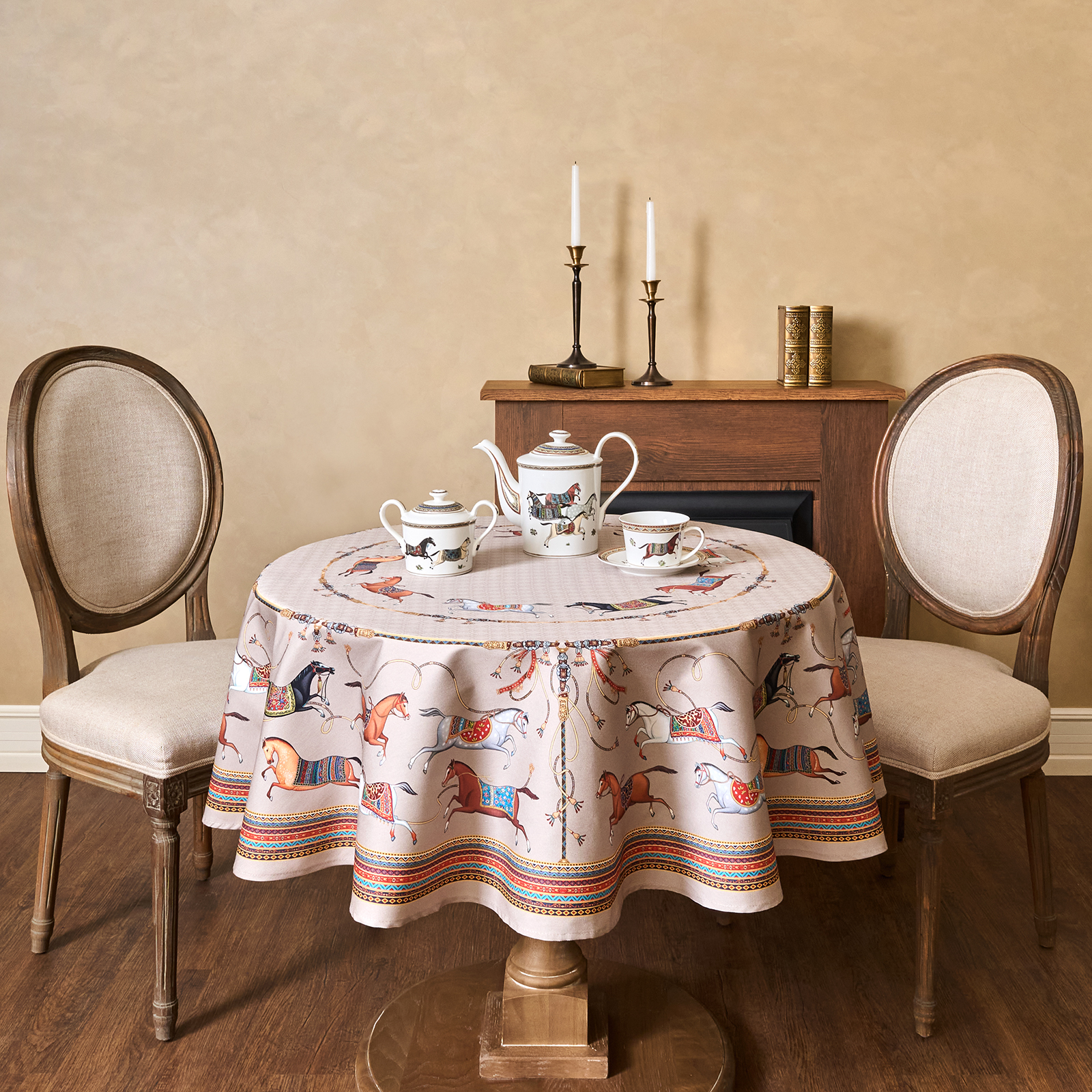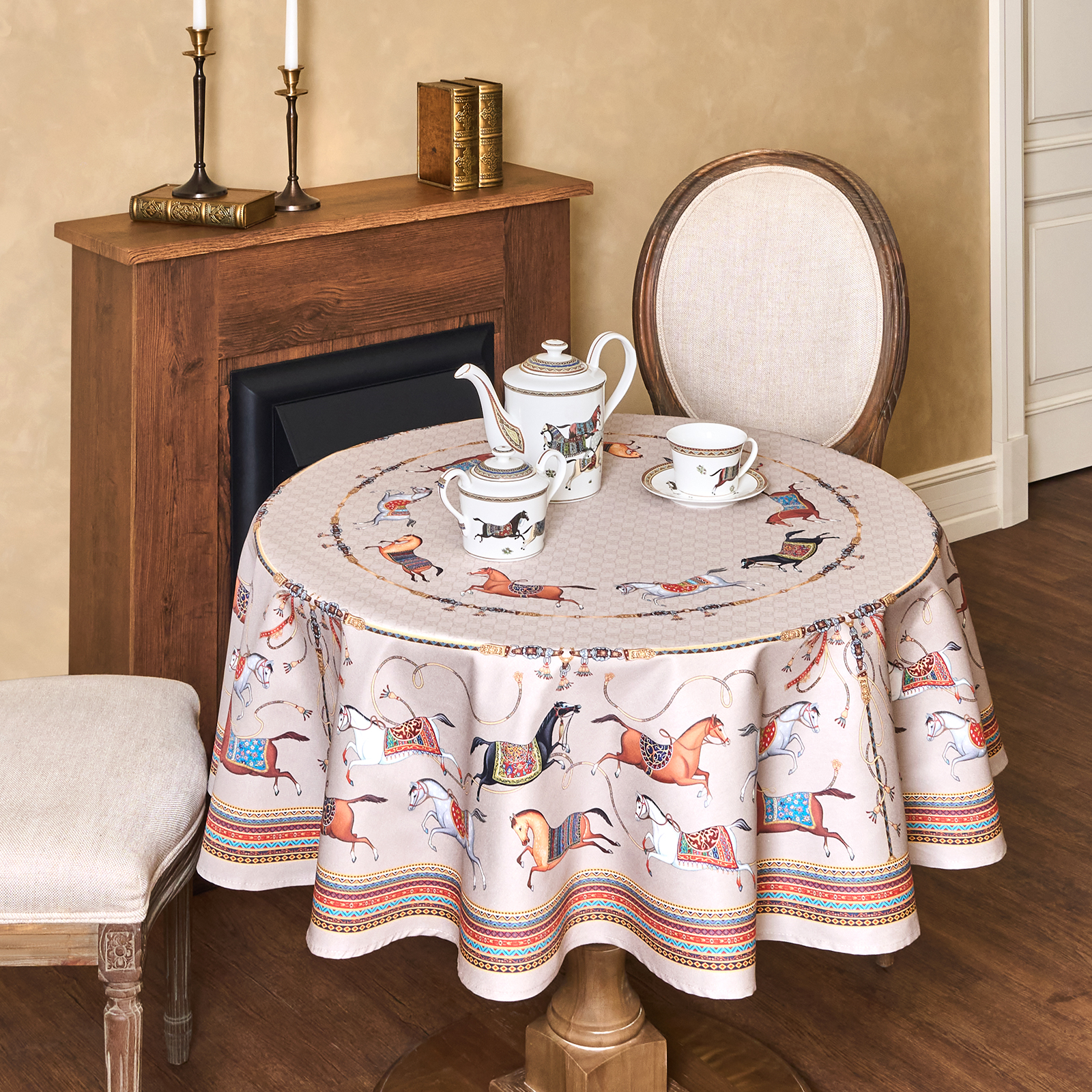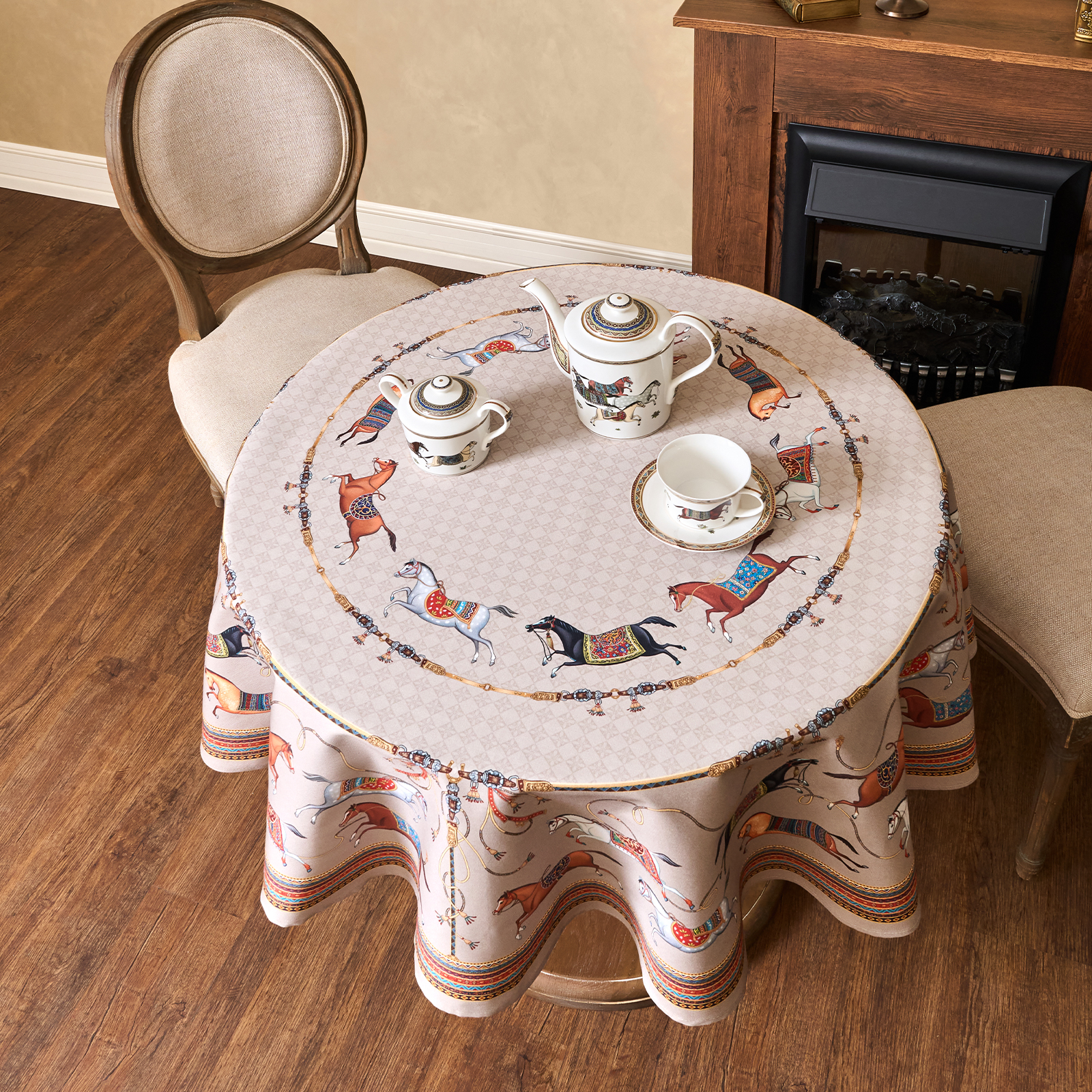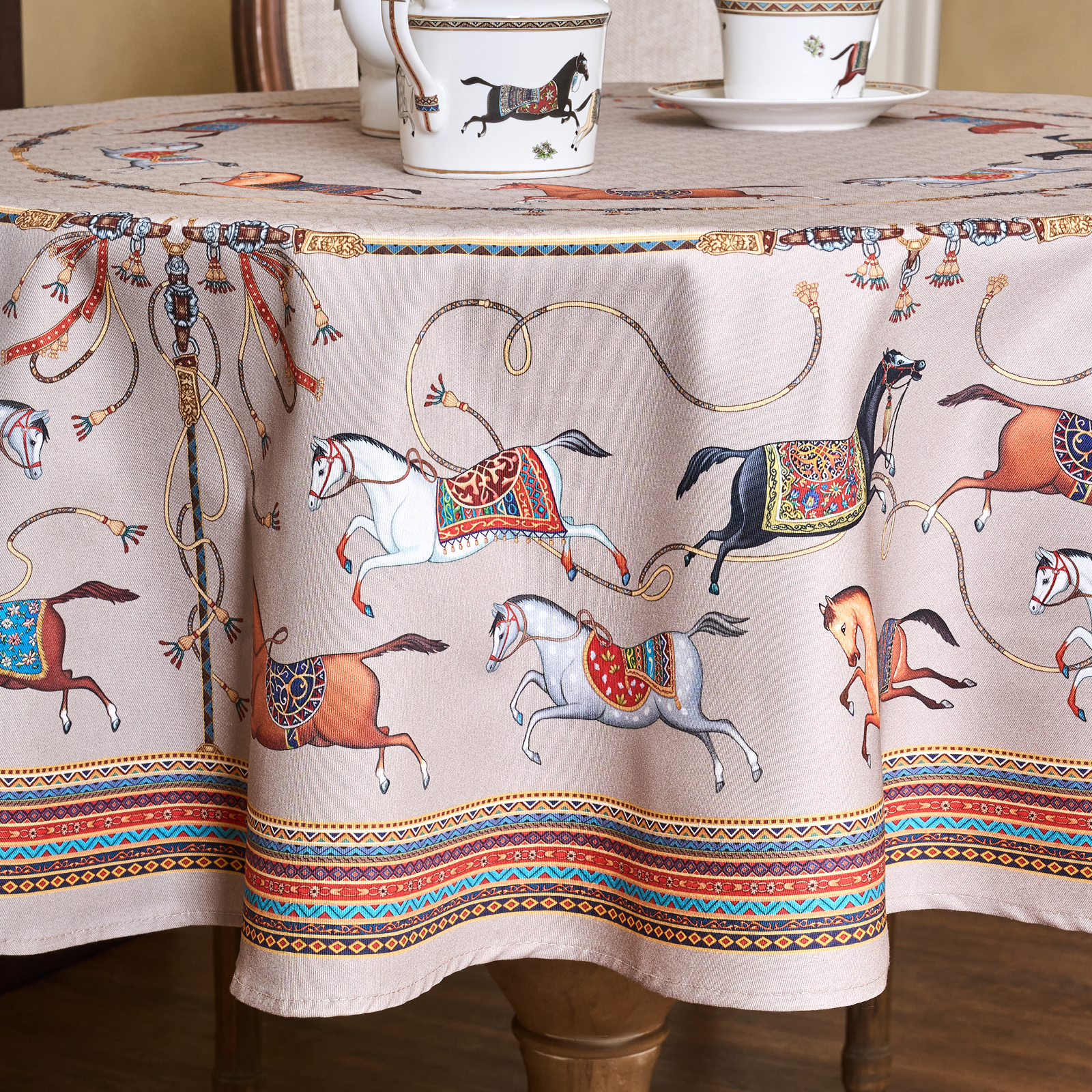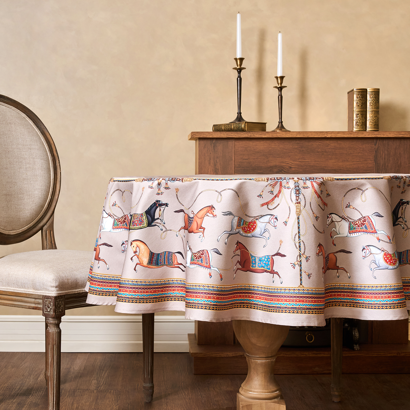 Темно-синий фон украшен авторским орнаментом с изящными лошадьми — символом 2026 года. Такой принт делает скатерть особенно уместной для праздничной сервировки и стильным украшением интерьера. Рисунок разработан художниками Lefard и нанесён методом цифровой печати, что обеспечивает стойкость красок даже после множества стирок.