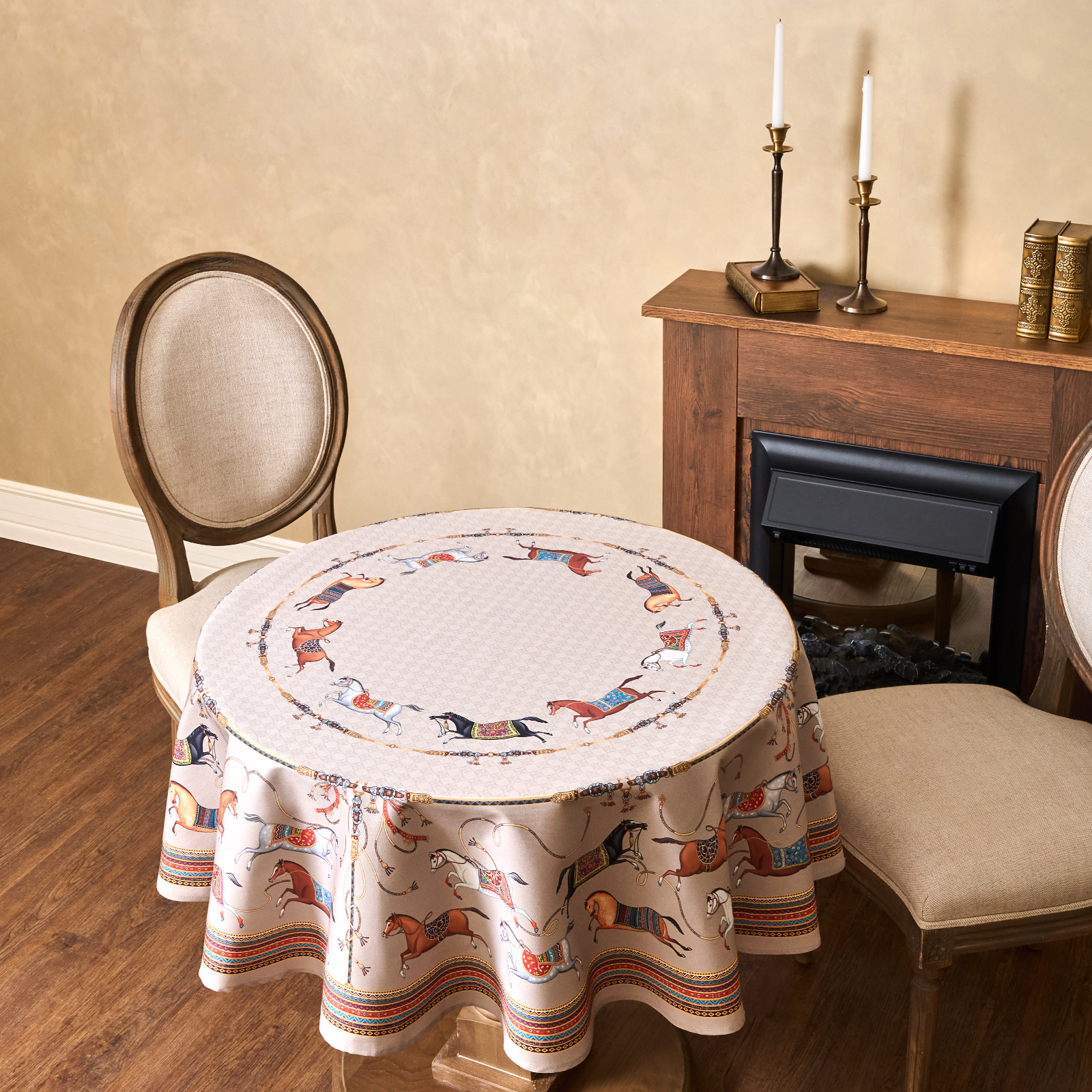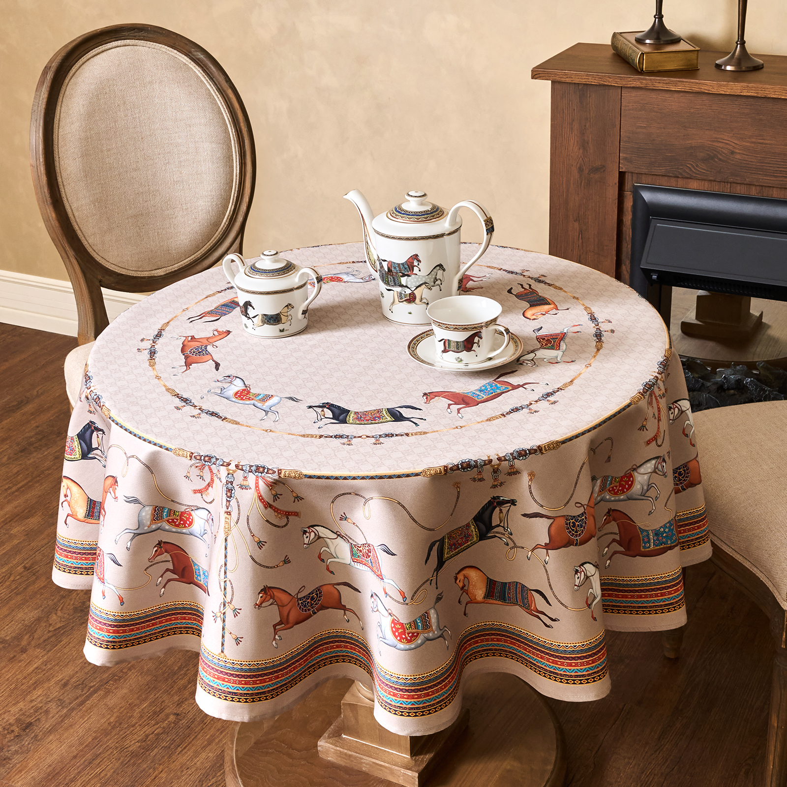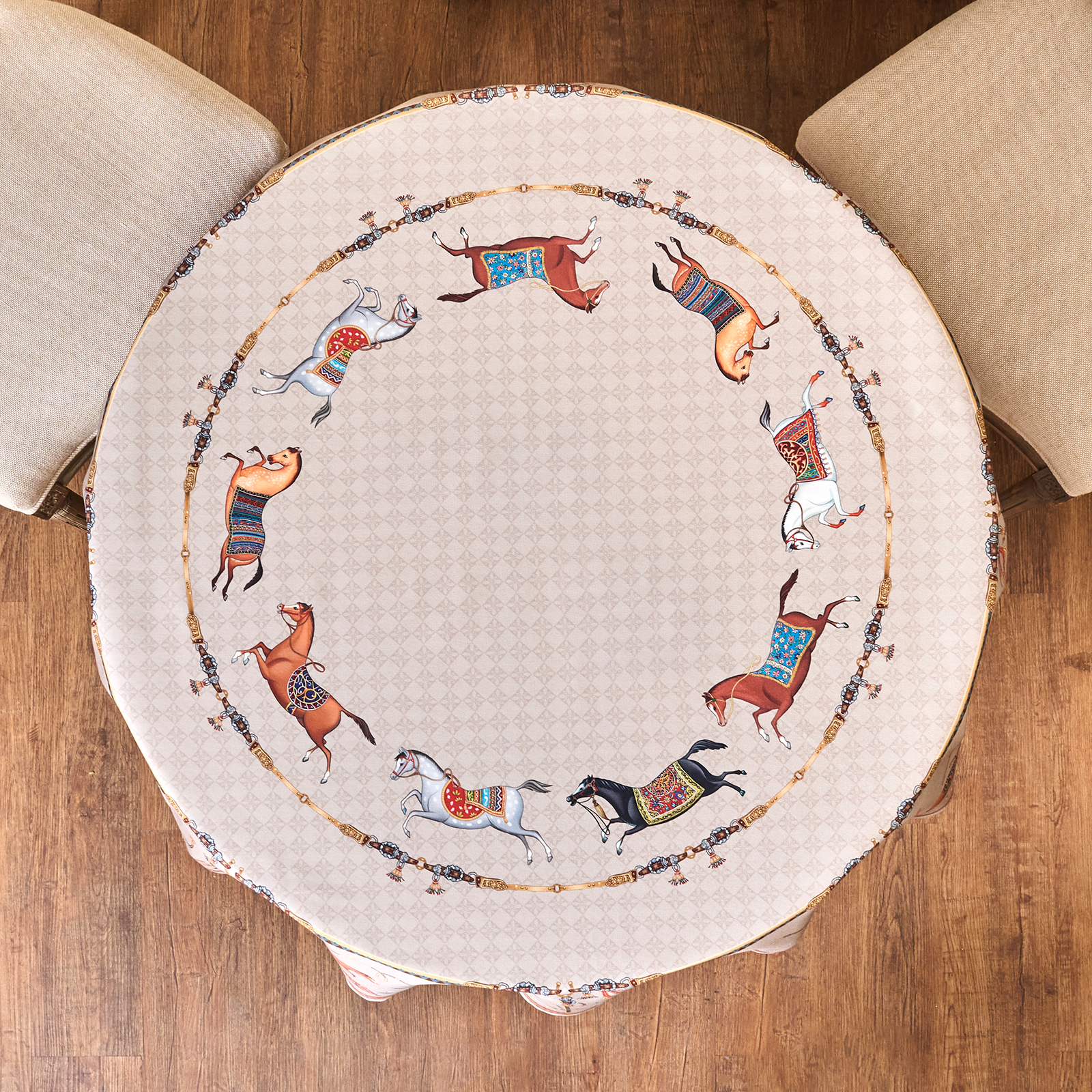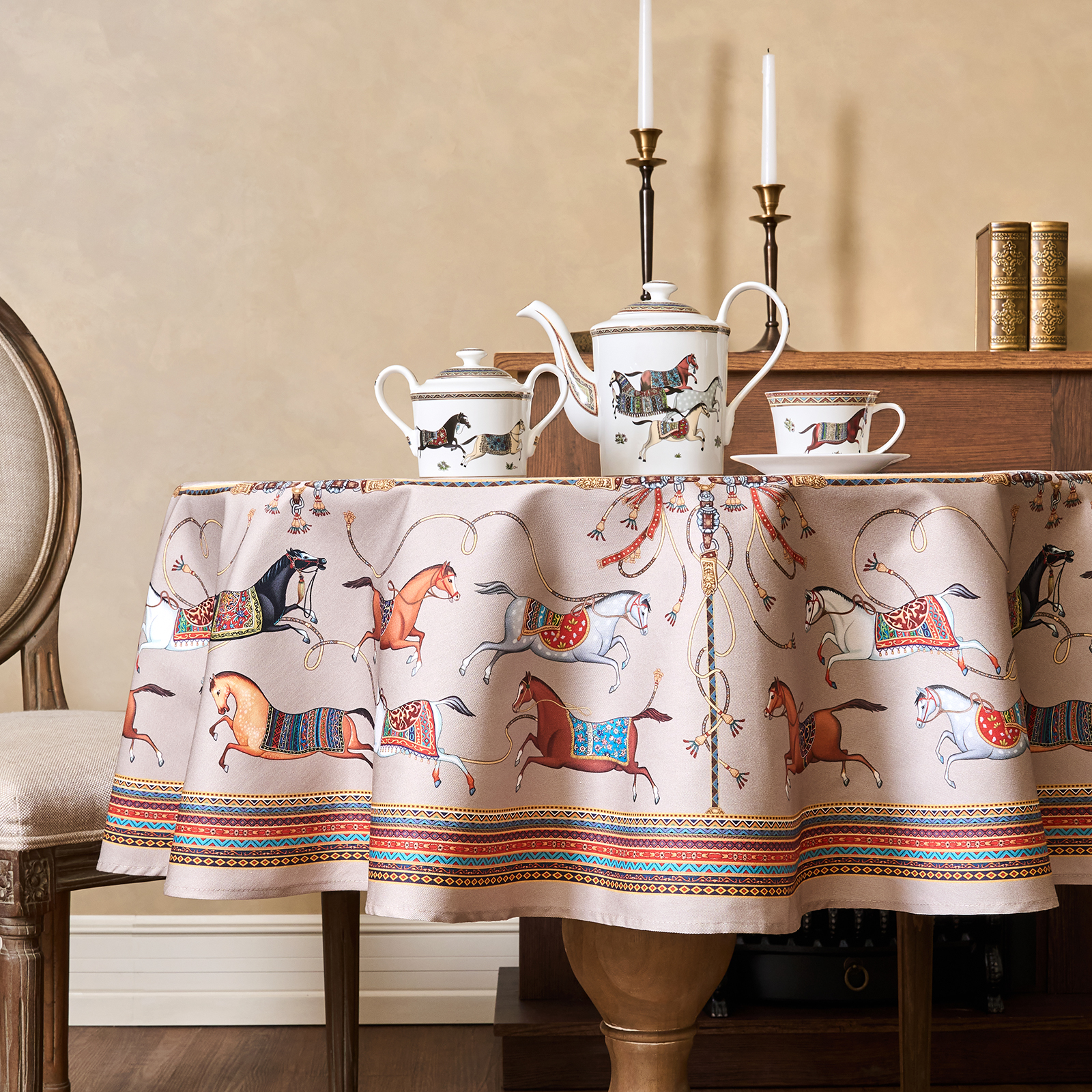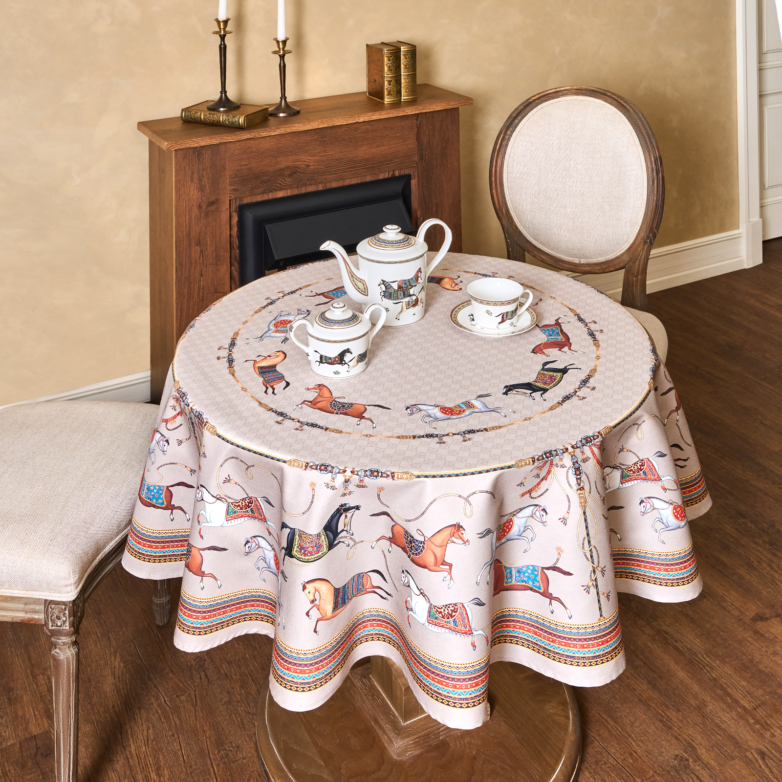 Темно-синий фон украшен авторским орнаментом с изящными лошадьми — символом 2026 года. Такой принт делает скатерть особенно уместной для праздничной сервировки и стильным украшением интерьера. Рисунок разработан художниками Lefard и нанесён методом цифровой печати, что обеспечивает стойкость красок даже после множества стирок.