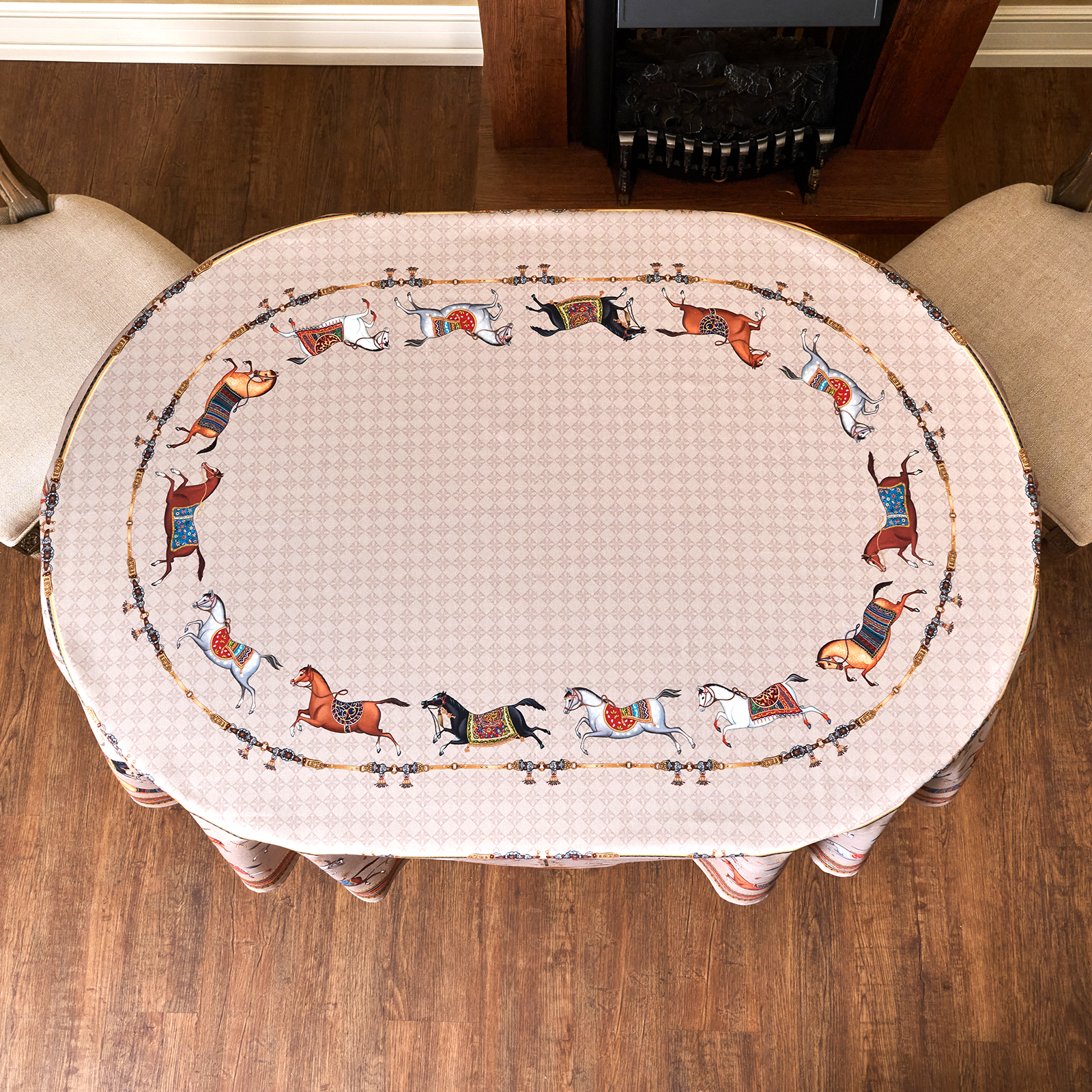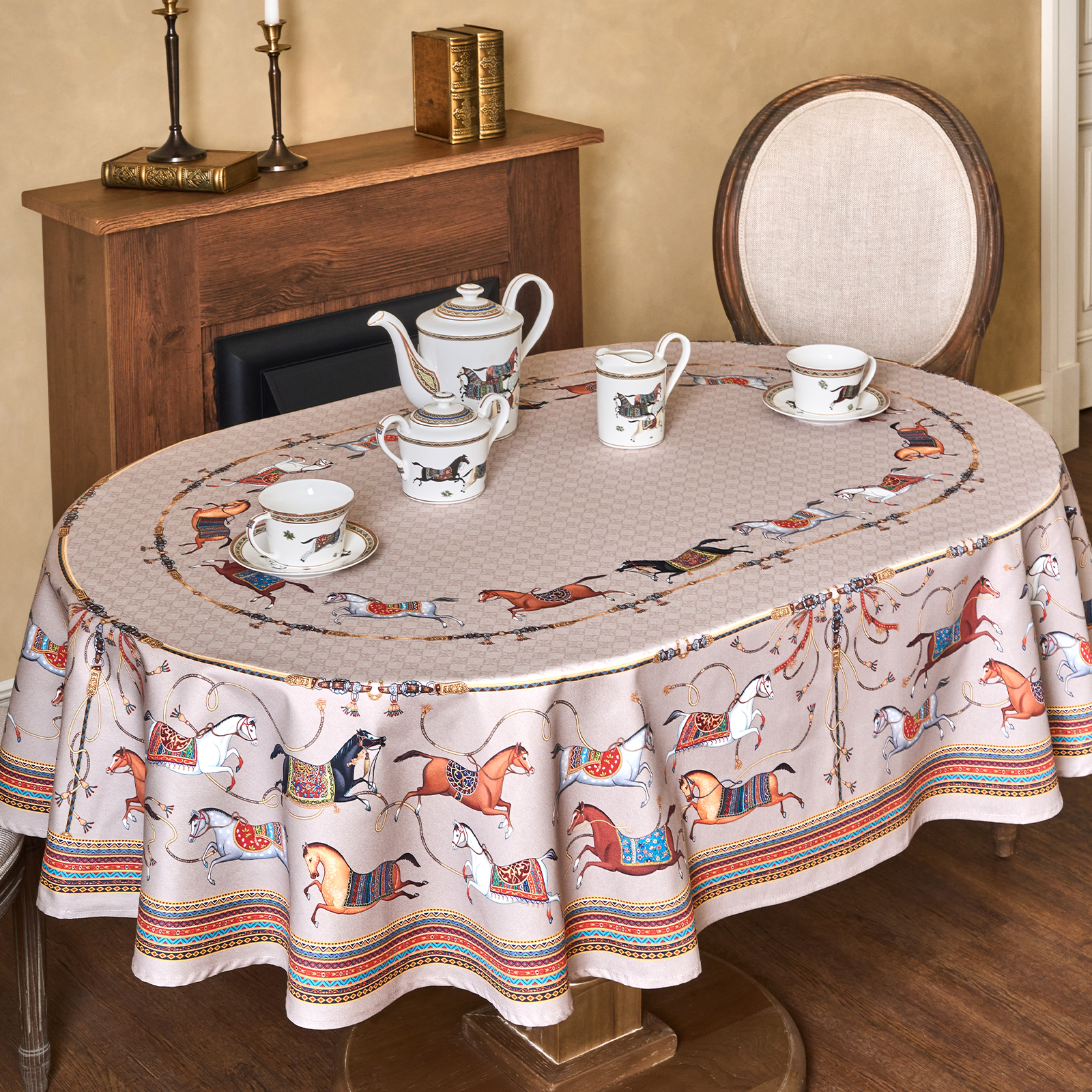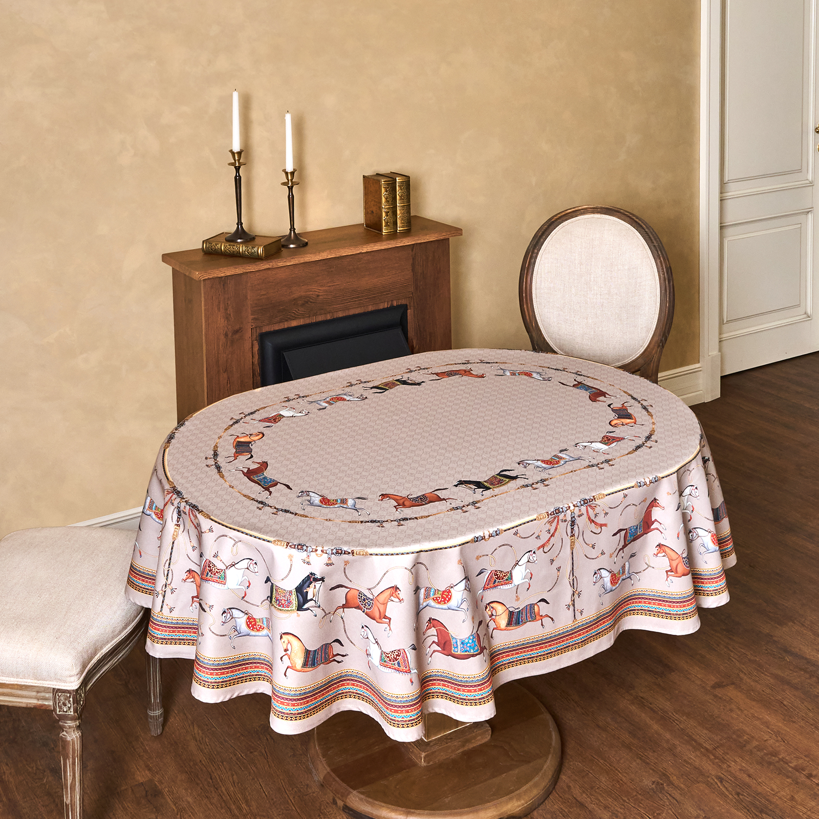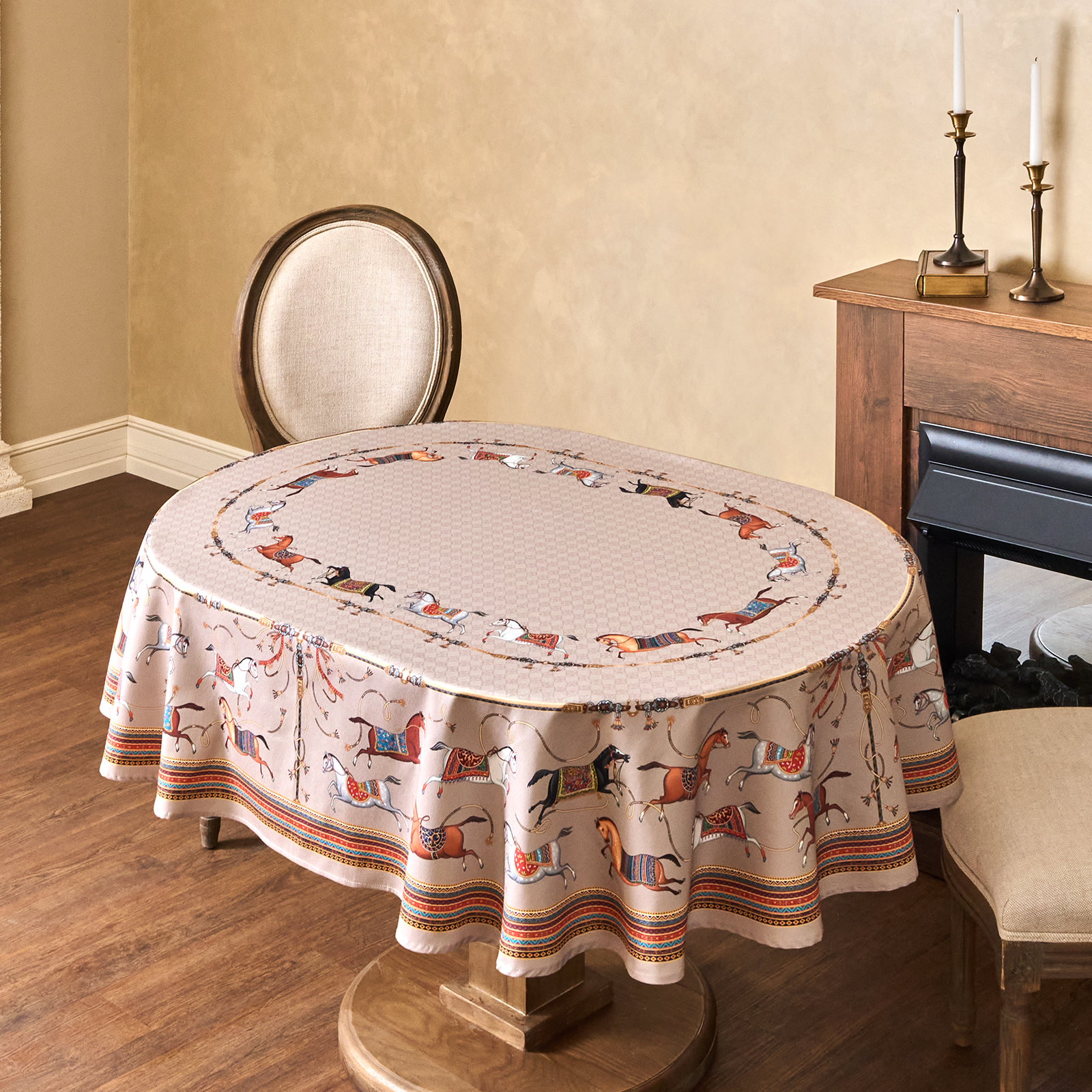 Приятный бежевый фон украшен орнаментом с грациозными лошадьми, создавая атмосферу восточной роскоши. фон украшен орнаментом с грациозными лошадьми, создавая атмосферу восточной роскоши. Лошадь — символ 2026 года, поэтому скатерть будет актуальна как для ежедневного использования в интерьере в стиле бохо, так и для праздничной сервировки. Авторский принт разработан художниками эксклюзивно для Lefard и нанесён методом цифровой печати, что гарантирует яркость и стойкость красок даже после множества стирок.