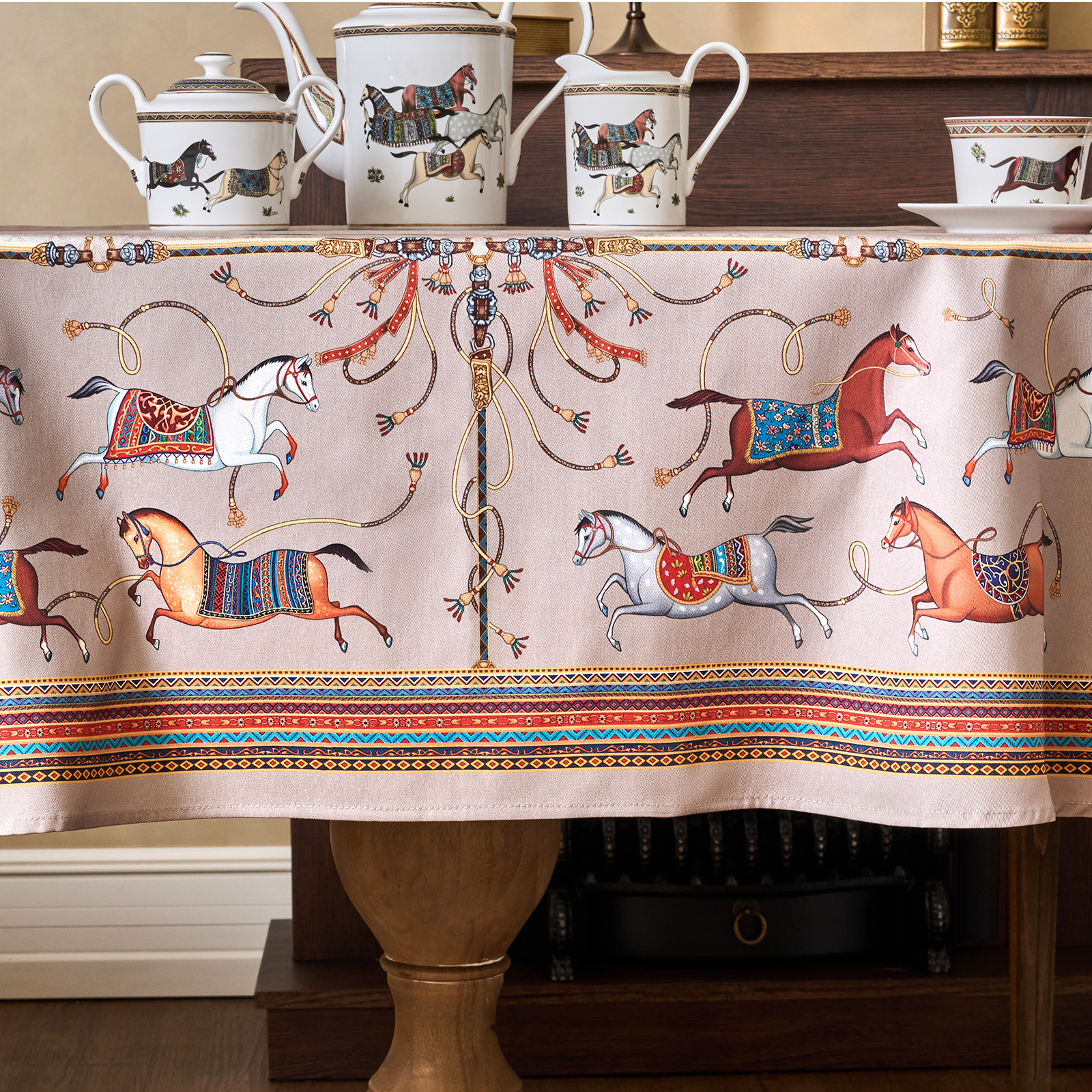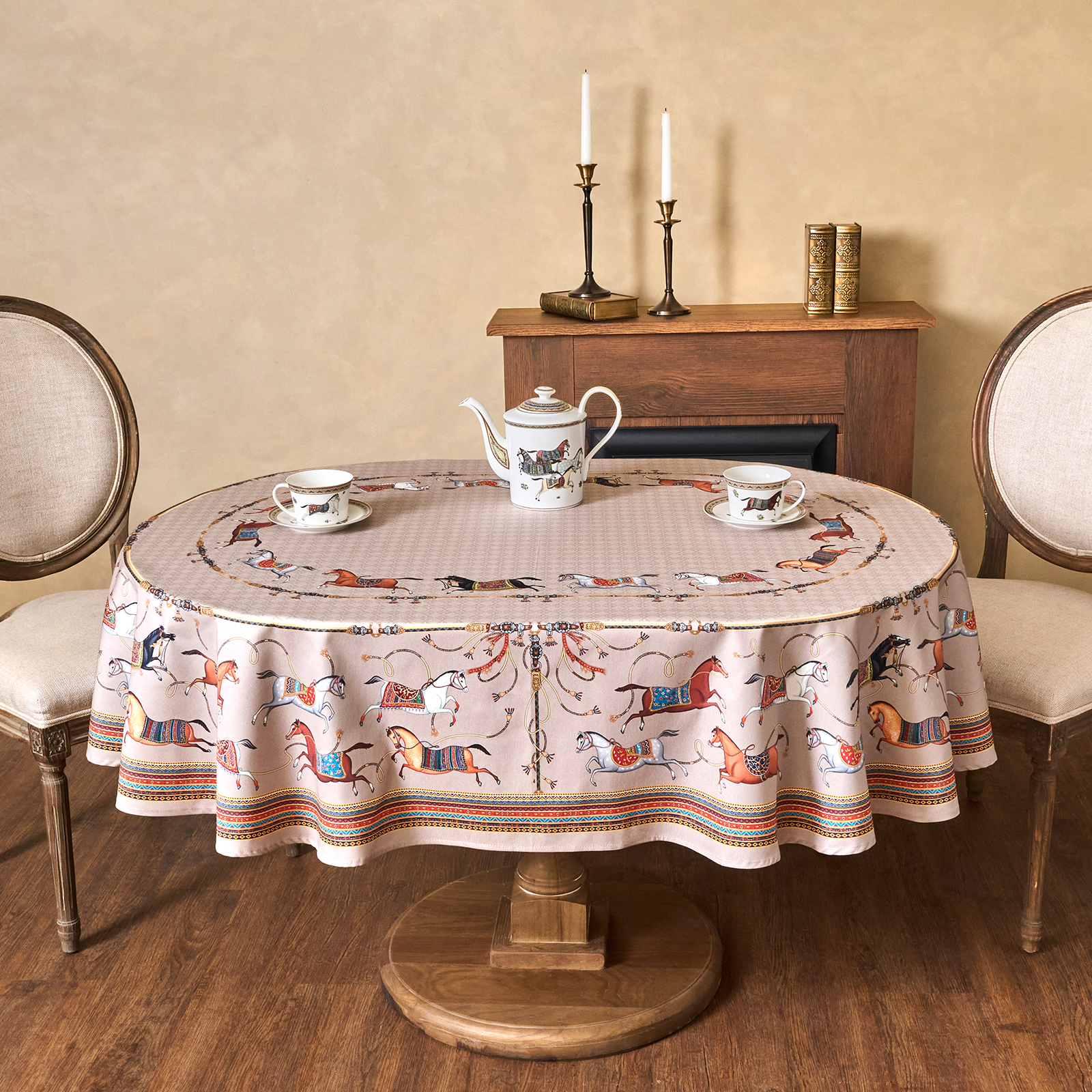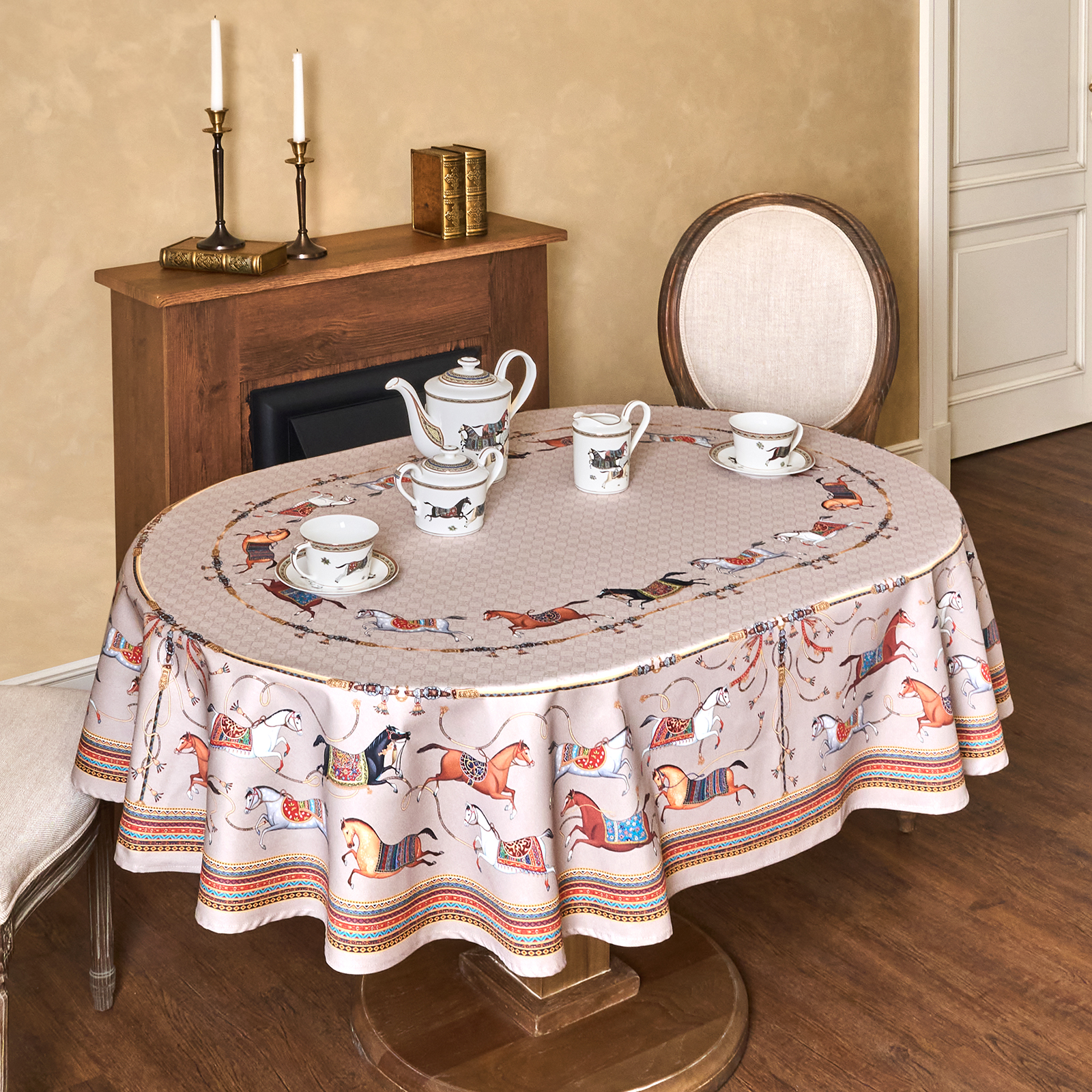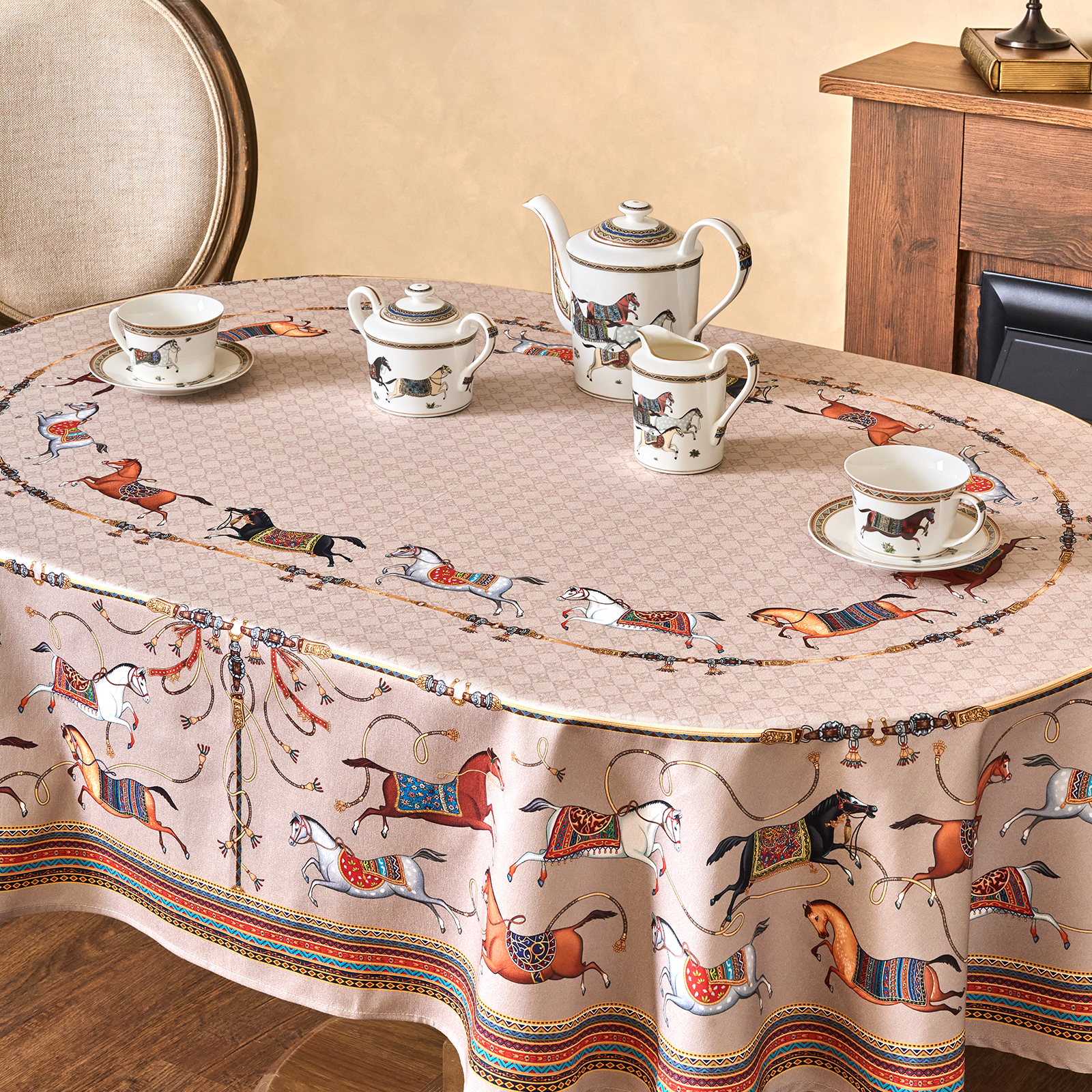 Приятный бежевый фон украшен орнаментом с грациозными лошадьми, создавая атмосферу восточной роскоши. фон украшен орнаментом с грациозными лошадьми, создавая атмосферу восточной роскоши. Лошадь — символ 2026 года, поэтому скатерть будет актуальна как для ежедневного использования в интерьере в стиле бохо, так и для праздничной сервировки. Авторский принт разработан художниками эксклюзивно для Lefard и нанесён методом цифровой печати, что гарантирует яркость и стойкость красок даже после множества стирок.