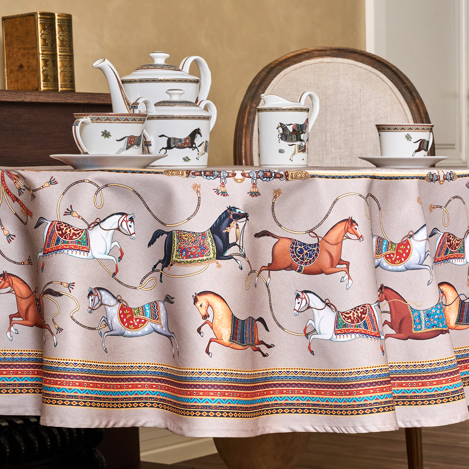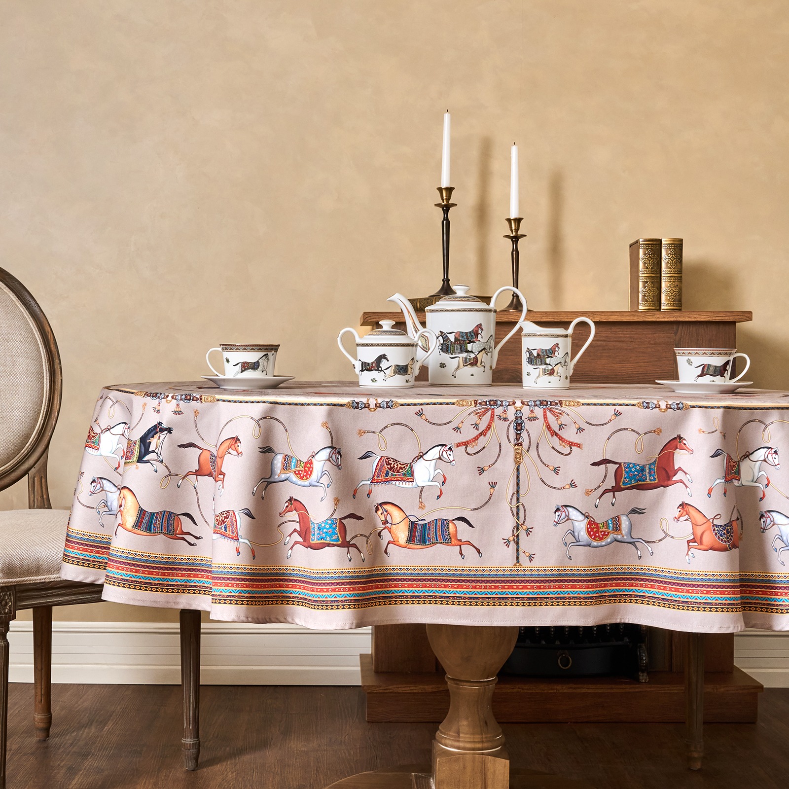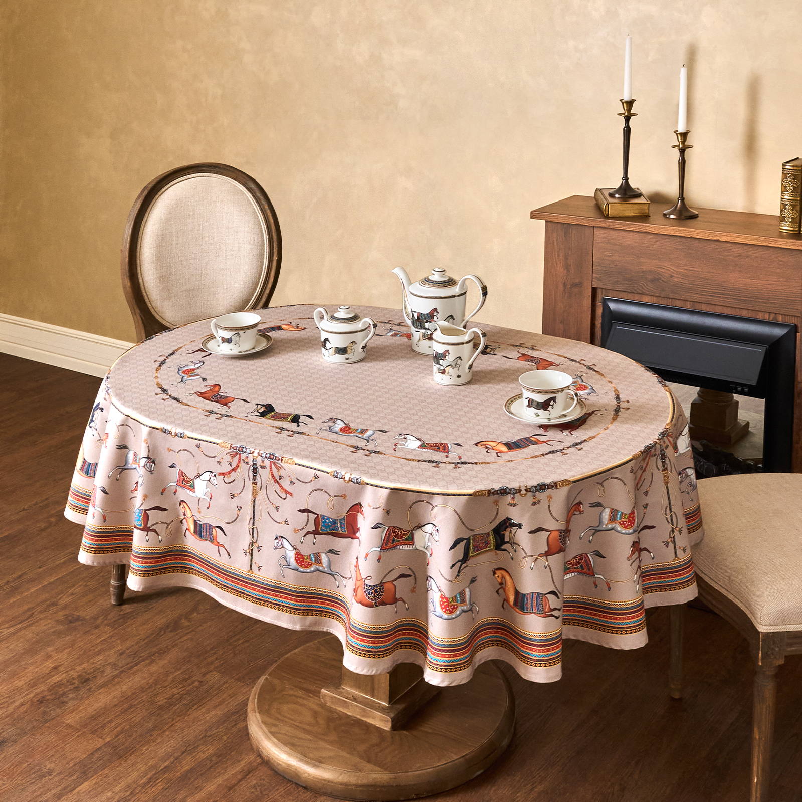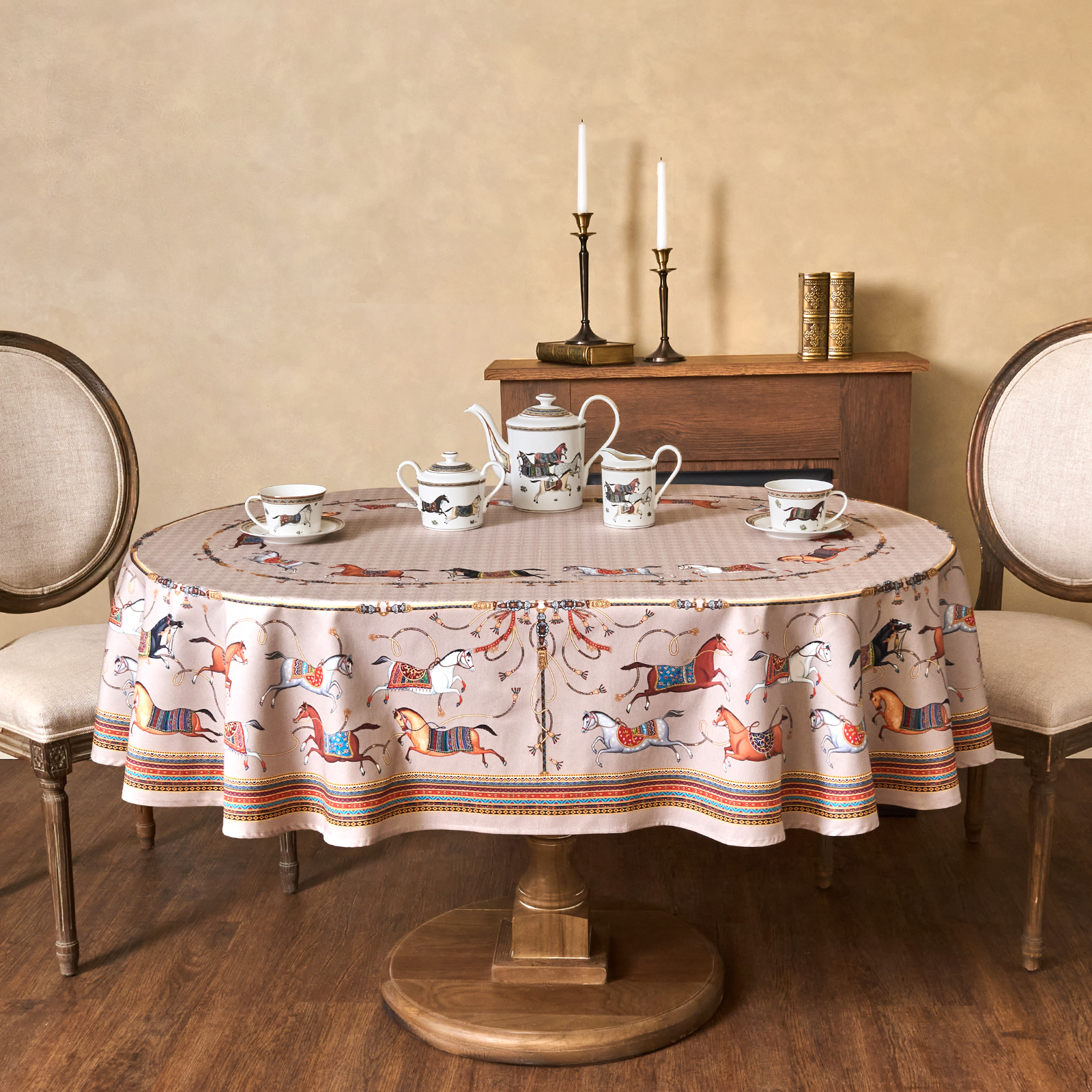 Приятный бежевый фон украшен орнаментом с грациозными лошадьми, создавая атмосферу восточной роскоши. фон украшен орнаментом с грациозными лошадьми, создавая атмосферу восточной роскоши. Лошадь — символ 2026 года, поэтому скатерть будет актуальна как для ежедневного использования в интерьере в стиле бохо, так и для праздничной сервировки. Авторский принт разработан художниками эксклюзивно для Lefard и нанесён методом цифровой печати, что гарантирует яркость и стойкость красок даже после множества стирок.
