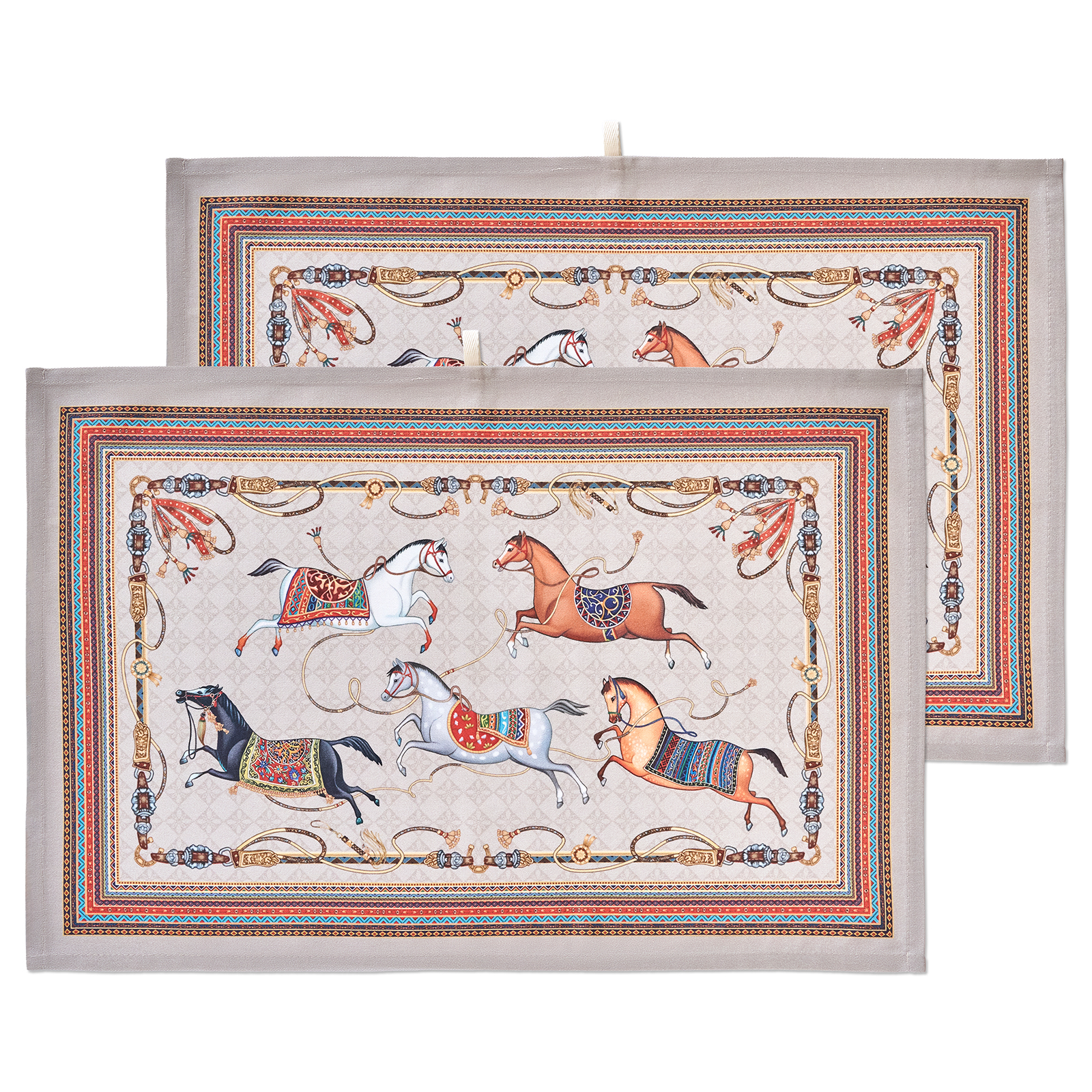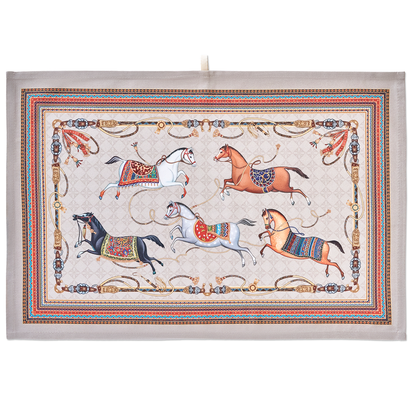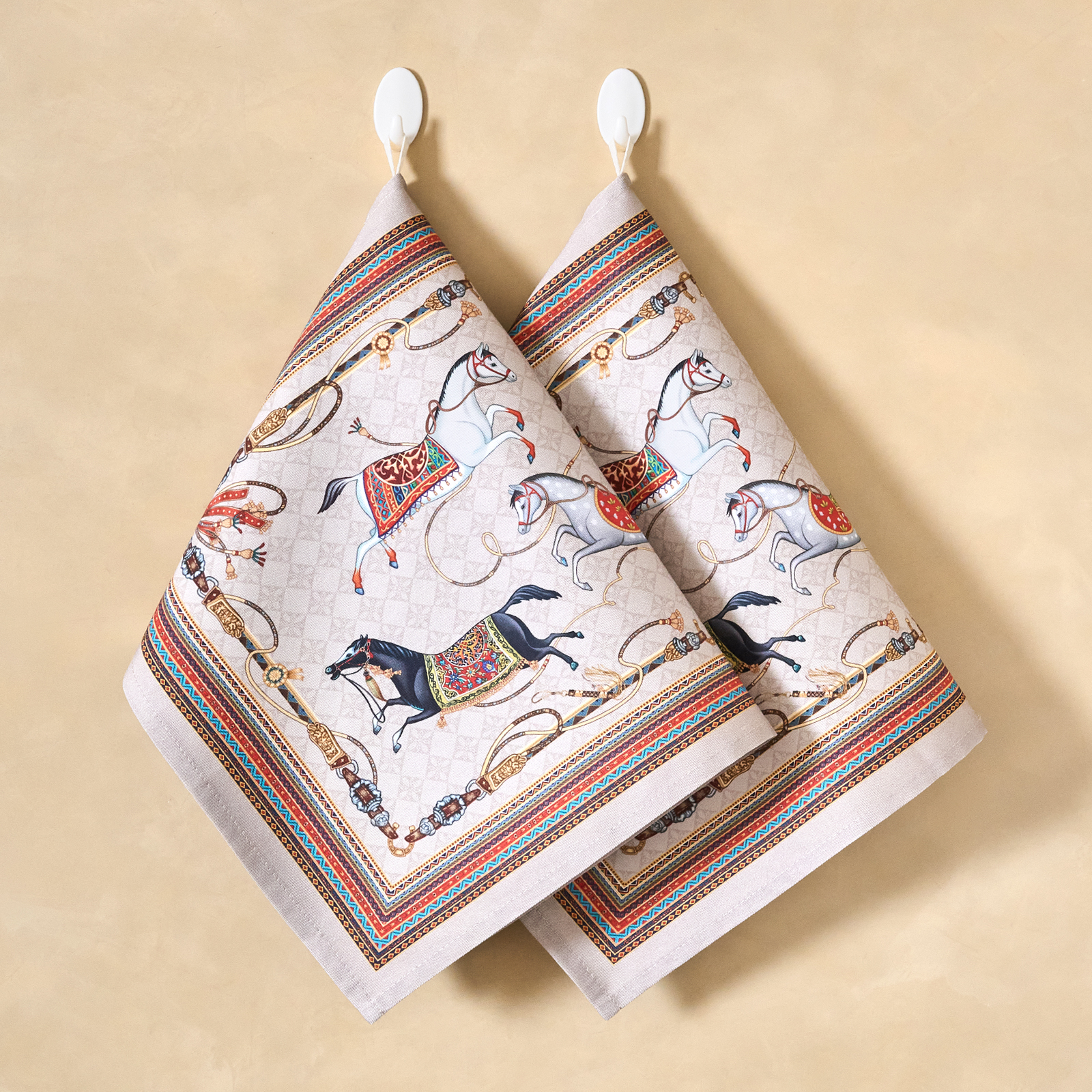 Белый фон украшен изящным орнаментом с лошадьми — символом 2026 года. Авторский принт, созданный художниками Lefard, нанесён методом цифровой печати, благодаря чему цвета остаются яркими даже после многократных стирок. Такой декоративный узор превращает полотенца в выразительный элемент сервировки или стильный акцент интерьера.