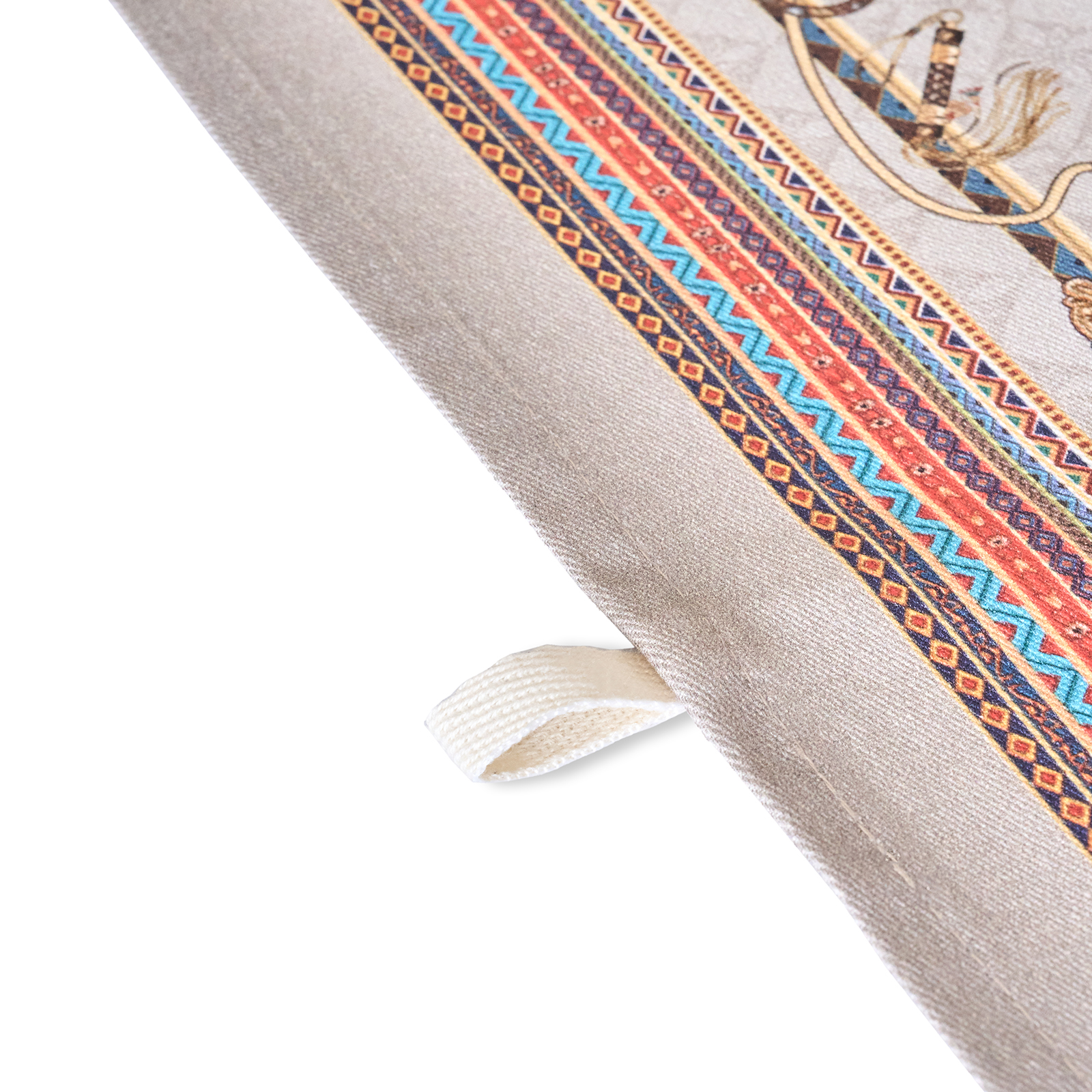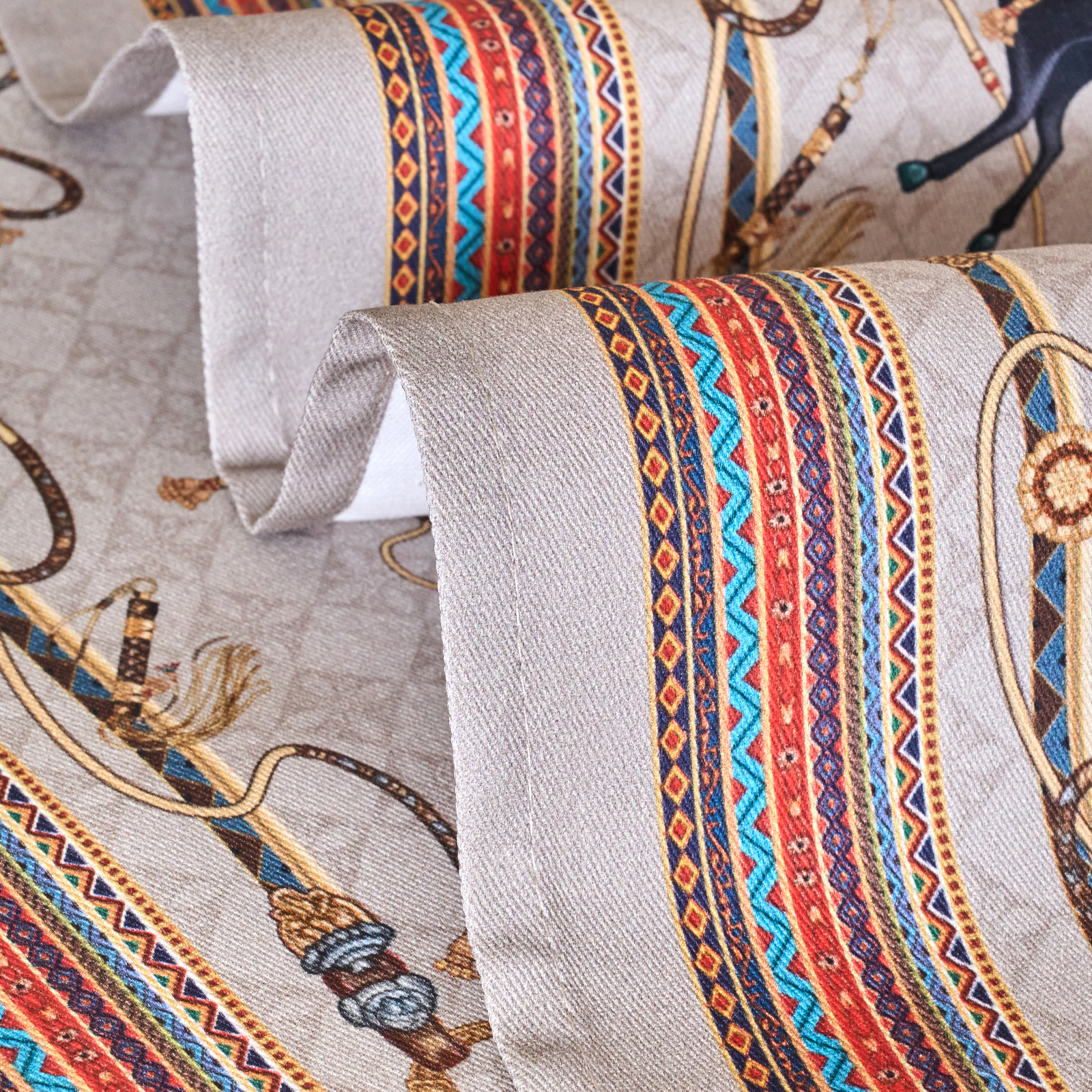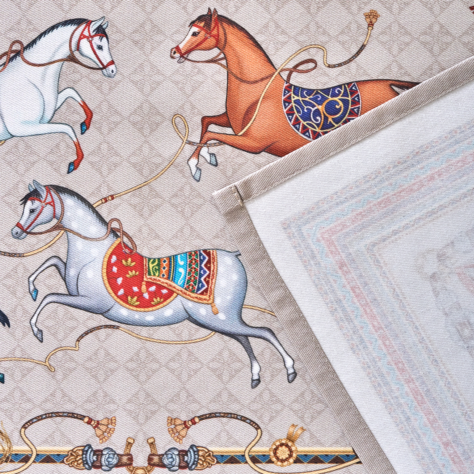 Белый фон украшен изящным орнаментом с лошадьми — символом 2026 года. Авторский принт, созданный художниками Lefard, нанесён методом цифровой печати, благодаря чему цвета остаются яркими даже после многократных стирок. Такой декоративный узор превращает полотенца в выразительный элемент сервировки или стильный акцент интерьера.