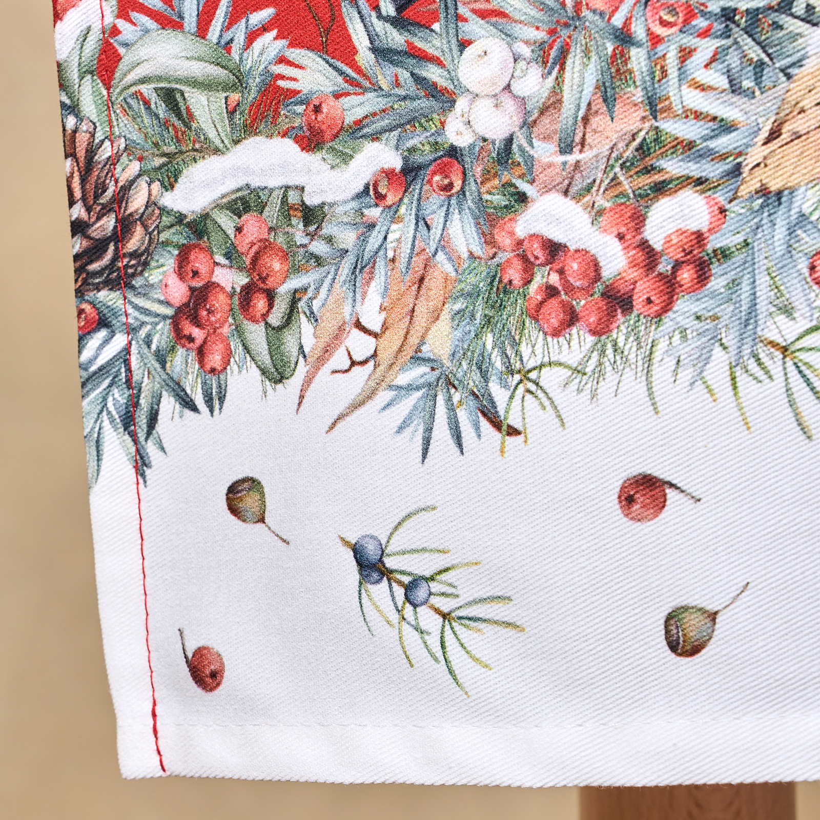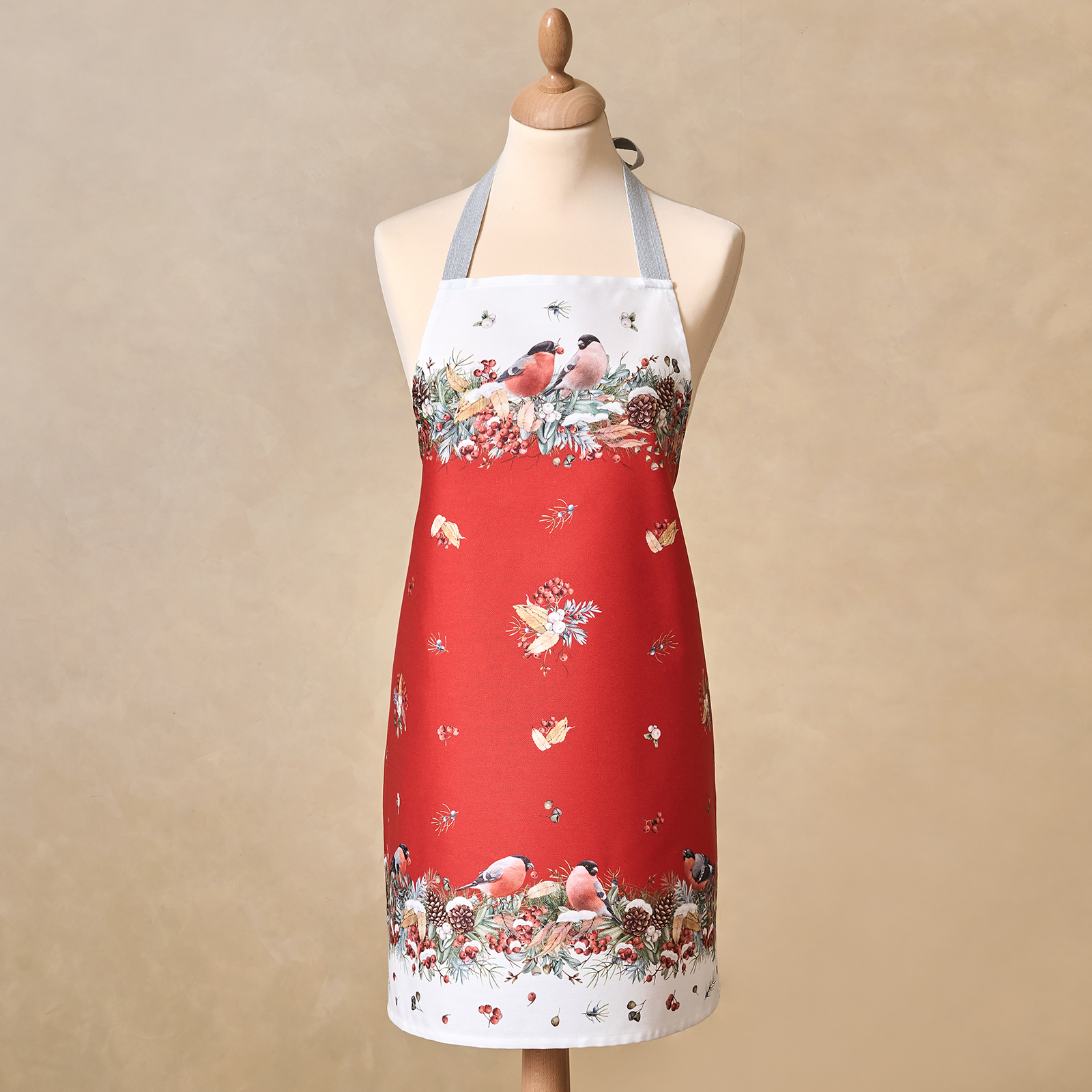 Плотный хлопковый фартук с рождественским принтом и рисунком снегирей, зимних ветвей и снежинок создаёт праздничное настроение и уют. Фартук с новогодним дизайном станет отличным подарком маме, бабушке или подруге на Новый год или Рождество.