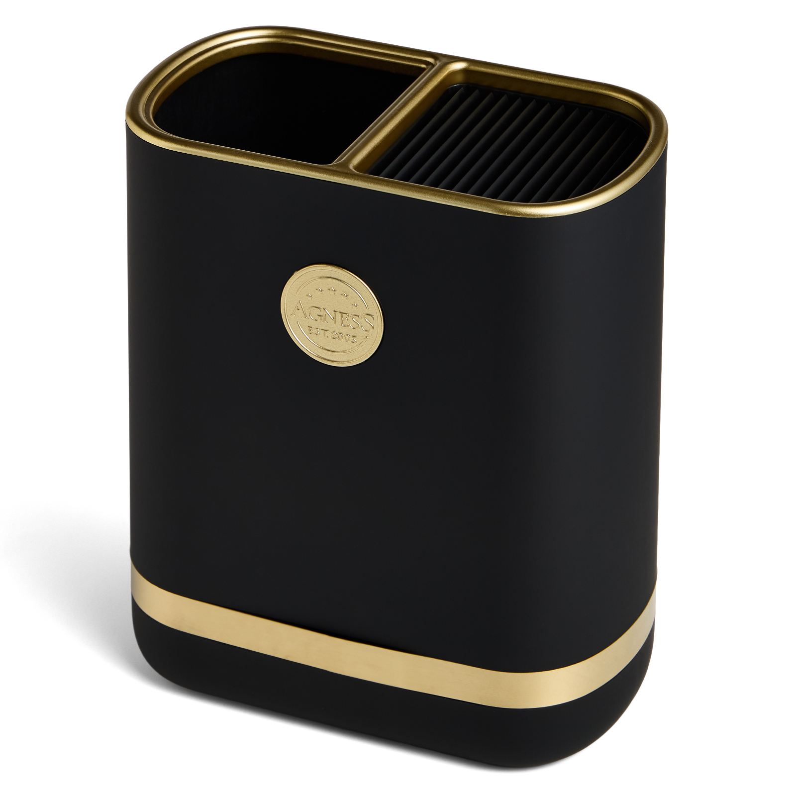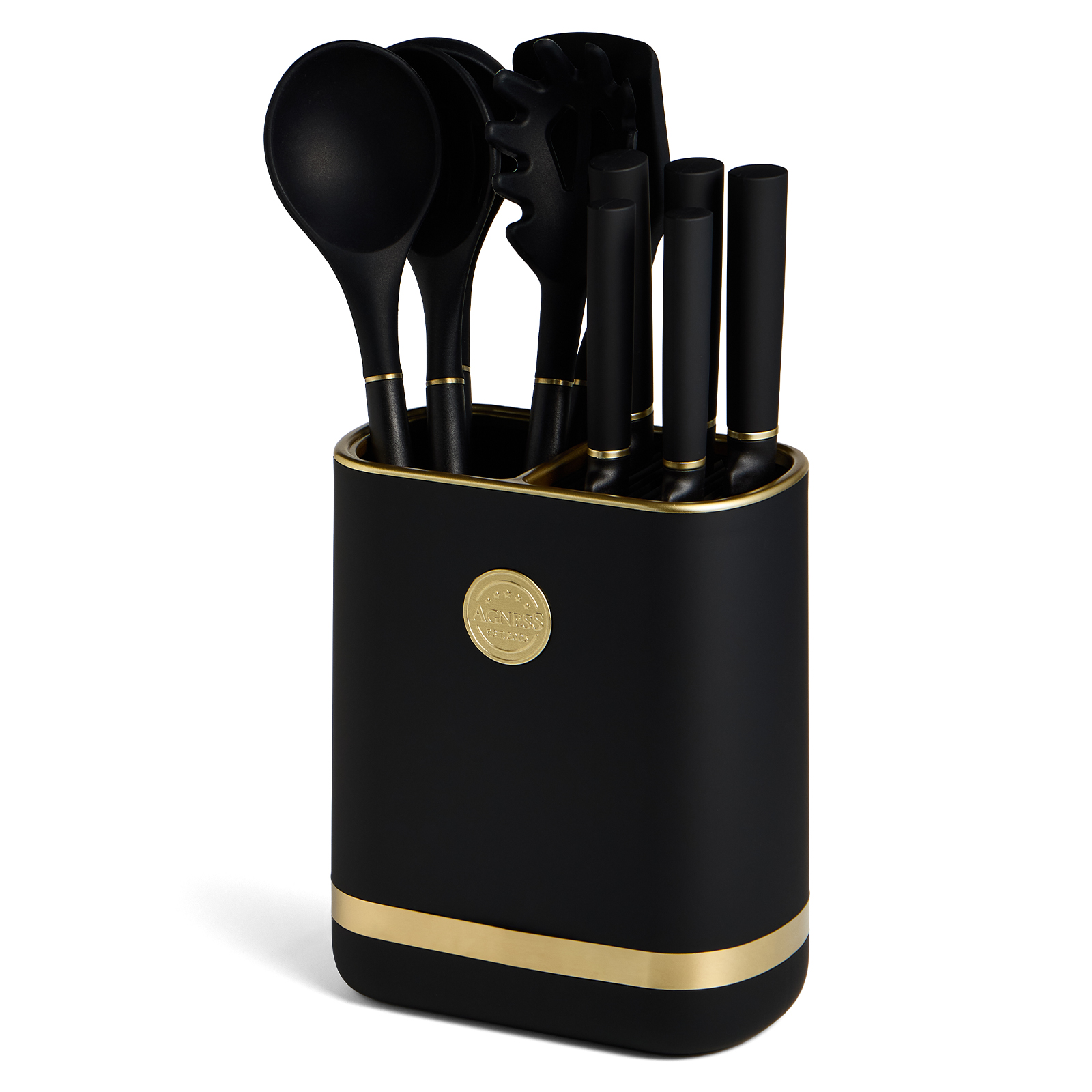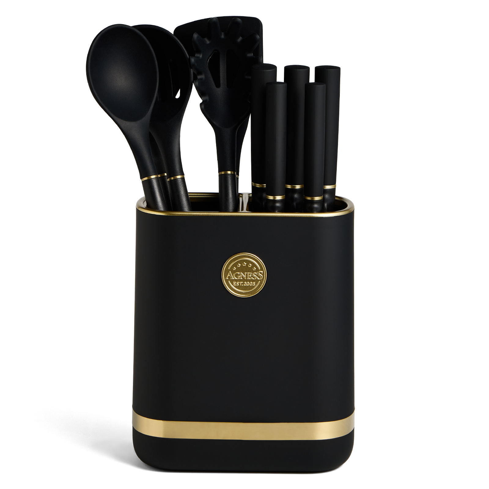 Состав набора: шеф нож 19,5см, нож для хлеба 20см, нож разделочный 20см, универсальный нож 12,5см, нож для овощей и фруктов 8,9 см, половник 31,5см, шумовка 32,3см, лопатка 32см, ложка 32,3см, ложка для спагетти 32 см, подставка 23,8х16,3 см