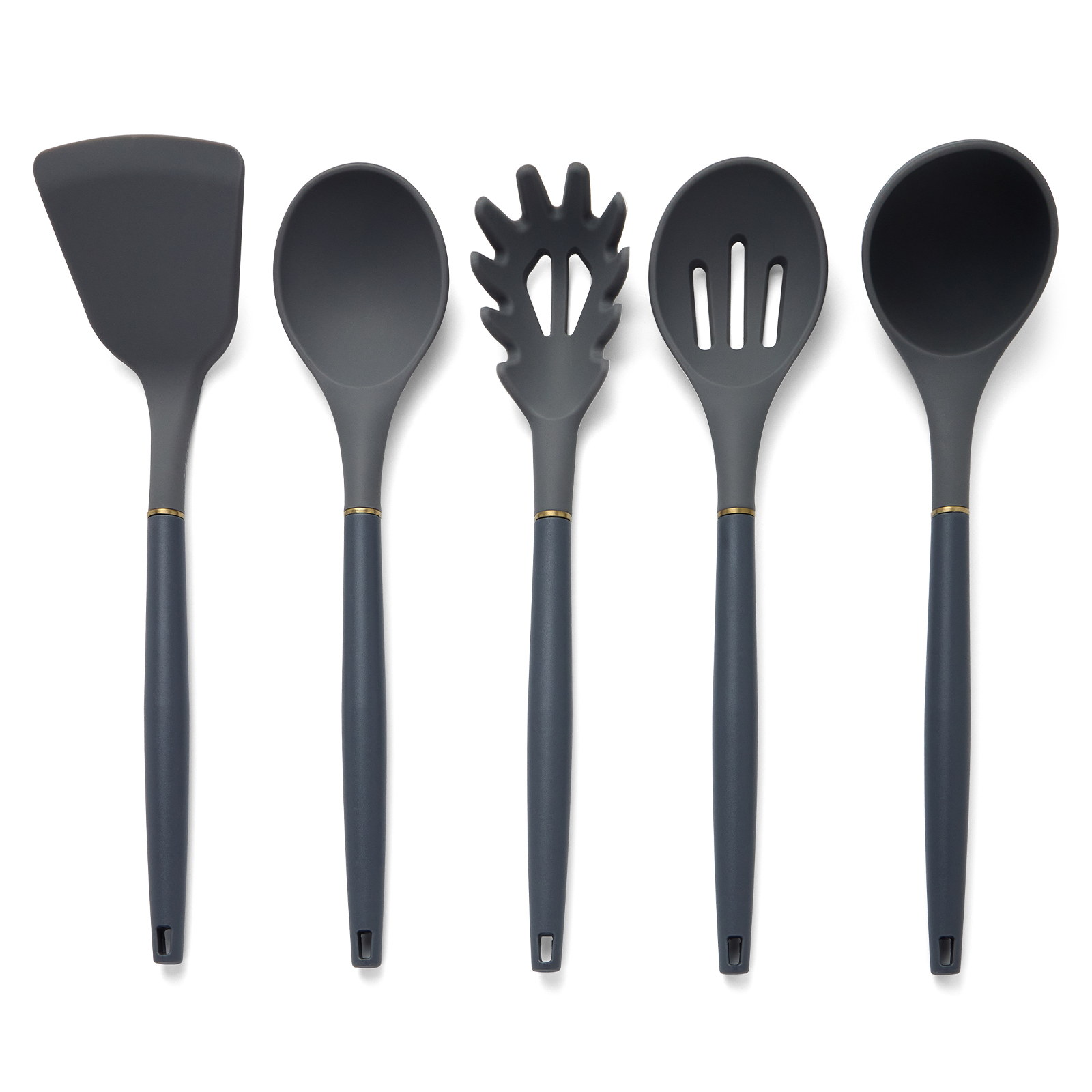 Состав набора: шеф нож 19,5см, нож для хлеба 20см, нож разделочный 20см, универсальный нож 12,5см, нож для овощей и фруктов 8,9 см, половник 31,5см, шумовка 32,3см, лопатка 32см, ложка 32,3см, ложка для спагетти 32 см, подставка 23,8х16,3 см