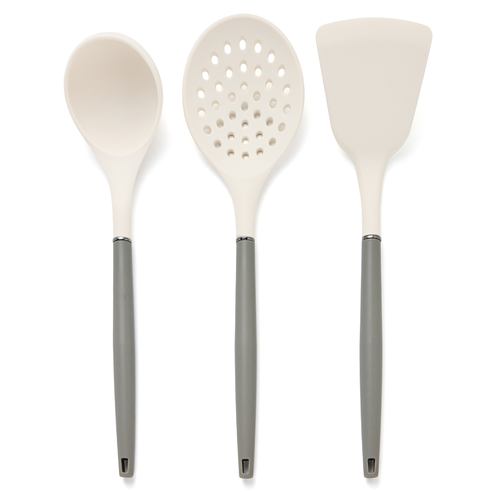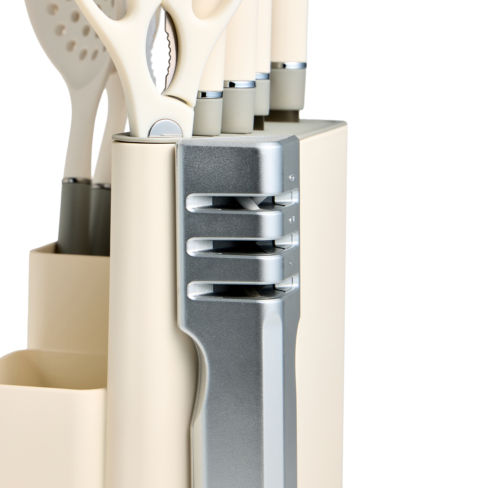 Состав набора: нож поварско 19,5см, нож для хлеба 20см, разделочный нож 20см, нож универсальный 12,5см, нож для чистки овощей 8,9 см, ножницы кухонные, половник 31,5см, шумовка 32см, лопатка 32см, ножеточка, подставка.