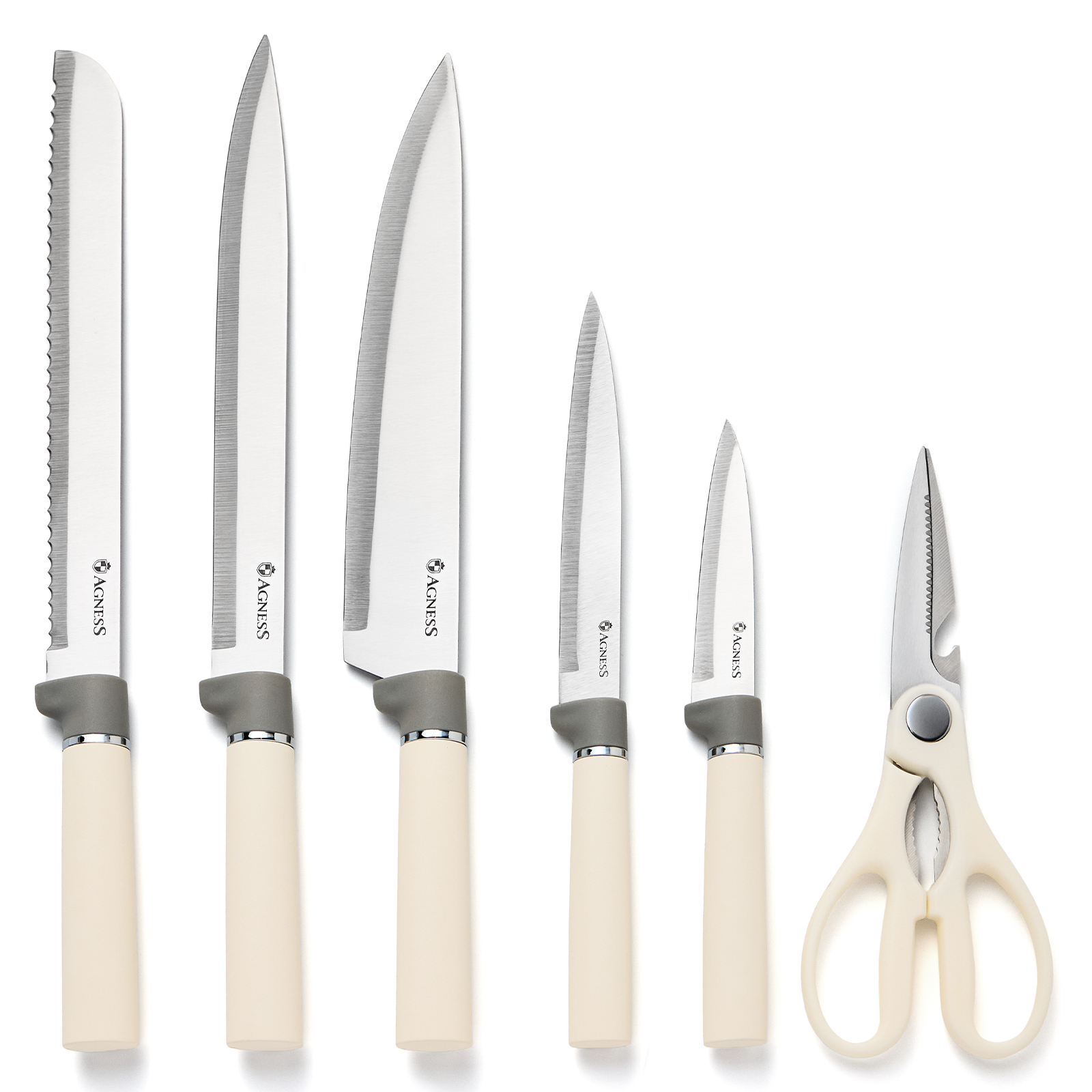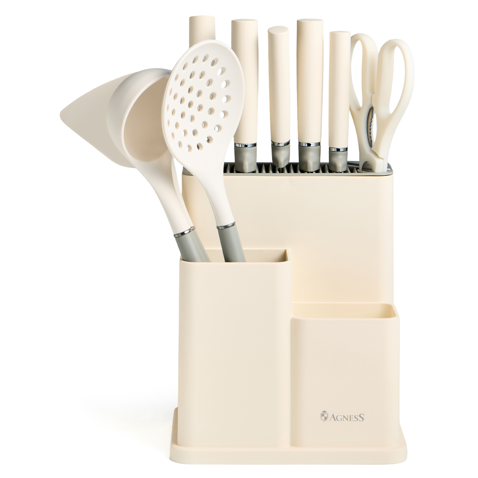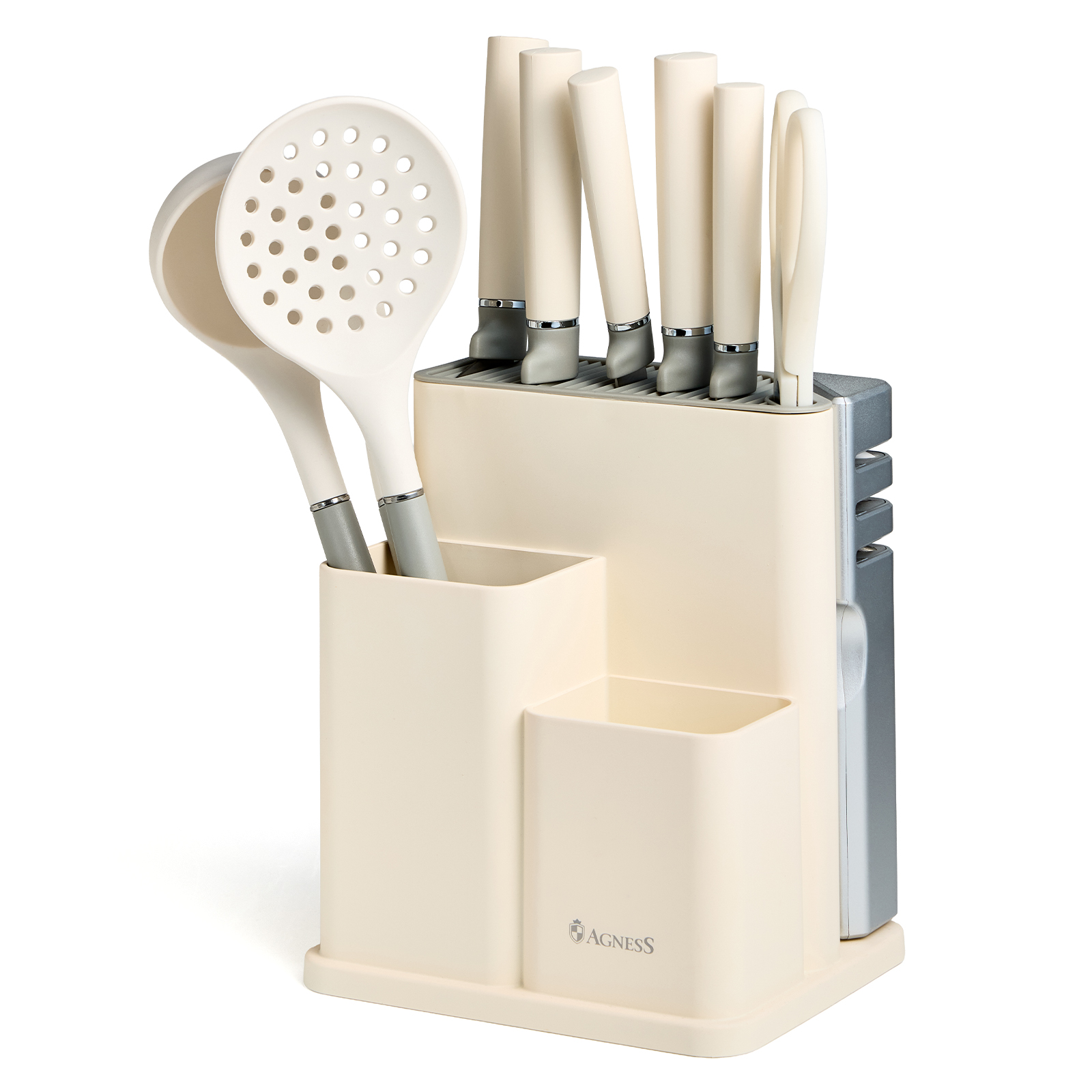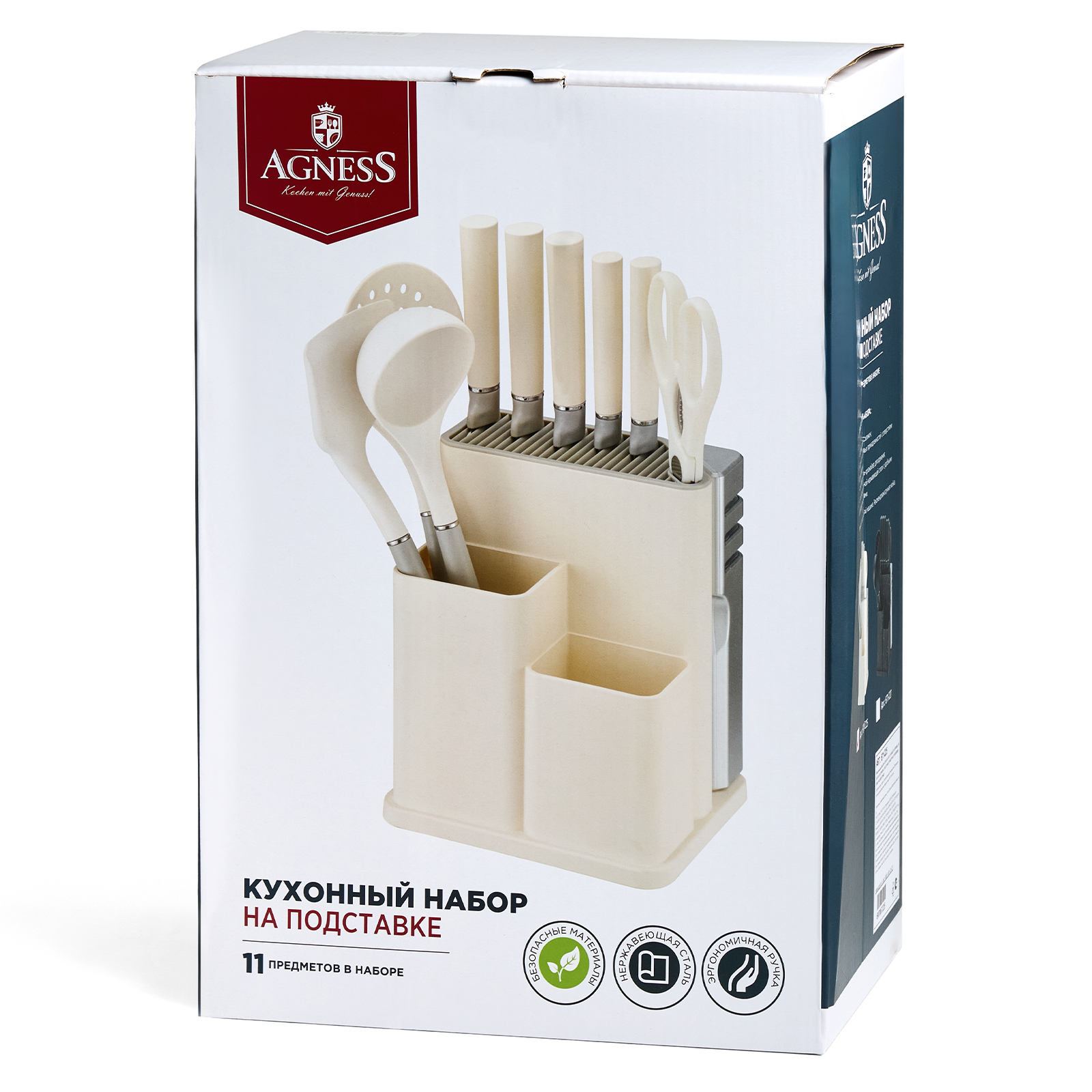 НАБОР AGNESS ИЗ 11ПР: 5 НОЖЕЙ,ПОЛОВНИК,ЛОПАТКА,ШУМОВКА,ПОДСТАВКА,НОЖЕТОЧКА,НОЖНИЦЫ, ЦВЕТ:БЕЛЫЙ/СЕРЫЙ