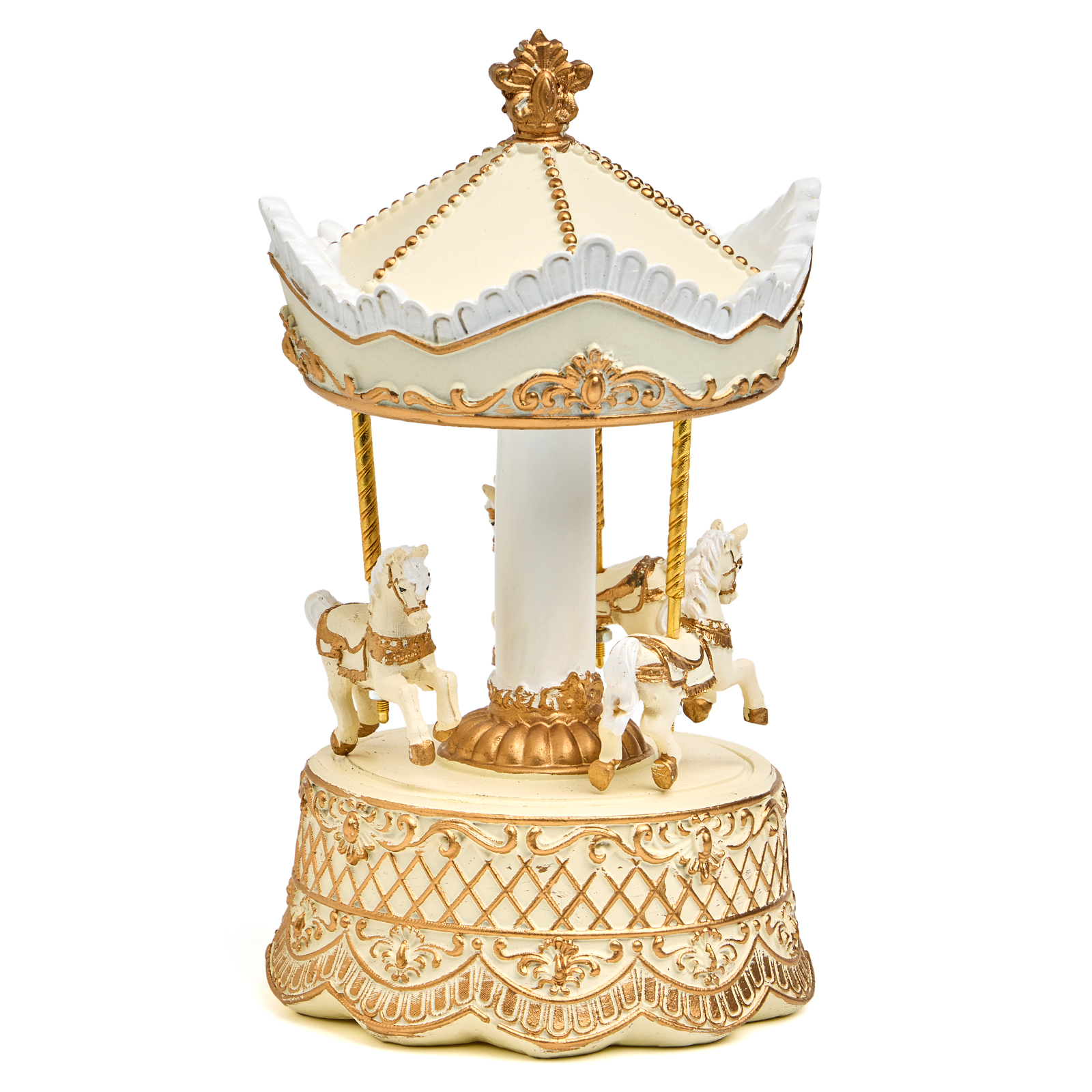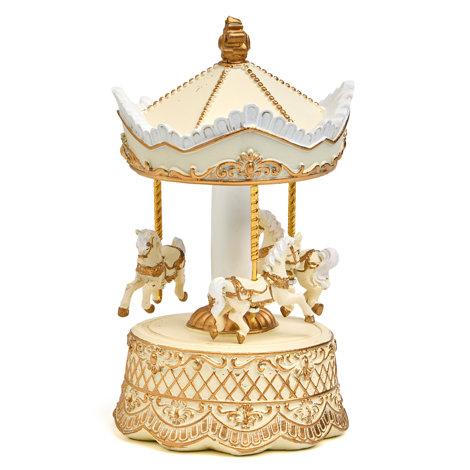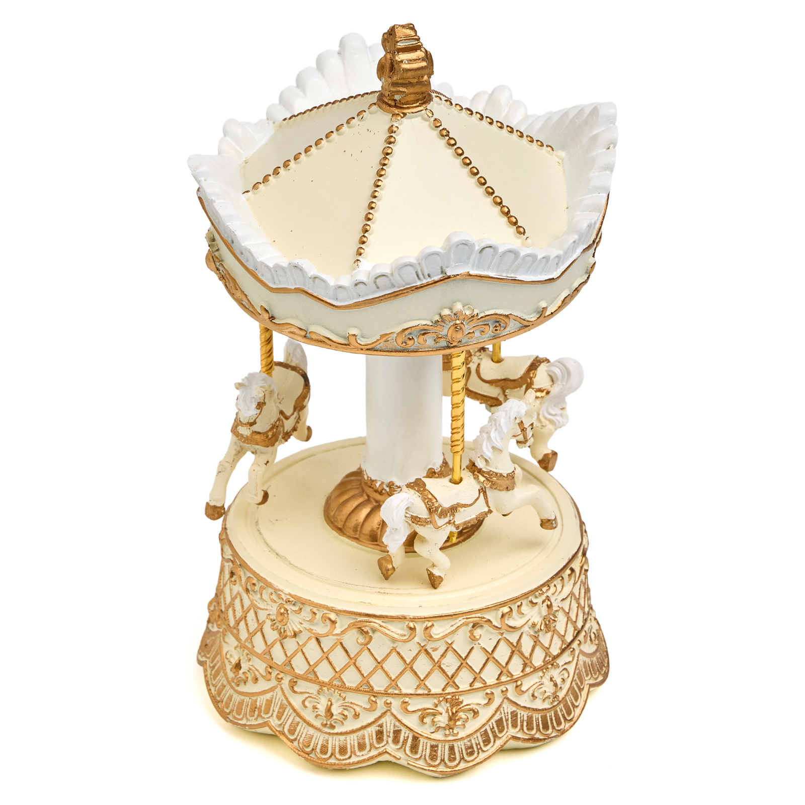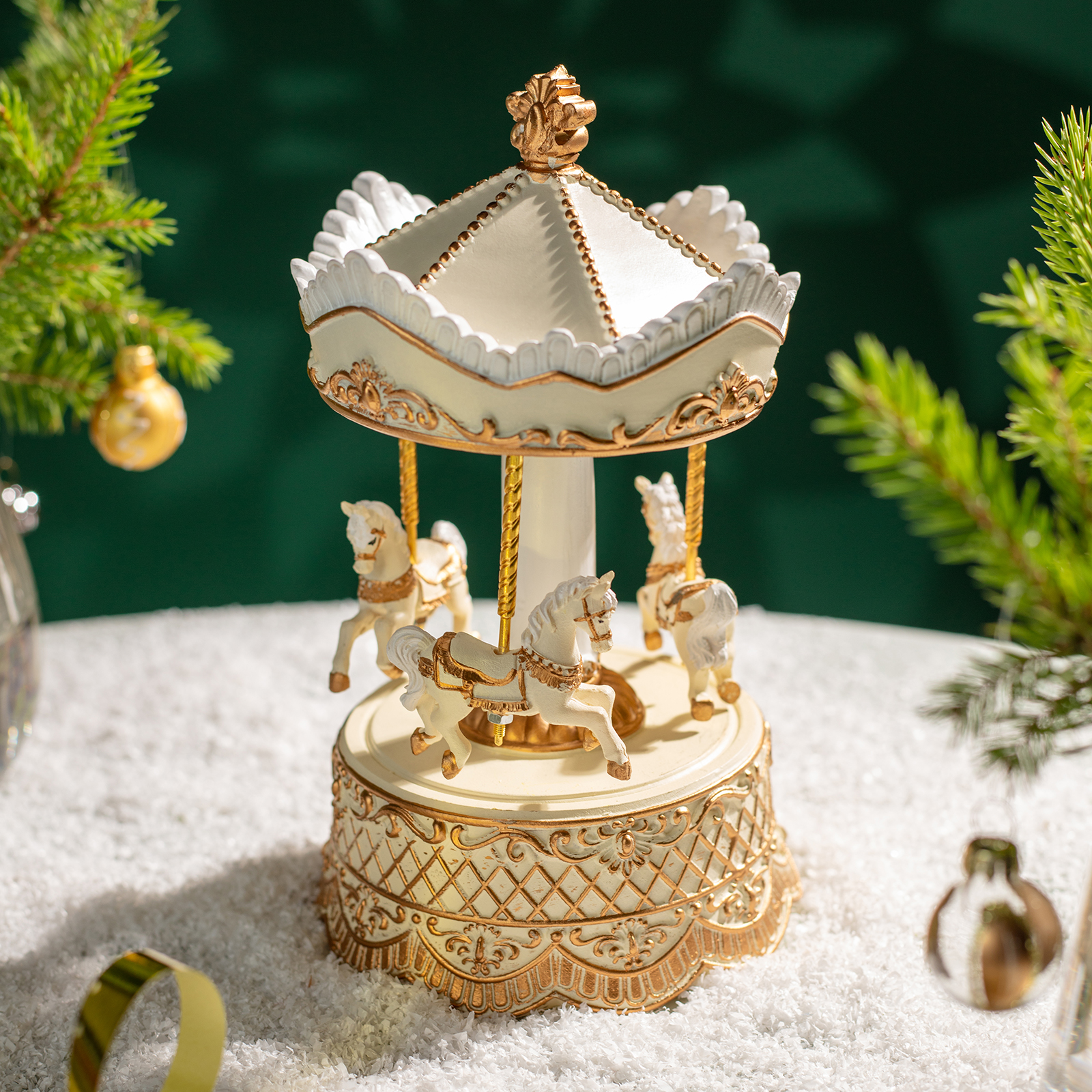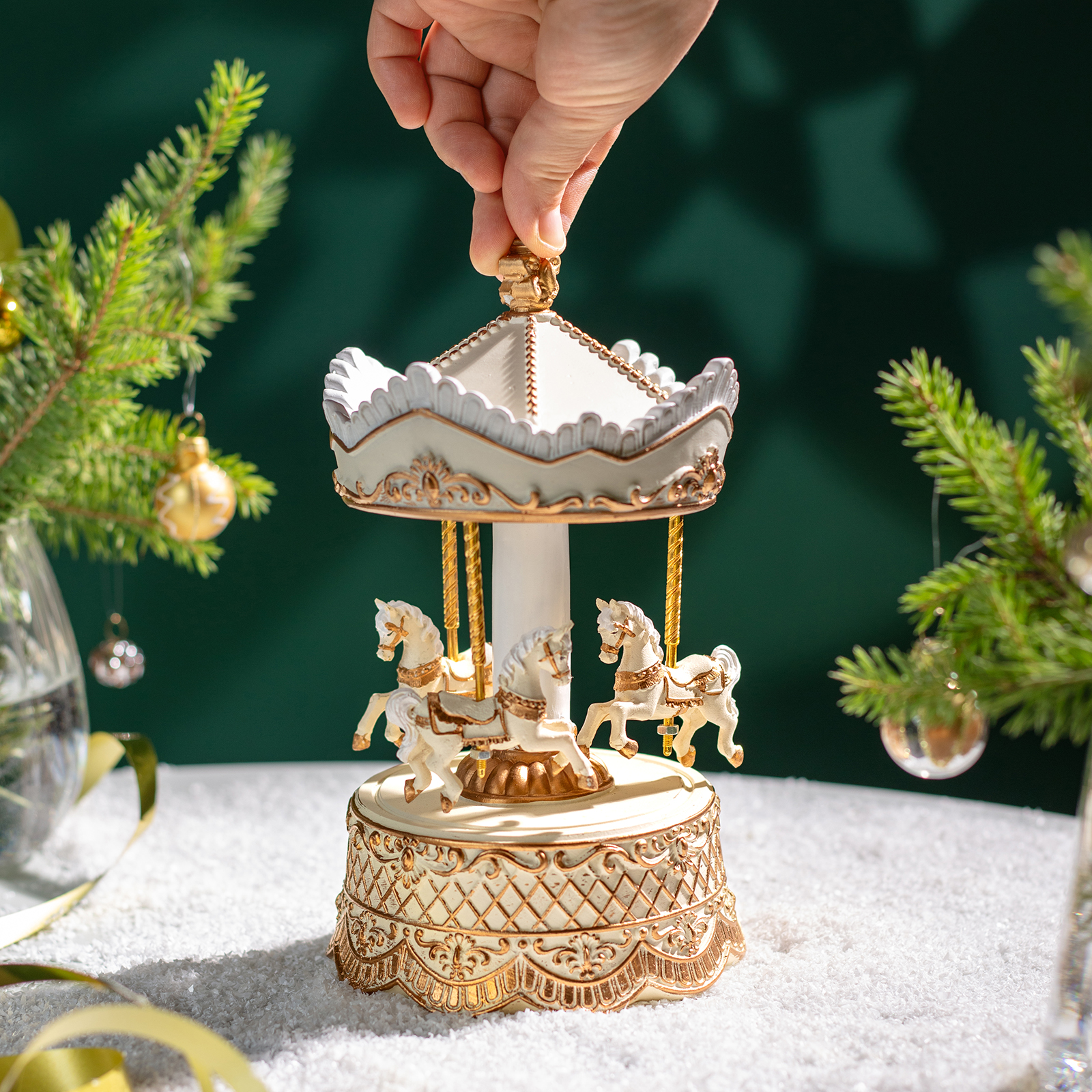 Пусть ваш дом наполнится нежным волшебством — с этой очаровательной музыкальной каруселью из прочного и благородного полистоуна! Белоснежные лошадки с пышными гривами и золотыми узорами на седлах словно застыли в моменте танца — а когда вы включаете механизм, они начинают медленно вращаться под звуки нежной мелодии, будто приглашая вас в мир детских воспоминаний и сказочных чудес.