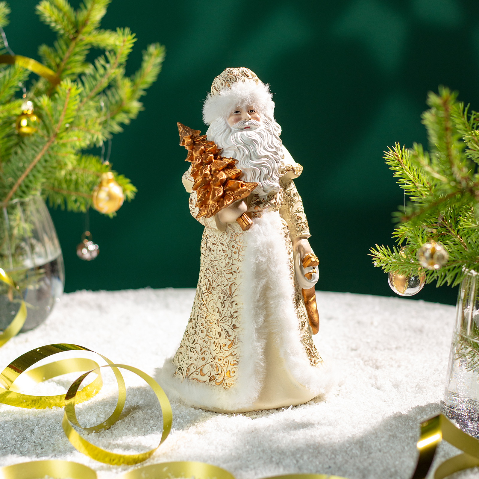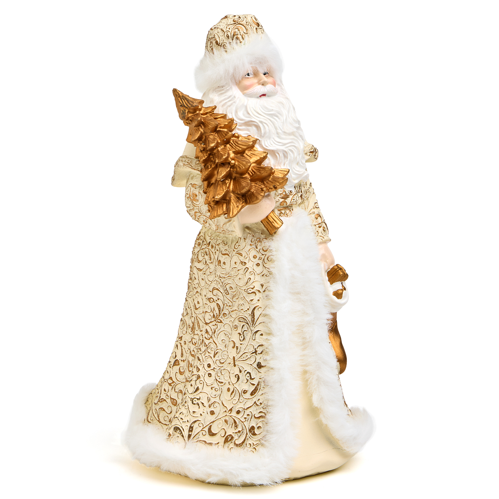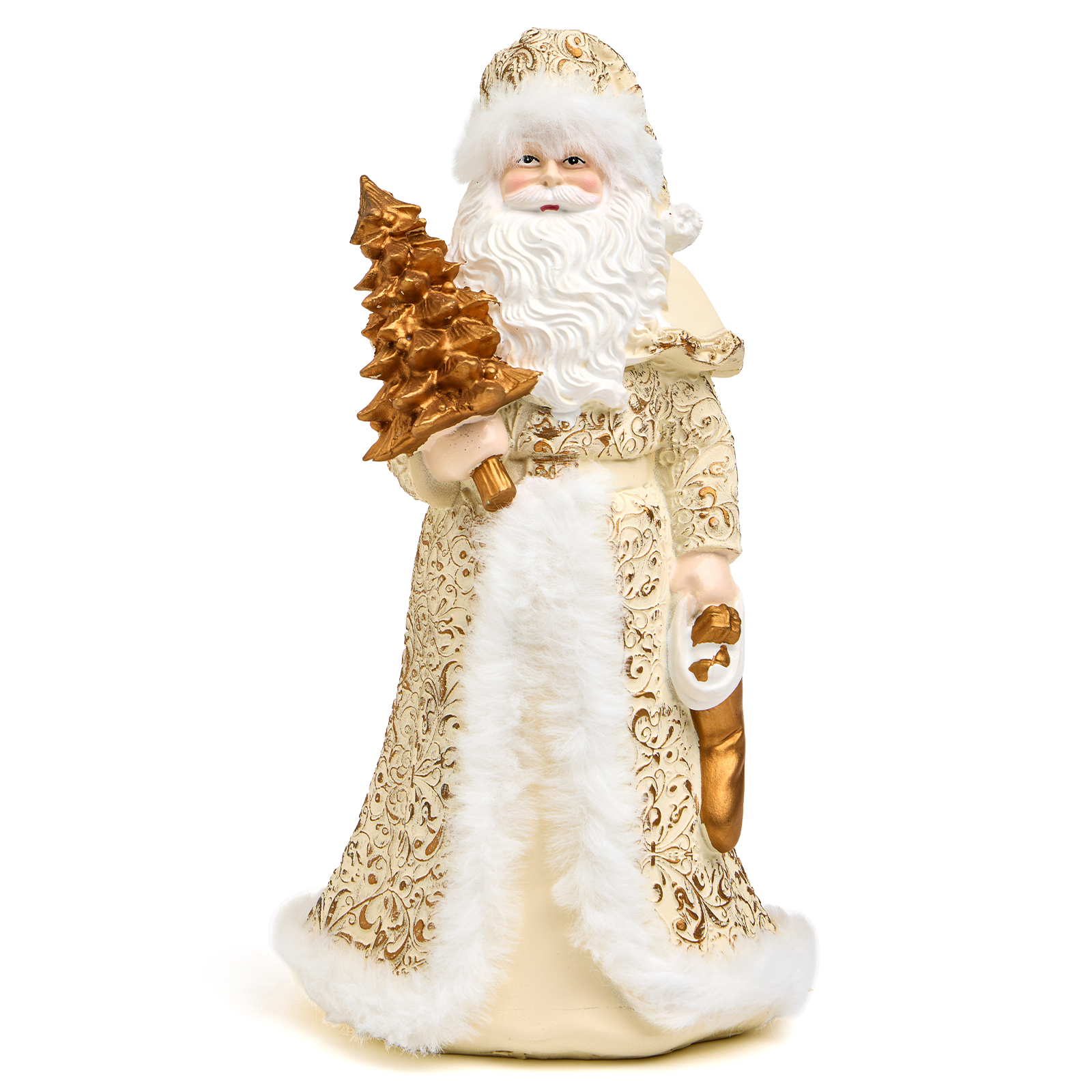Пусть ваш дом наполнится теплом и волшебством — с этим величественным Дедом Морозом из прочного и благородного полистоуна! Он словно только что сошёл со страниц новогодней сказки: в роскошном кафтане с золотыми узорами и белым мехом, с пышной бородой и золотой ёлочкой в руках — он готов стать центром вашего новогоднего декора или любимым акцентом на камине, полке или рядом с ёлкой.