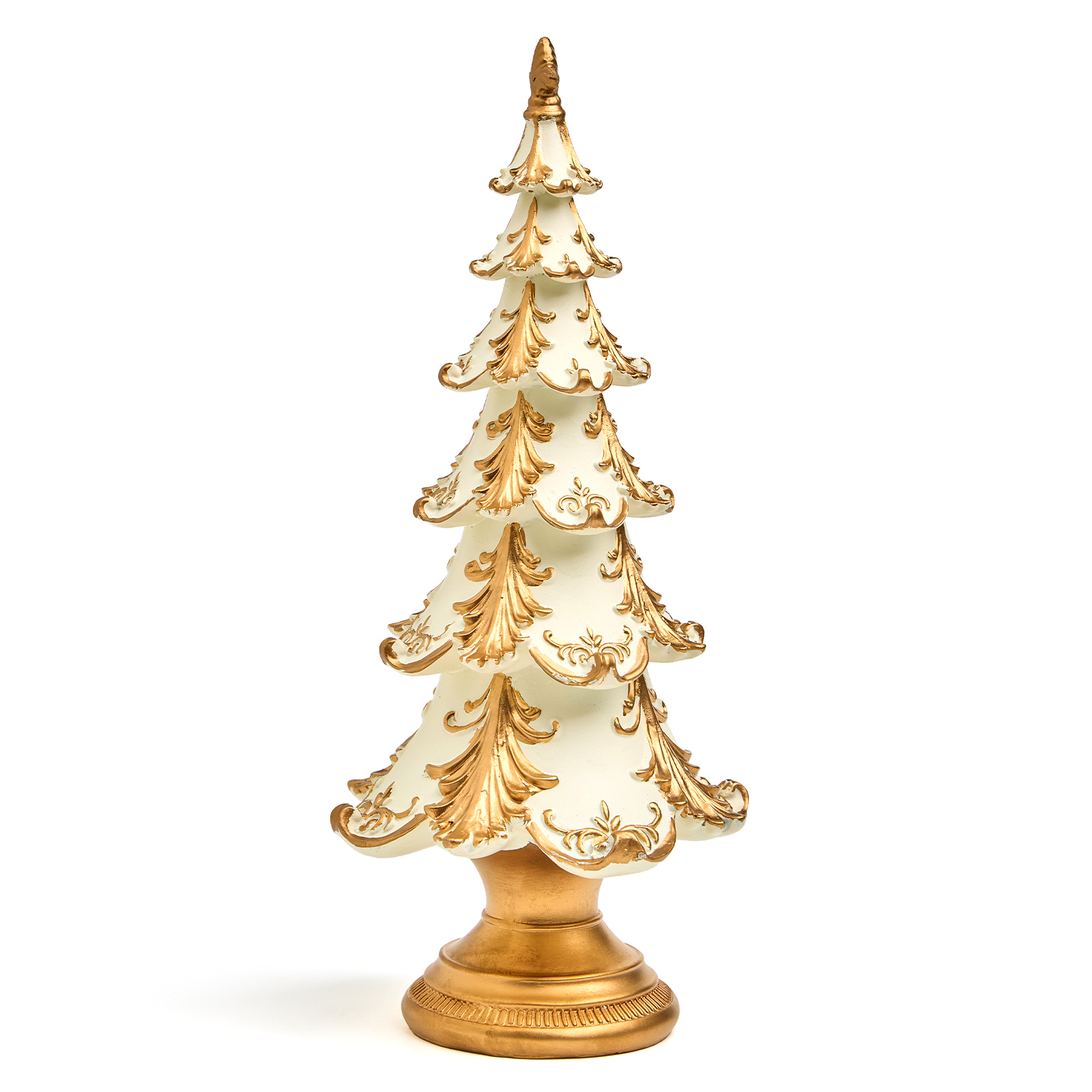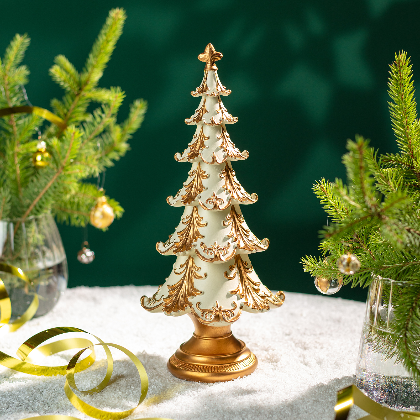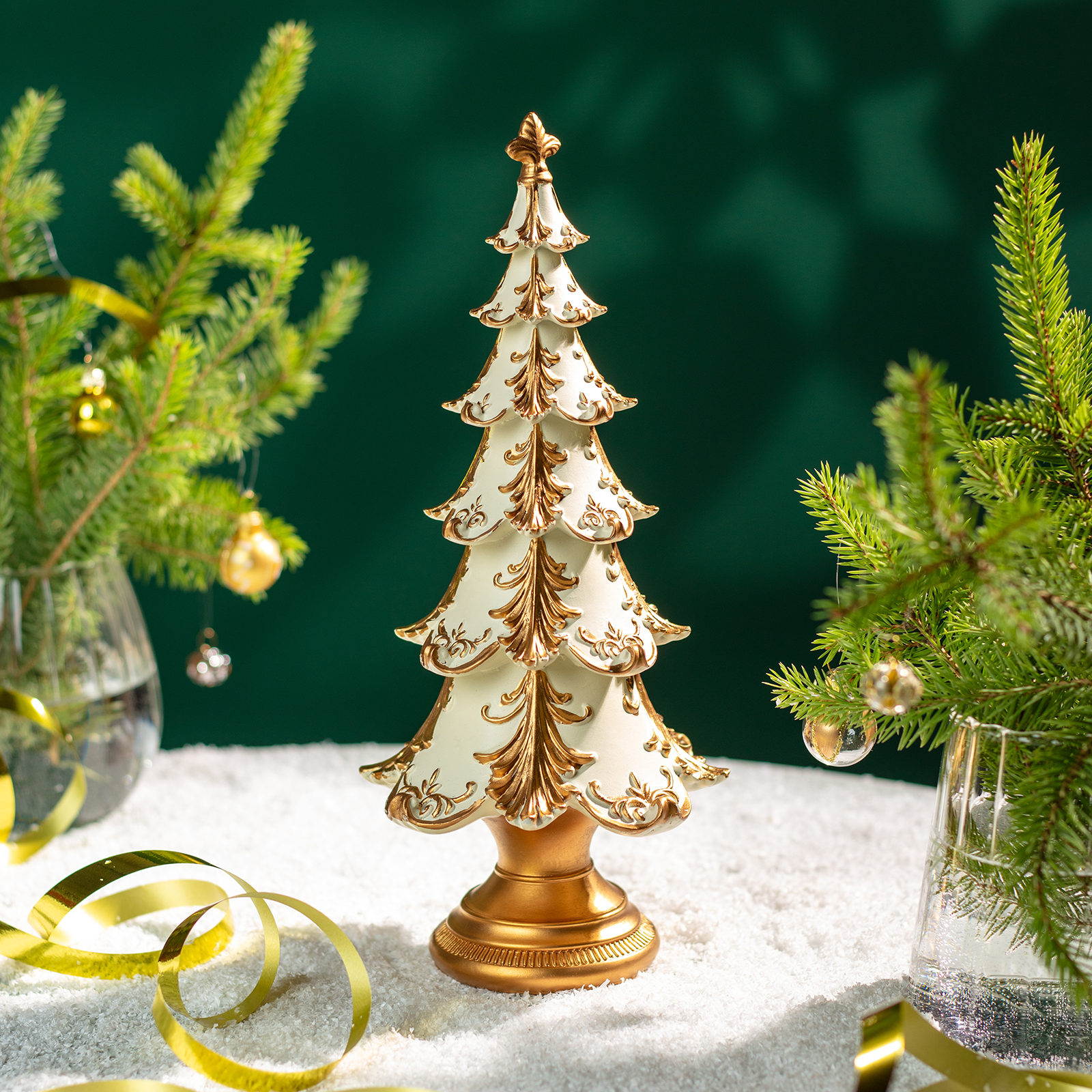 Пусть ваш дом наполнится духом праздника — с этой изысканной статуэткой ёлки из прочного и благородного полистоуна! Она словно вышла из дворцовой гостиной XIX века: белоснежные ярусы, украшенные золотыми узорами, напоминающими иней и ледяные кружева, и массивное золотое основание — всё это создаёт ощущение роскоши, уюта и вечного Рождества.