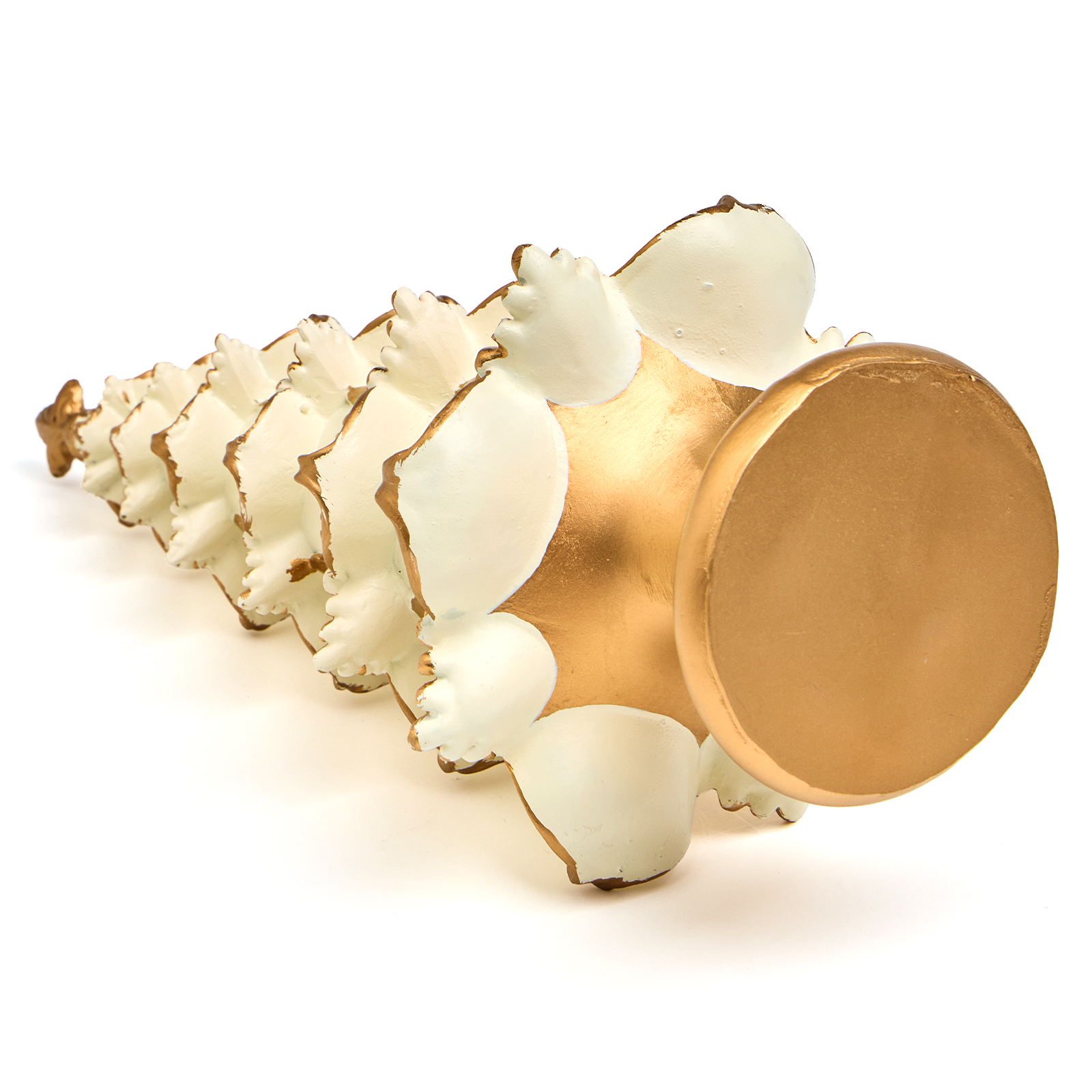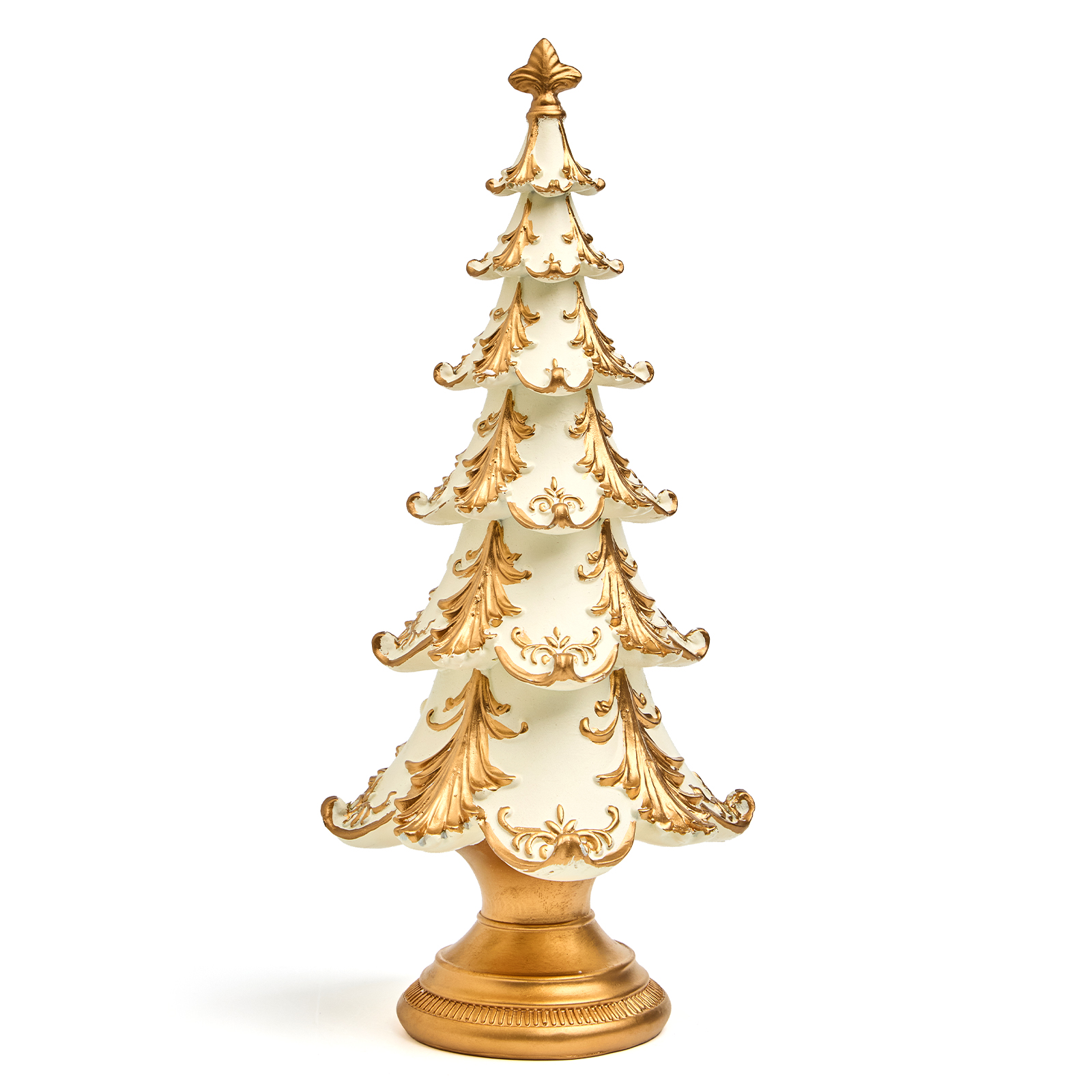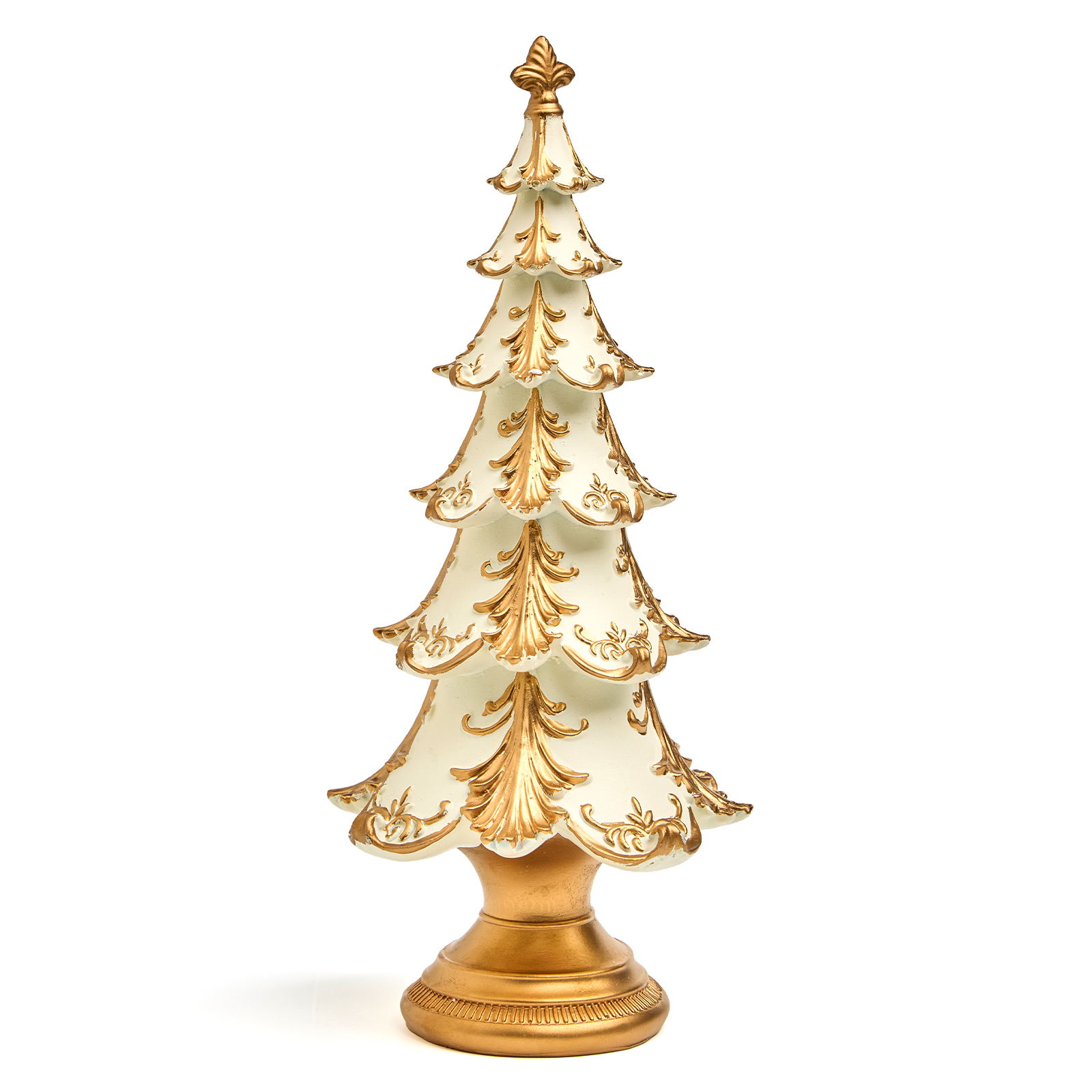 Пусть ваш дом наполнится духом праздника — с этой изысканной статуэткой ёлки из прочного и благородного полистоуна! Она словно вышла из дворцовой гостиной XIX века: белоснежные ярусы, украшенные золотыми узорами, напоминающими иней и ледяные кружева, и массивное золотое основание — всё это создаёт ощущение роскоши, уюта и вечного Рождества.