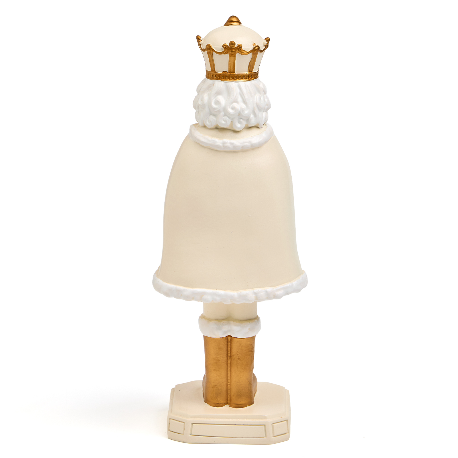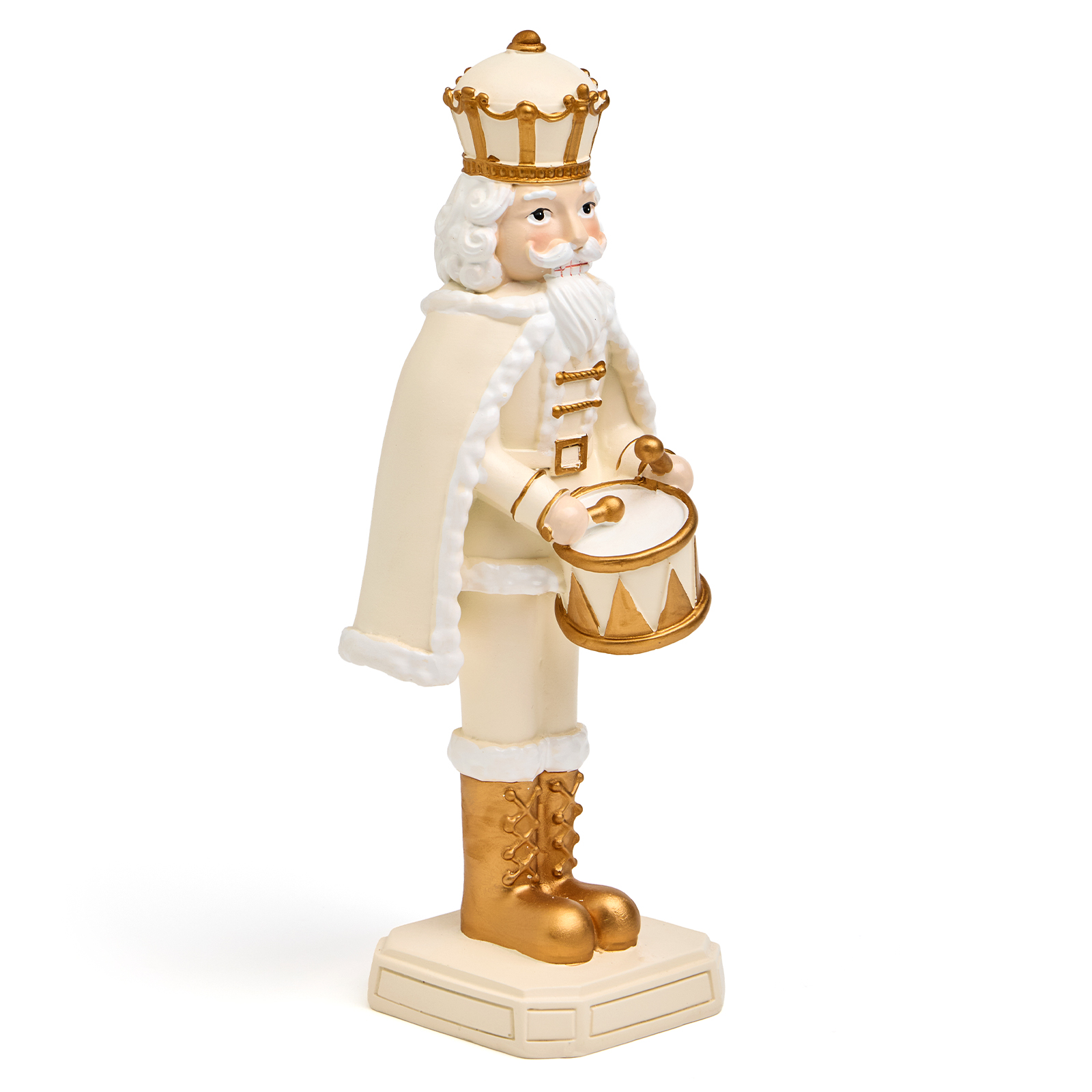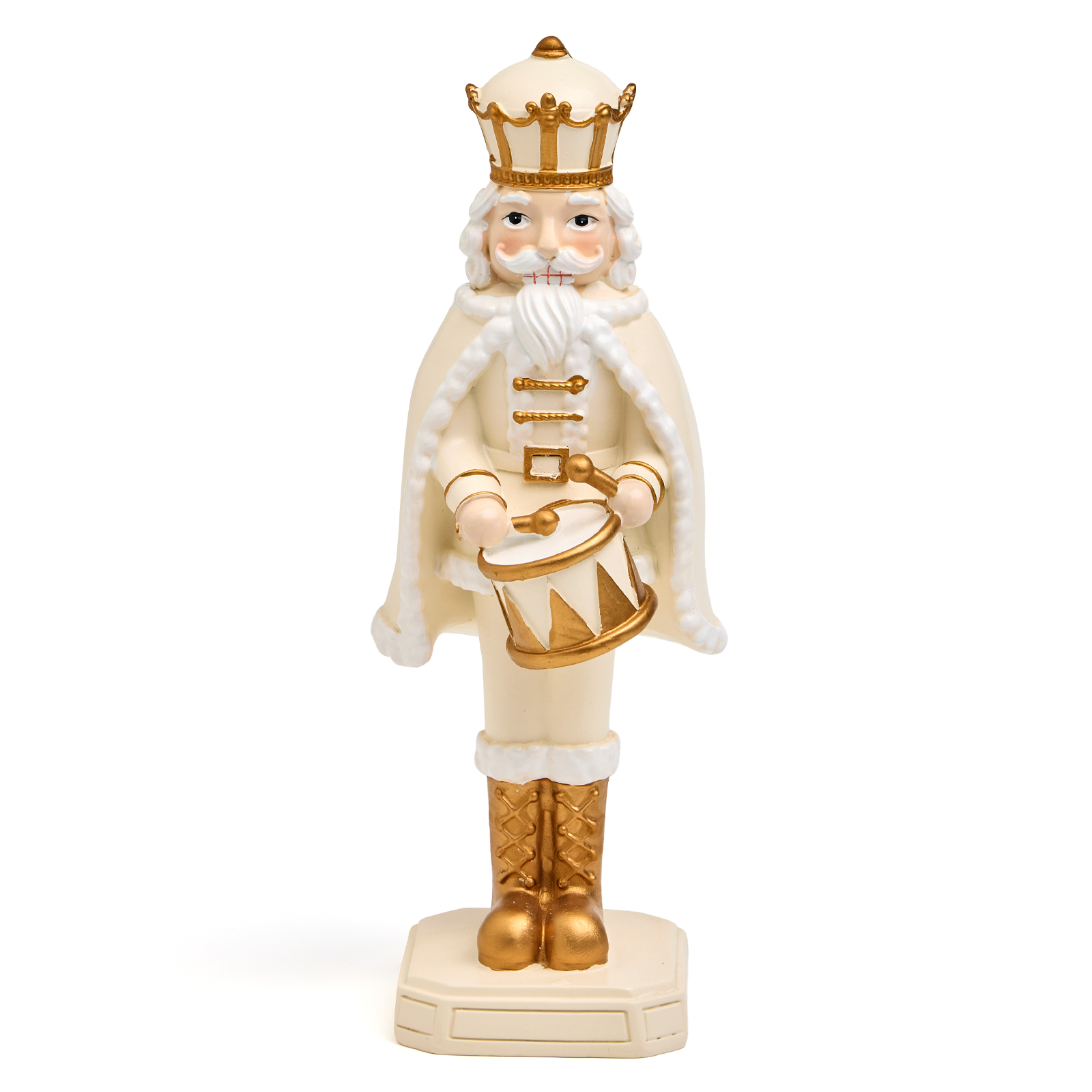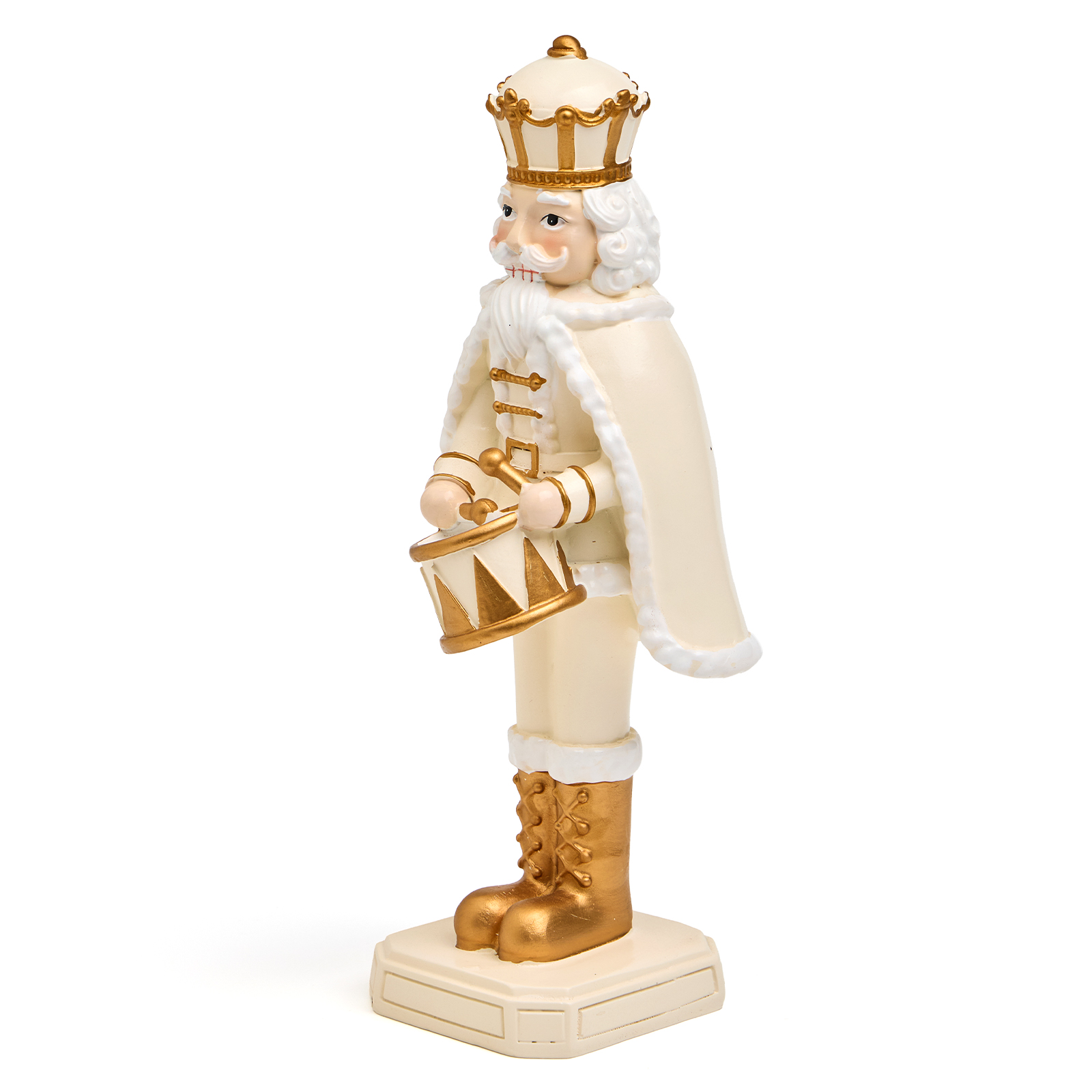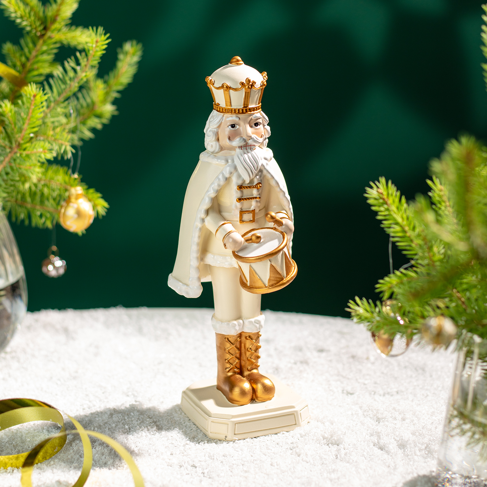 Пусть ваш дом наполнится волшебством — с этим величественным Щелкунчиком из прочного и благородного полистоуна! Он словно только что вышел из знаменитой балетной сказки: в короне, с пышным белым плащом, золотыми сапогами и барабаном в руках — он готов стать центром вашего новогоднего декора или любимым акцентом на камине, полке или рядом с ёлкой.