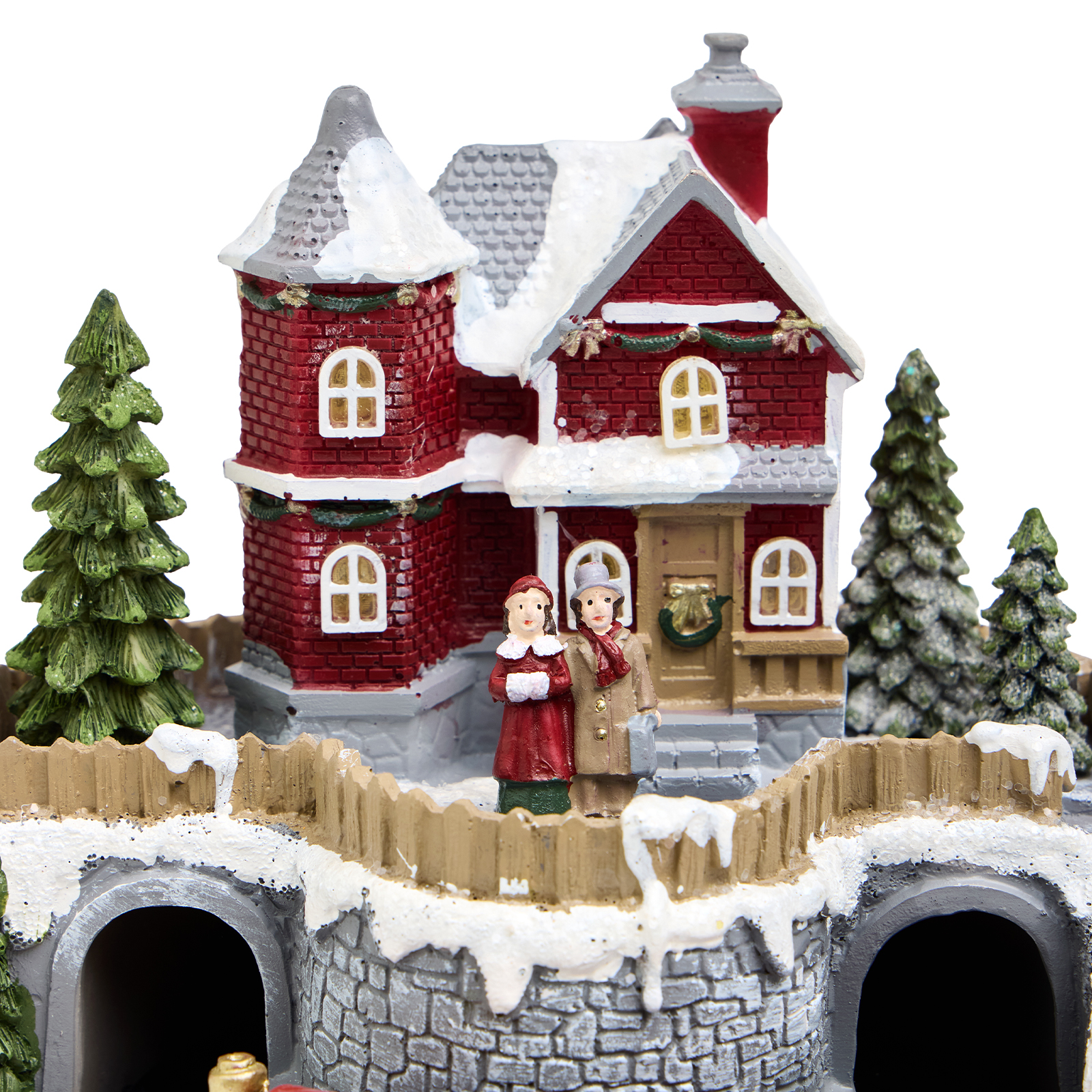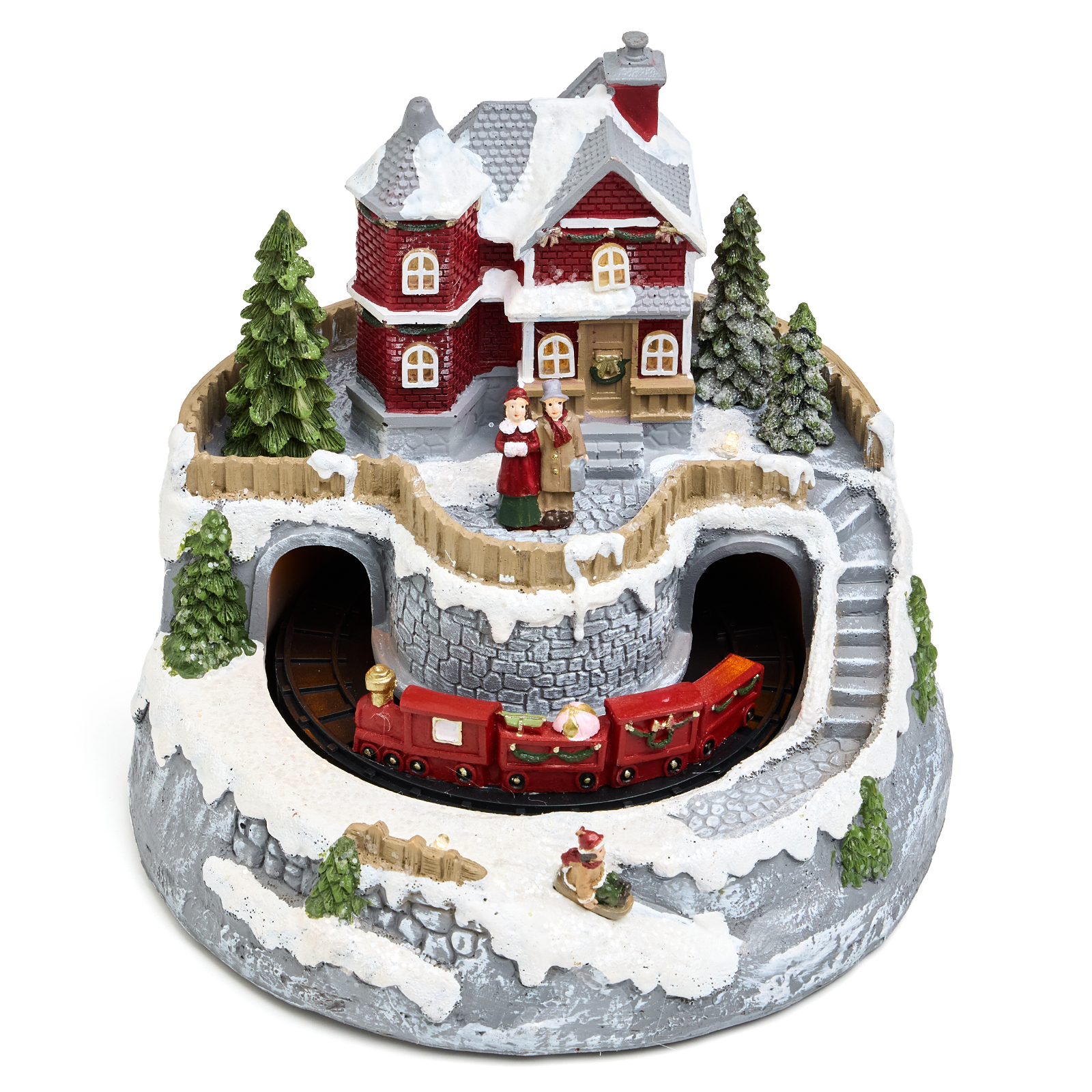 Уютный домик и заснеженные елки — всё это оживает под звук любимой рождественской мелодии. Красный поезд медленно катится по кругу, а окна домика мягко светятся, создавая волшебную атмосферу.