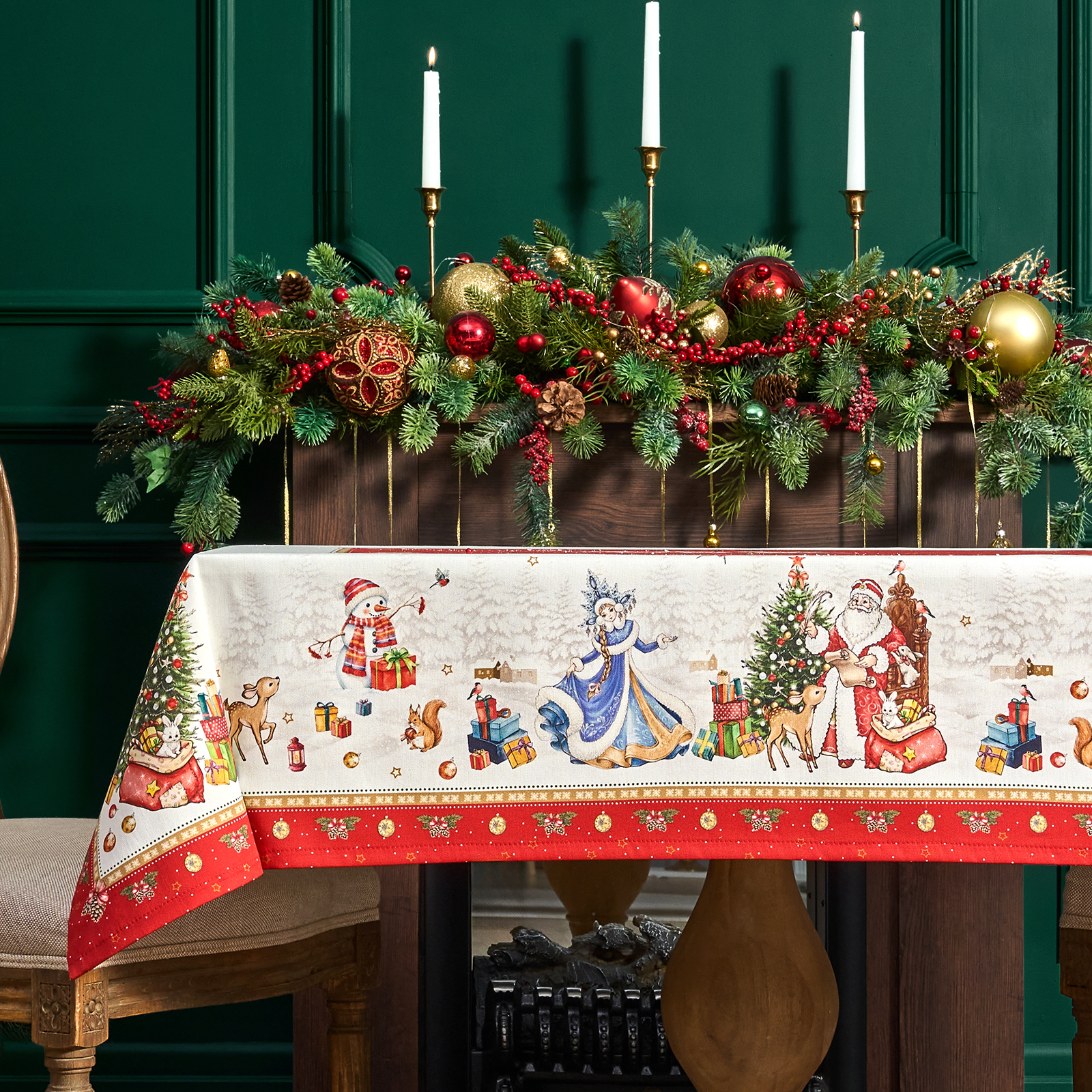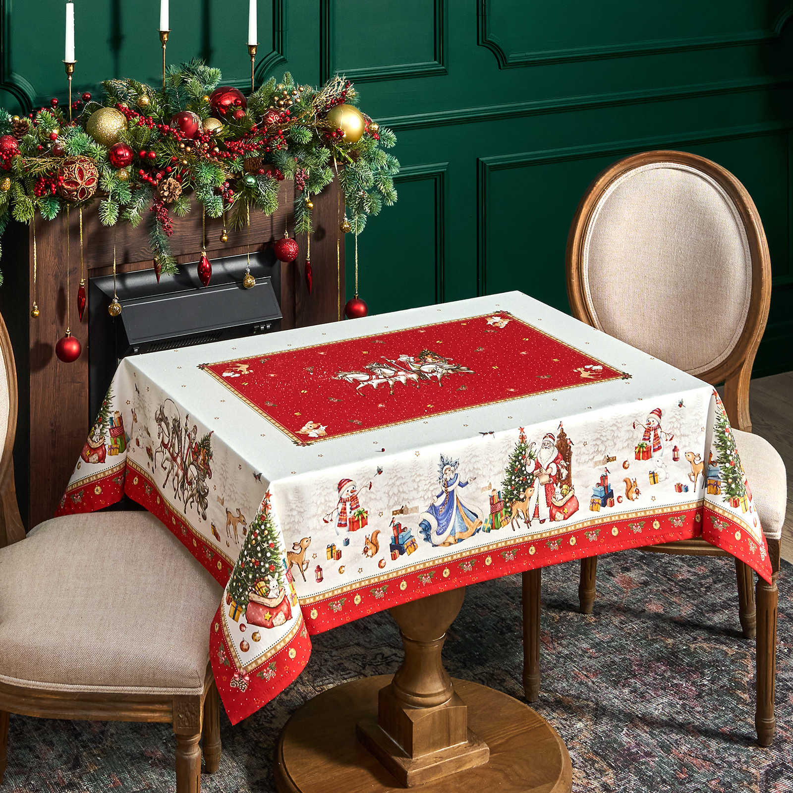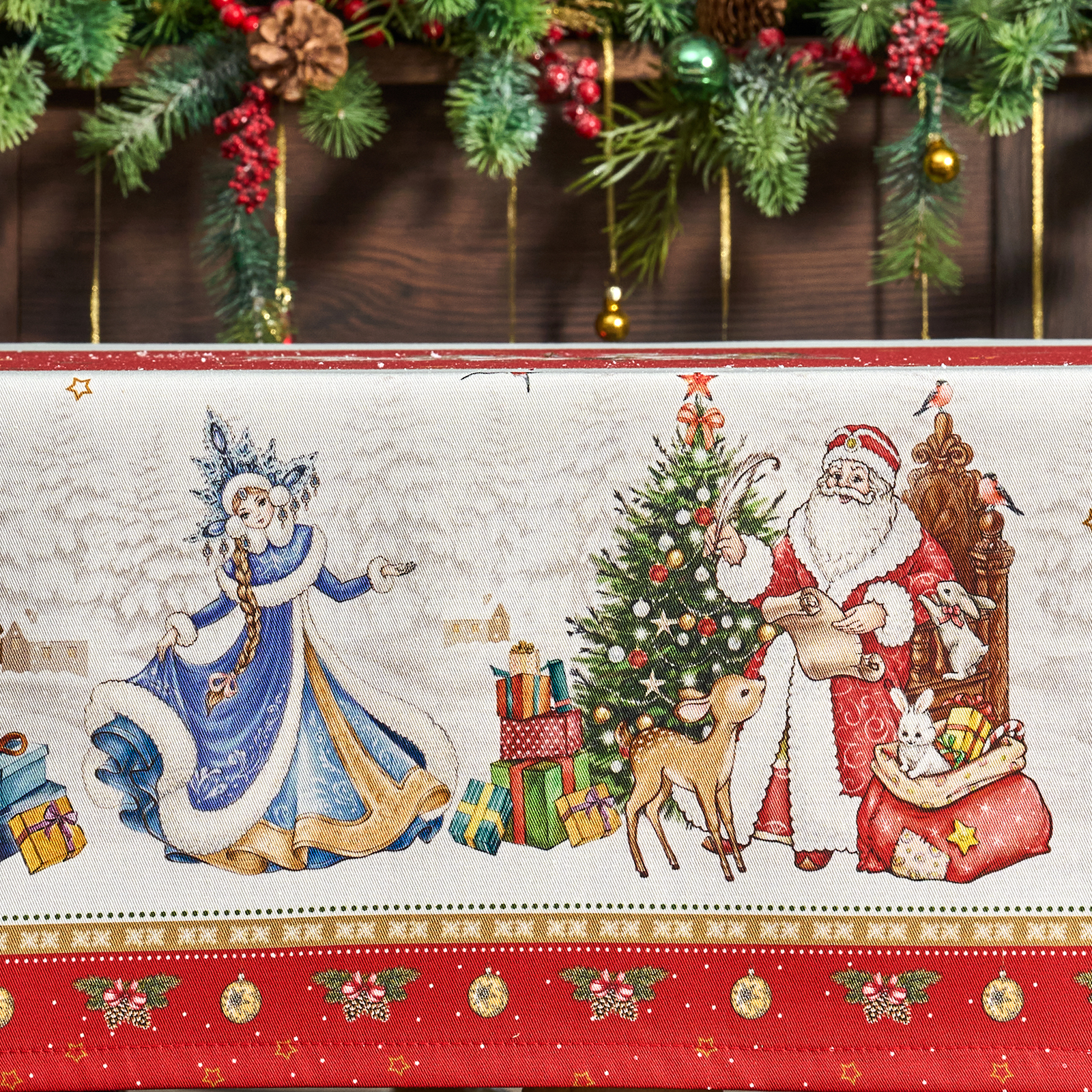 Она выполнена из высококачественного 100% хлопка с саржевым переплетением Твил. Эта ткань не заламывается и не мнется. Скатерть из твила выглядит аккуратно и элегантно и имеет плотность 190 г\м2. Такая плотность ткани позволяет стирать скатерть, гладить и сушить более 100 раз без потери качества. Скатерть имеет дополнительную водоотталкивающую пропитку, которая защитит её от разлитой жидкости. Цифровая печать принта выполнена по всем сторонам скатерти и с любой стороны будет выглядеть красиво и четко, каждый штрих детально прорисован во всём многообразии оттенков. Он подойдет для празднования Нового года 2026 и Рождества и декора, а специальная пропитка избавит вас от хлопот с отстированием пятен после застолья.