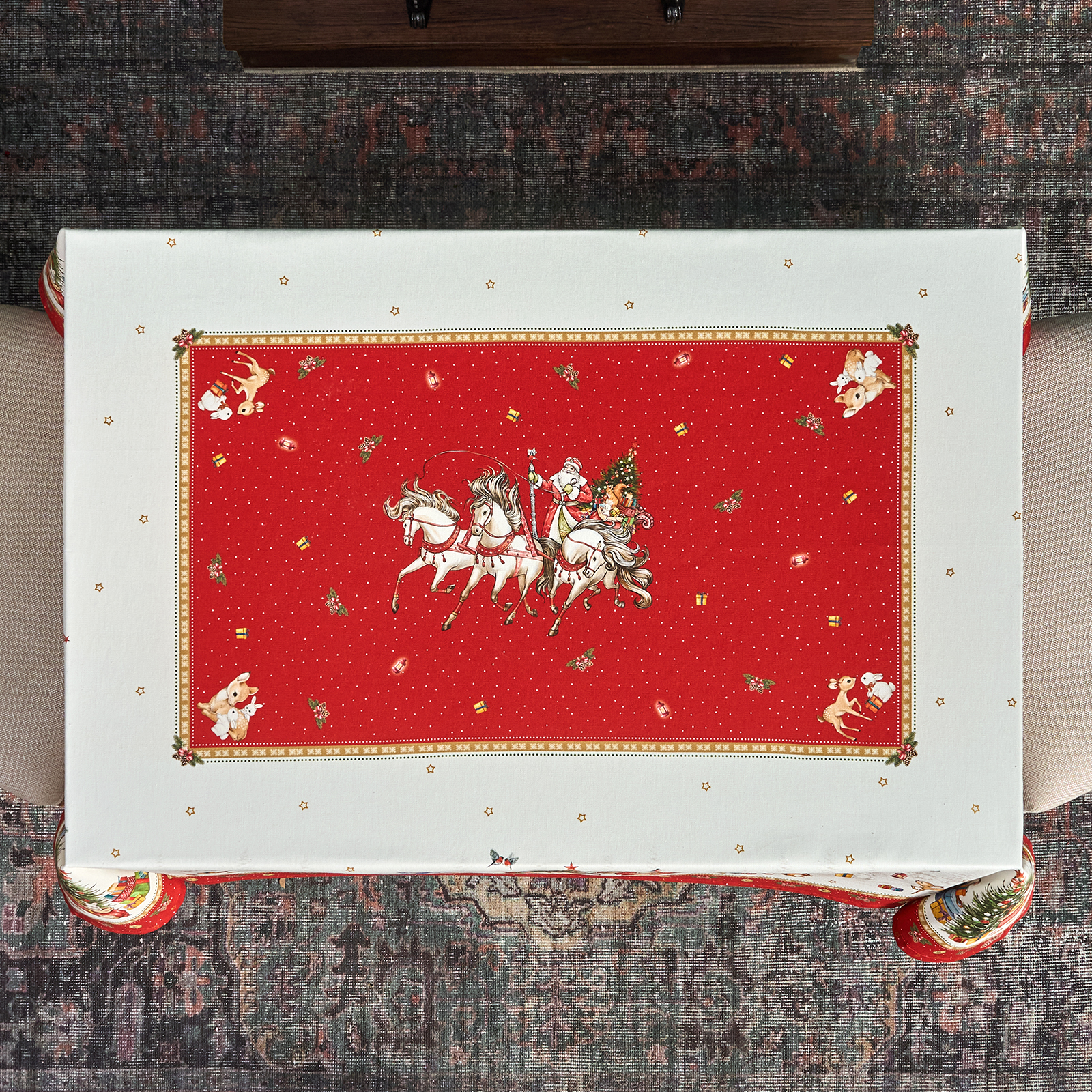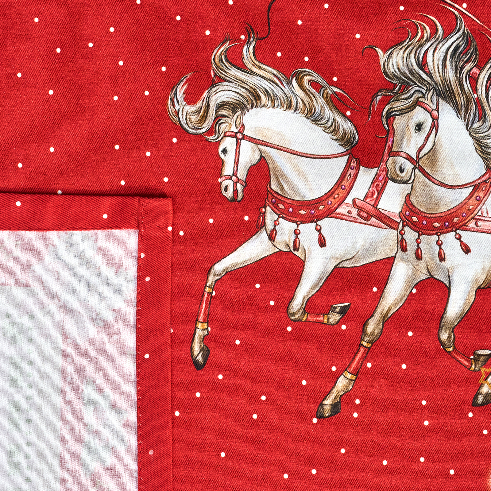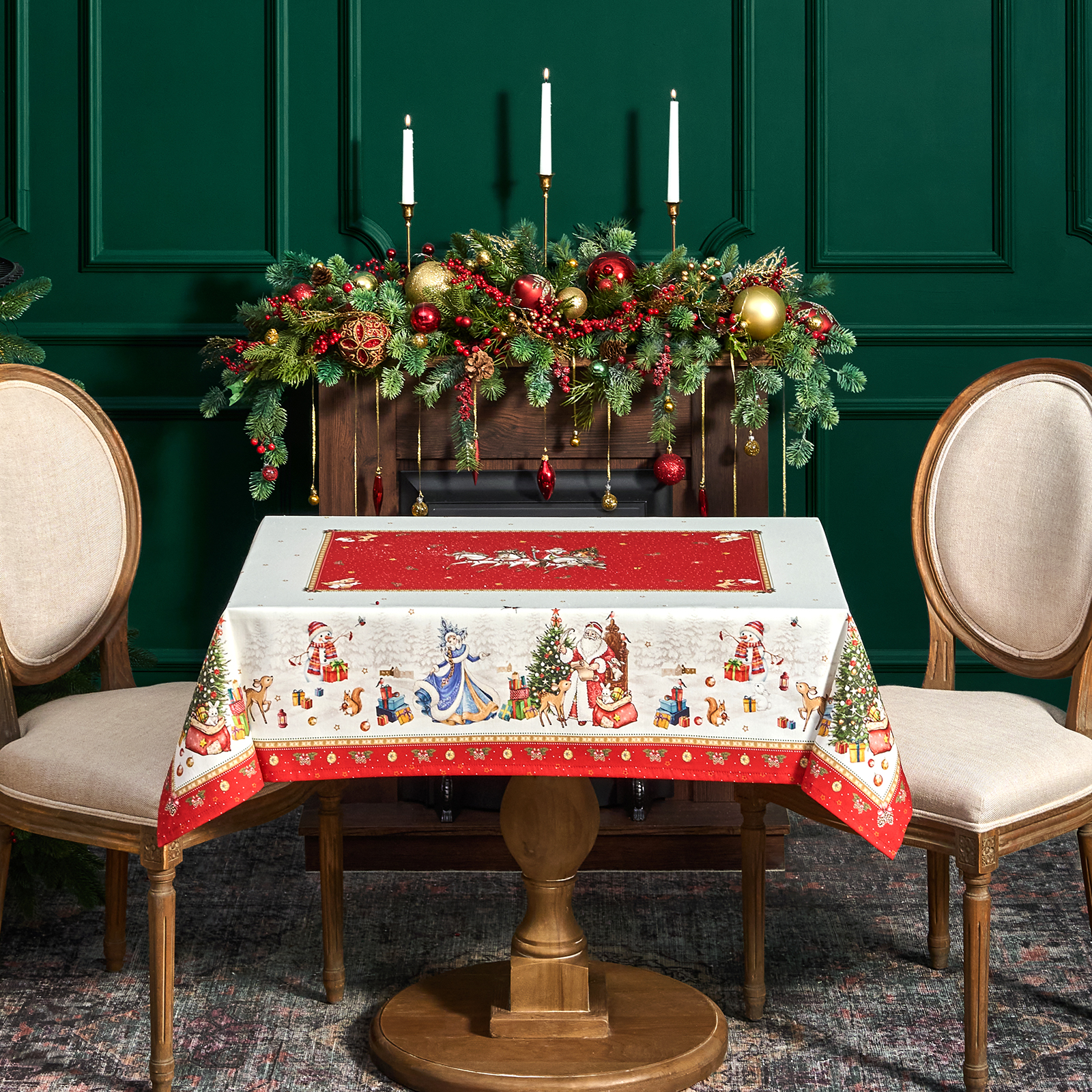 Она выполнена из высококачественного 100% хлопка с саржевым переплетением Твил. Эта ткань не заламывается и не мнется. Скатерть из твила выглядит аккуратно и элегантно и имеет плотность 190 г\м2. Такая плотность ткани позволяет стирать скатерть, гладить и сушить более 100 раз без потери качества. Скатерть имеет дополнительную водоотталкивающую пропитку, которая защитит её от разлитой жидкости. Цифровая печать принта выполнена по всем сторонам скатерти и с любой стороны будет выглядеть красиво и четко, каждый штрих детально прорисован во всём многообразии оттенков. Он подойдет для празднования Нового года 2026 и Рождества и декора, а специальная пропитка избавит вас от хлопот с отстированием пятен после застолья.